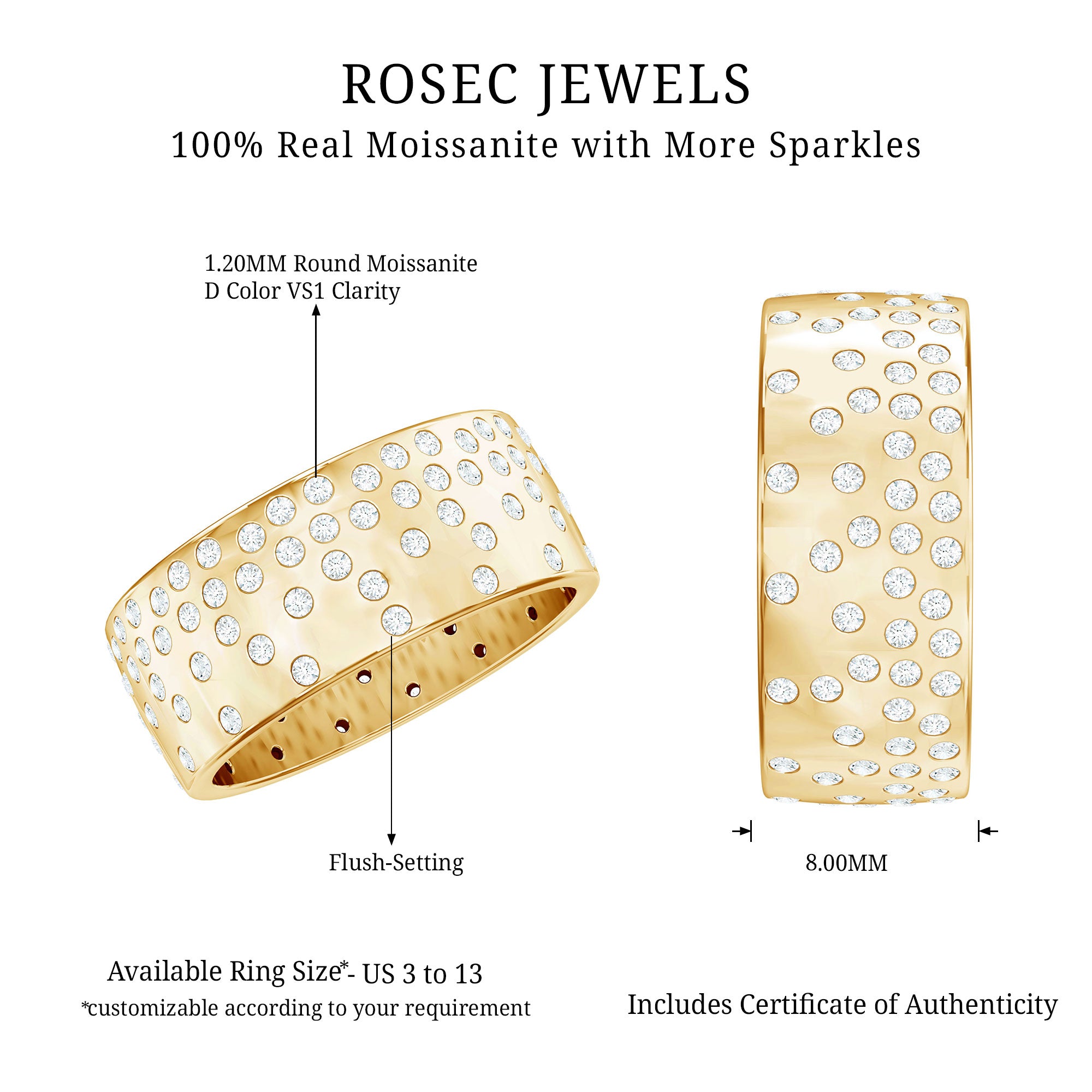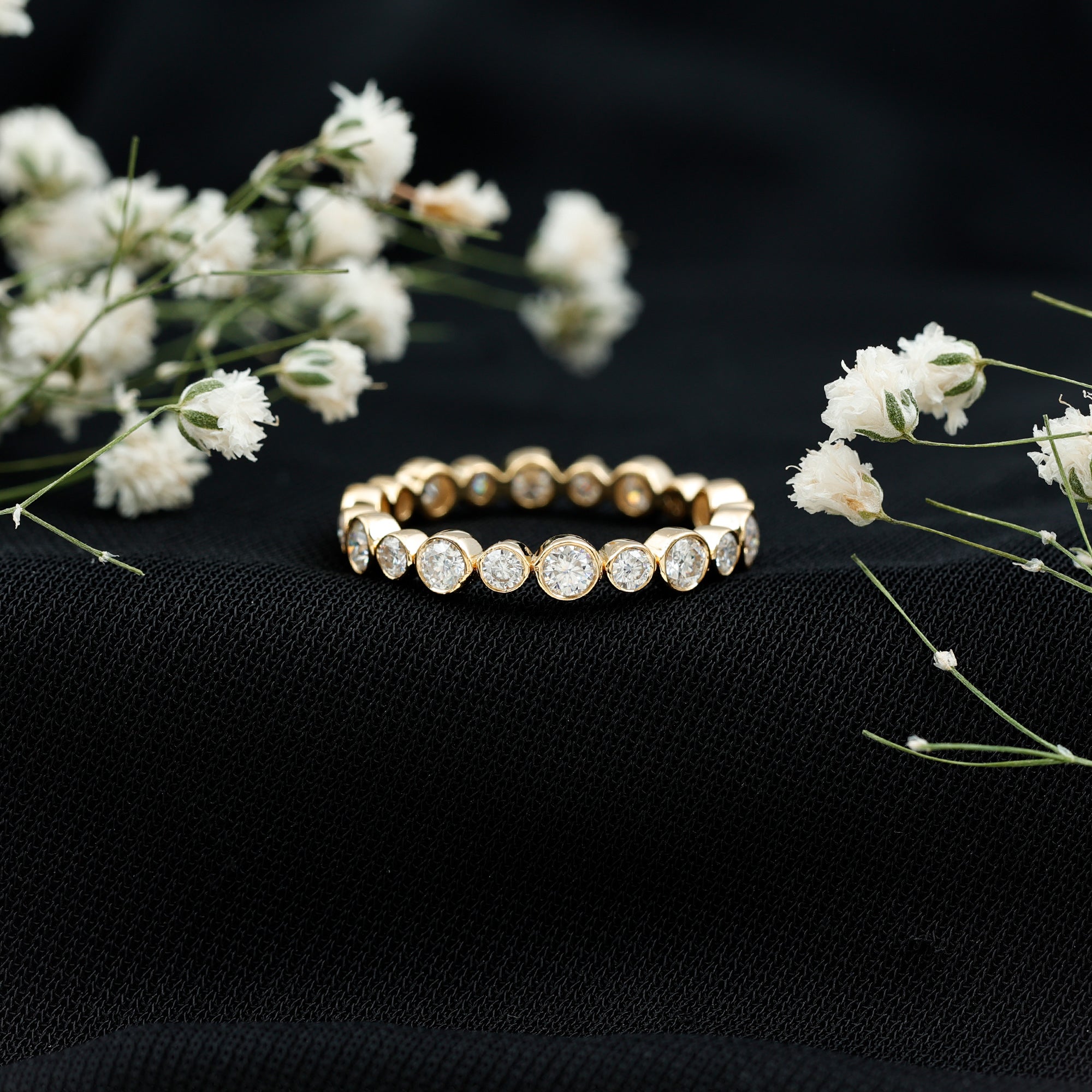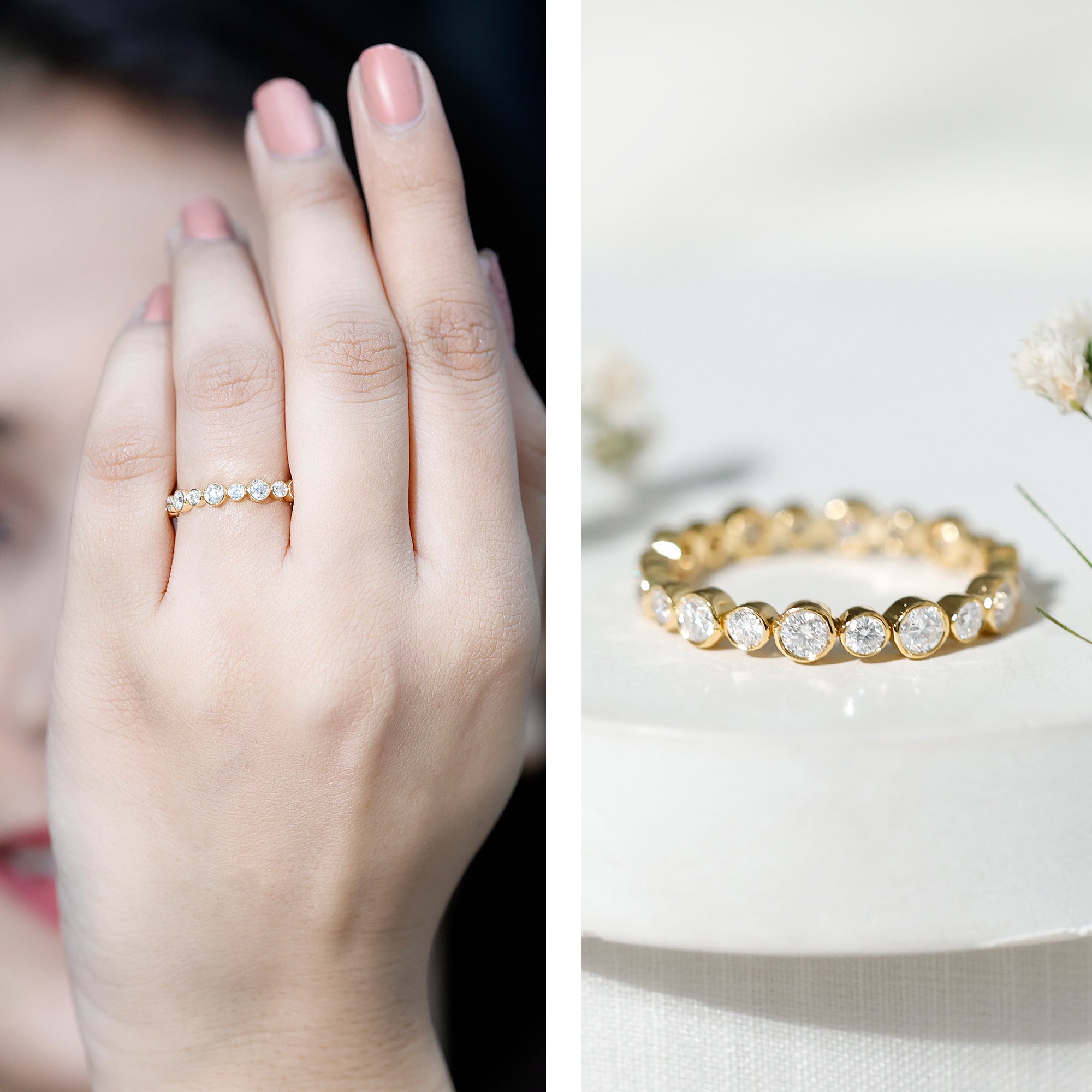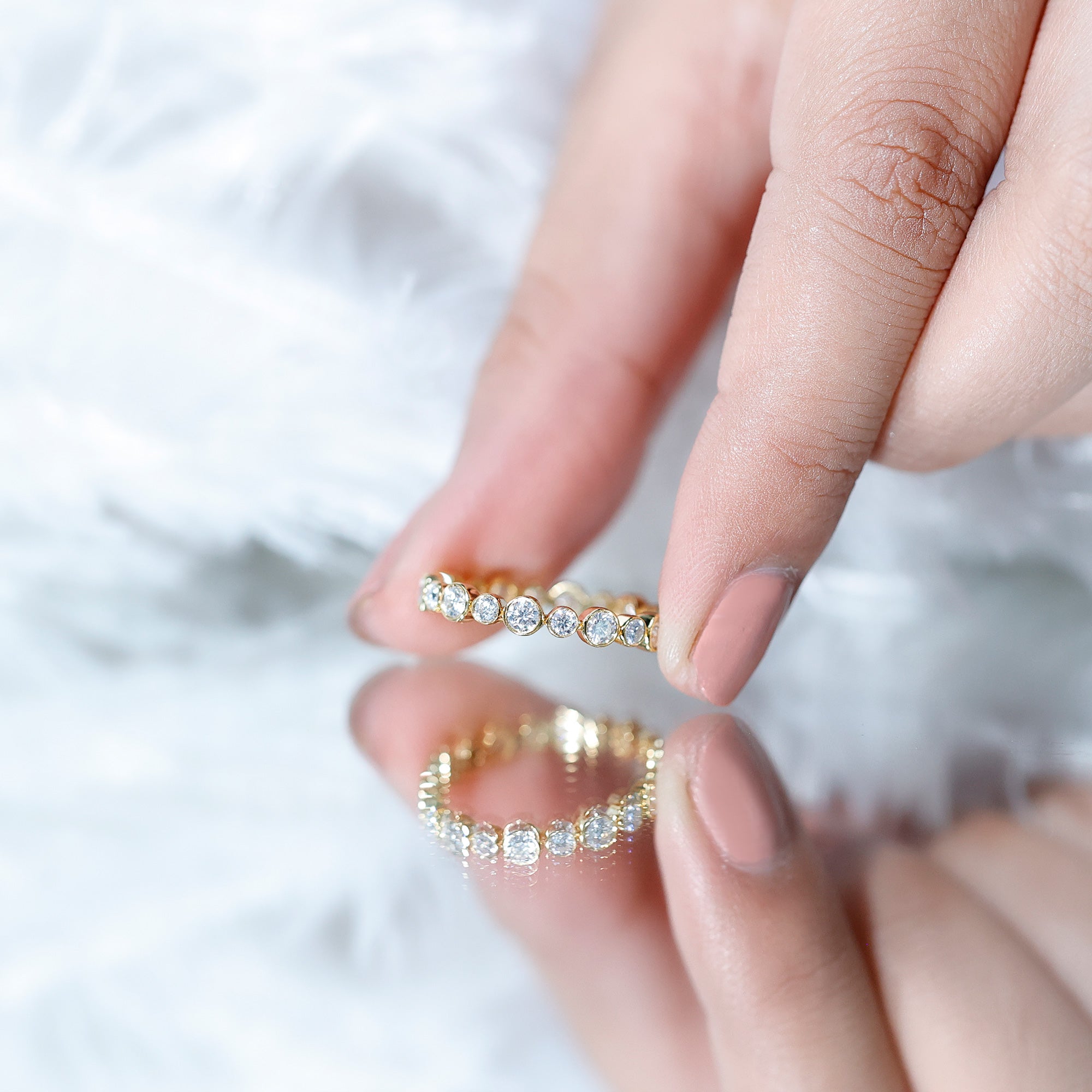 Typically, it is a type of metal ring that features gemstones set in a continuous band around the circumference of the ring. If you’re seeking something simple to flaunt regularly, a band with subtle colored stones such as Morganite, Aquamarine, Moissanite, or a Classic 14K White Gold Gemstone Band could be the one. While if you’re a little more fond of a pop of color, deeply hued stones such as Ruby, Blue Sapphire, Emerald etc., or a Yellow or Rose Gold Gemstone Band might do the job right.