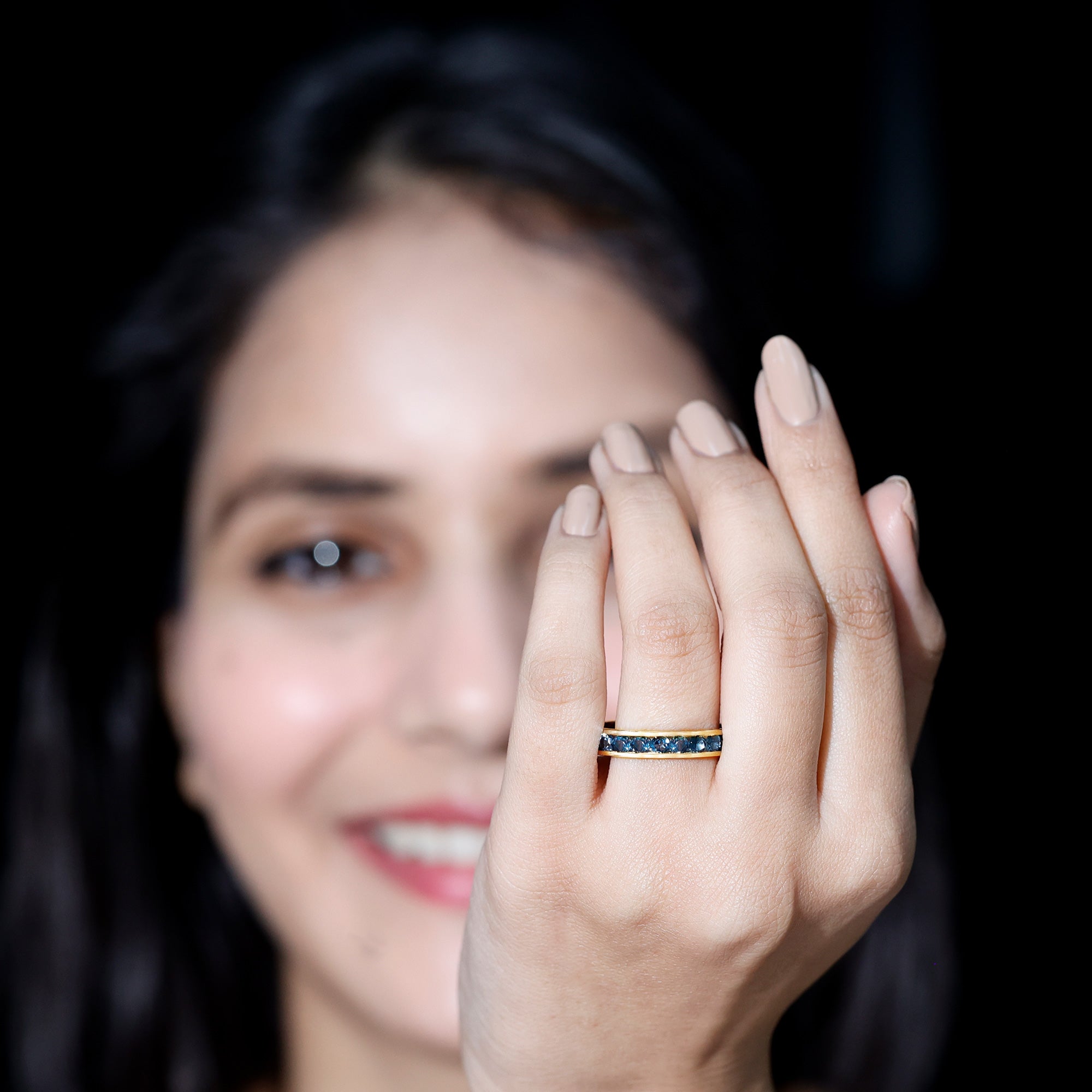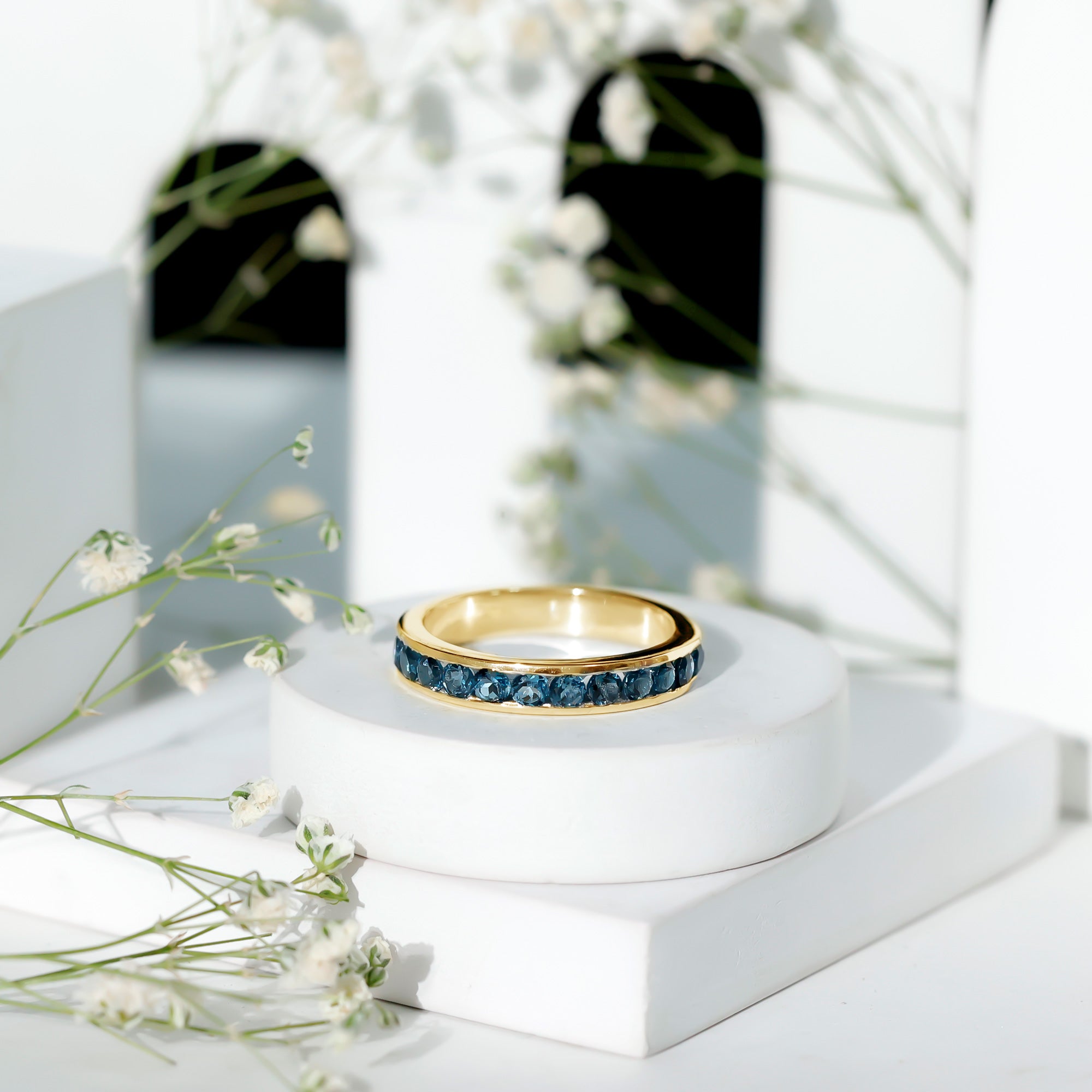 Typically, it is a type of metal ring that features gemstones set in a continuous band around the circumference of the ring. If you’re seeking something simple to flaunt regularly, a band with subtle colored stones such as Morganite, Aquamarine, Moissanite, or a Classic 14K White Gold Gemstone Band could be the one. While if you’re a little more fond of a pop of color, deeply hued stones such as Ruby, Blue Sapphire, Emerald etc., or a Yellow or Rose Gold Gemstone Band might do the job right.
