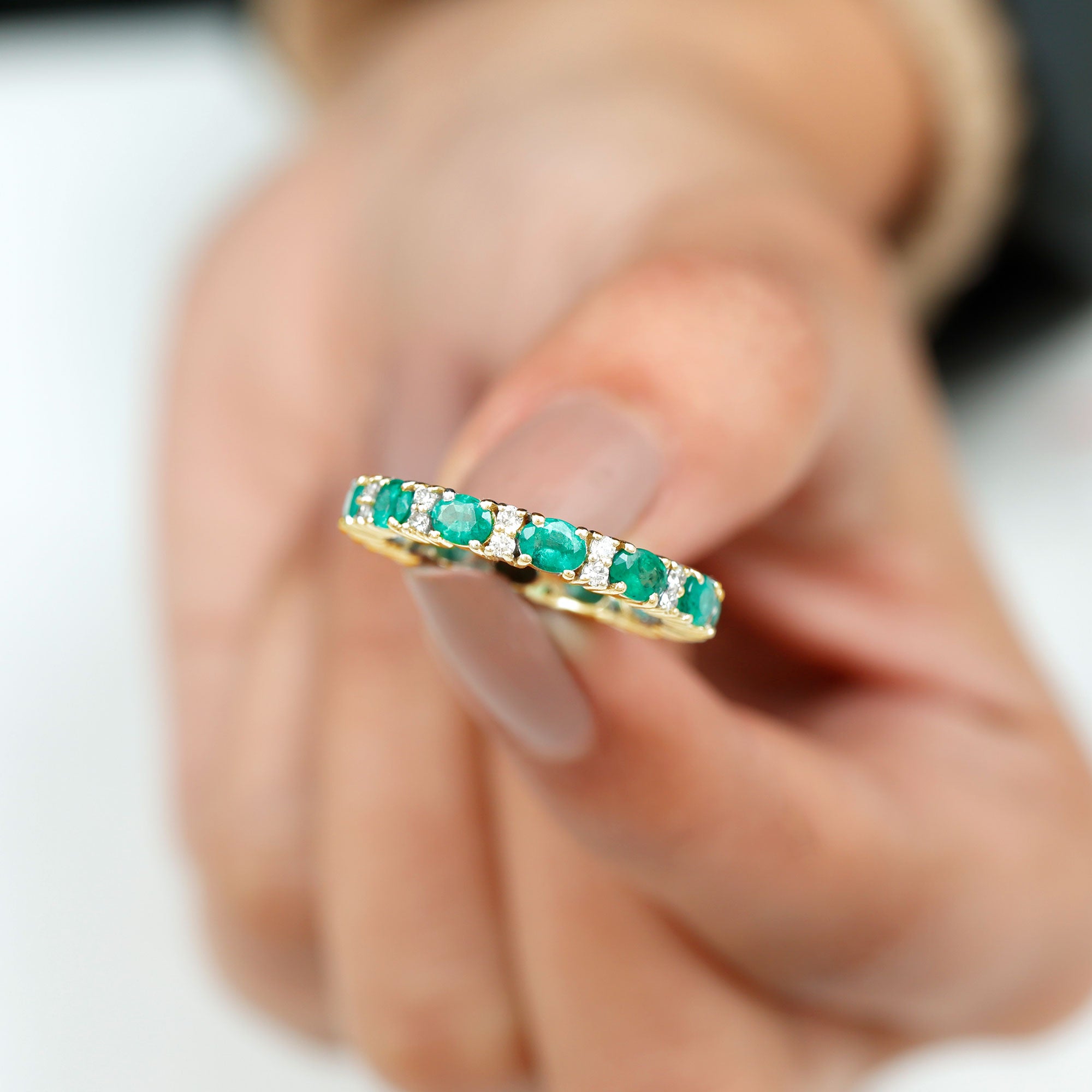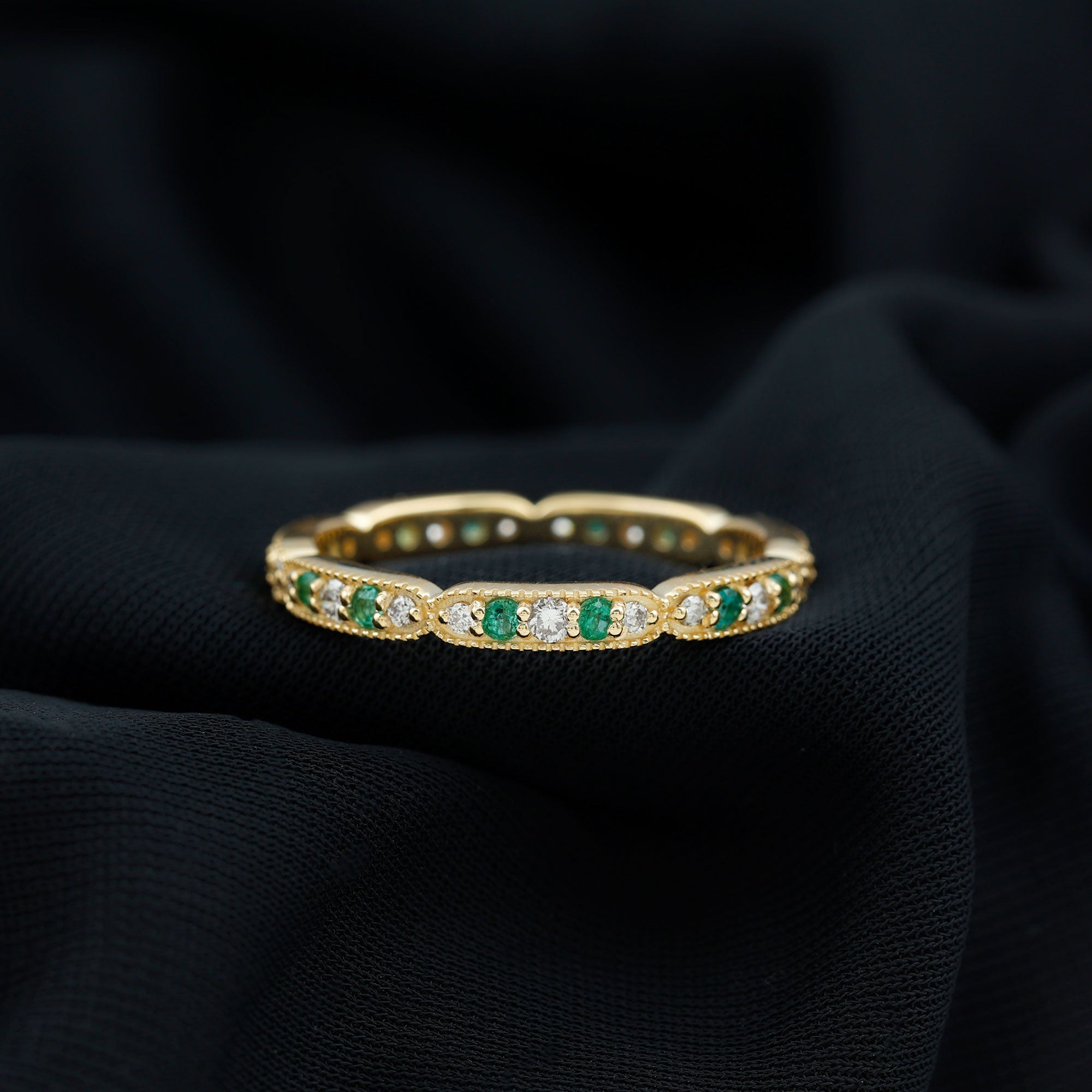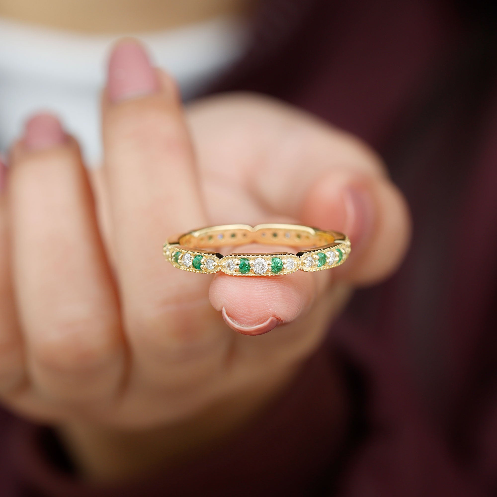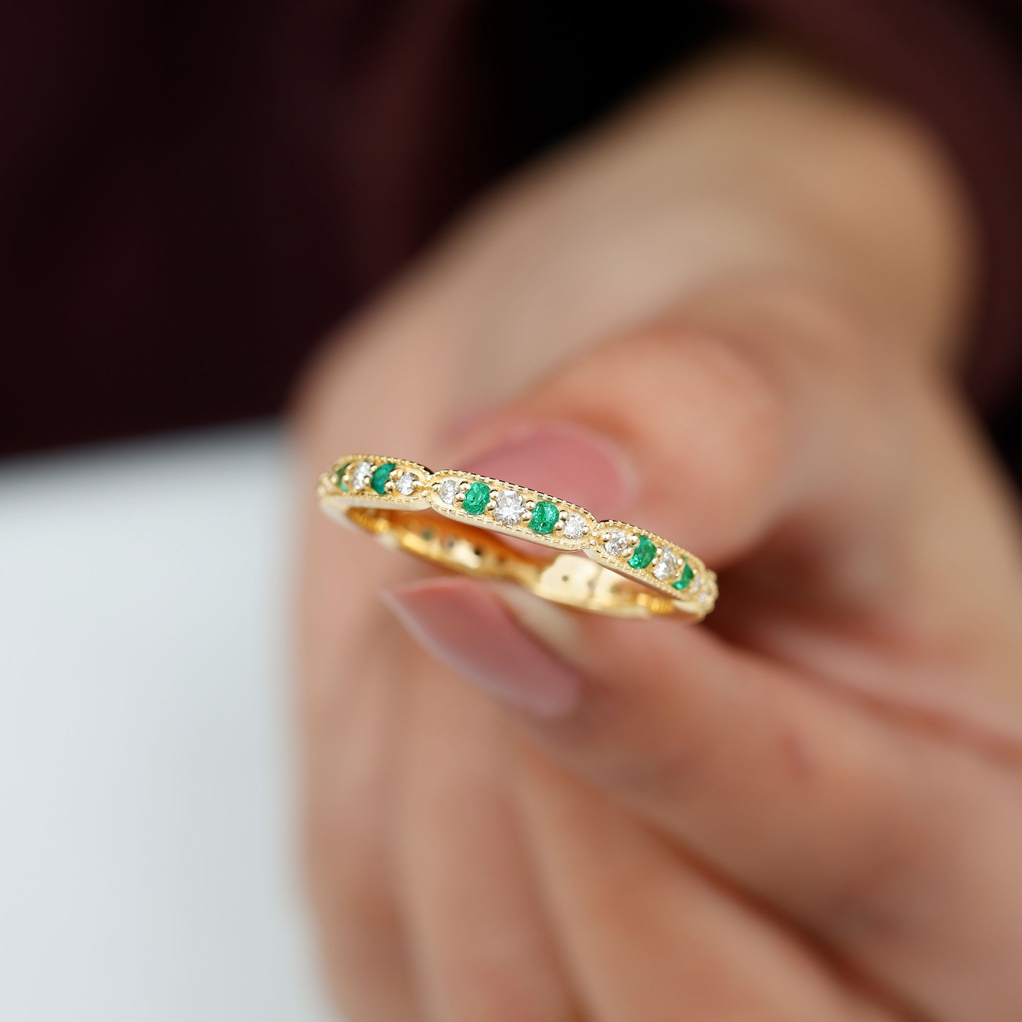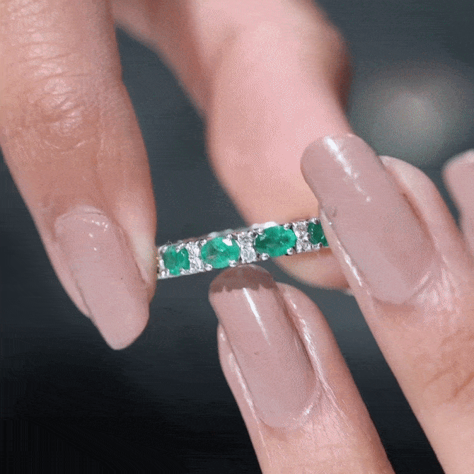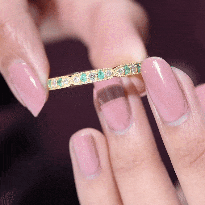 Typically, it is a type of metal ring that features gemstones set in a continuous band around the circumference of the ring. If you’re seeking something simple to flaunt regularly, a band with subtle colored stones such as Morganite, Aquamarine, Moissanite, or a Classic 14K White Gold Gemstone Band could be the one. While if you’re a little more fond of a pop of color, deeply hued stones such as Ruby, Blue Sapphire, Emerald etc., or a Yellow or Rose Gold Gemstone Band might do the job right.