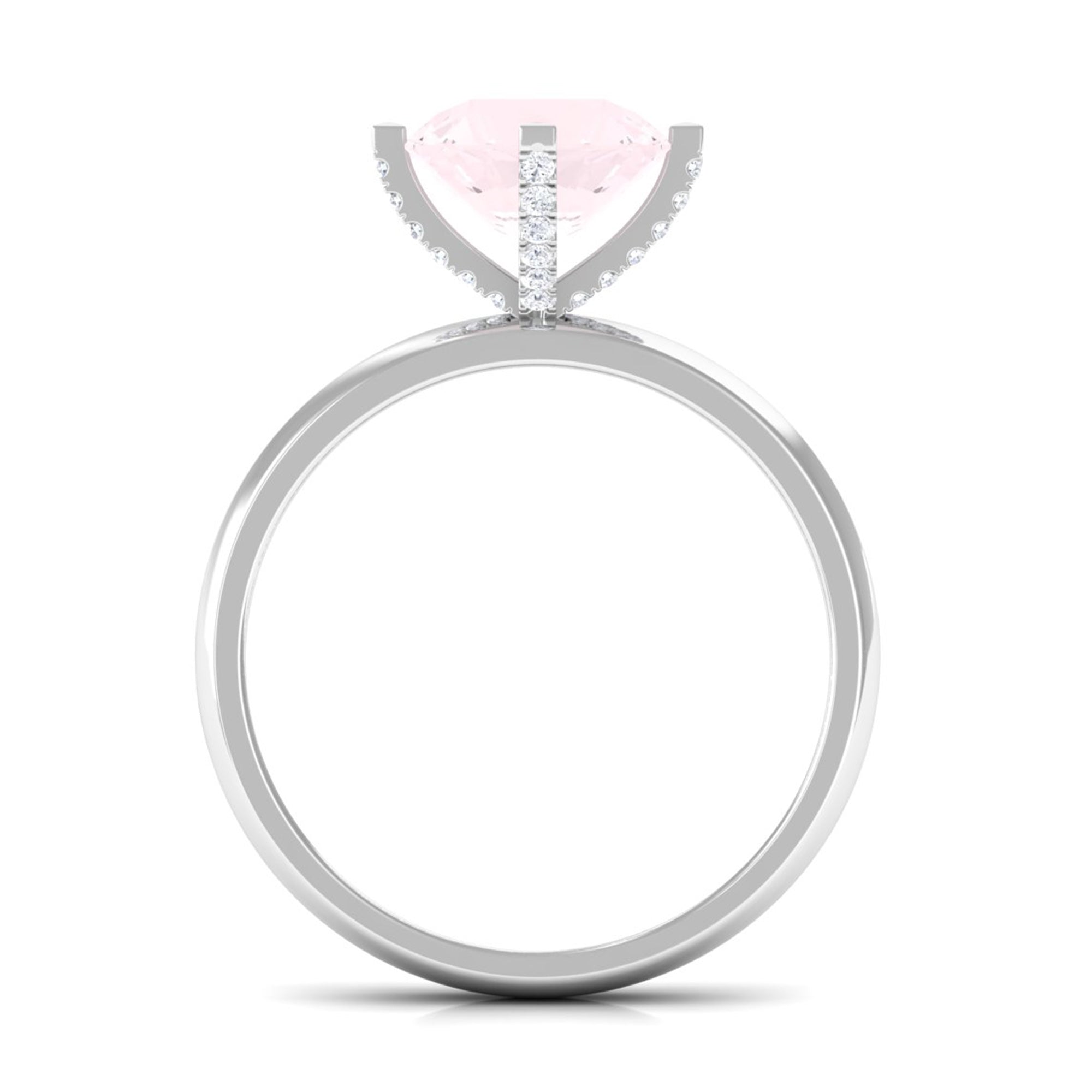 In a Halo Style, the center stone of Rose Quartz is beautified by a parade of Diamond/Moissanite all around. A Halo miraculously transforms the aesthetics of your Classic Solitaire of Rose Quartz by not only penning the spotlight on its beauty but also making it appear larger. That makes it a unique cum relatively flashy Rose Quartz Engagement Ring.