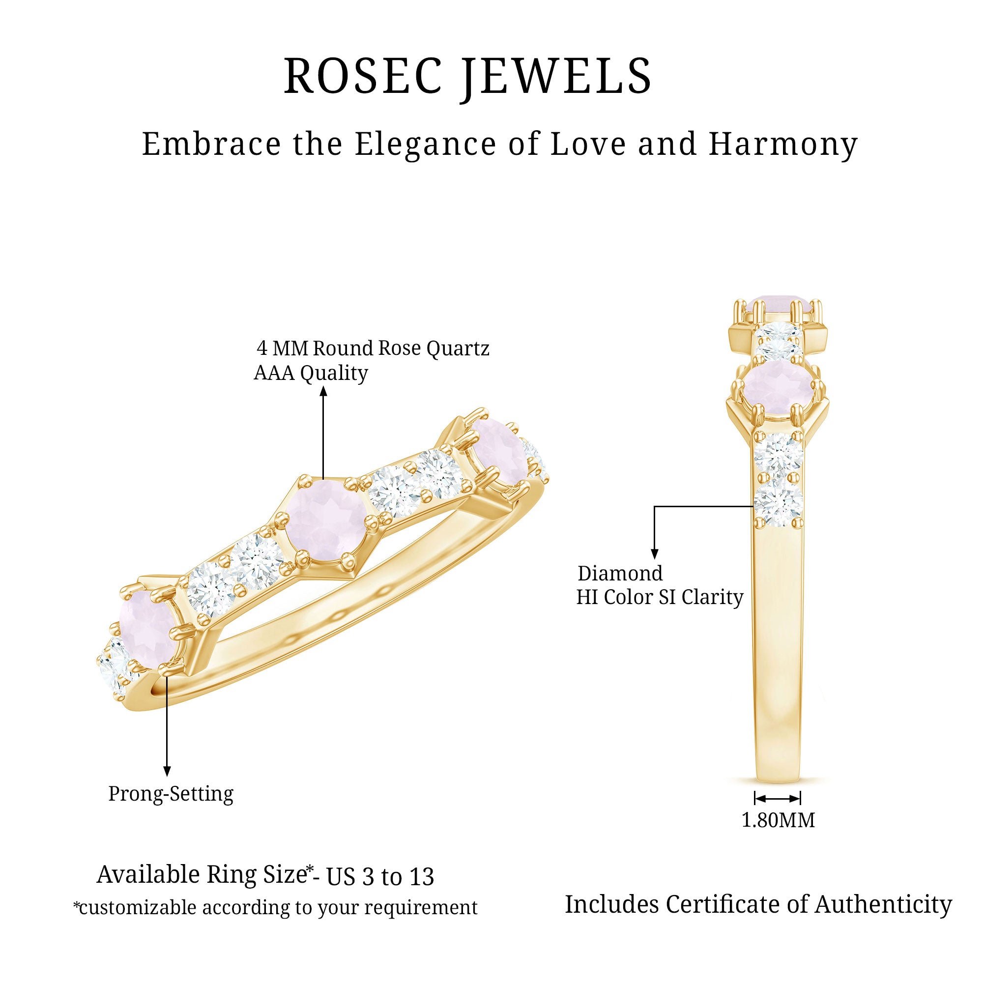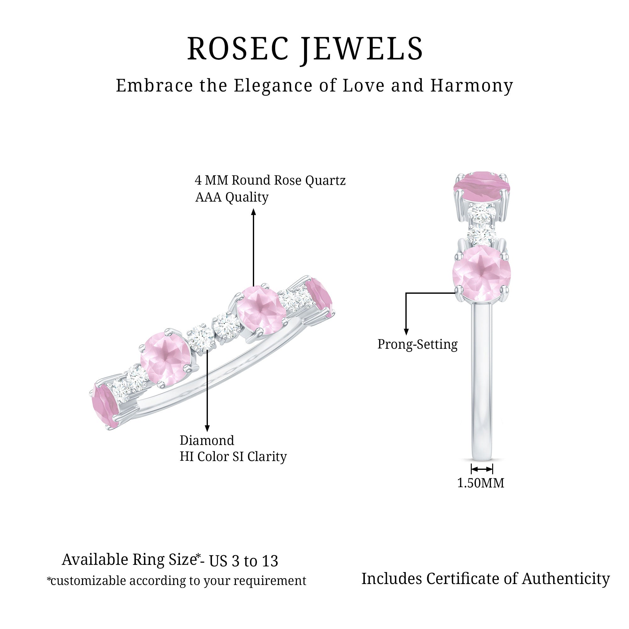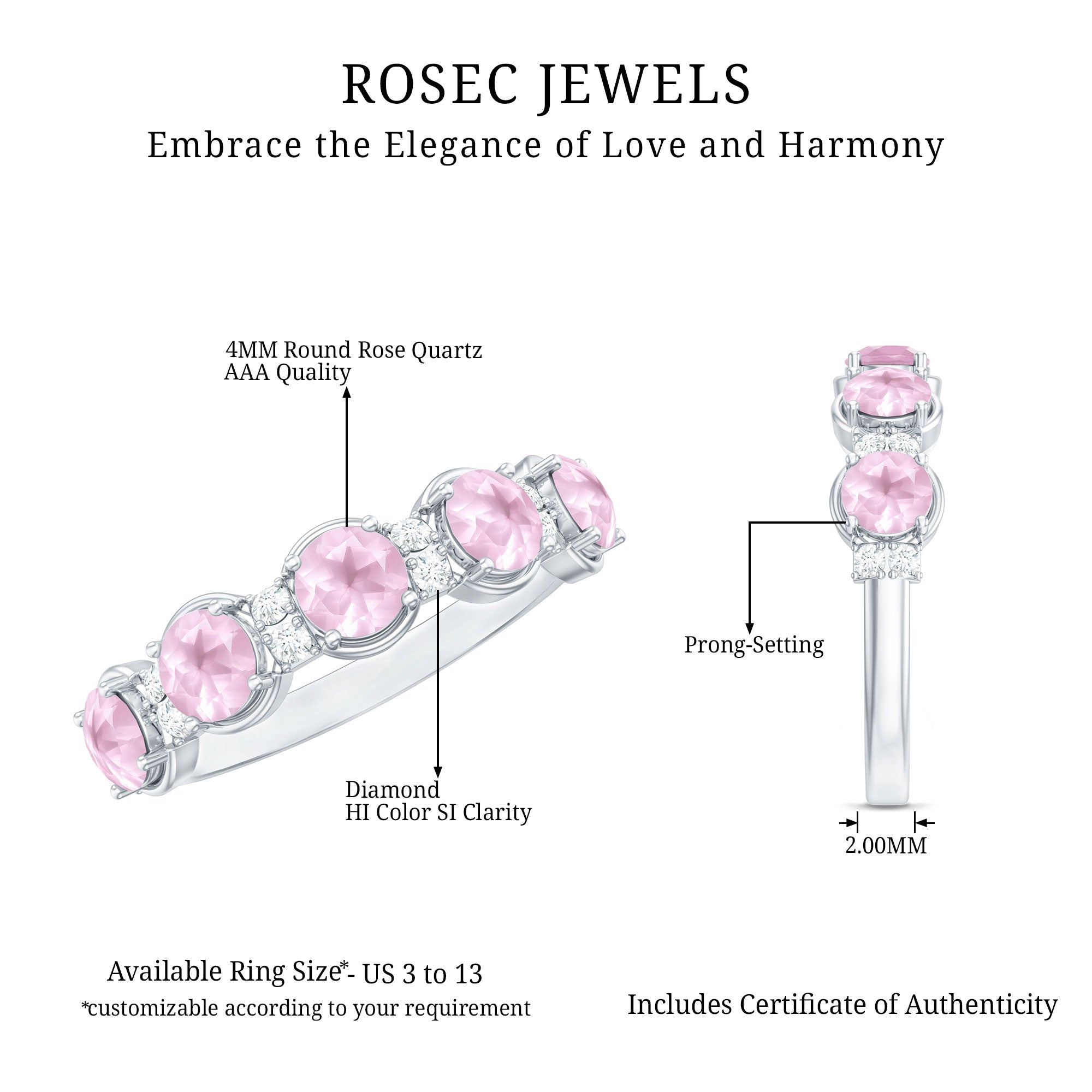 While buying rose quartz wedding bands one should look for the SGL certification which vouch for the authenticity of rose quartz rings by Rosec Jewels.