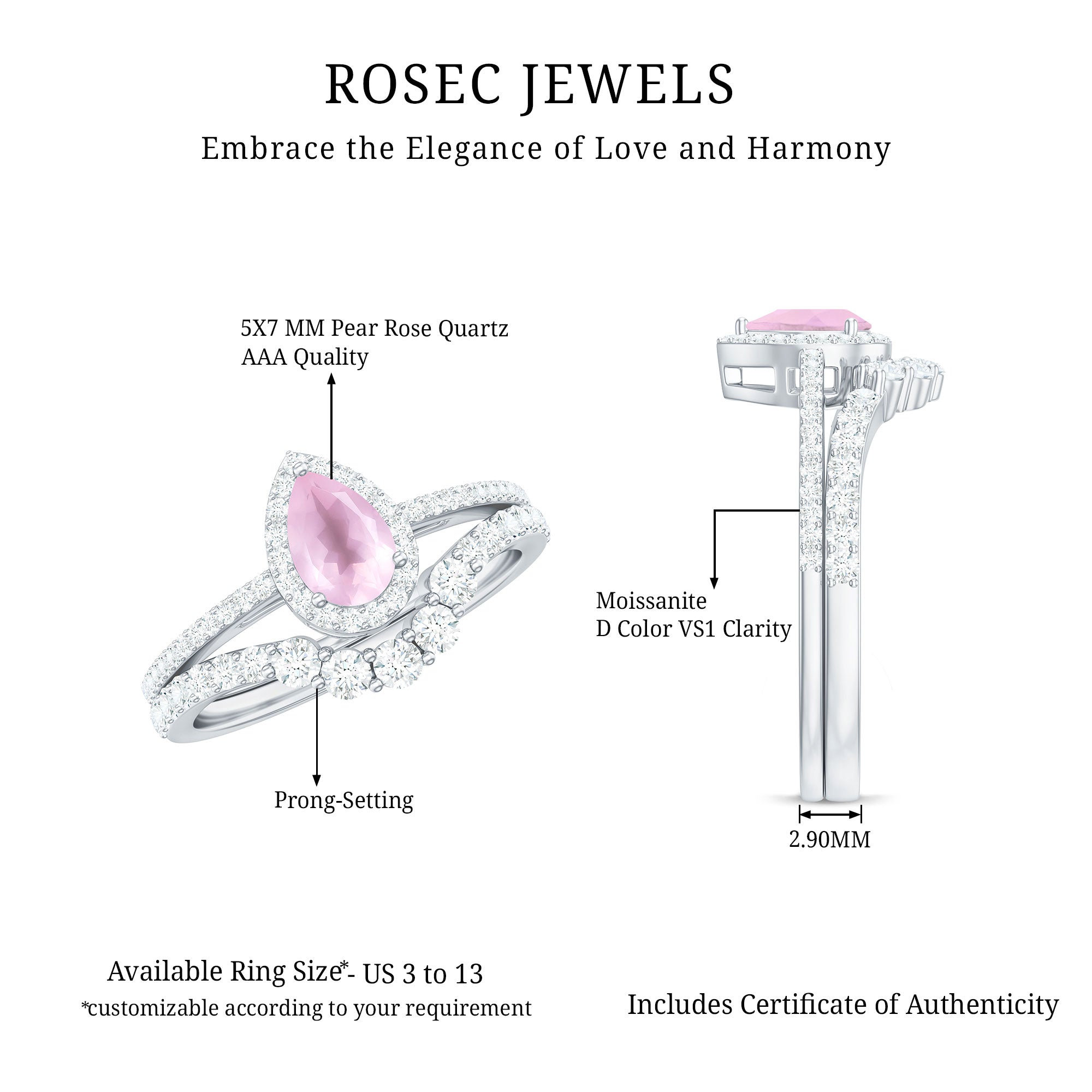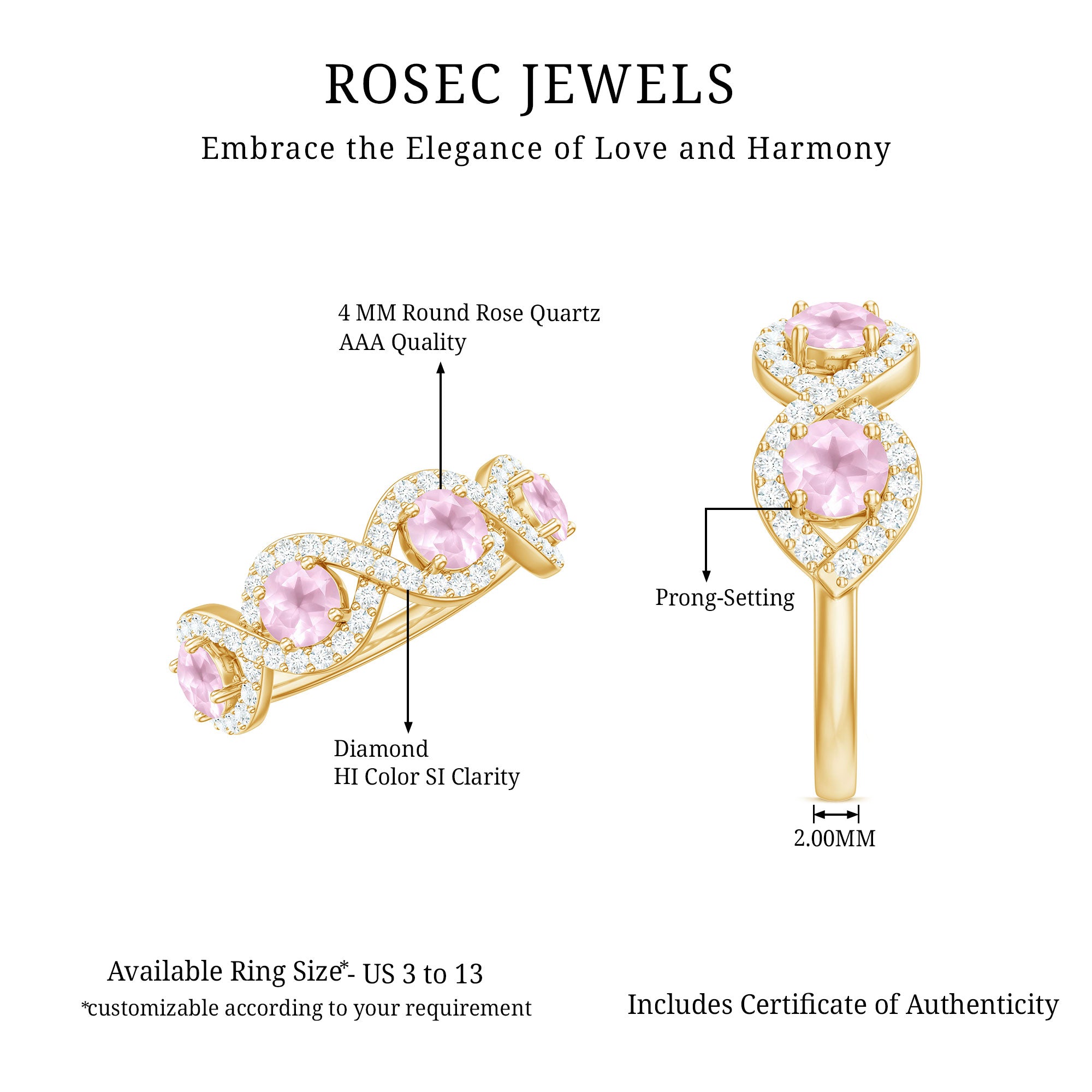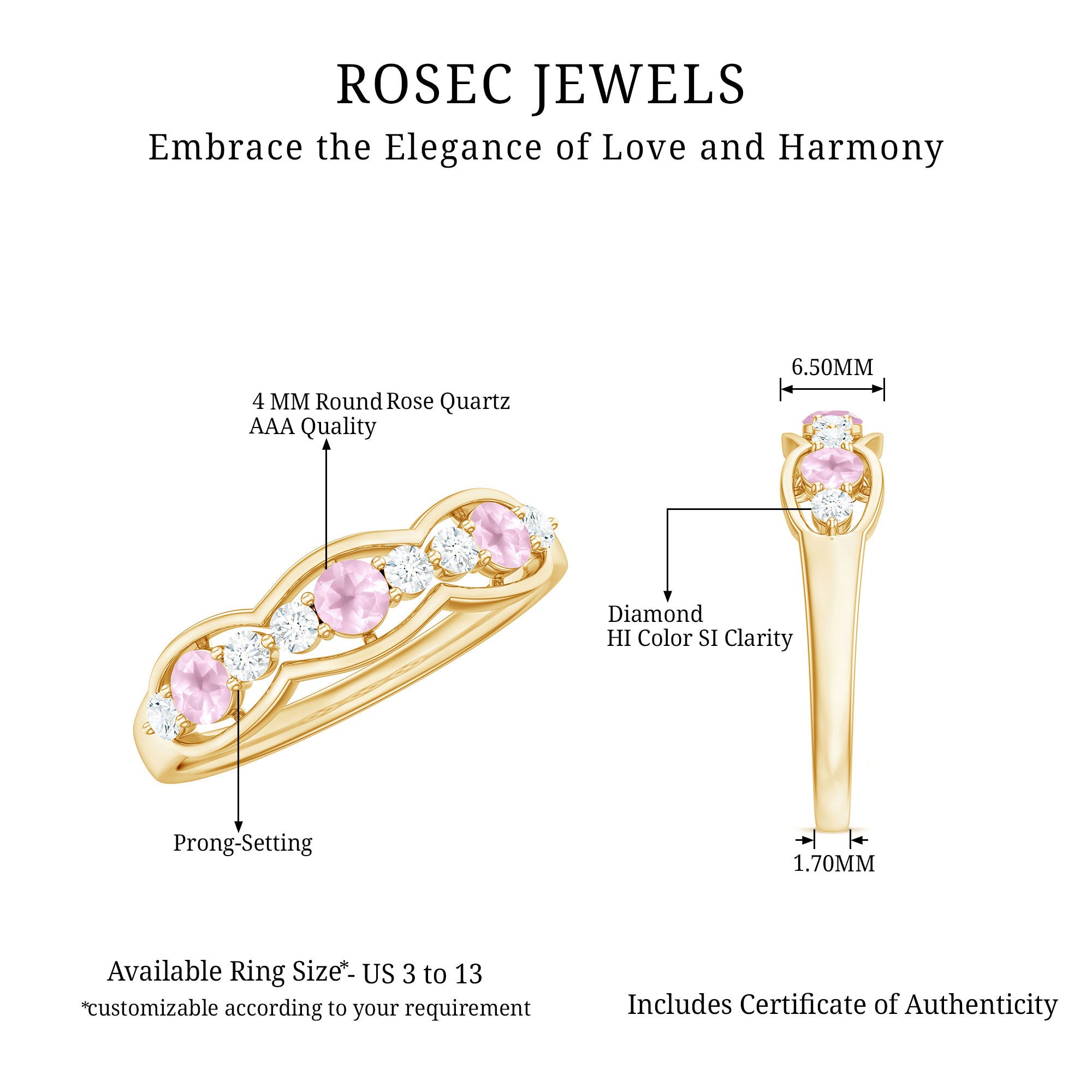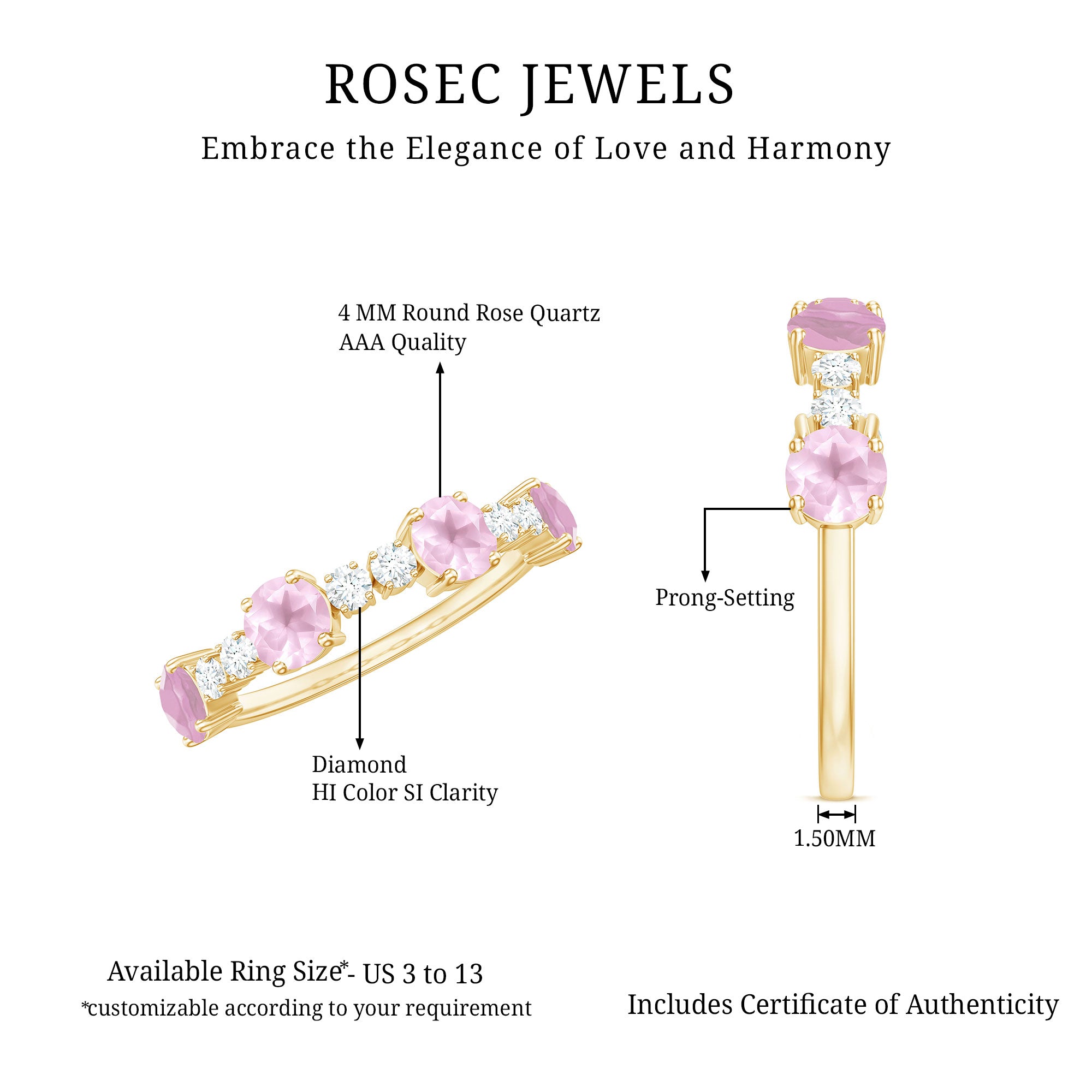 While buying rose quartz wedding bands one should look for the SGL certification which vouch for the authenticity of rose quartz rings by Rosec Jewels.