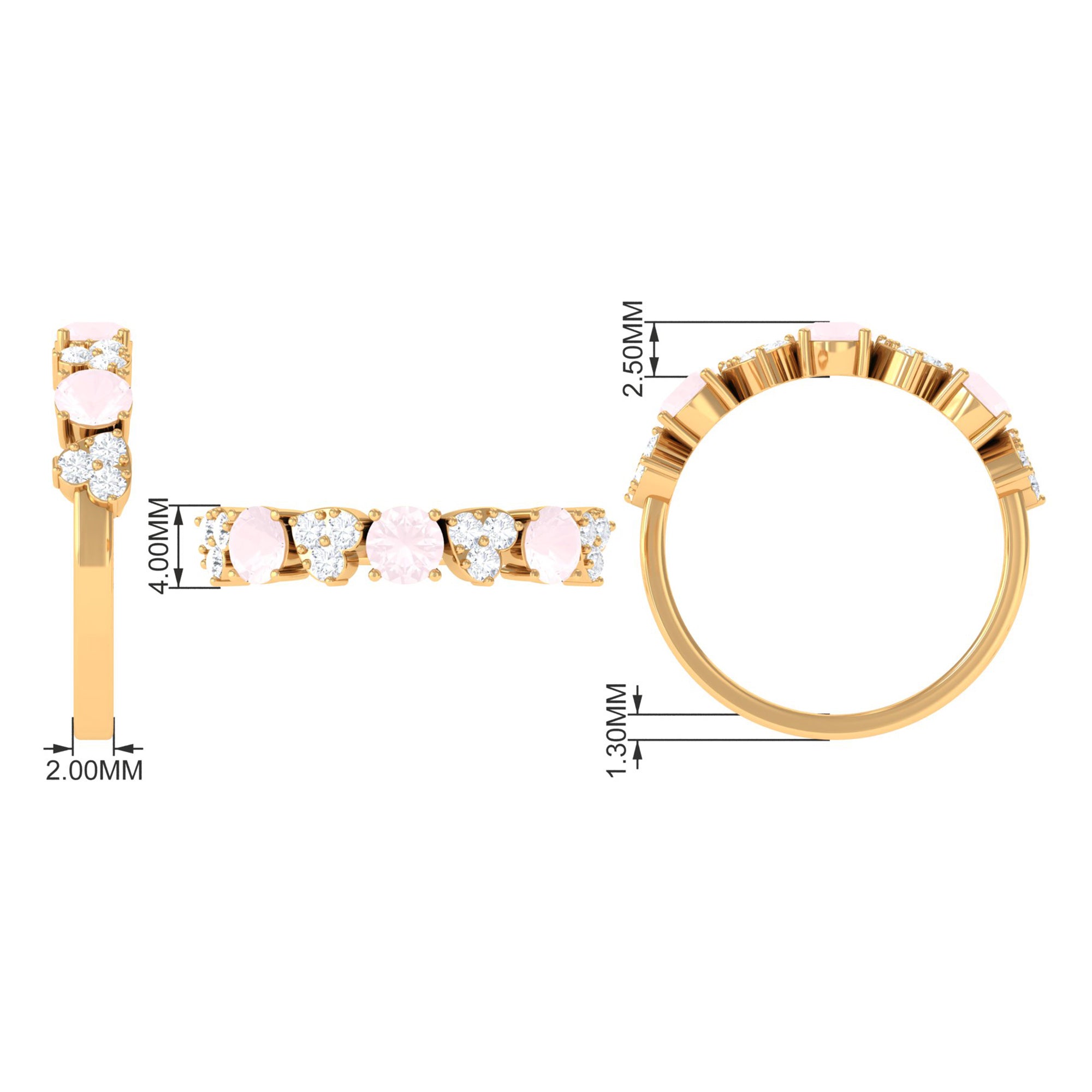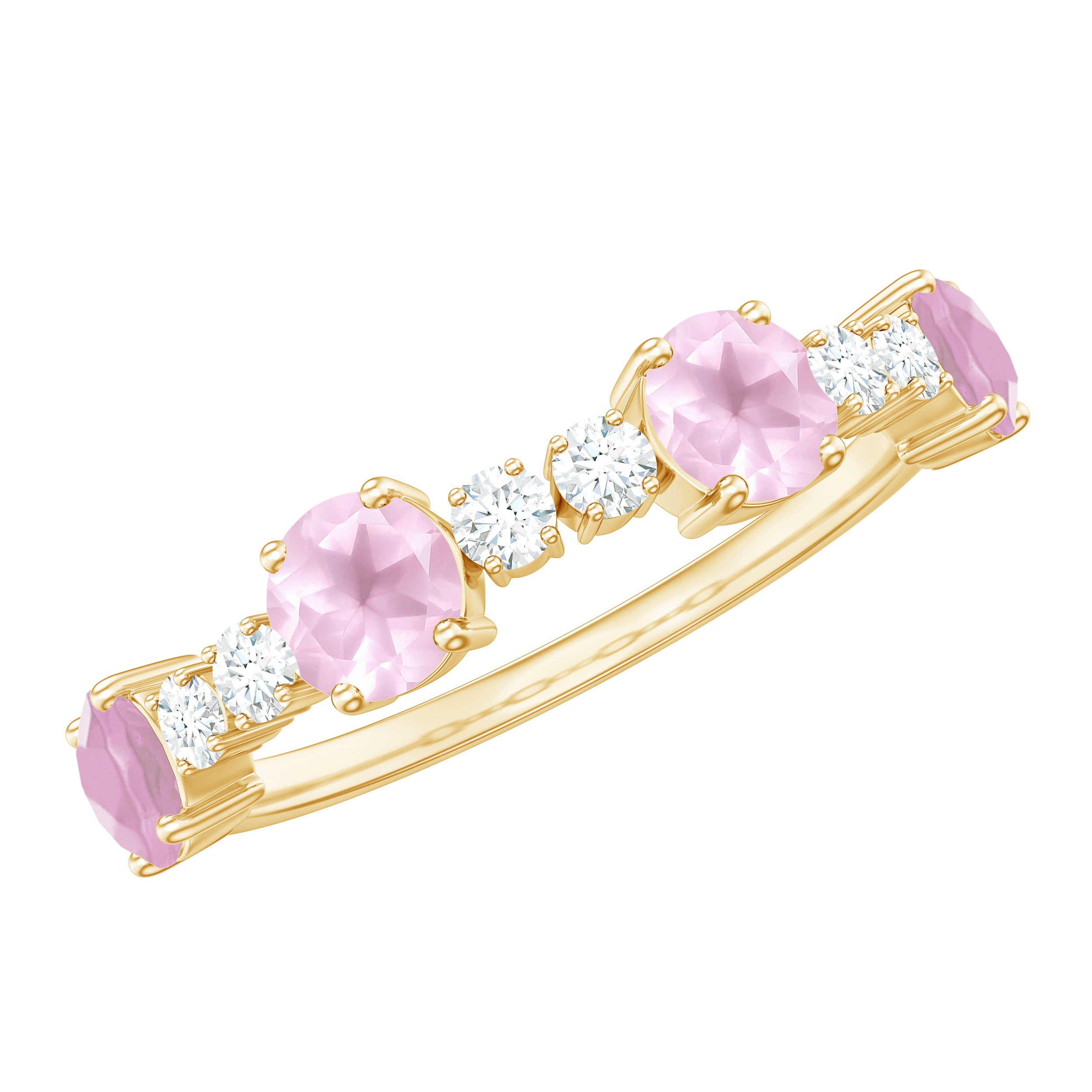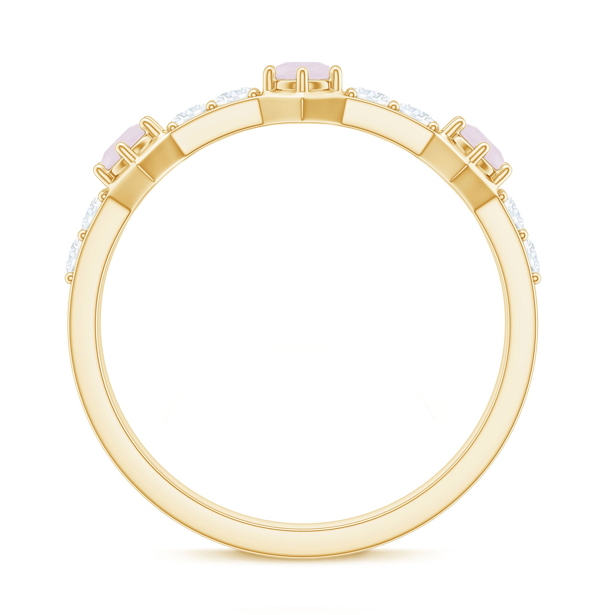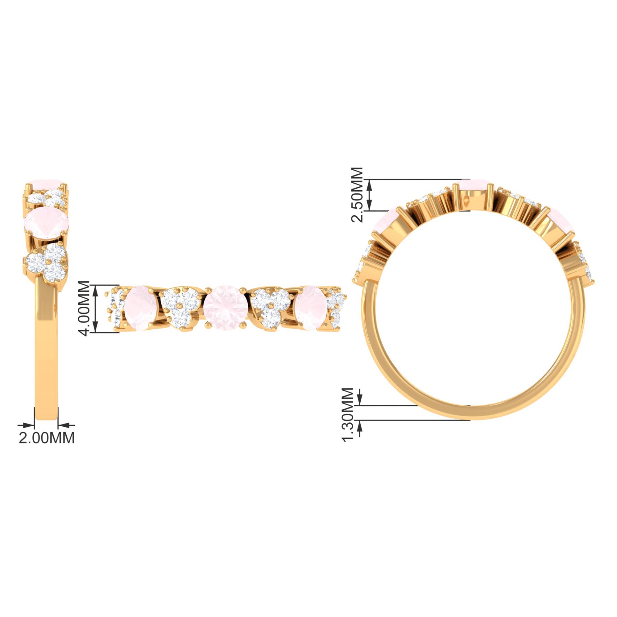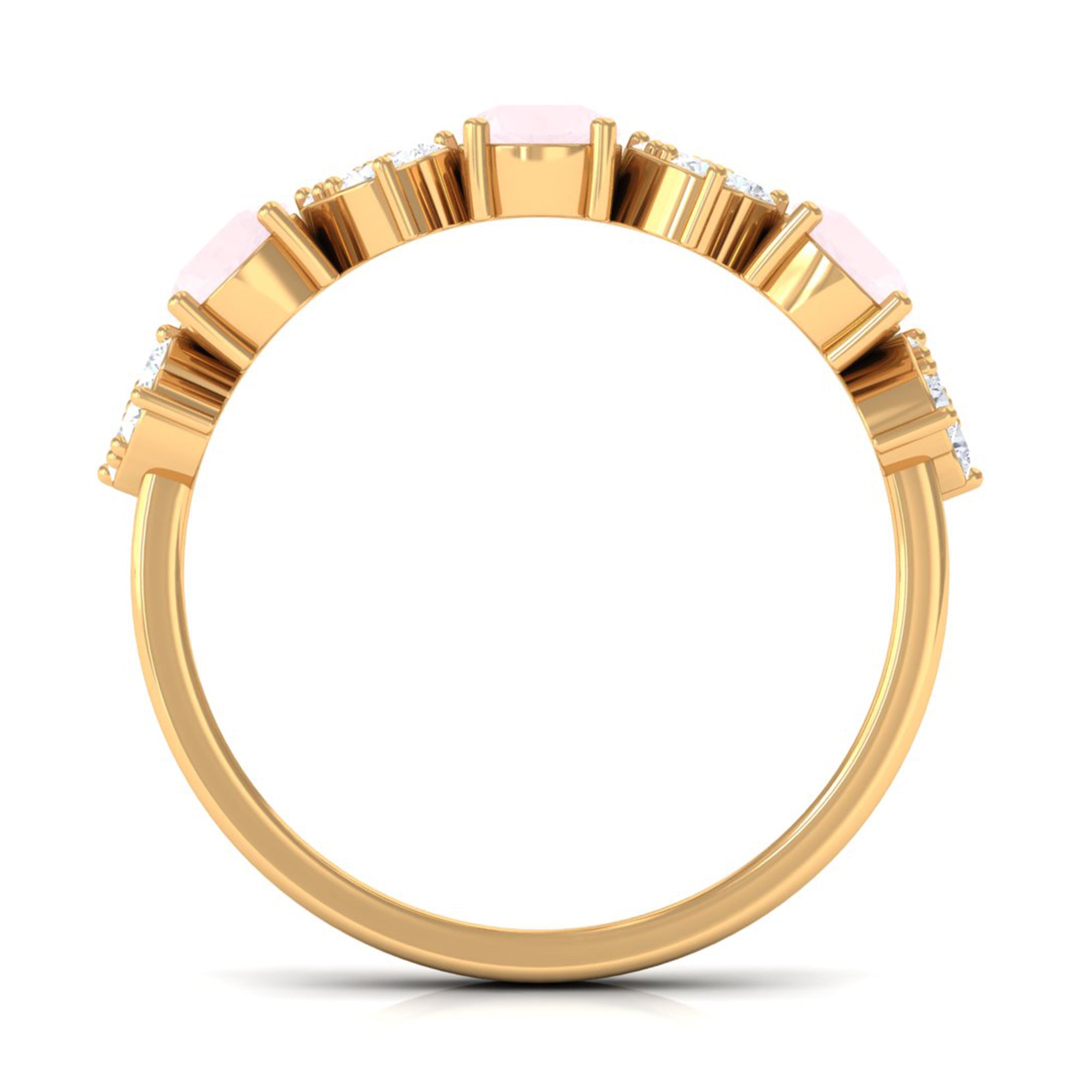 The delicate and soft pink hues of rose quartz has motivated our artisans to combine them with the alluring colors of gold further helping us in curating fantastic rose quartz band in white gold, yellow gold and rose gold. A wide diversity in our wedding ring design is effectively achieved by different rose quartz shapes, gemstone settings and metal embellishments. Therefore, Rosec Jewels’ collection of adorable rose quartz band rings are best suited for women with eyes for delicate details and romantic hues of the rose quartz.