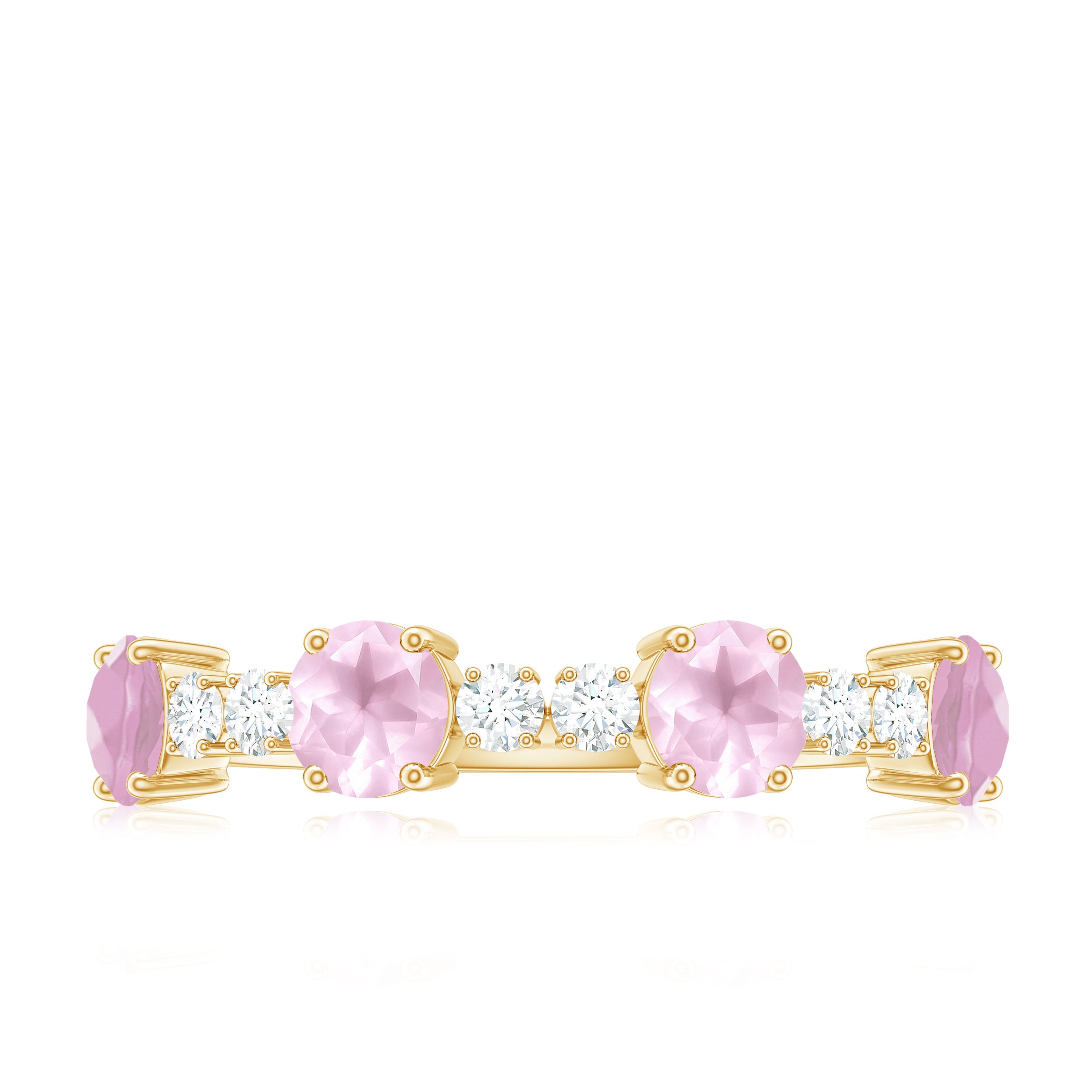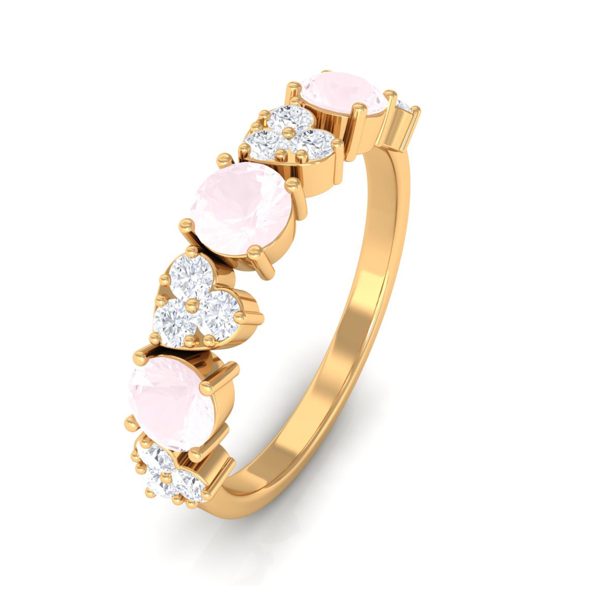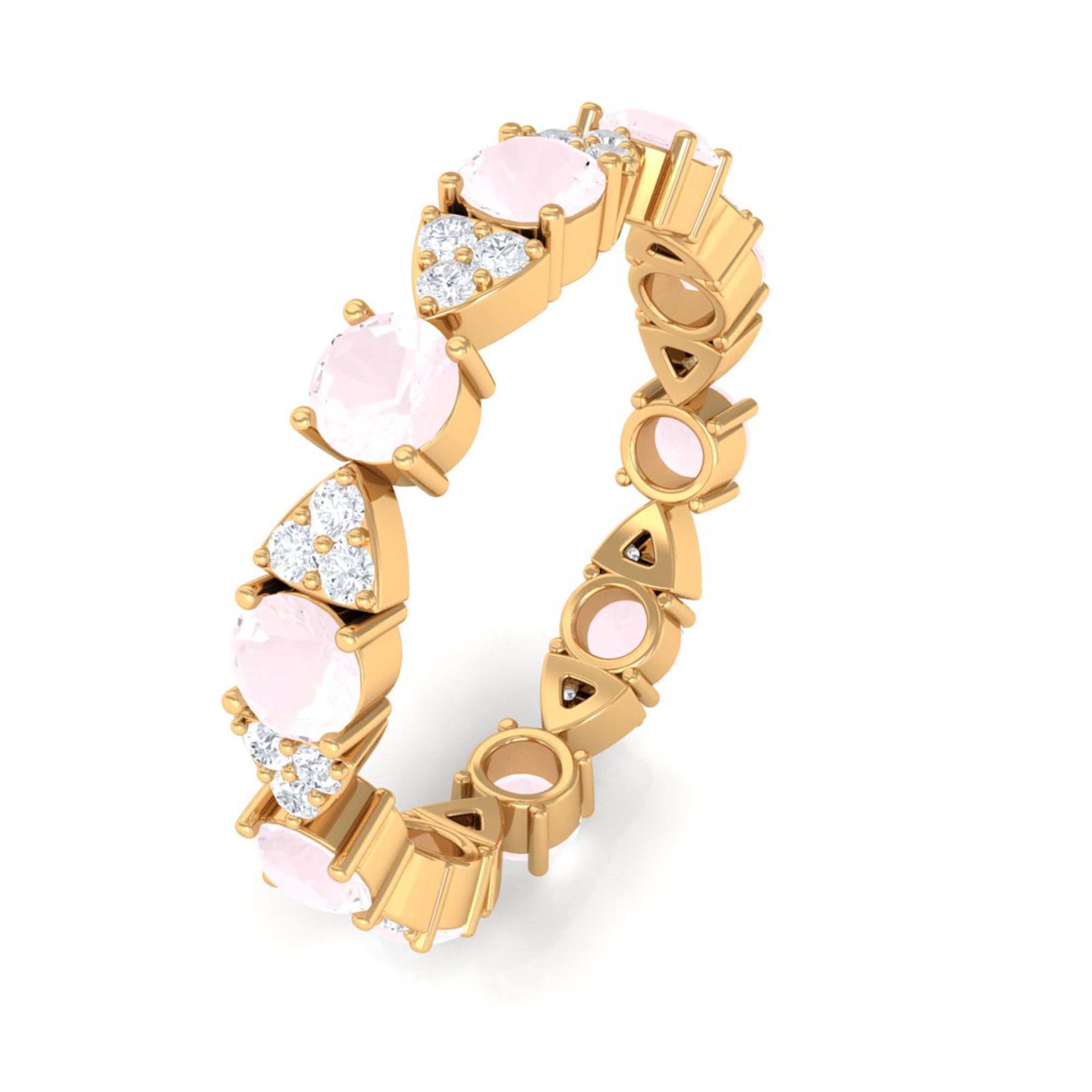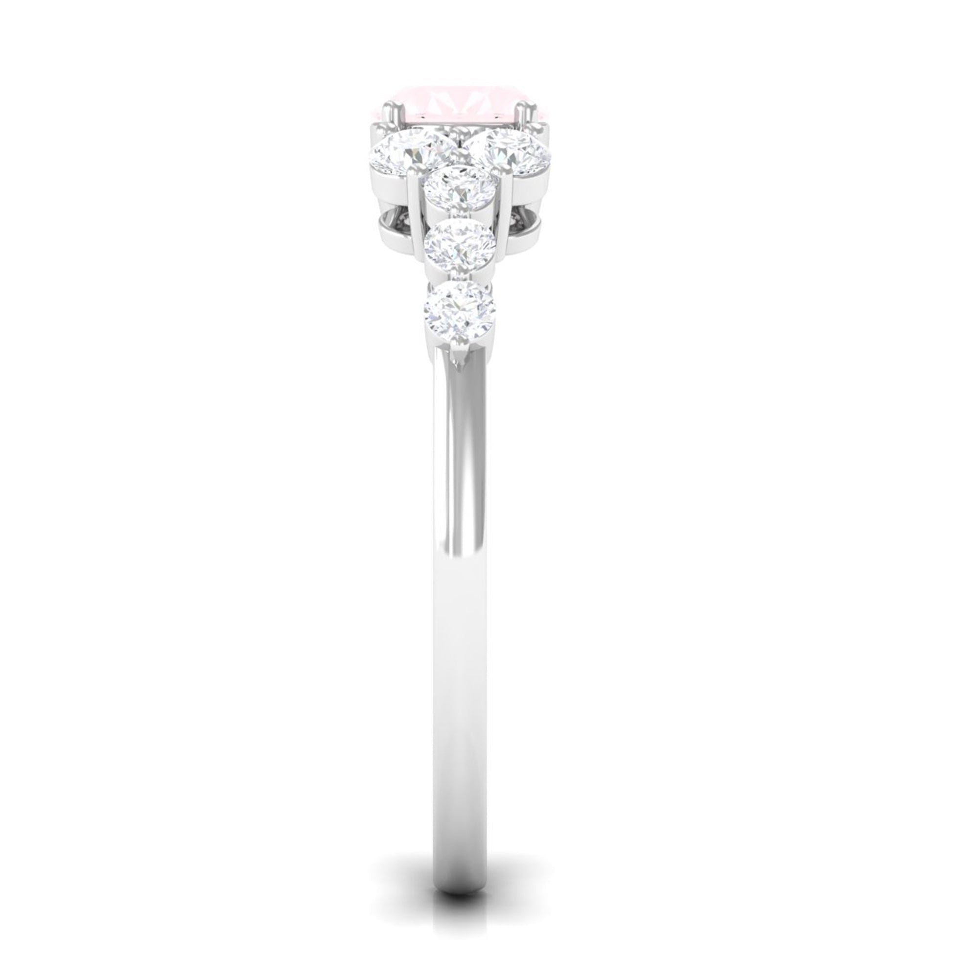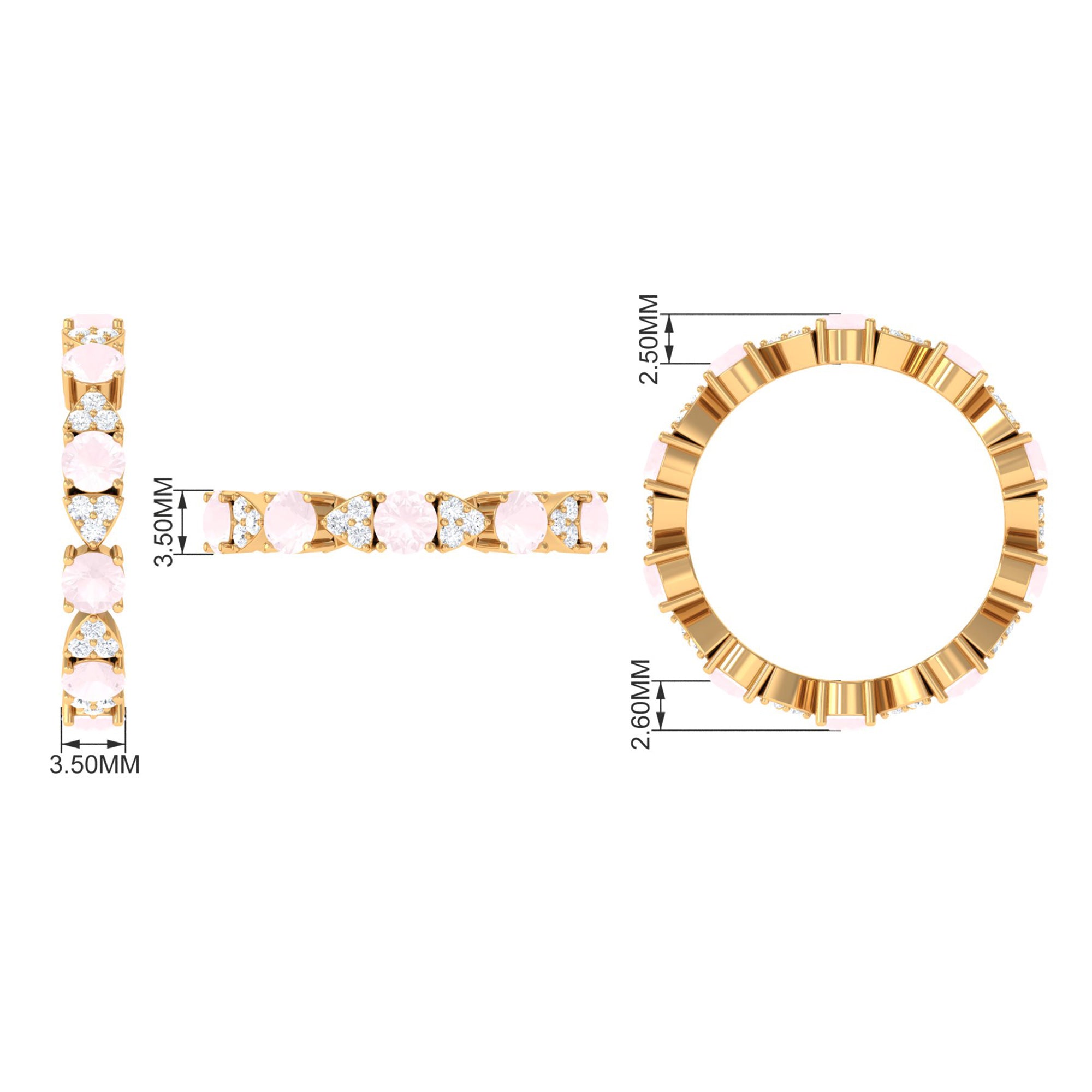 The delicate and soft pink hues of rose quartz has motivated our artisans to combine them with the alluring colors of gold further helping us in curating fantastic rose quartz band in white gold, yellow gold and rose gold. A wide diversity in our wedding ring design is effectively achieved by different rose quartz shapes, gemstone settings and metal embellishments. Therefore, Rosec Jewels’ collection of adorable rose quartz band rings are best suited for women with eyes for delicate details and romantic hues of the rose quartz.