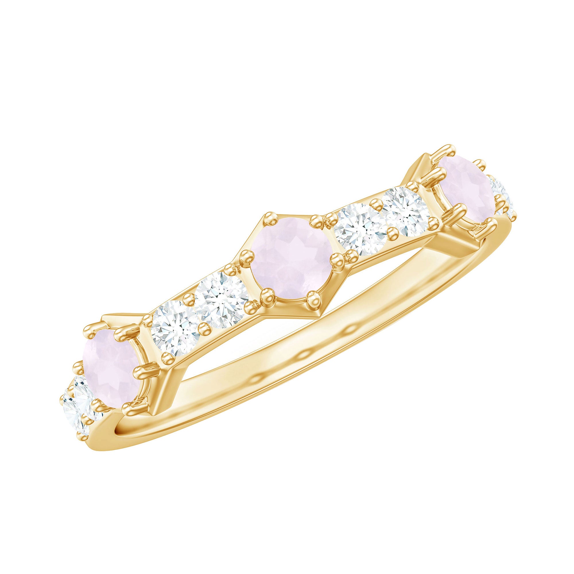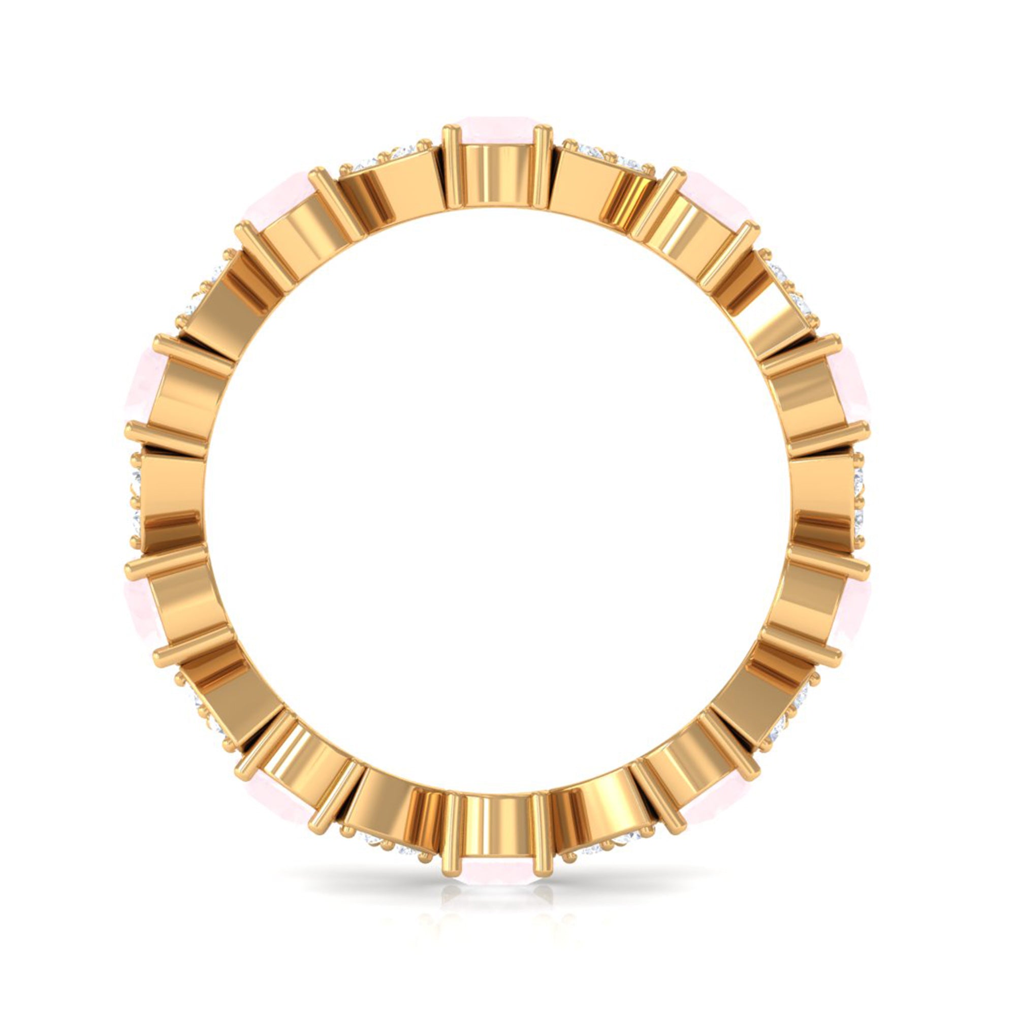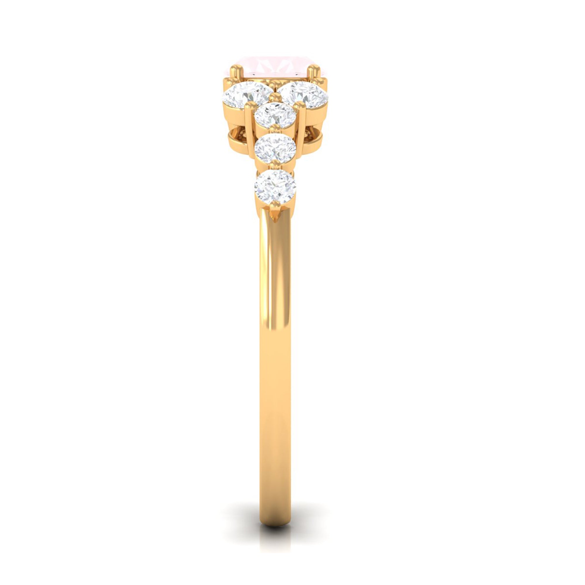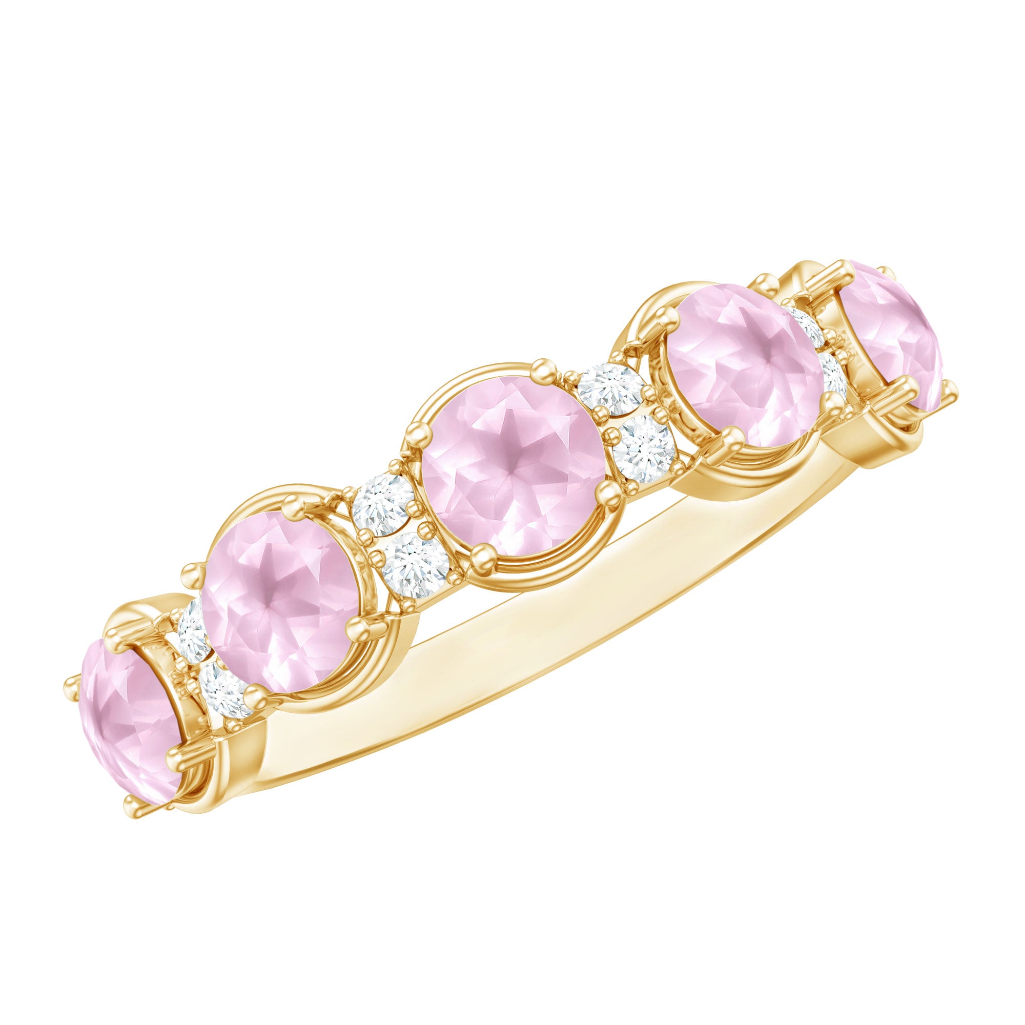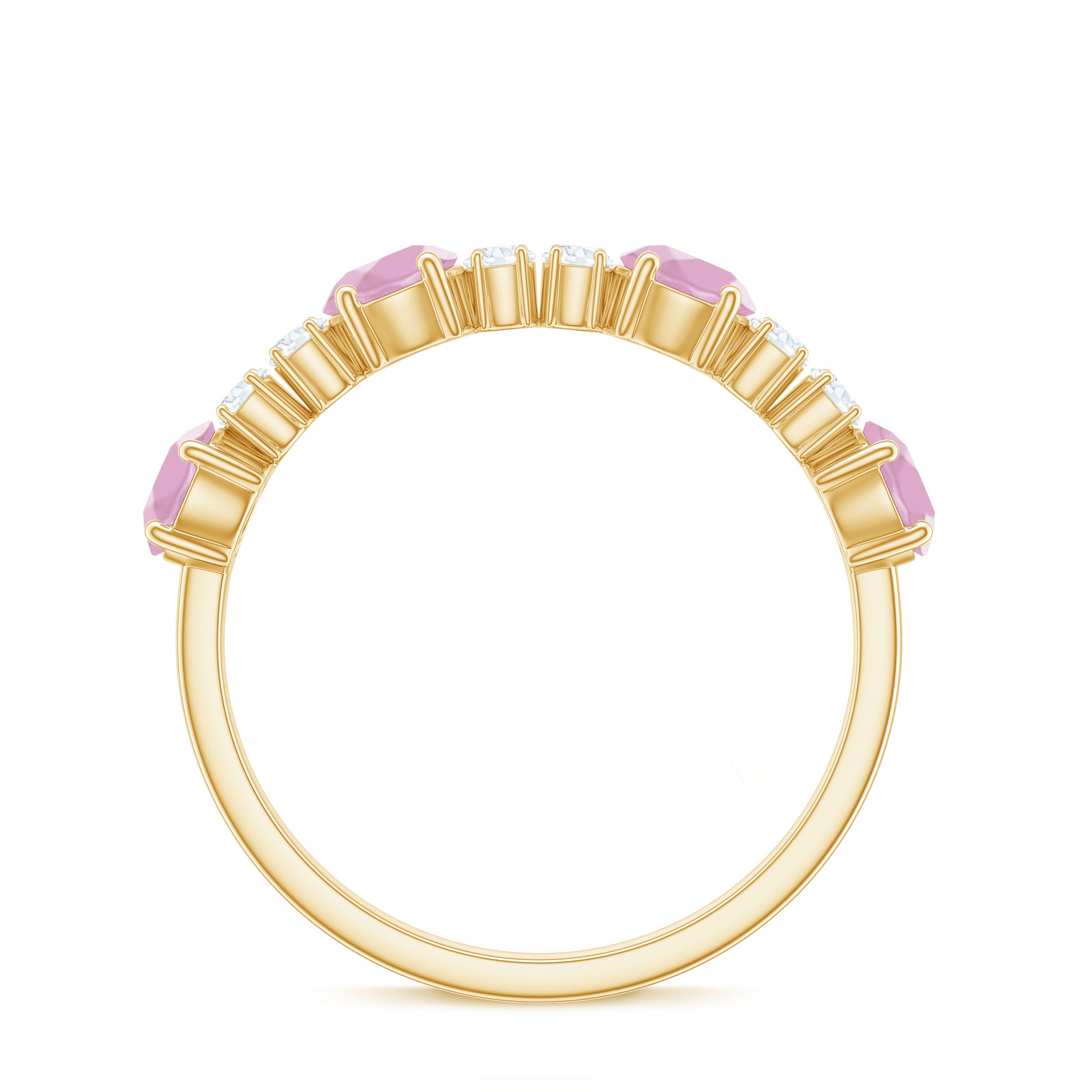 The delicate and soft pink hues of rose quartz has motivated our artisans to combine them with the alluring colors of gold further helping us in curating fantastic rose quartz band in white gold, yellow gold and rose gold. A wide diversity in our wedding ring design is effectively achieved by different rose quartz shapes, gemstone settings and metal embellishments. Therefore, Rosec Jewels’ collection of adorable rose quartz band rings are best suited for women with eyes for delicate details and romantic hues of the rose quartz.