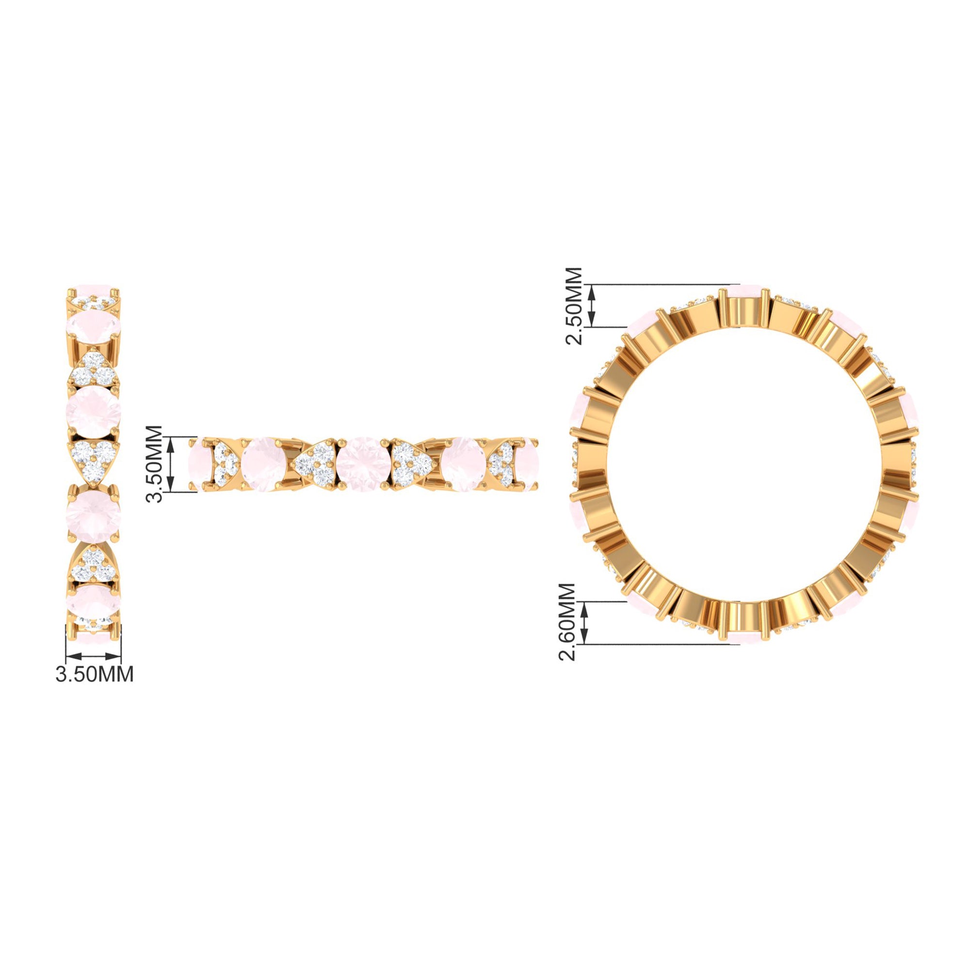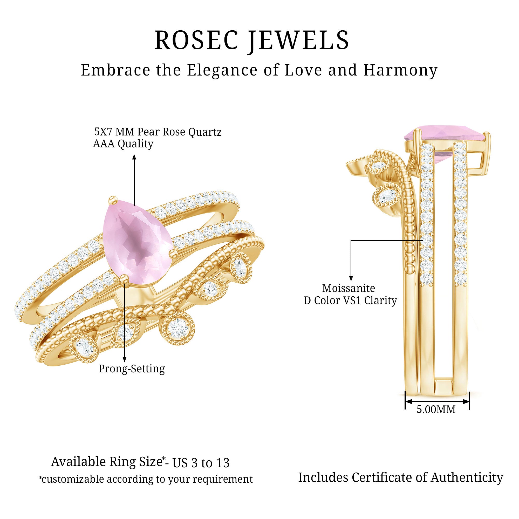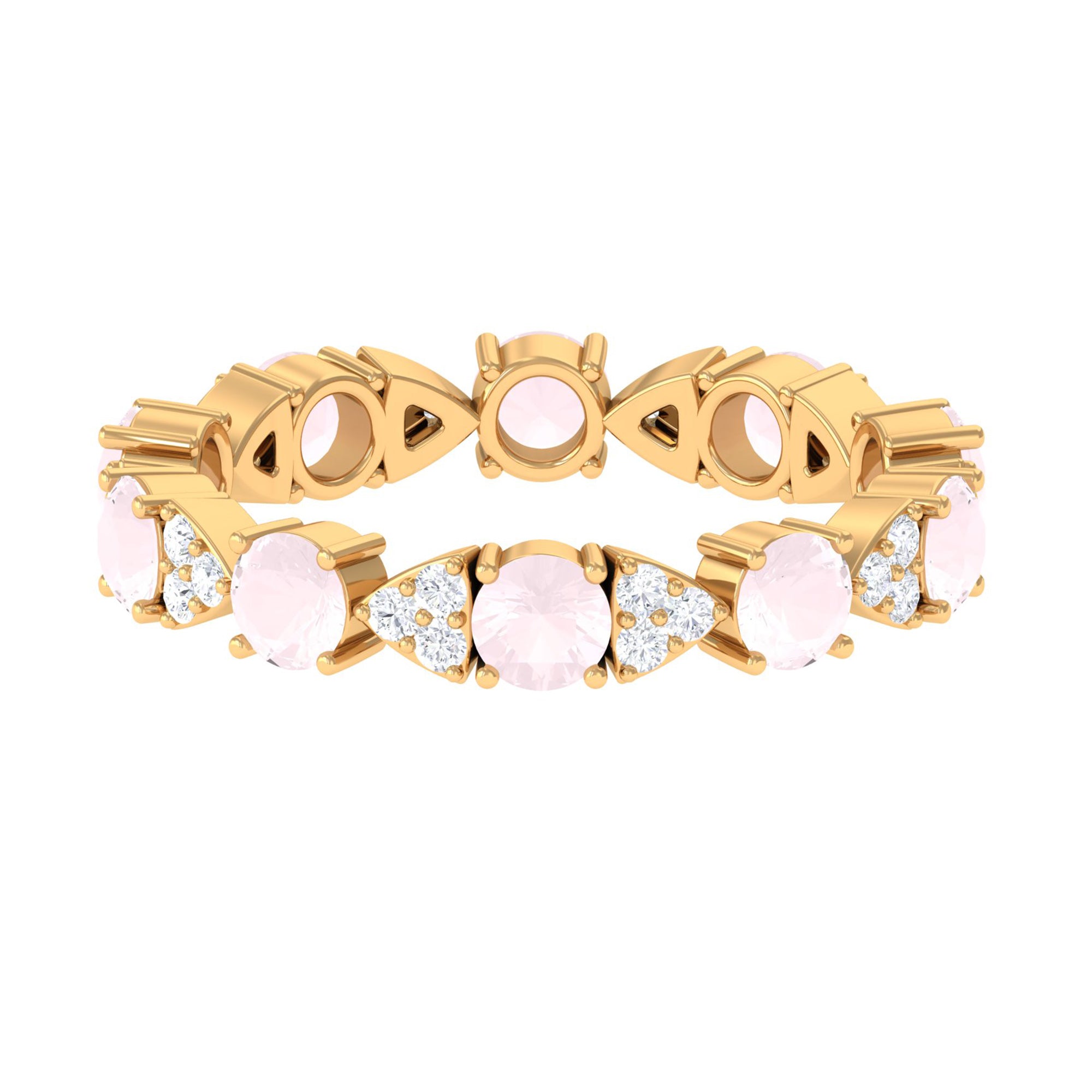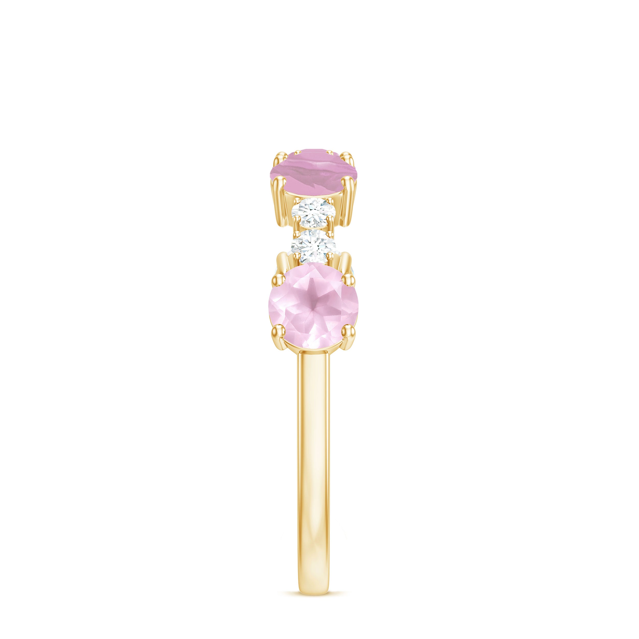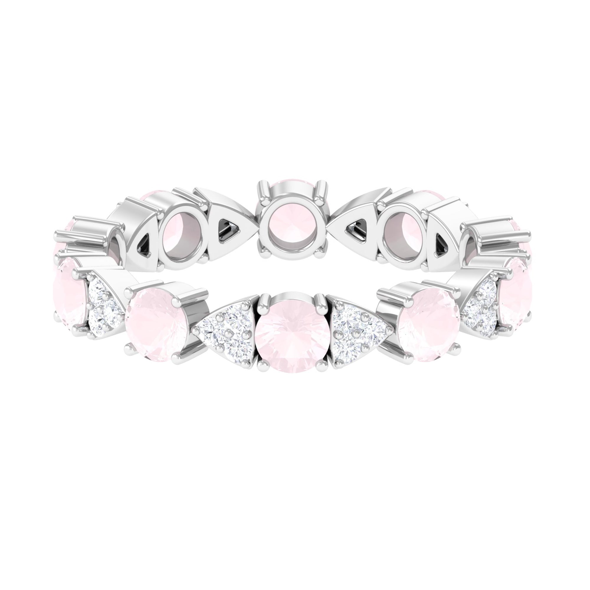 The delicate and soft pink hues of rose quartz has motivated our artisans to combine them with the alluring colors of gold further helping us in curating fantastic rose quartz band in white gold, yellow gold and rose gold. A wide diversity in our wedding ring design is effectively achieved by different rose quartz shapes, gemstone settings and metal embellishments. Therefore, Rosec Jewels’ collection of adorable rose quartz band rings are best suited for women with eyes for delicate details and romantic hues of the rose quartz.