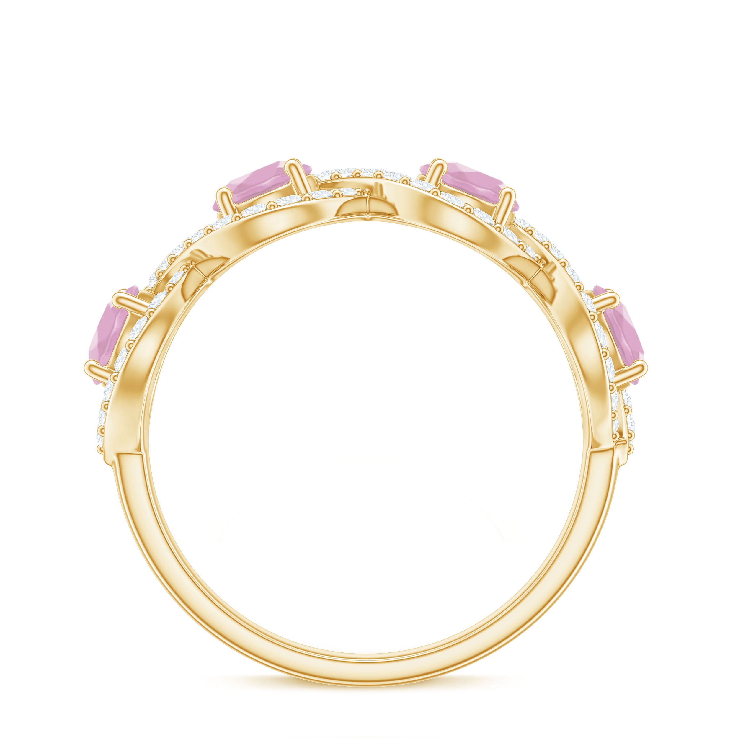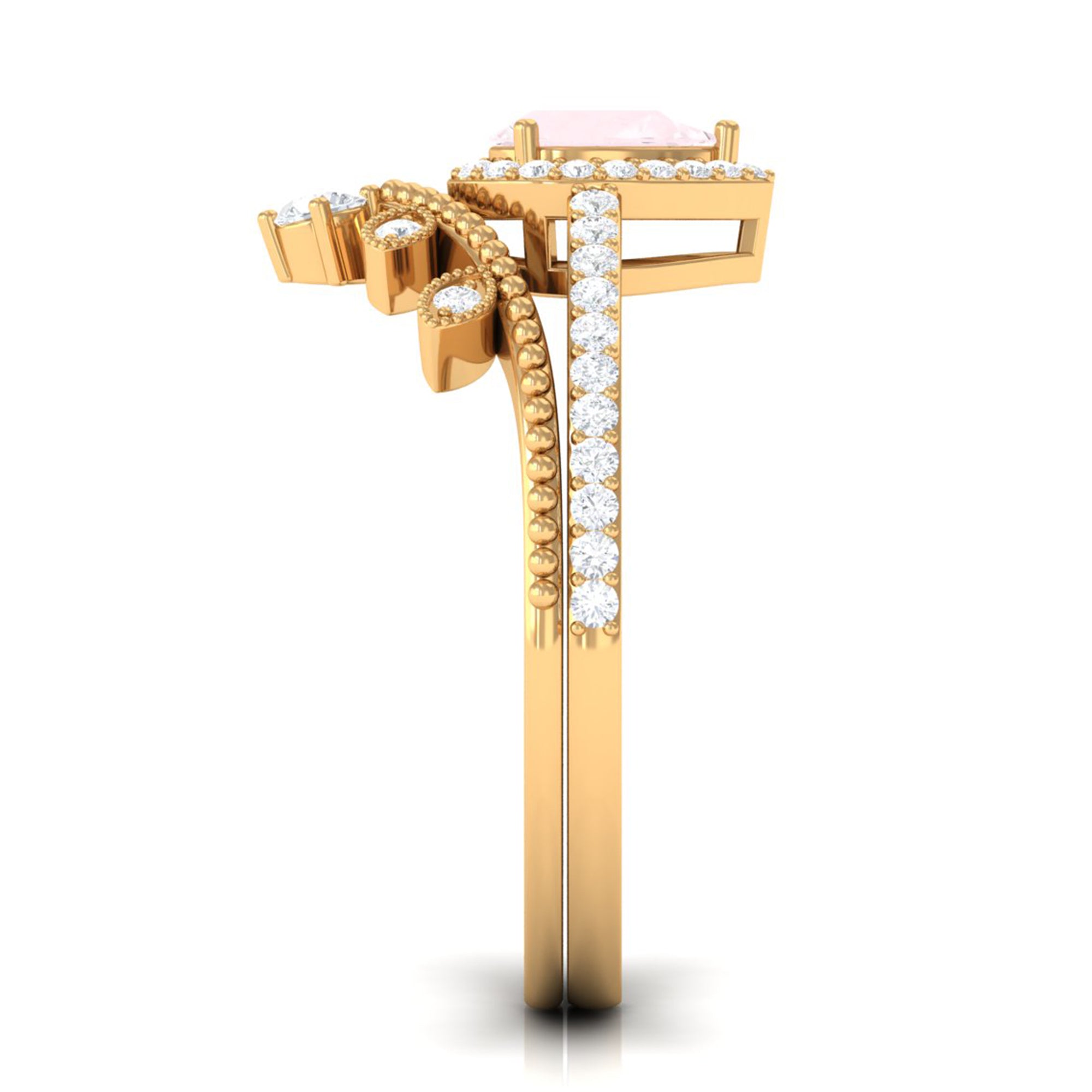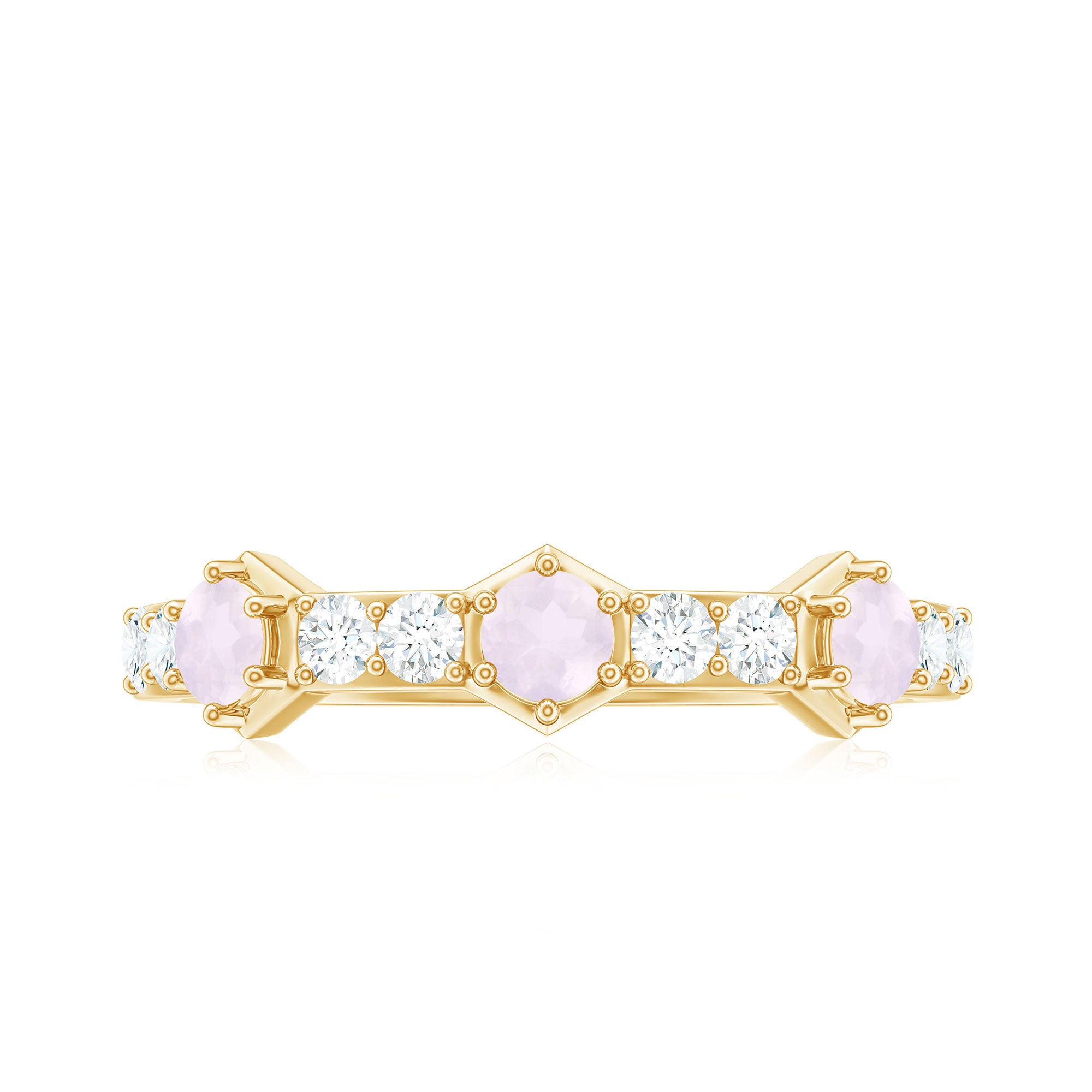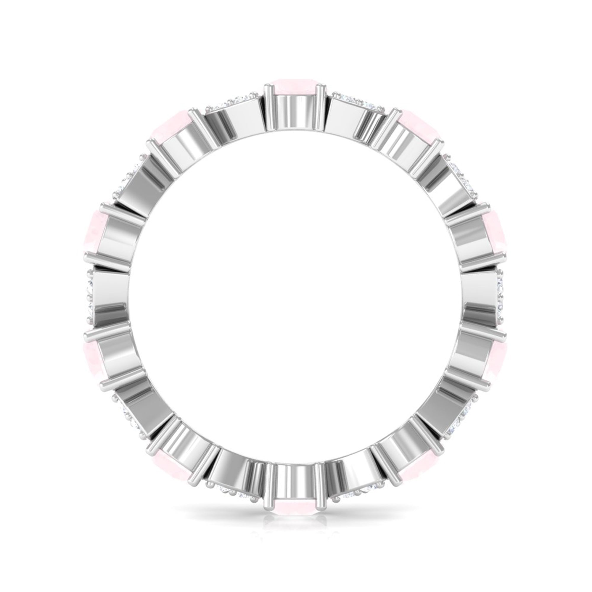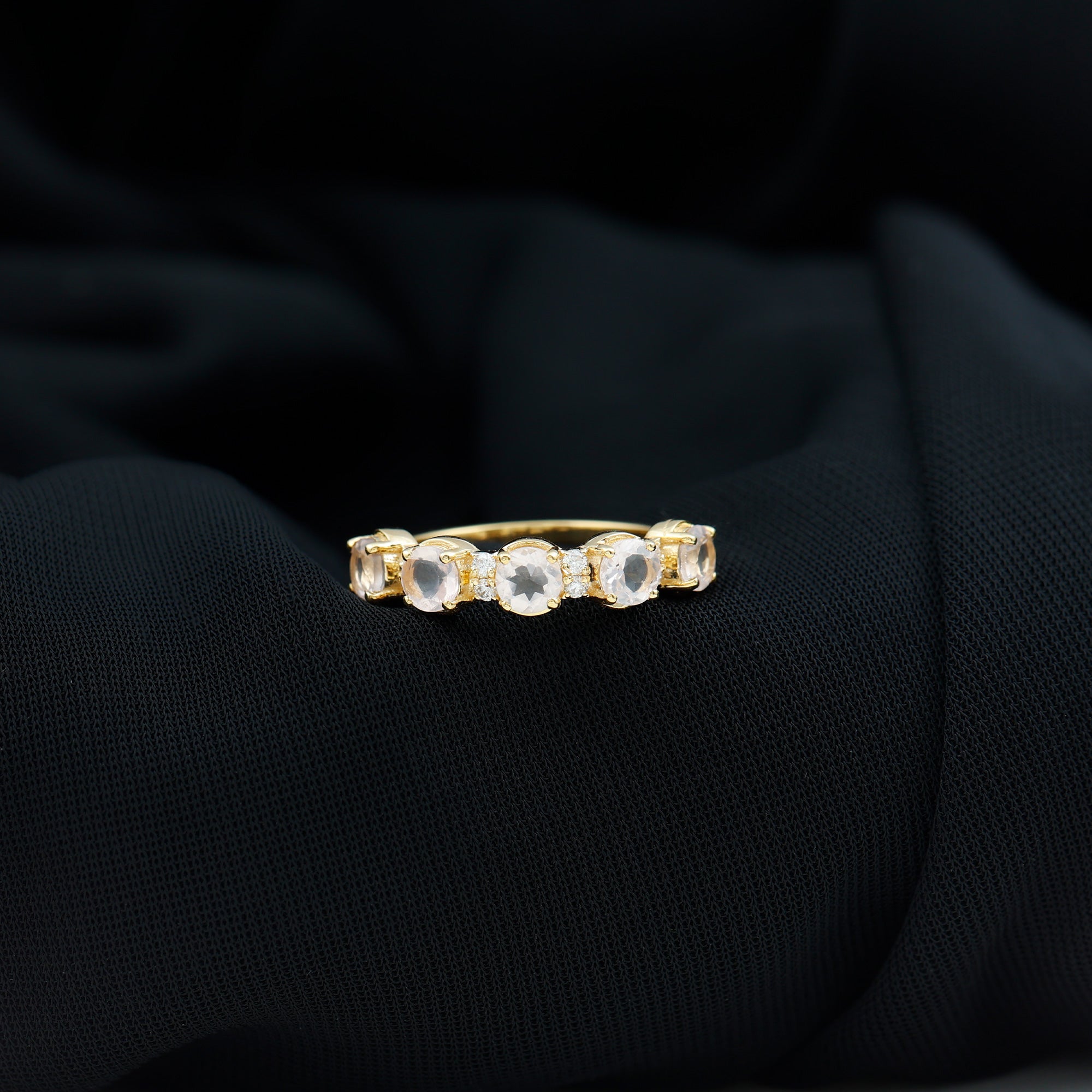 The delicate and soft pink hues of rose quartz has motivated our artisans to combine them with the alluring colors of gold further helping us in curating fantastic rose quartz band in white gold, yellow gold and rose gold. A wide diversity in our wedding ring design is effectively achieved by different rose quartz shapes, gemstone settings and metal embellishments. Therefore, Rosec Jewels’ collection of adorable rose quartz band rings are best suited for women with eyes for delicate details and romantic hues of the rose quartz.