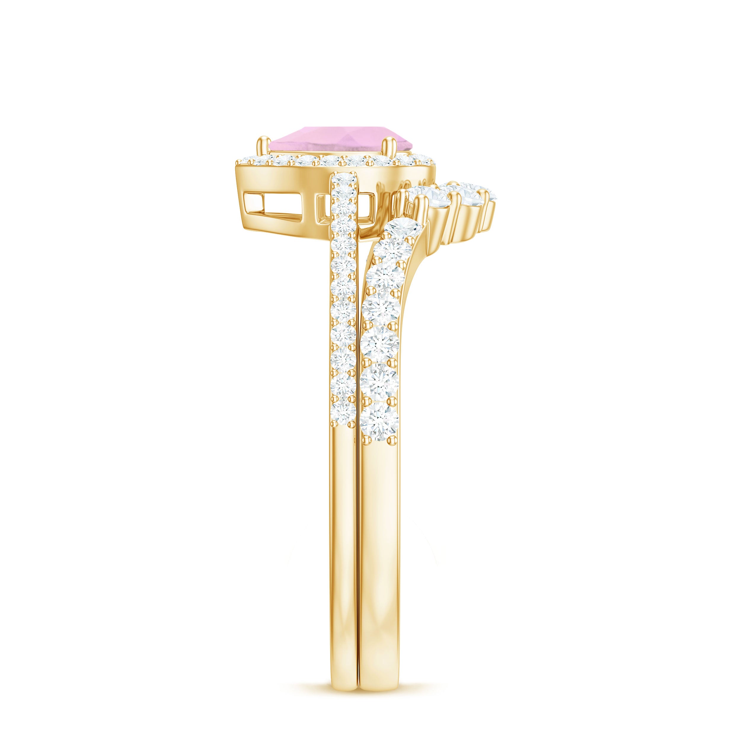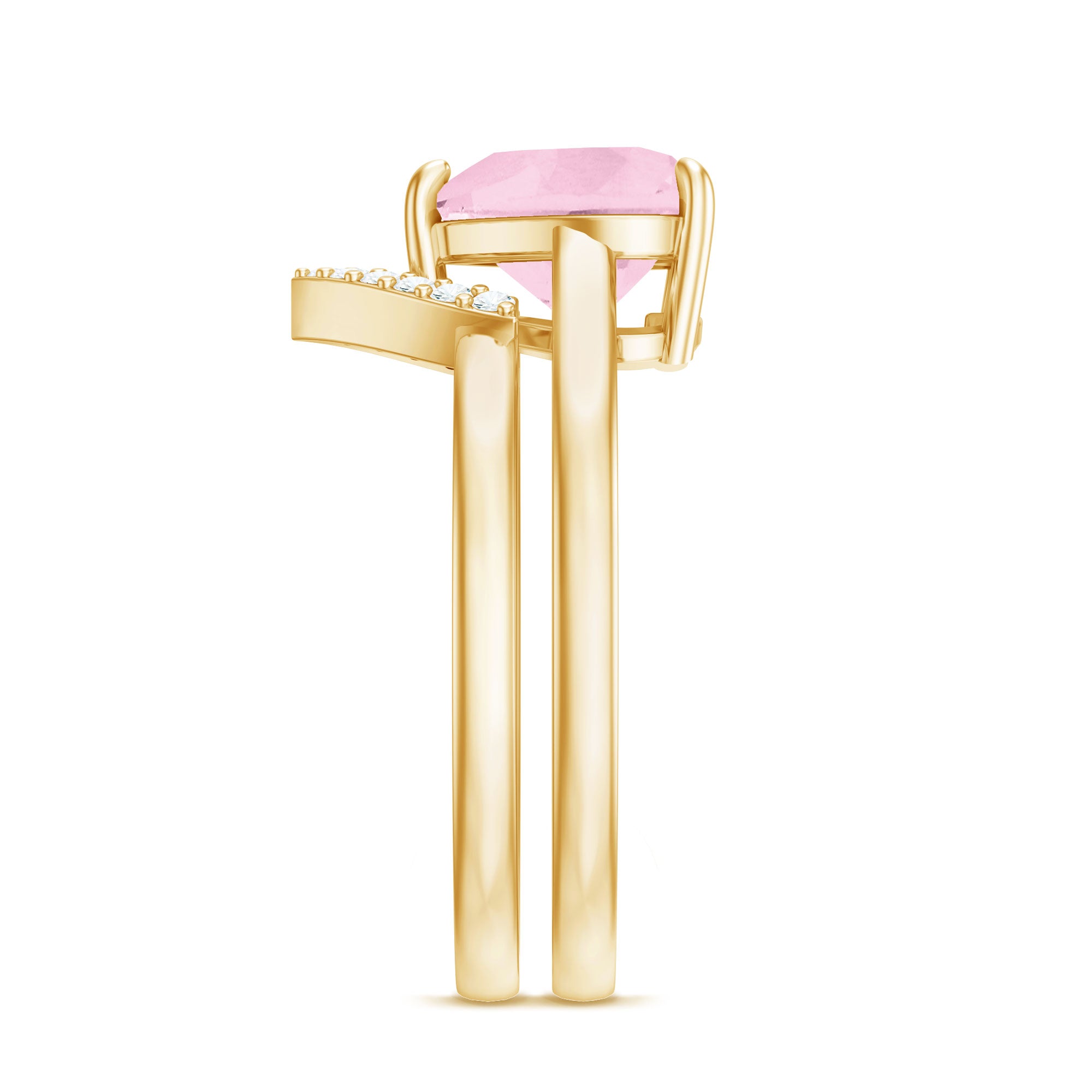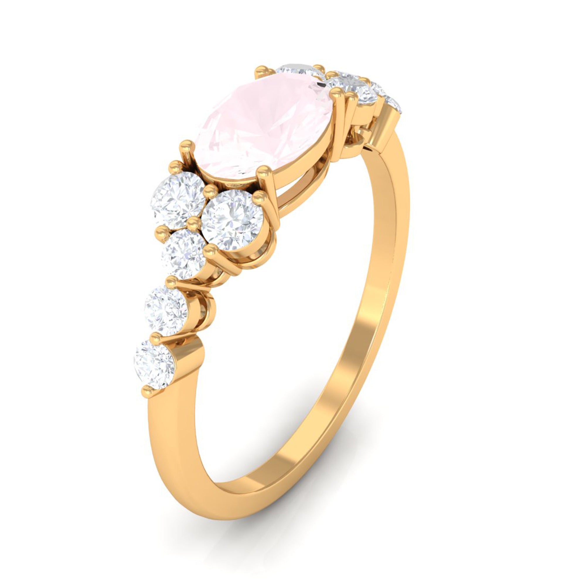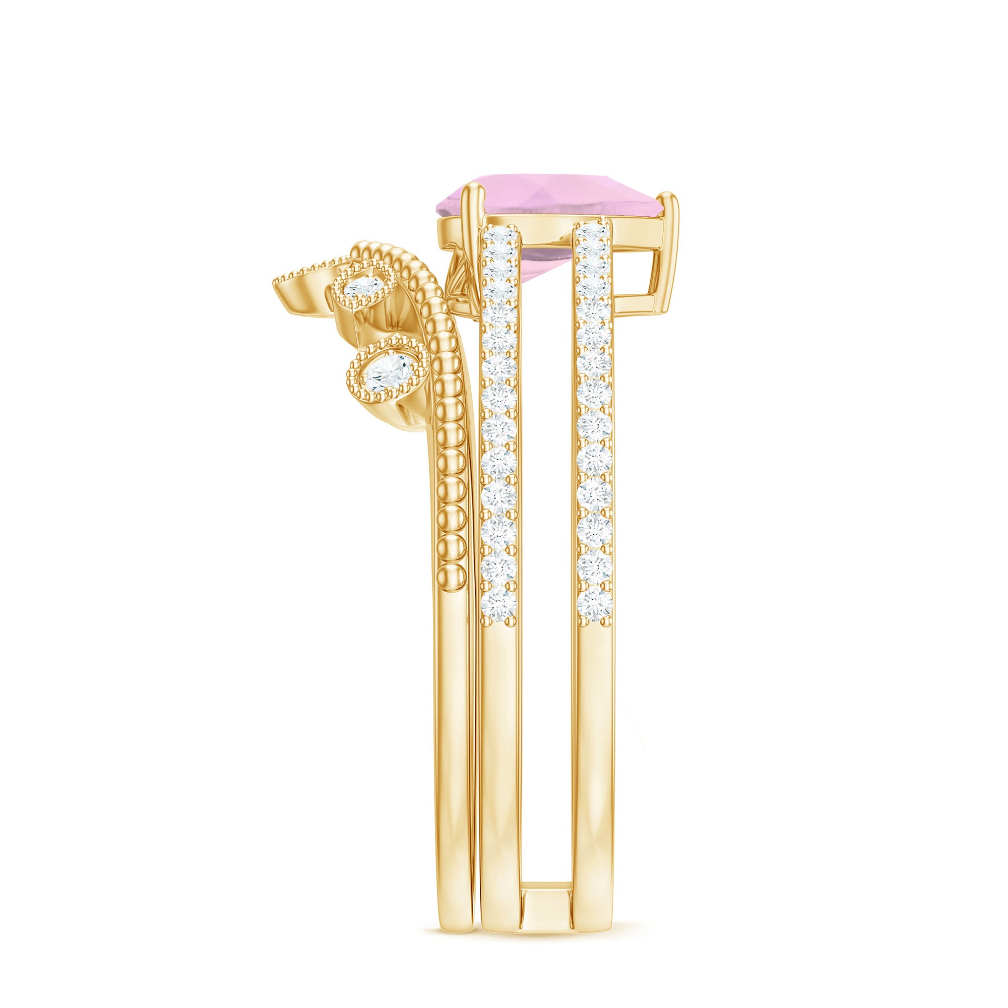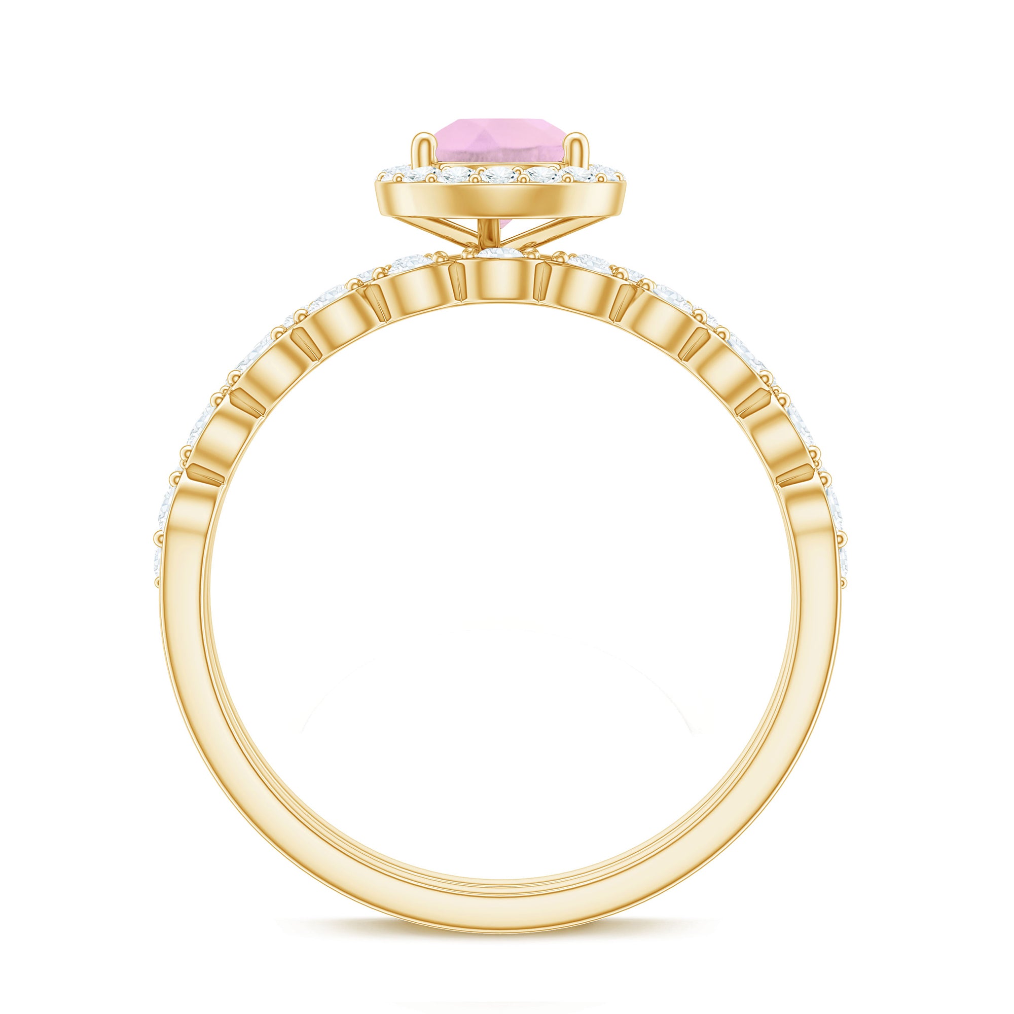 The delicate and soft pink hues of rose quartz has motivated our artisans to combine them with the alluring colors of gold further helping us in curating fantastic rose quartz band in white gold, yellow gold and rose gold. A wide diversity in our wedding ring design is effectively achieved by different rose quartz shapes, gemstone settings and metal embellishments. Therefore, Rosec Jewels’ collection of adorable rose quartz band rings are best suited for women with eyes for delicate details and romantic hues of the rose quartz.