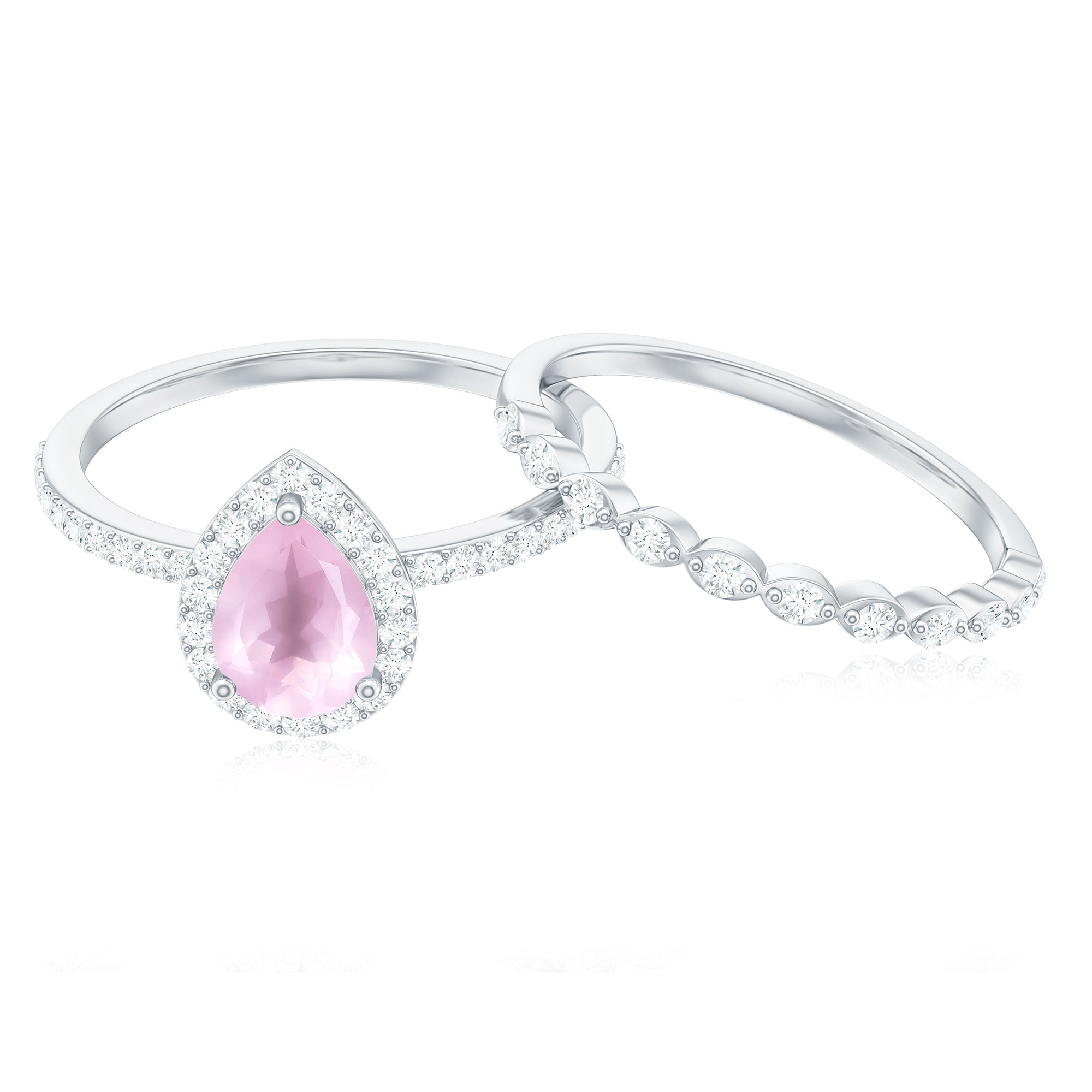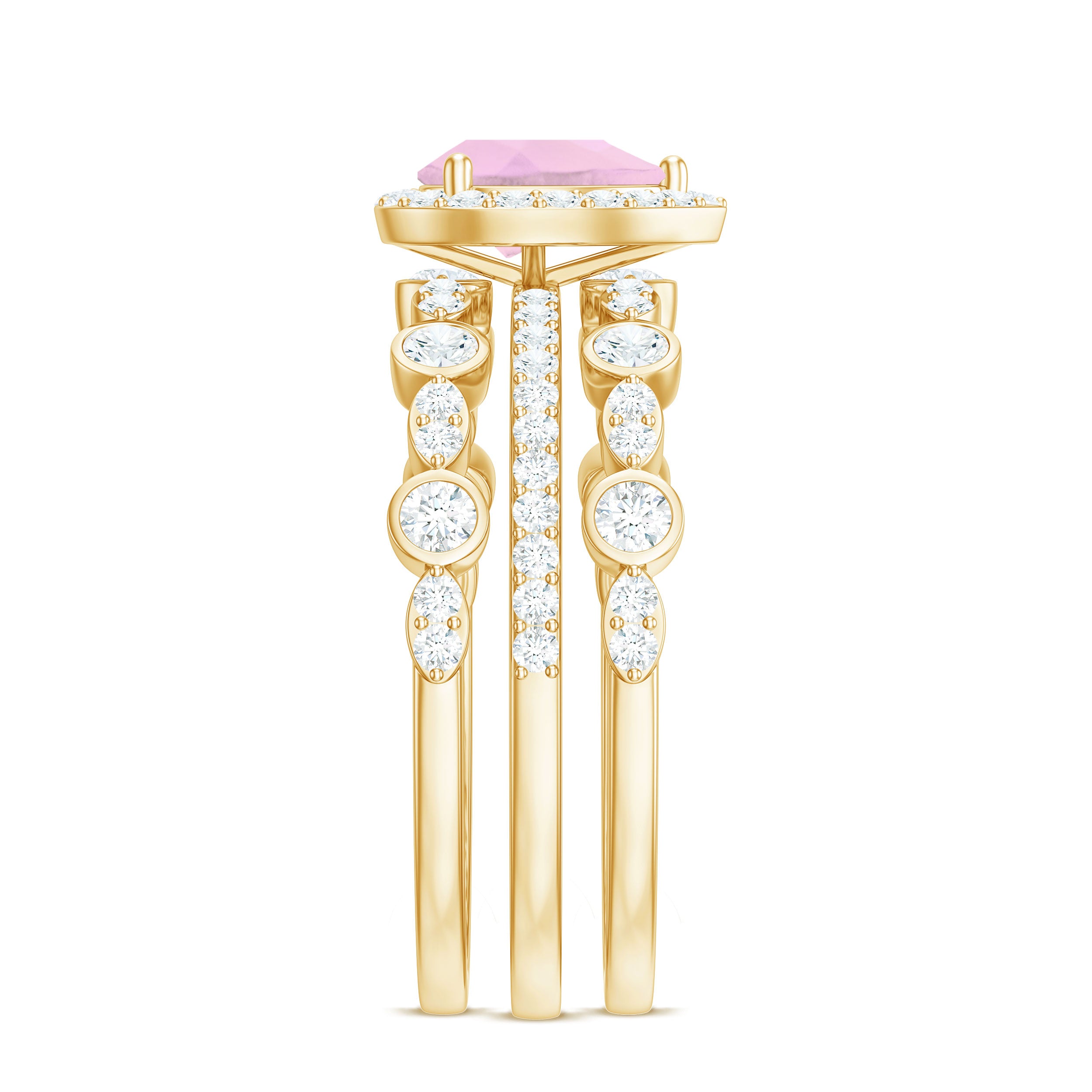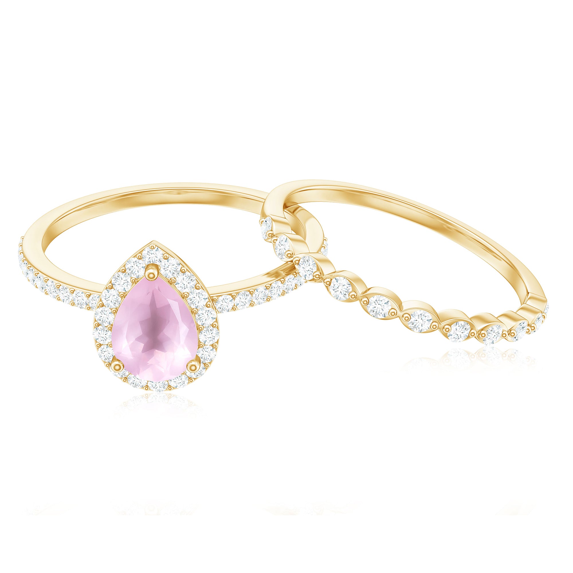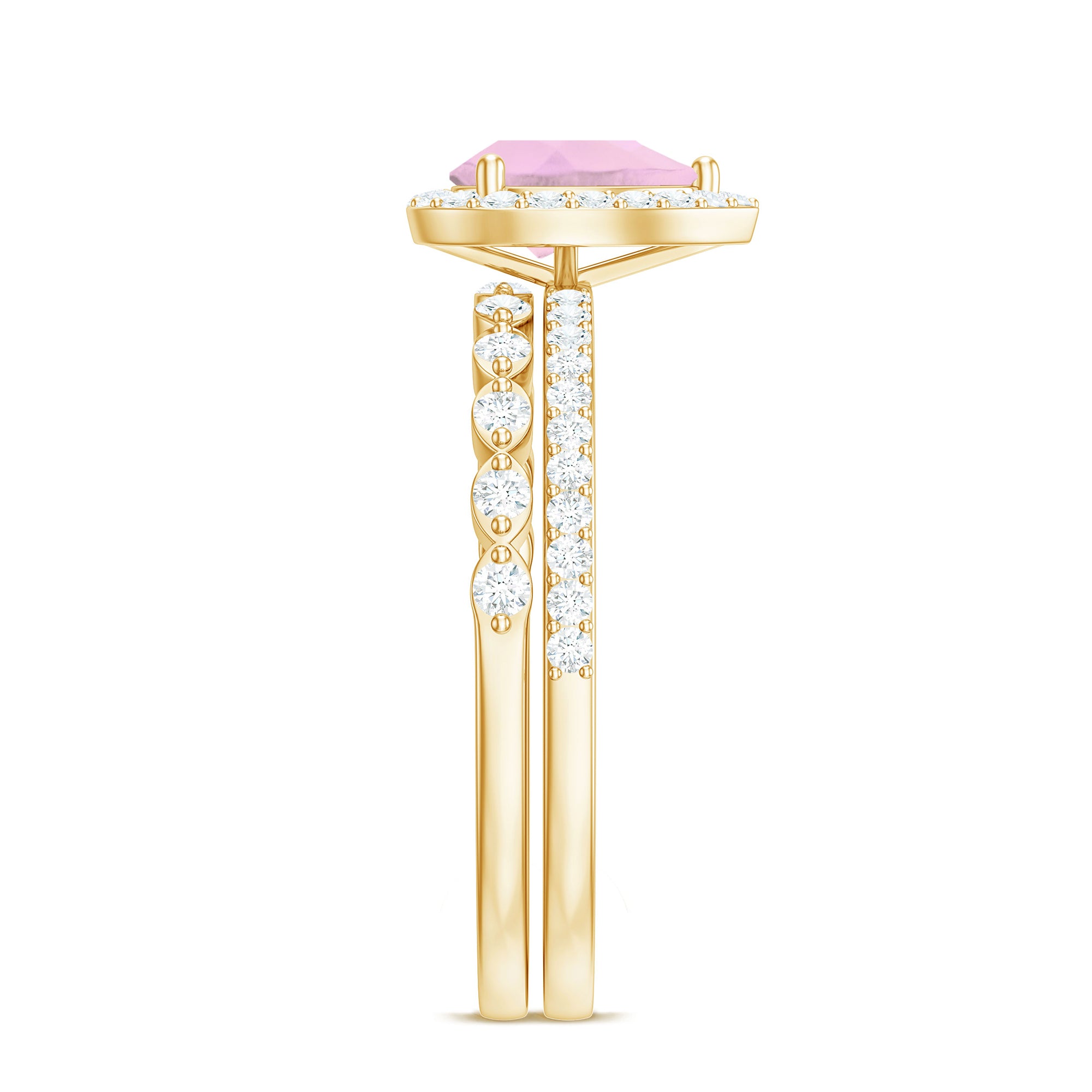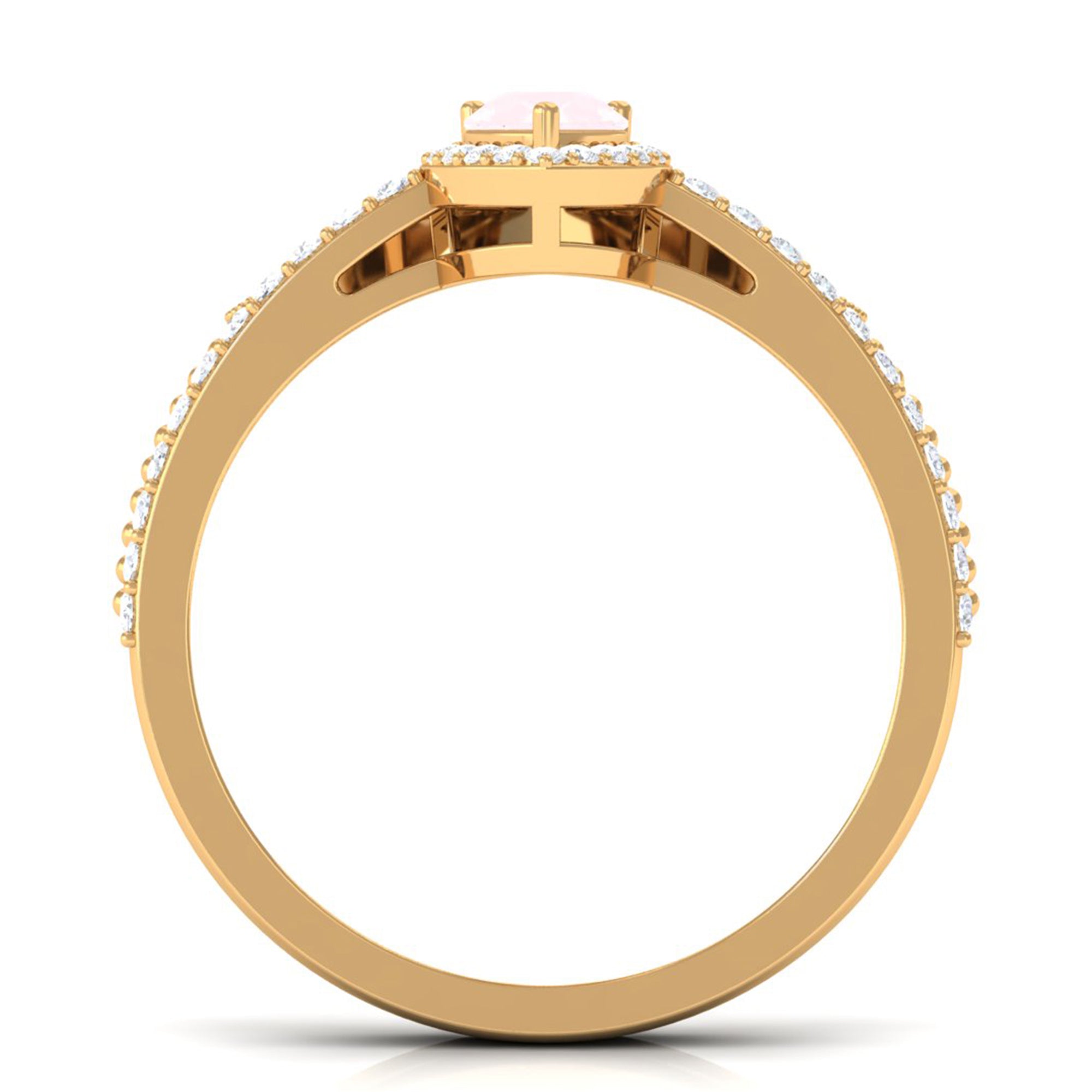 The delicate and soft pink hues of rose quartz has motivated our artisans to combine them with the alluring colors of gold further helping us in curating fantastic rose quartz band in white gold, yellow gold and rose gold. A wide diversity in our wedding ring design is effectively achieved by different rose quartz shapes, gemstone settings and metal embellishments. Therefore, Rosec Jewels’ collection of adorable rose quartz band rings are best suited for women with eyes for delicate details and romantic hues of the rose quartz.