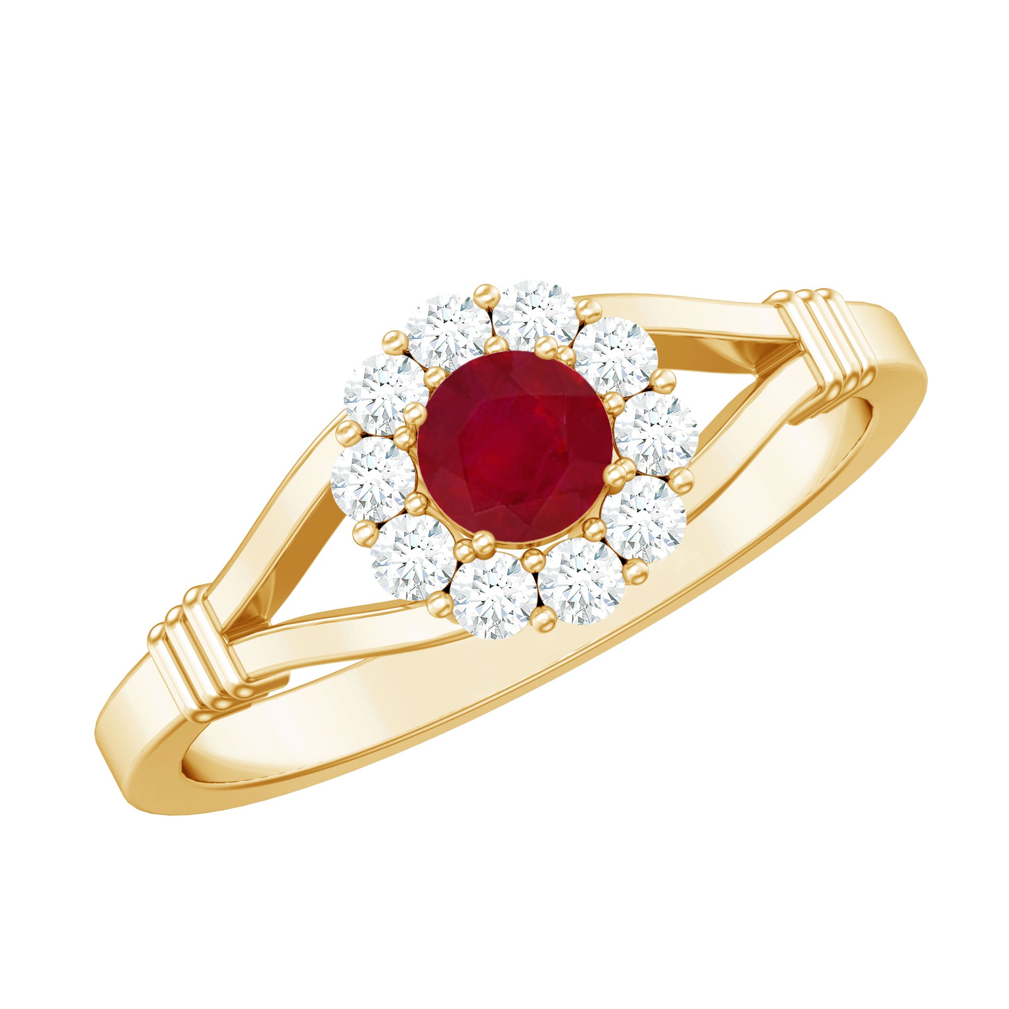 Halo Rings:- This style of ring features a vibrant ruby gemstone encircled by a diamond or moissanite halo, showing the beauty and brilliance of the center gemstone. These ruby halo rings become very popular and an ideal choice for those who want the touch of sparkle in their accessory.