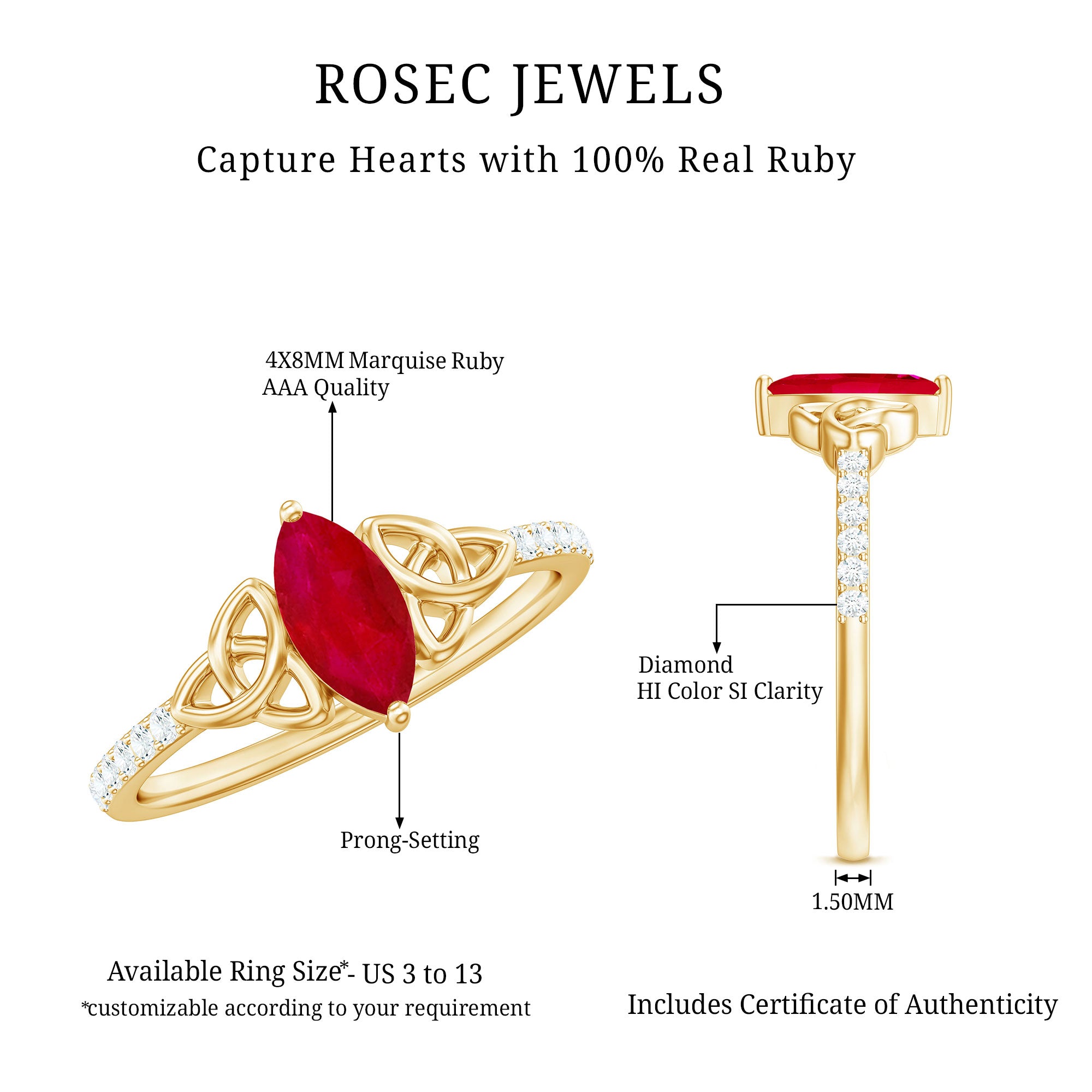 High-Quality Jewelry: Rosec Jewels offers a wide collection of ruby ring designs while ensuring quality. Each ruby ring is made from various precious metal options like white gold, yellow gold, and 925 sterling silver and AAA quality rubies.
