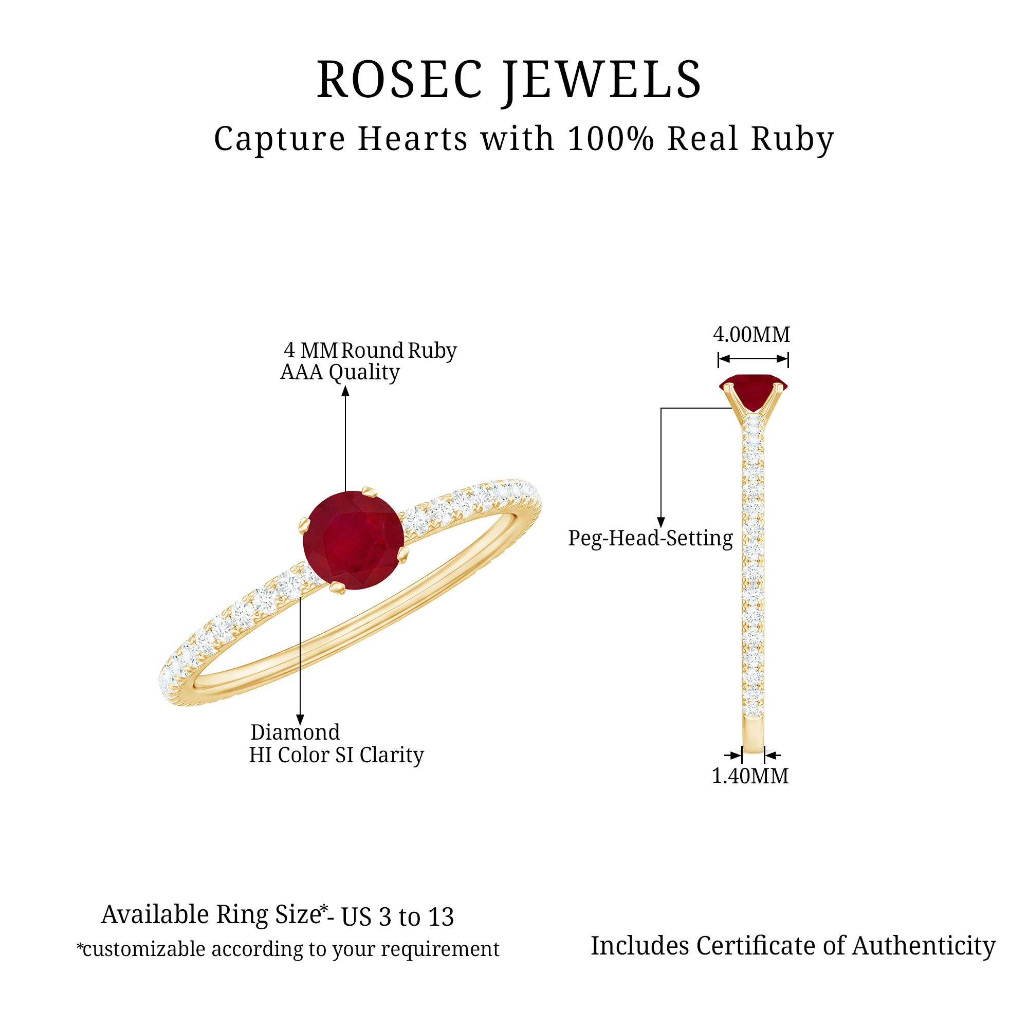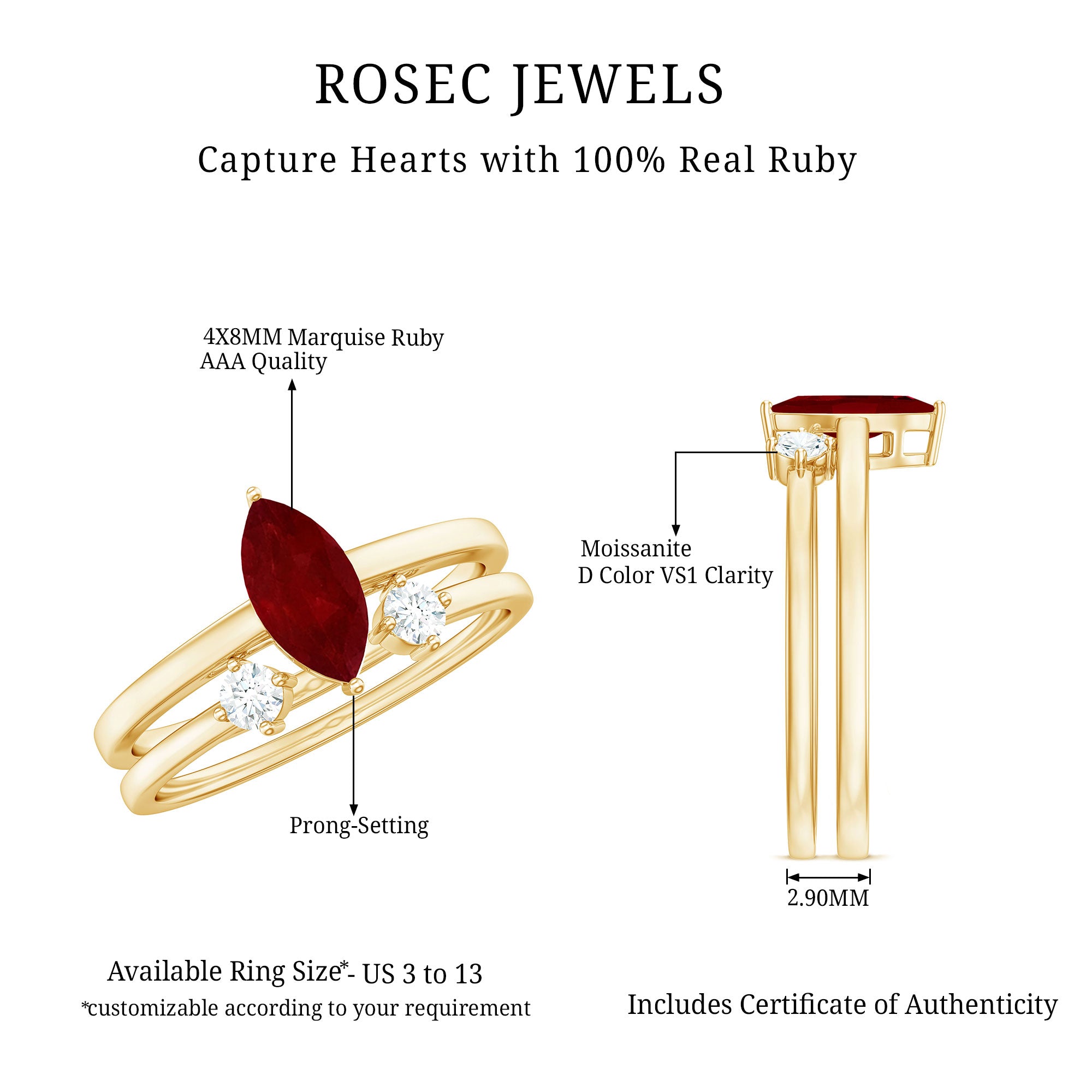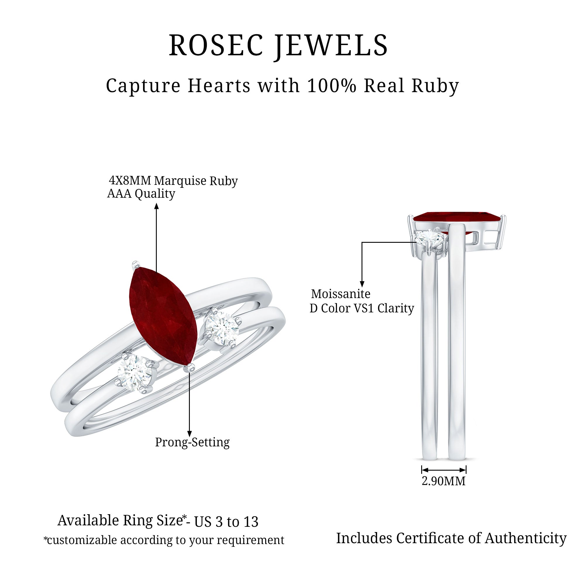 High-Quality Jewelry: Rosec Jewels offers a wide collection of ruby ring designs while ensuring quality. Each ruby ring is made from various precious metal options like white gold, yellow gold, and 925 sterling silver and AAA quality rubies.