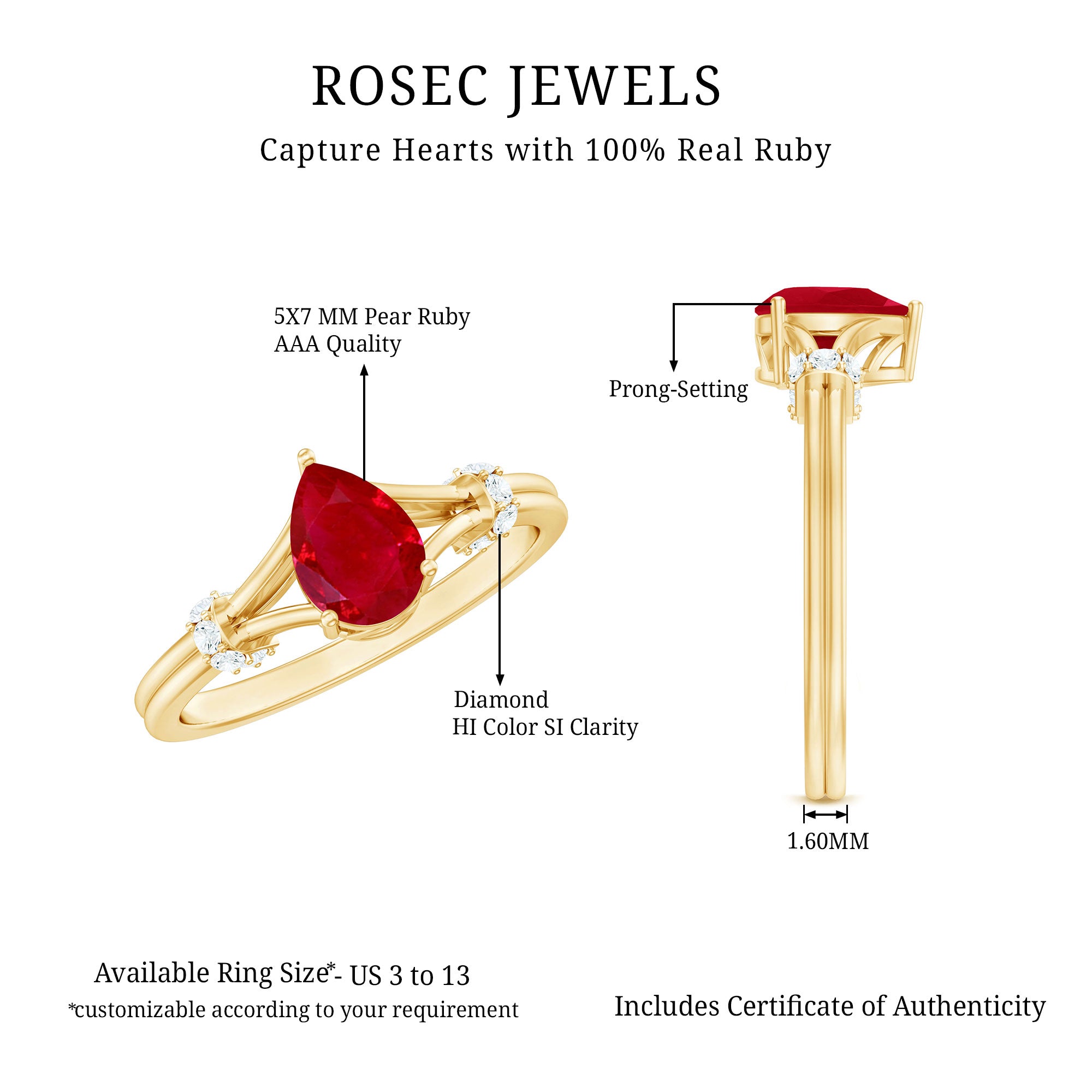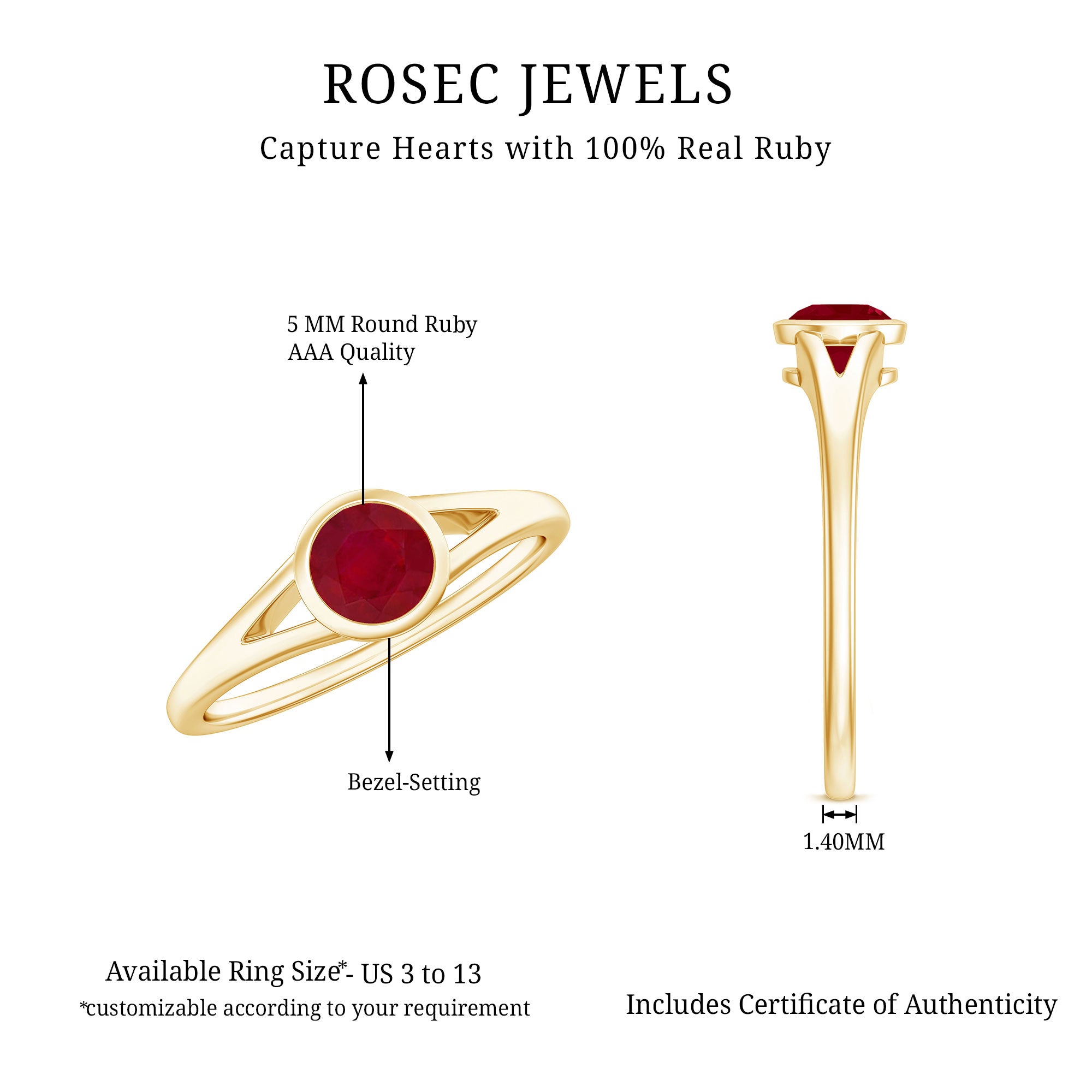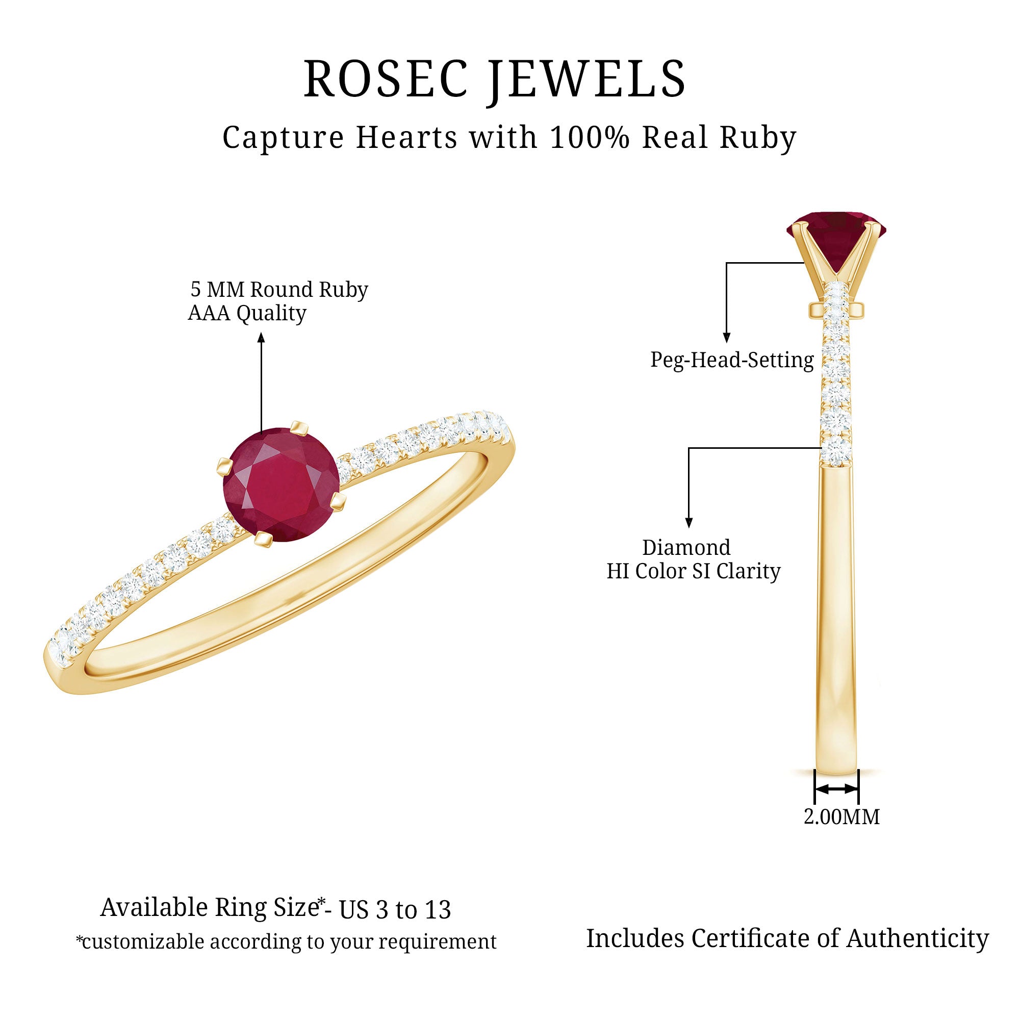 High-Quality Jewelry: Rosec Jewels offers a wide collection of ruby ring designs while ensuring quality. Each ruby ring is made from various precious metal options like white gold, yellow gold, and 925 sterling silver and AAA quality rubies.