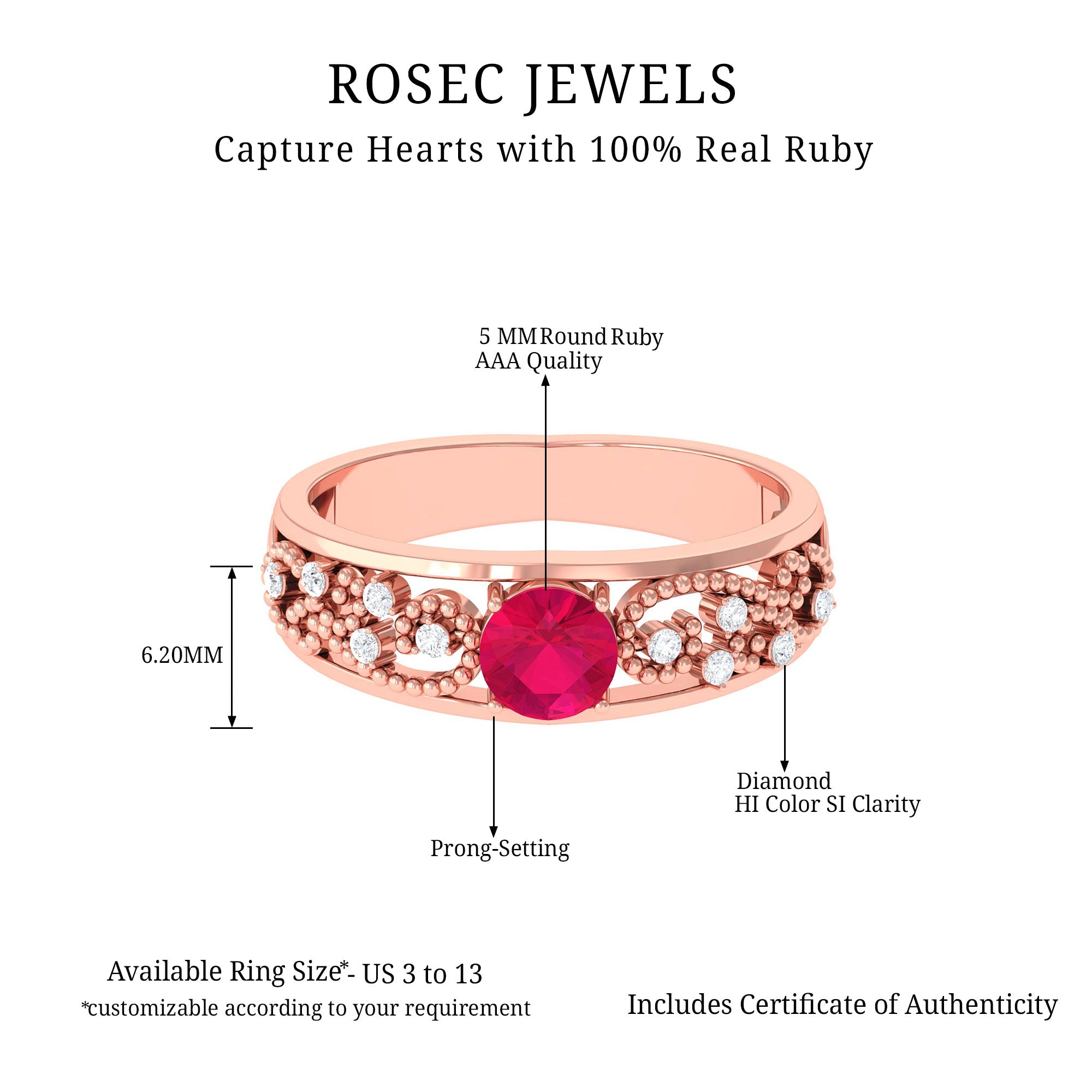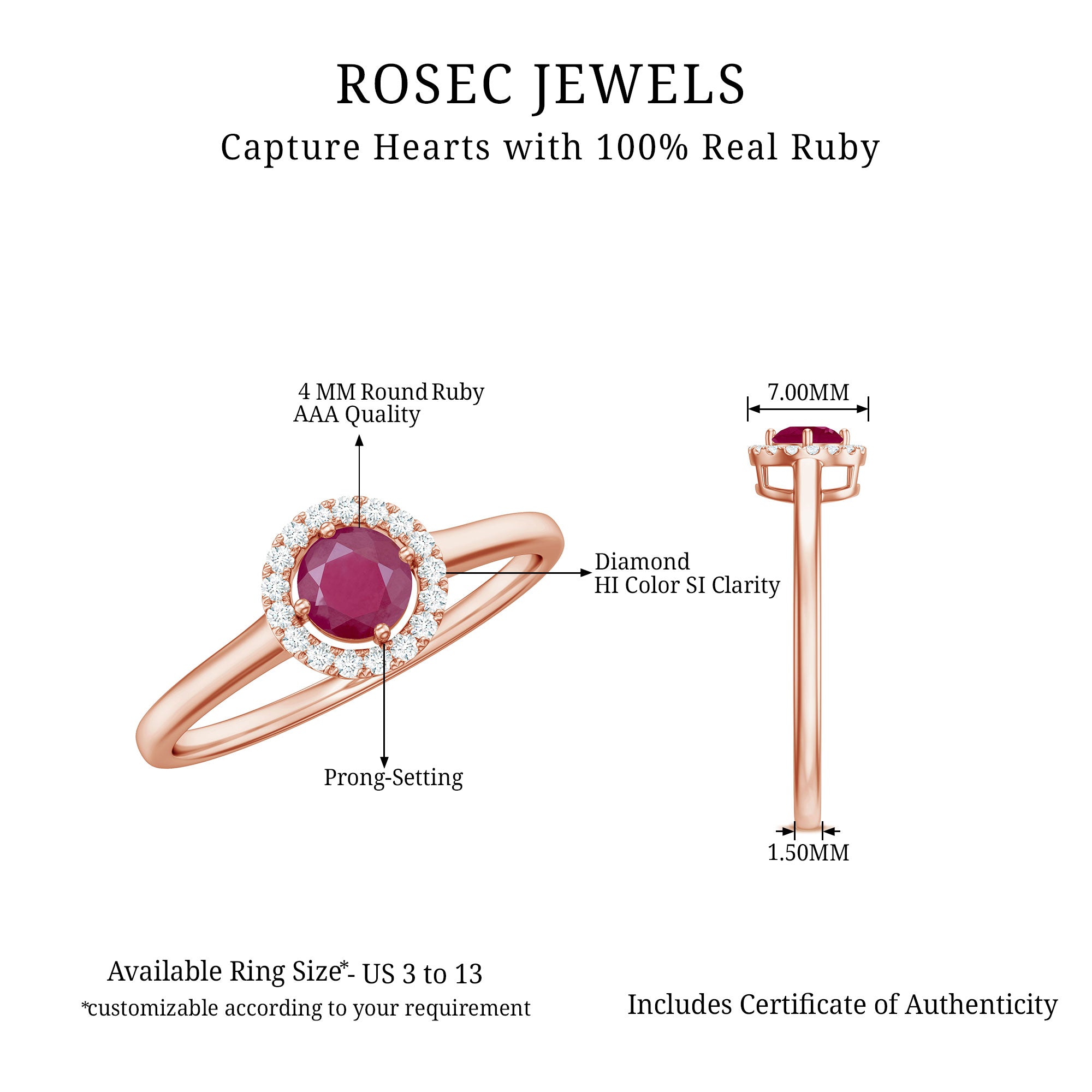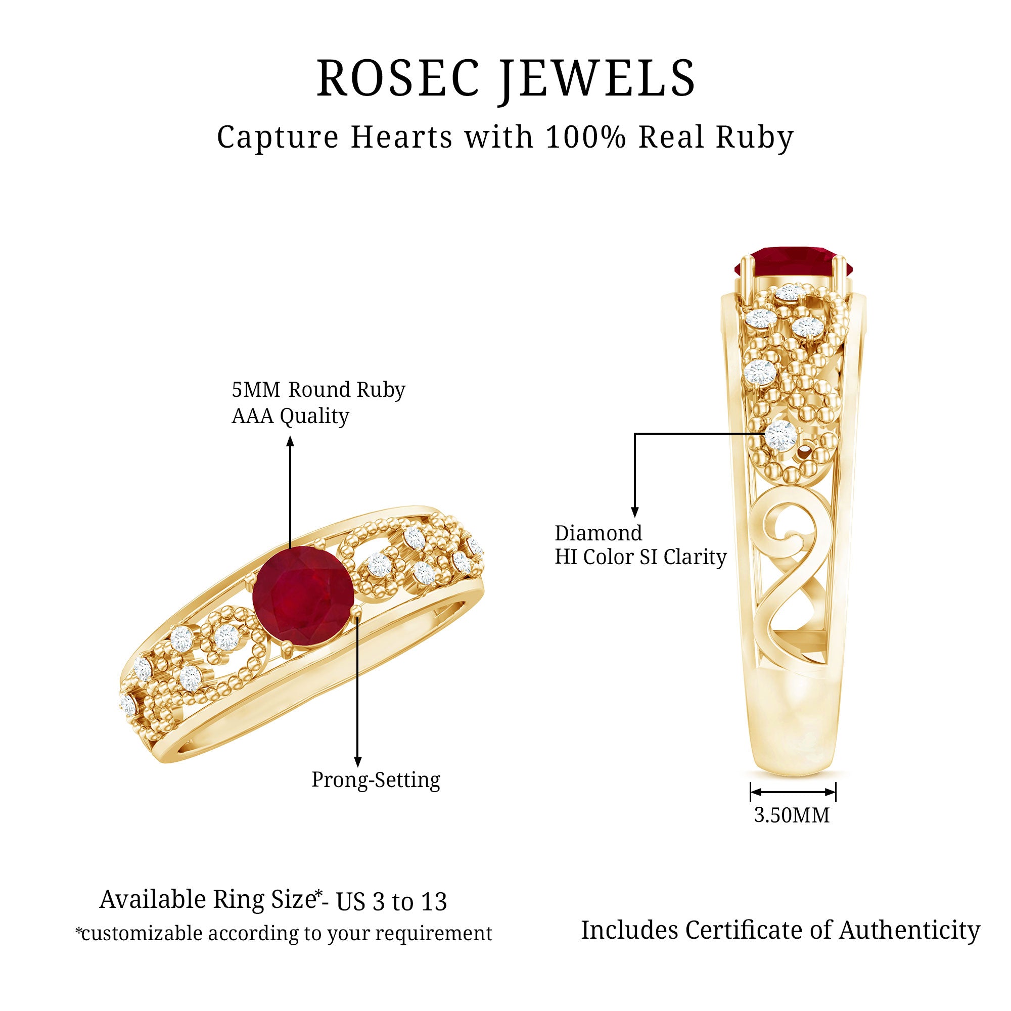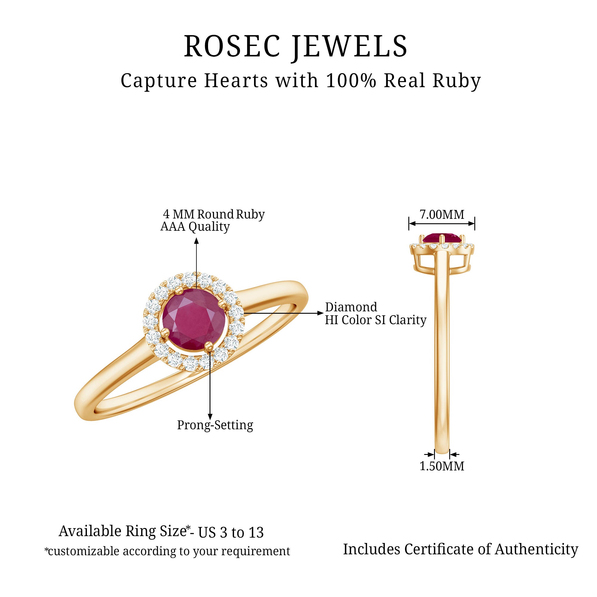 Ruby is a durable gemstone and can be worn daily when secured in a well-constructed setting. Designs with protective prongs or halo frames help reduce exposure to impact.