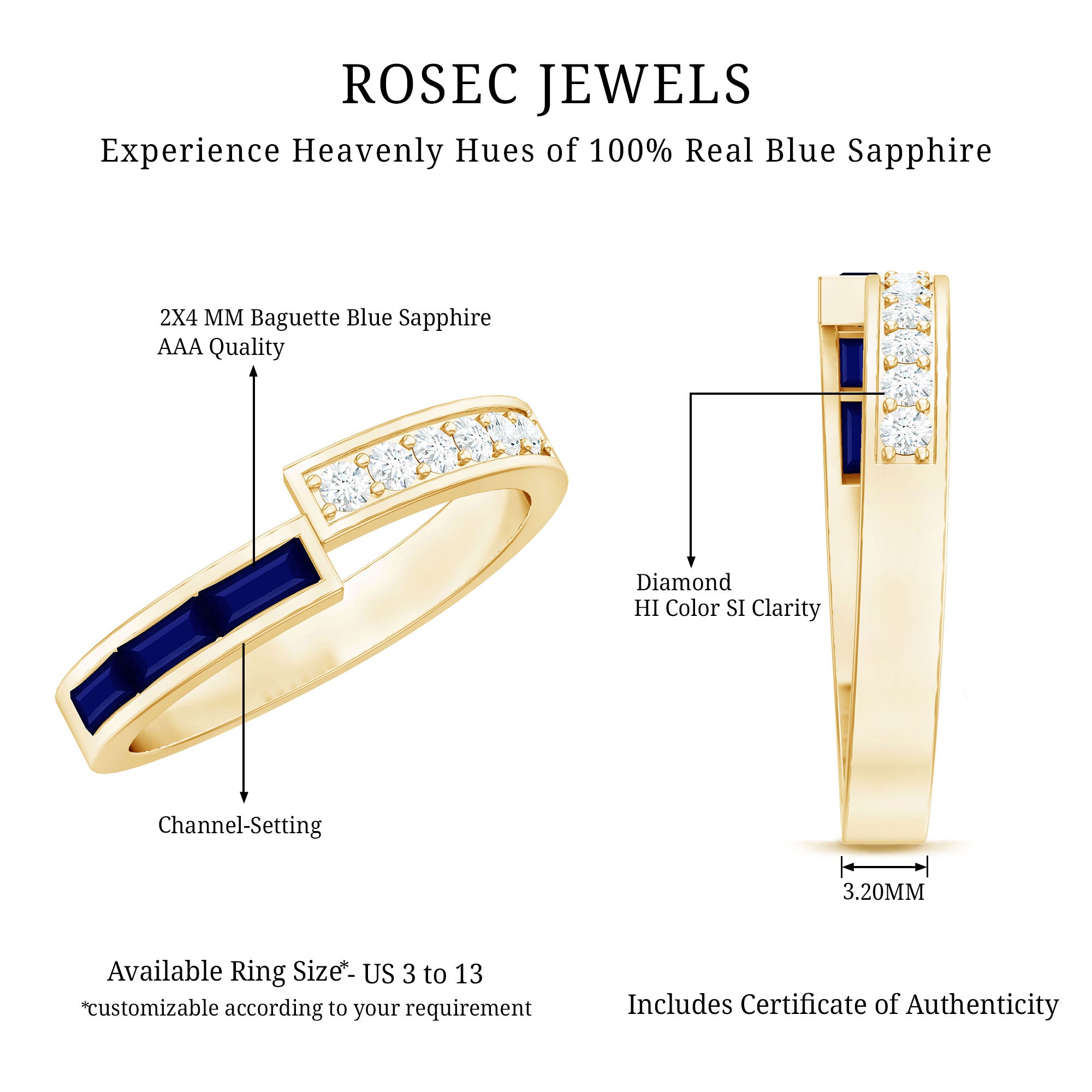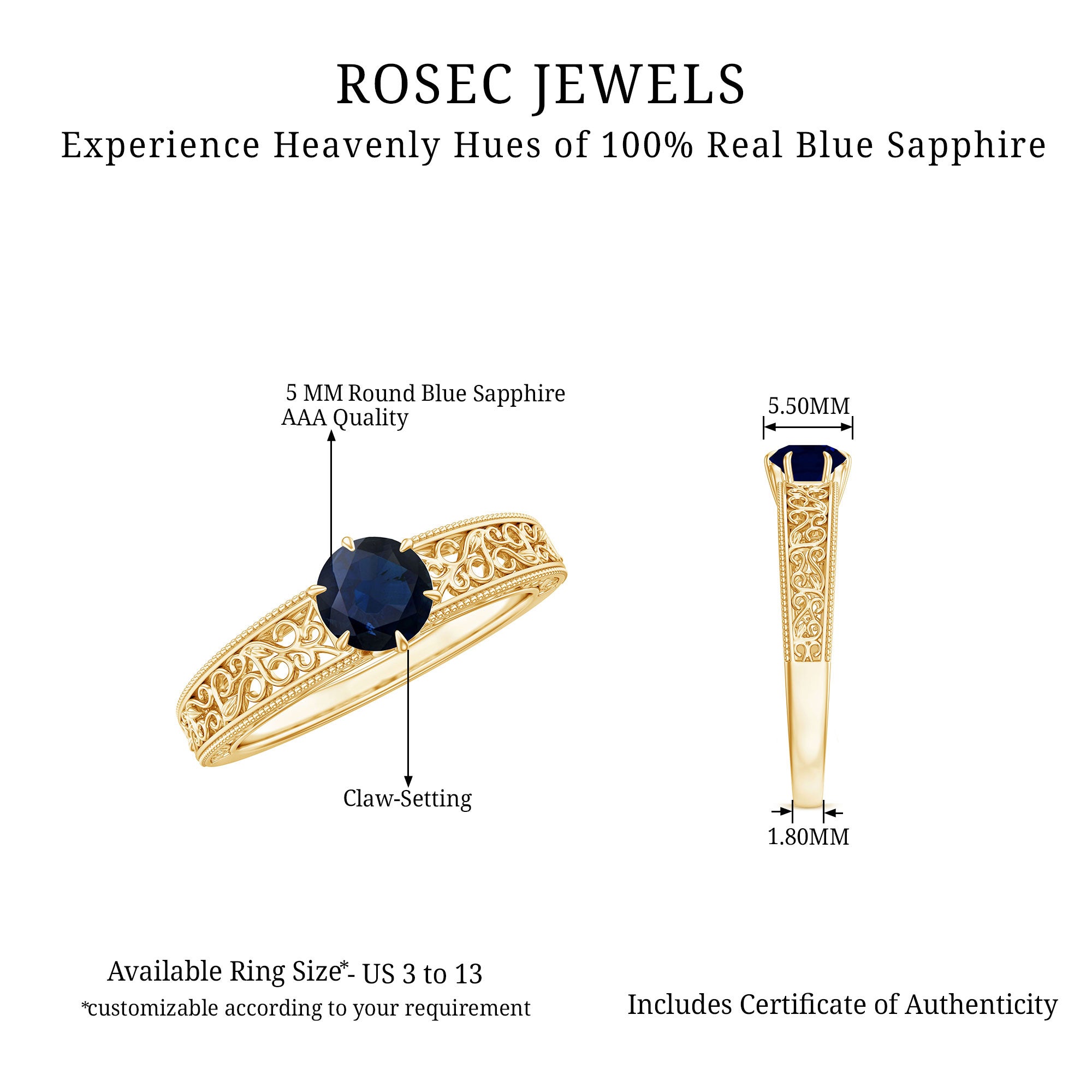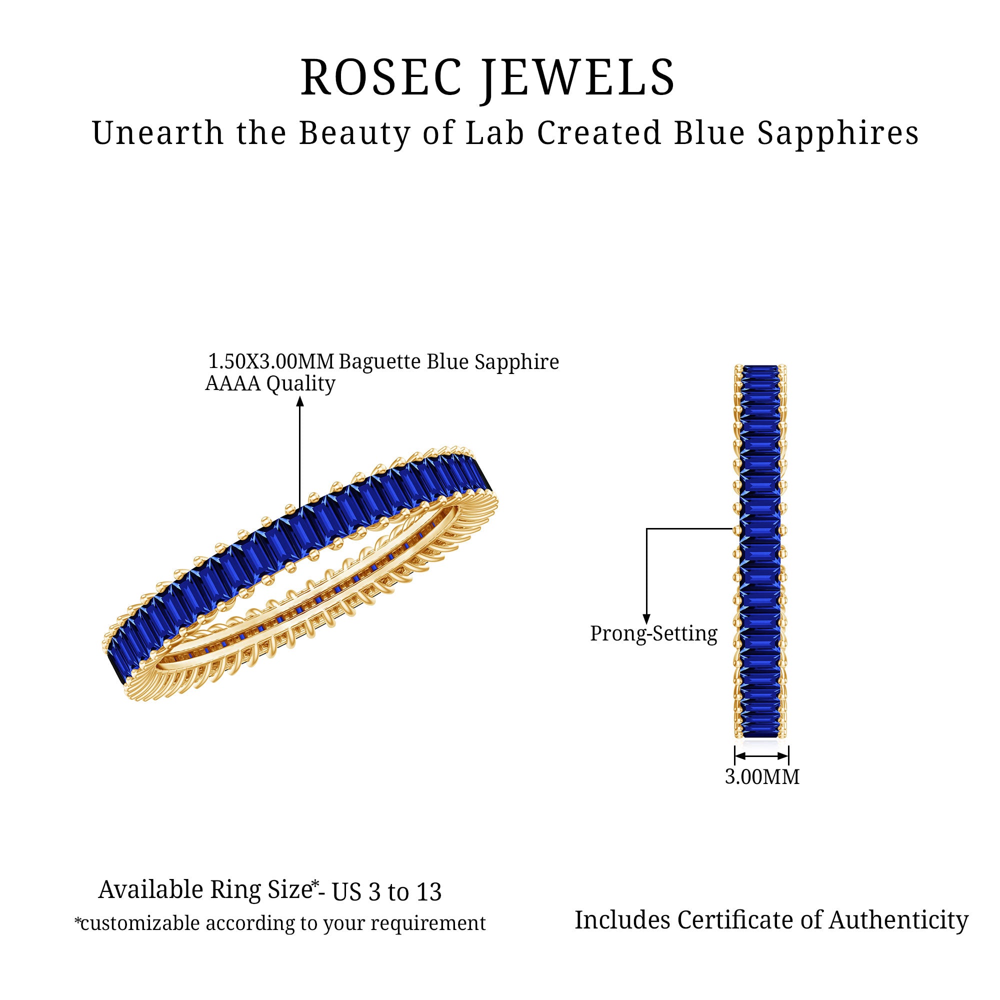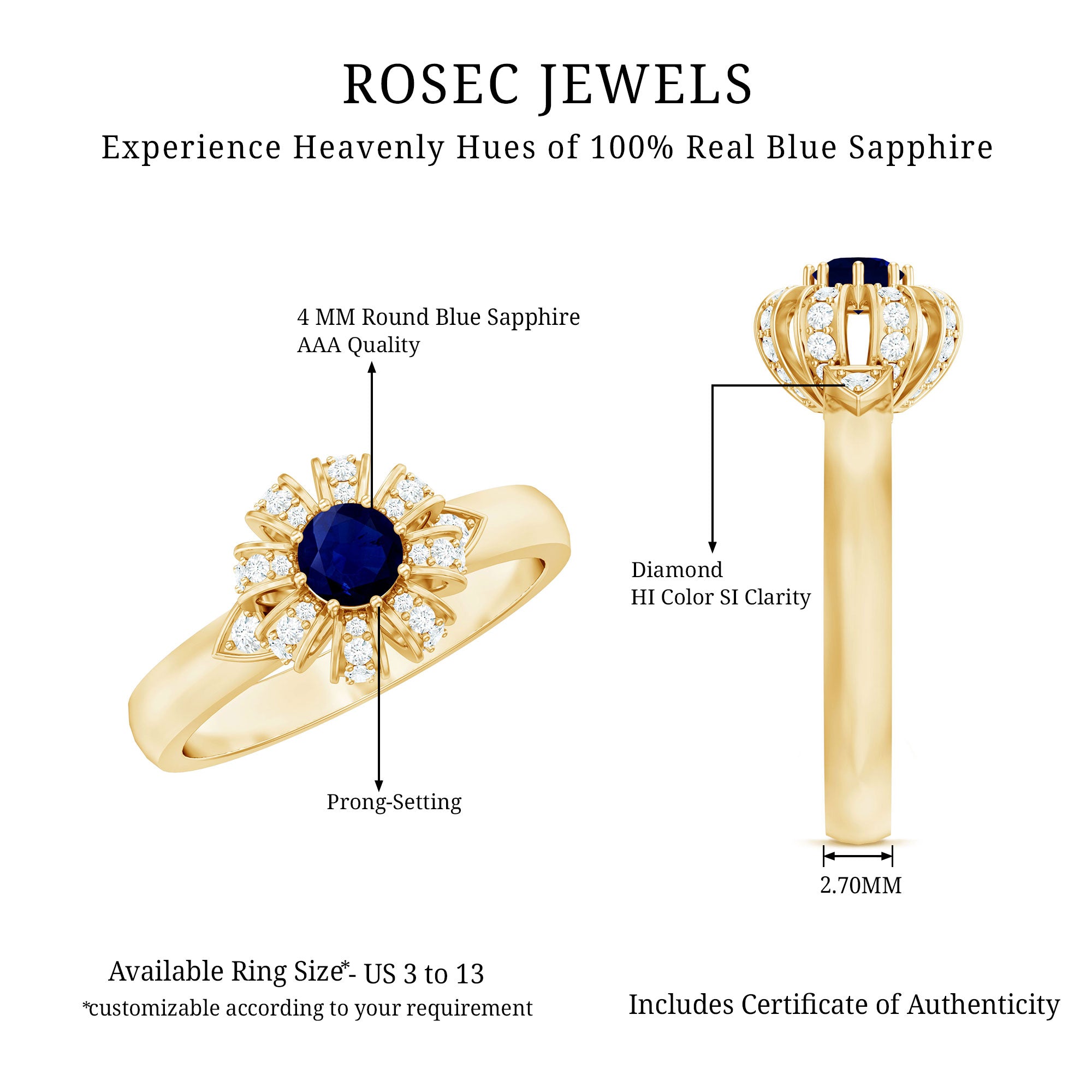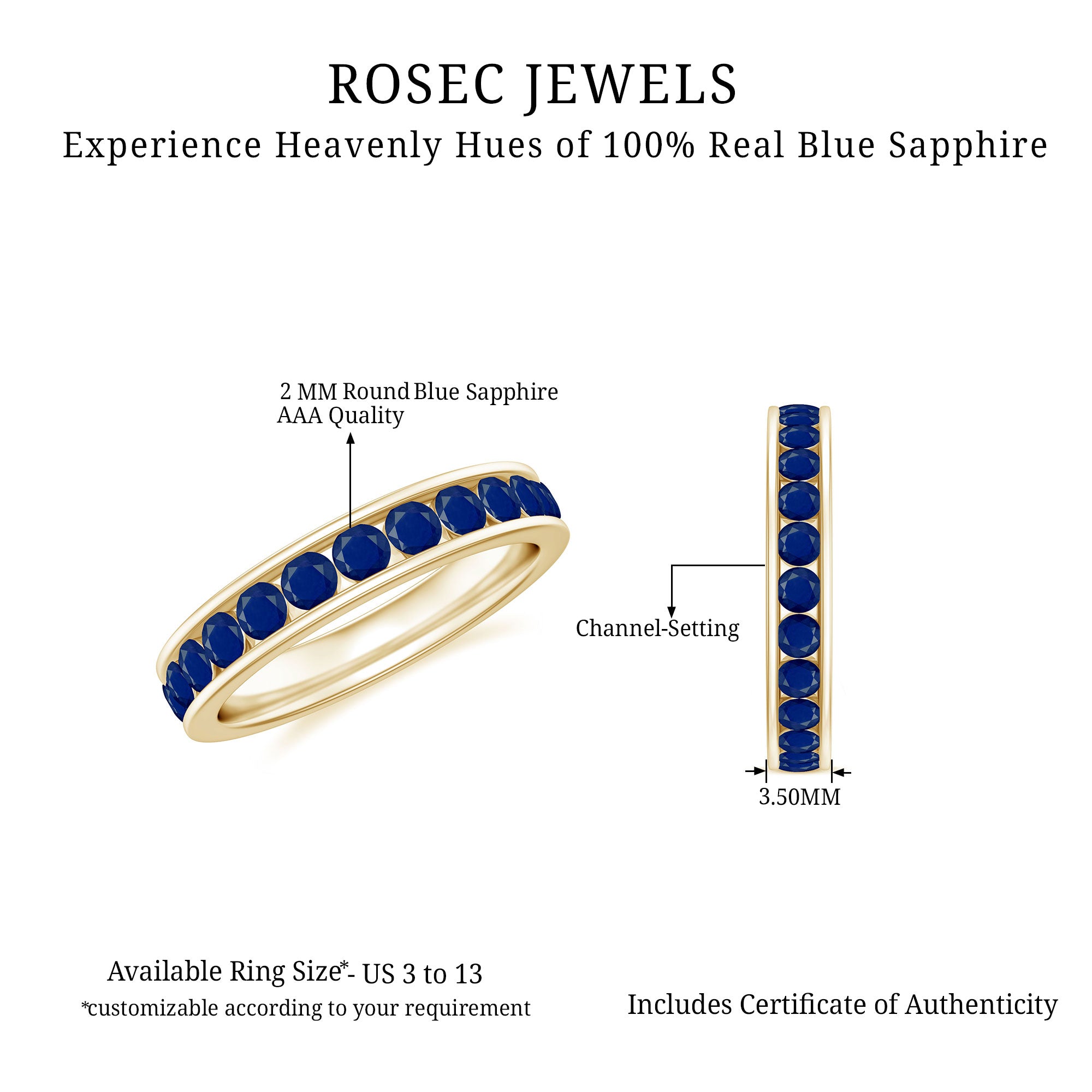 Yellow Gold: - Being precious, yellow gold offers a warm and sophisticated look when used to craft enduring sapphire jewelry. At Rosec Jewels, you can buy the sapphire jewelry set of 10k, 14k, and 18k yellow gold.