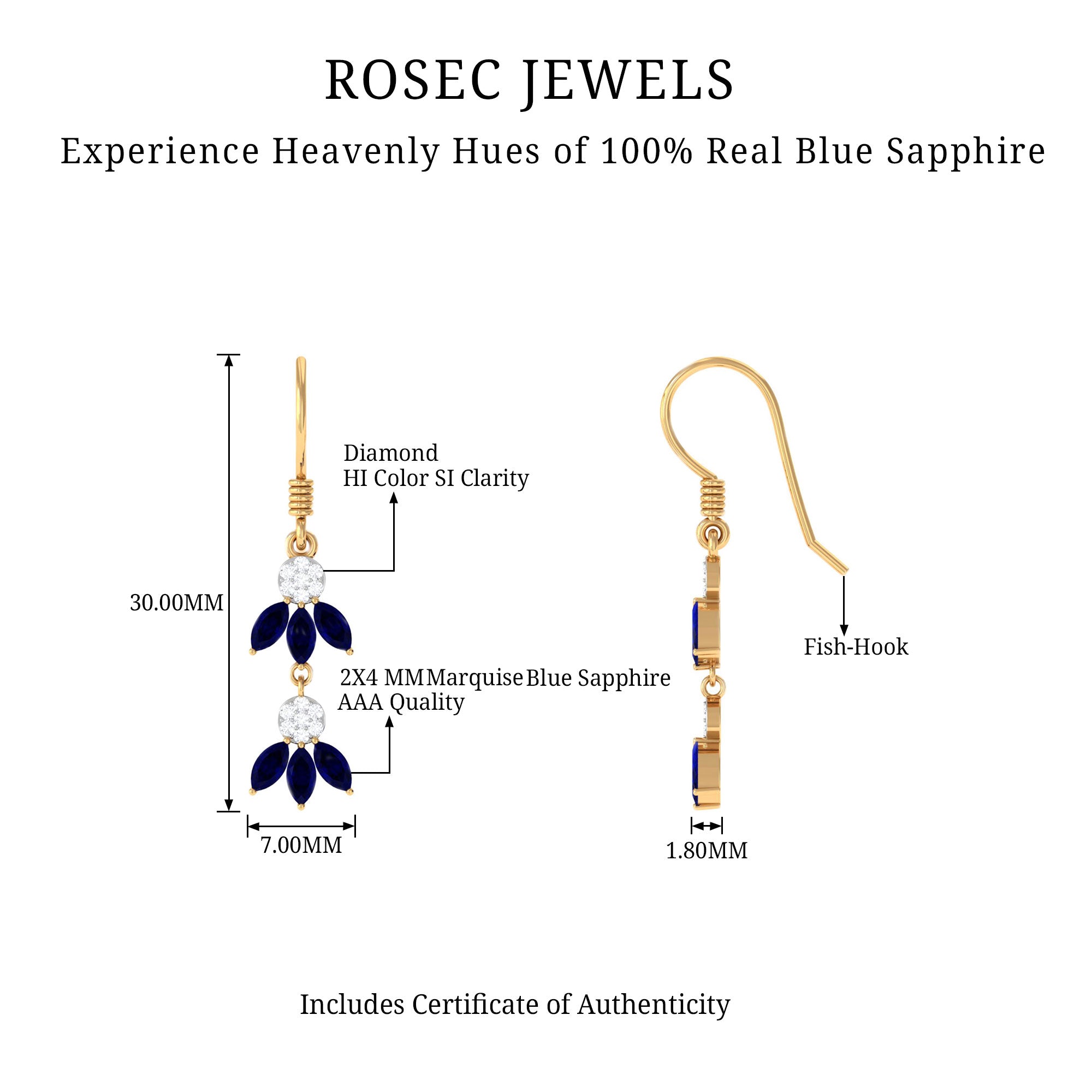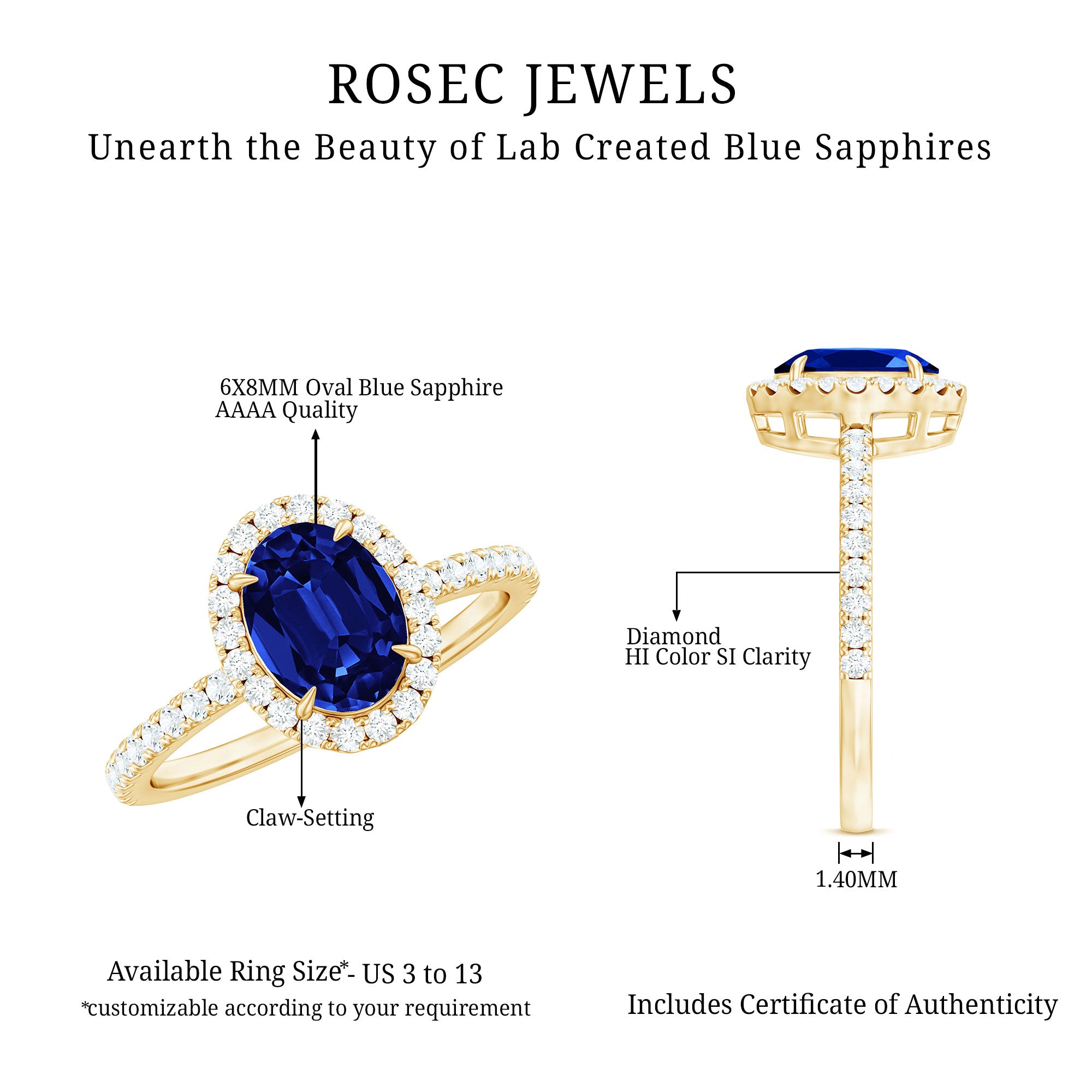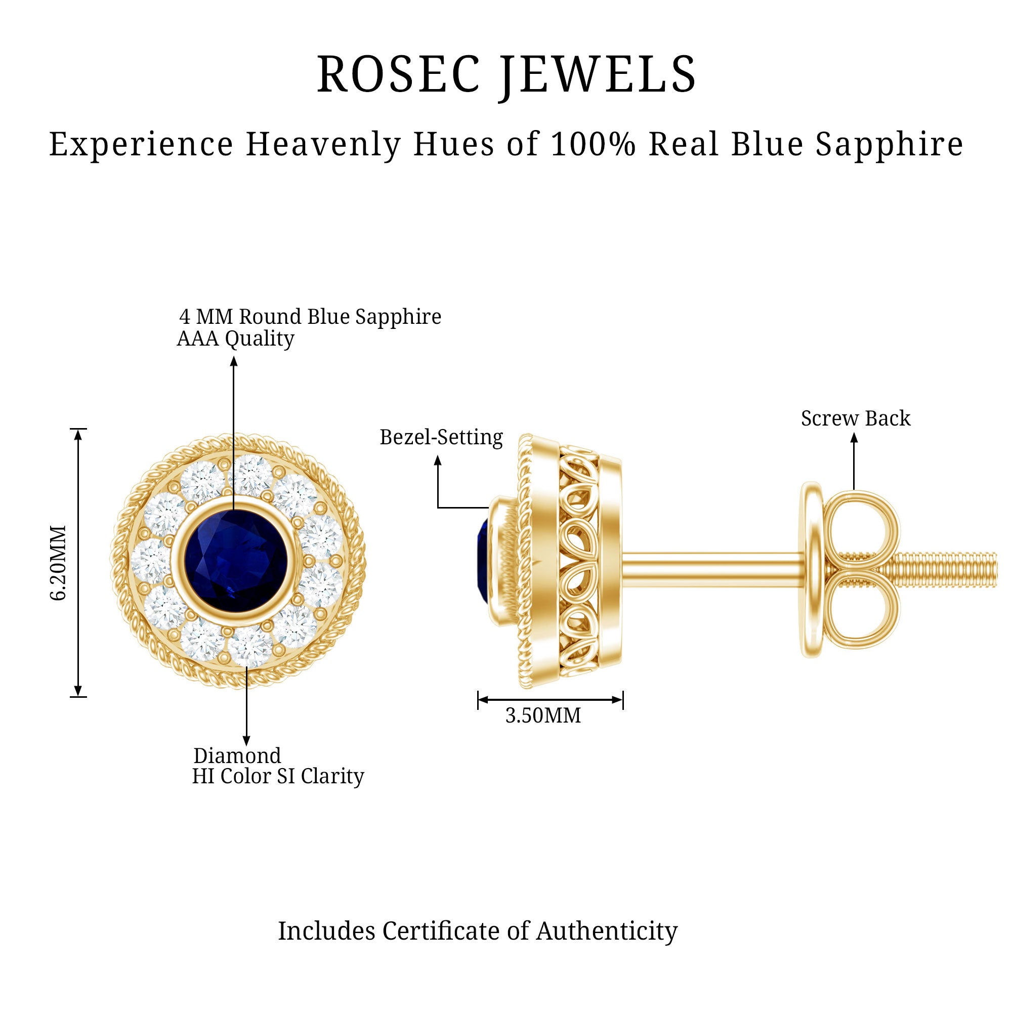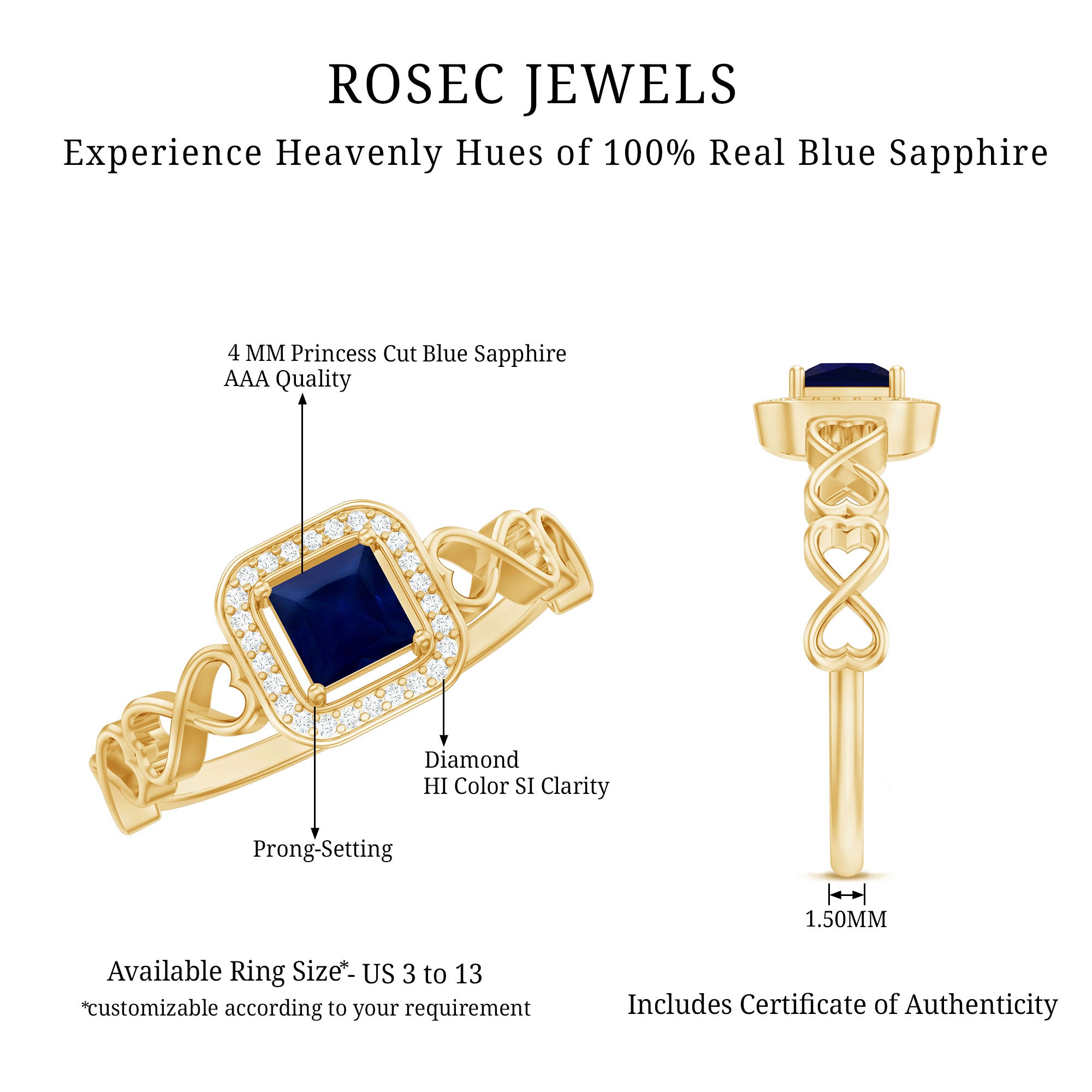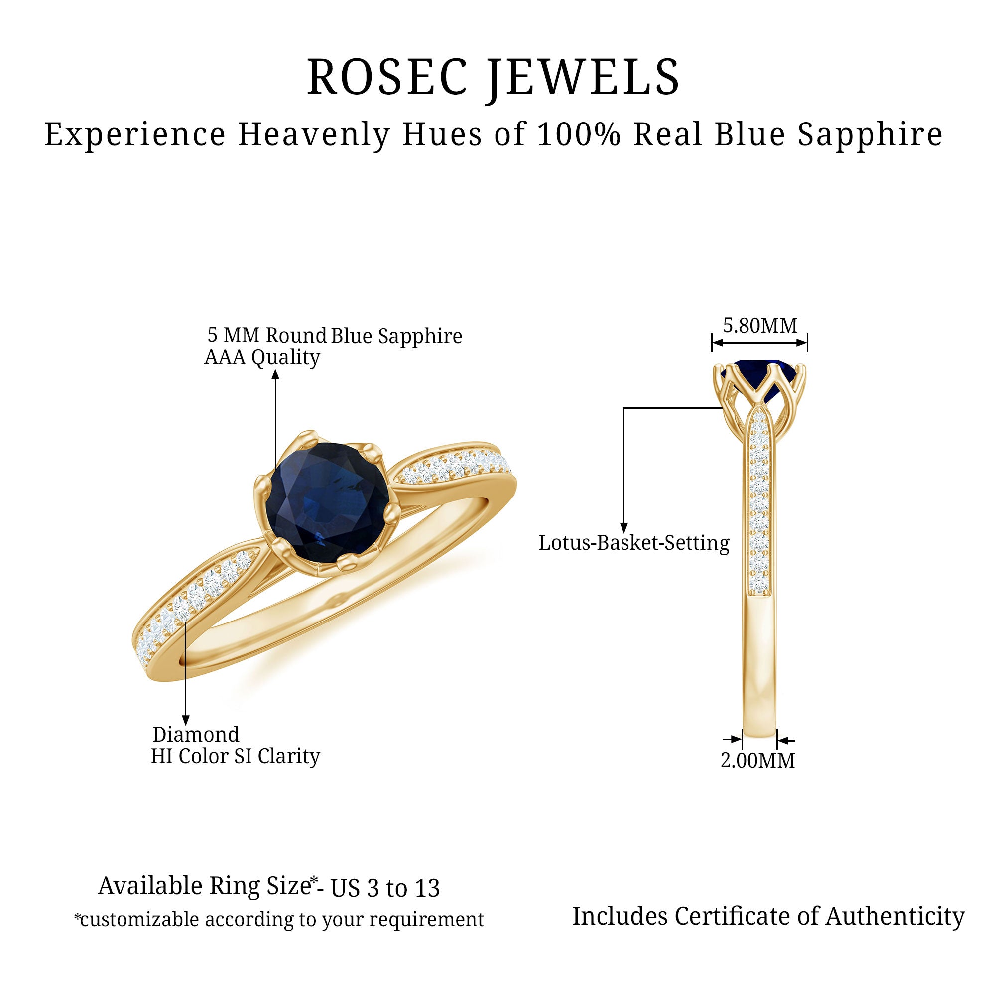 Yellow Gold: - Being precious, yellow gold offers a warm and sophisticated look when used to craft enduring sapphire jewelry. At Rosec Jewels, you can buy the sapphire jewelry set of 10k, 14k, and 18k yellow gold.
