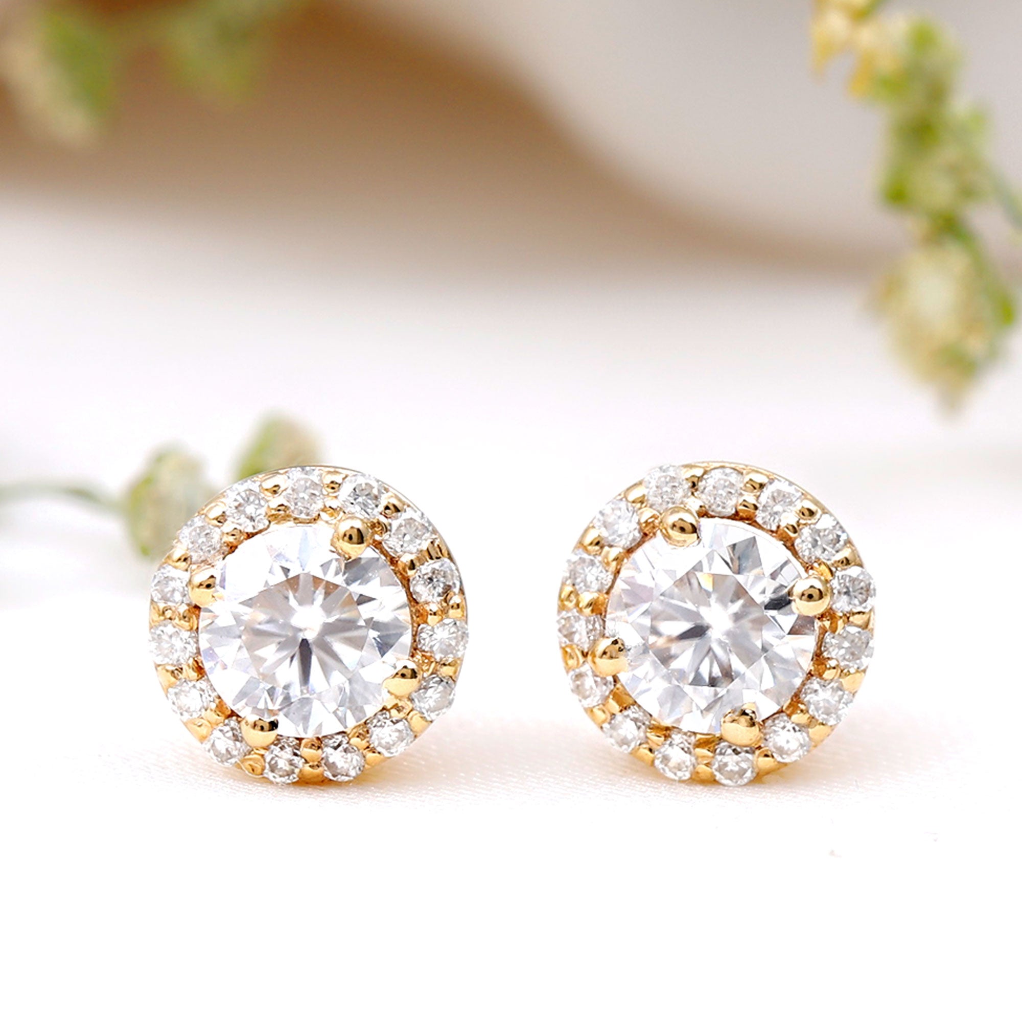 Halo Studs: Instantly elevate your style with halo stud earrings, featuring a circle of gems that enhances the center stone, creating a dazzling effect.
