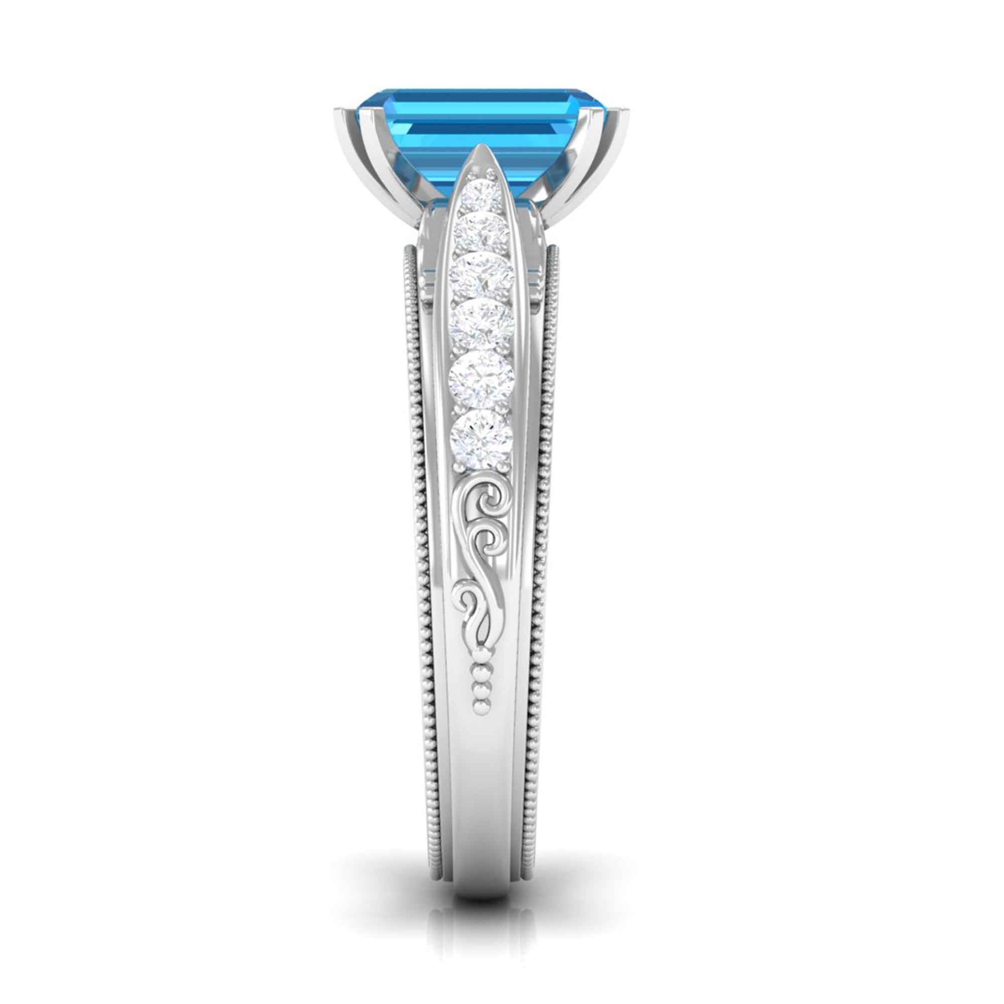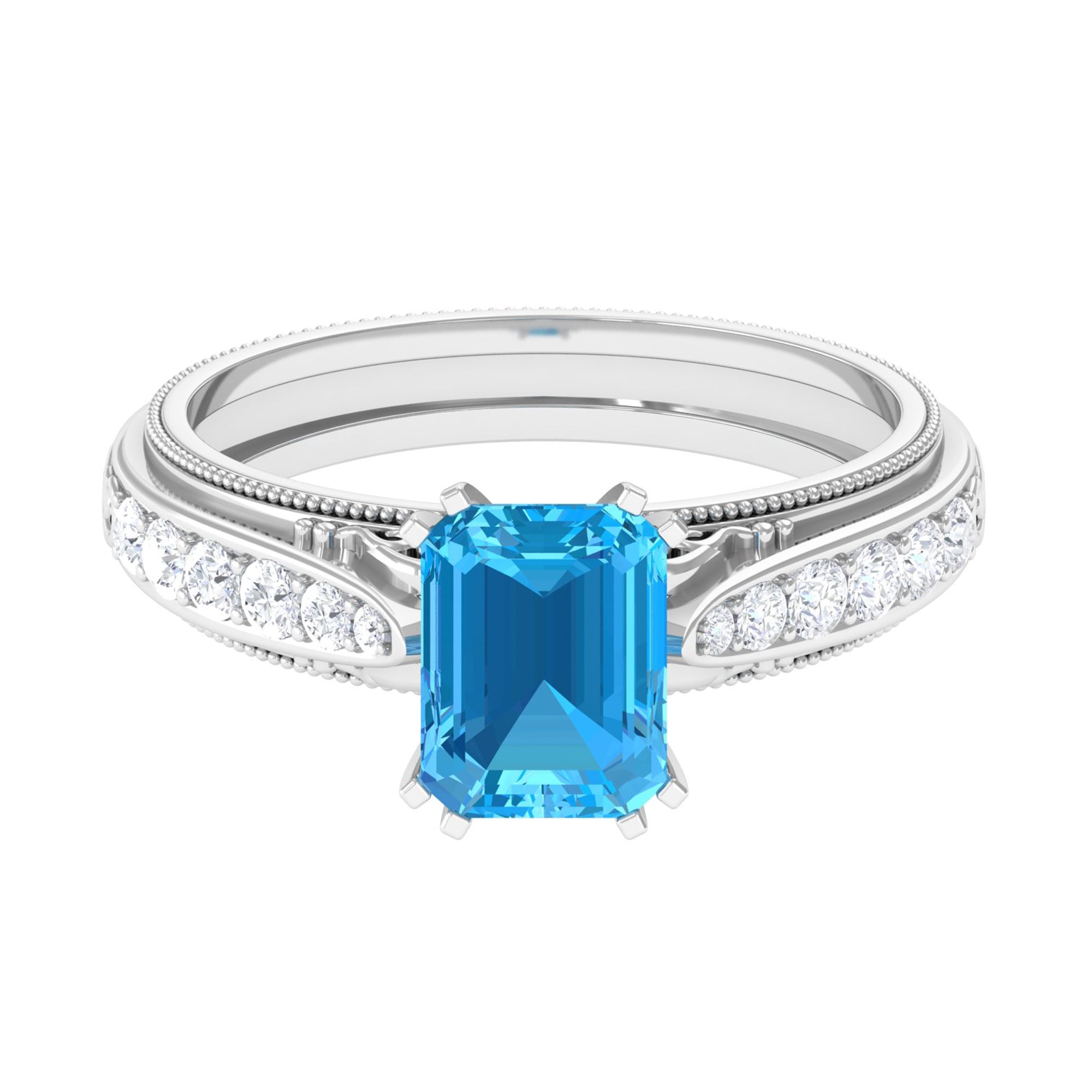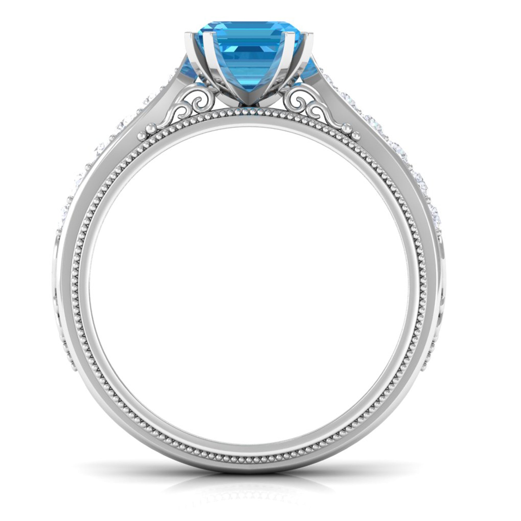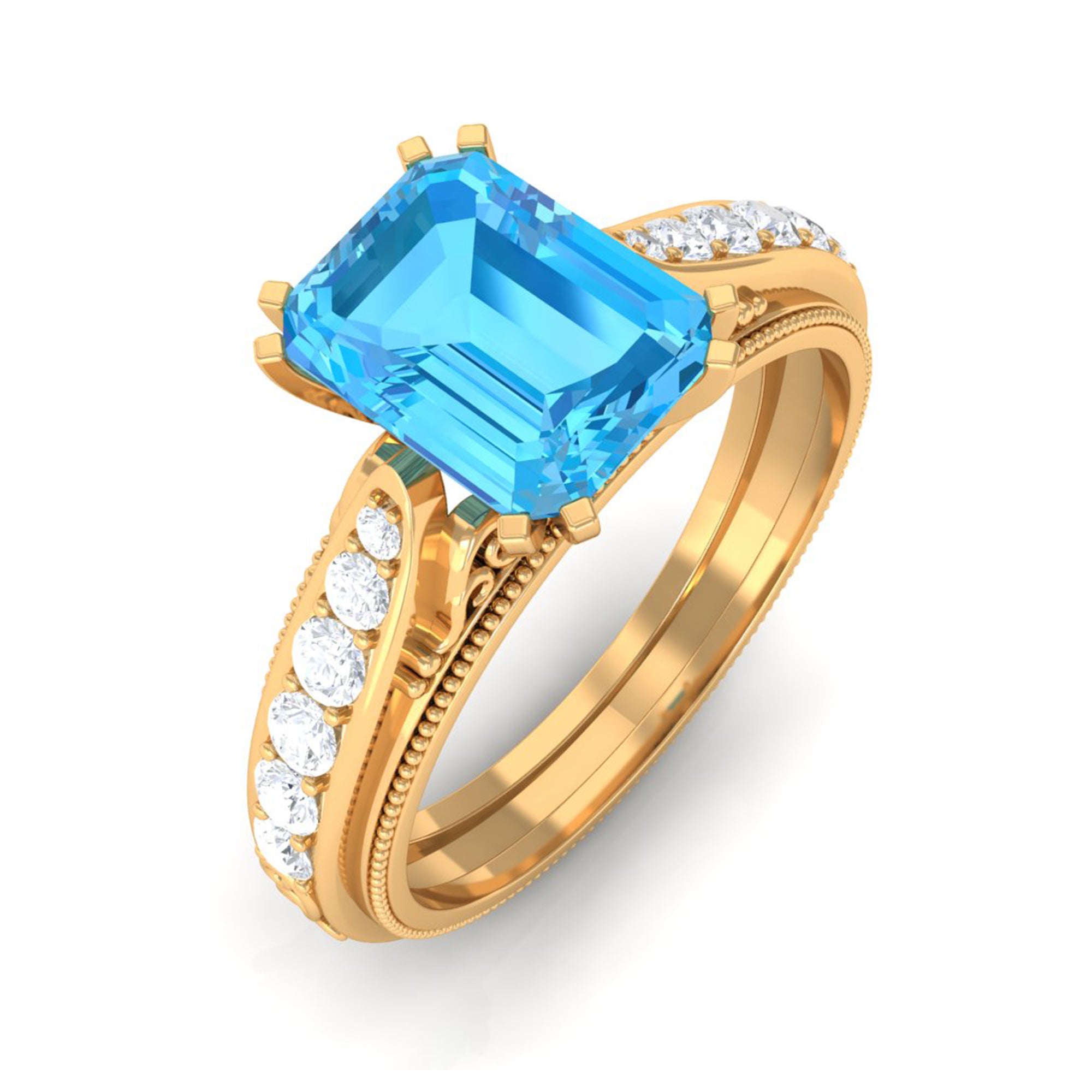 Highly prized as one of the most conventional Swiss Blue Topaz Engagement Rings out there, it is characterized by a Single Centerpiece of Swiss Blue Topaz of any shape. Technically, the Swiss Blue Topaz here appears much more flashy than any other ring style (with a stone size of 6 MM or more). It could range from an understated Round Cut Swiss Blue Topaz Ring to fancier ones such as those fashioned in Marquise, Princess, and Pear Cut. Or if you fancy a little old-school touch, an Asscher or Emerald Cut Swiss Blue Topaz Ring might be the one.