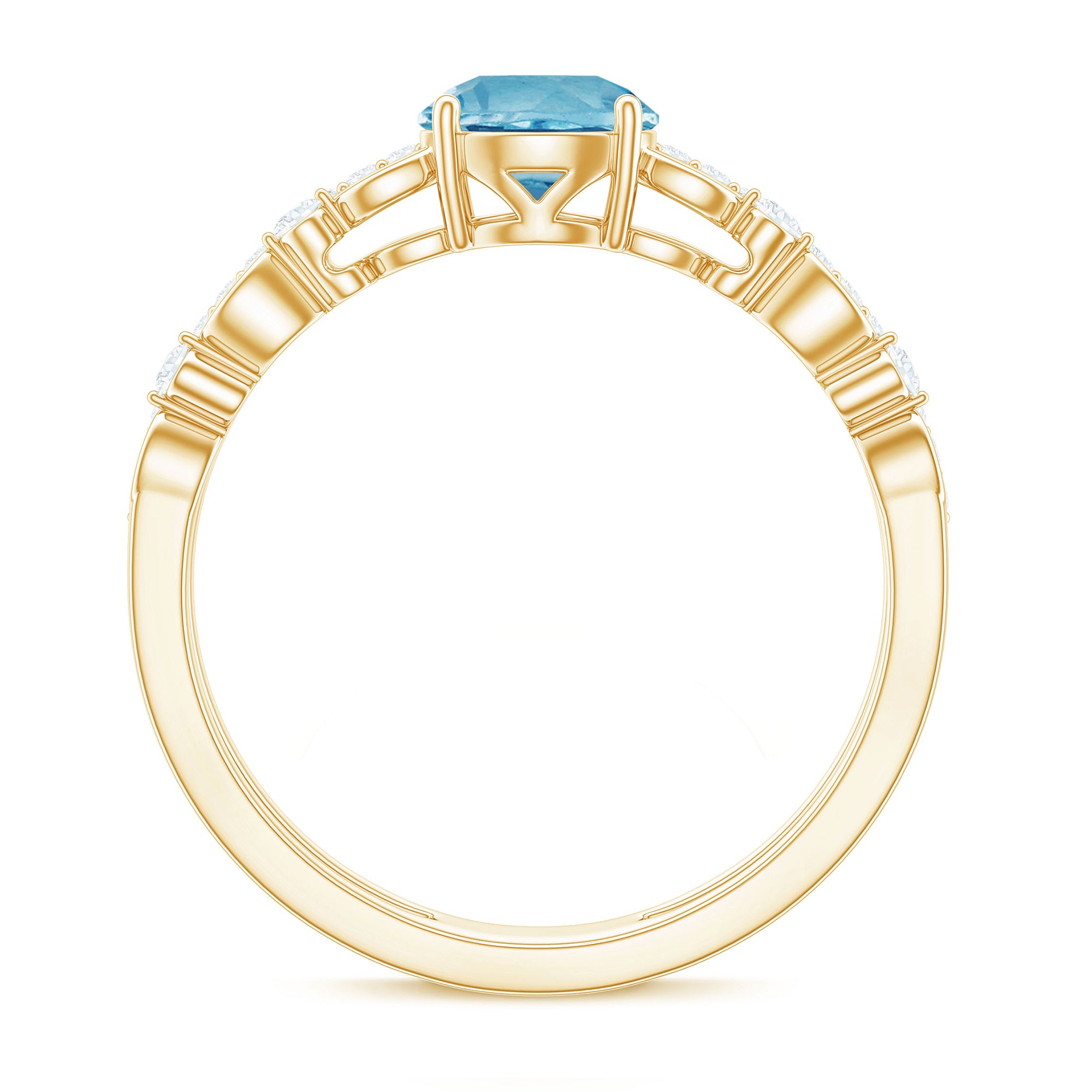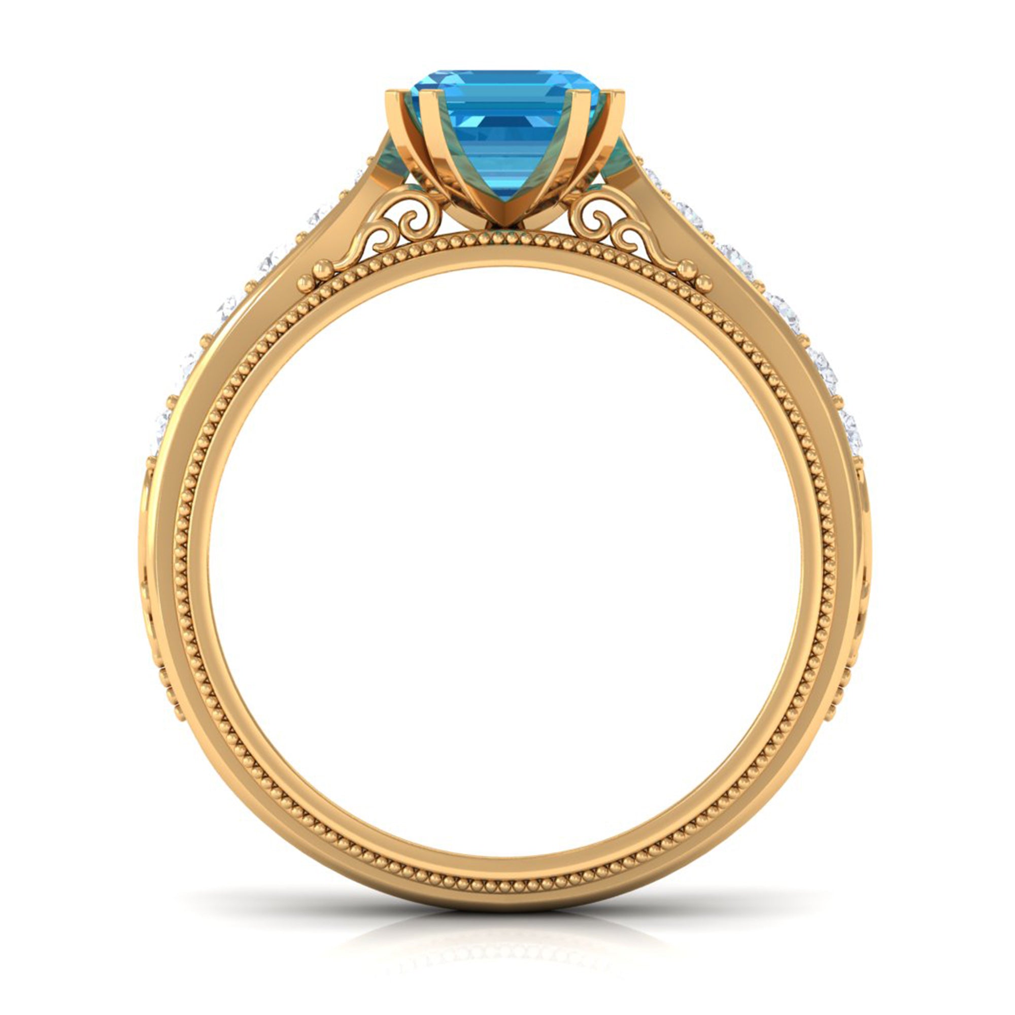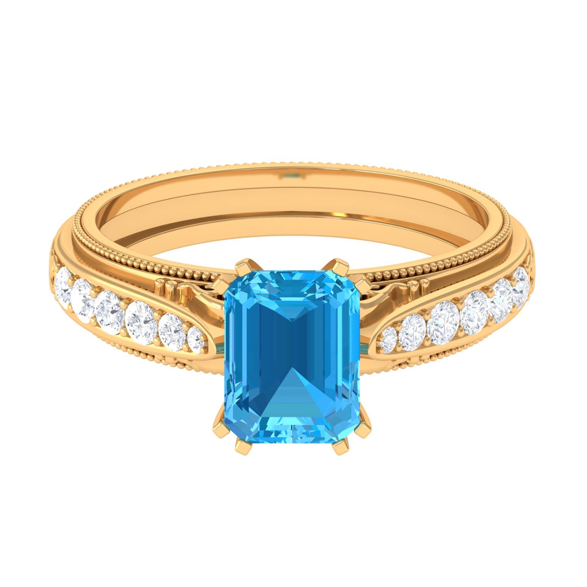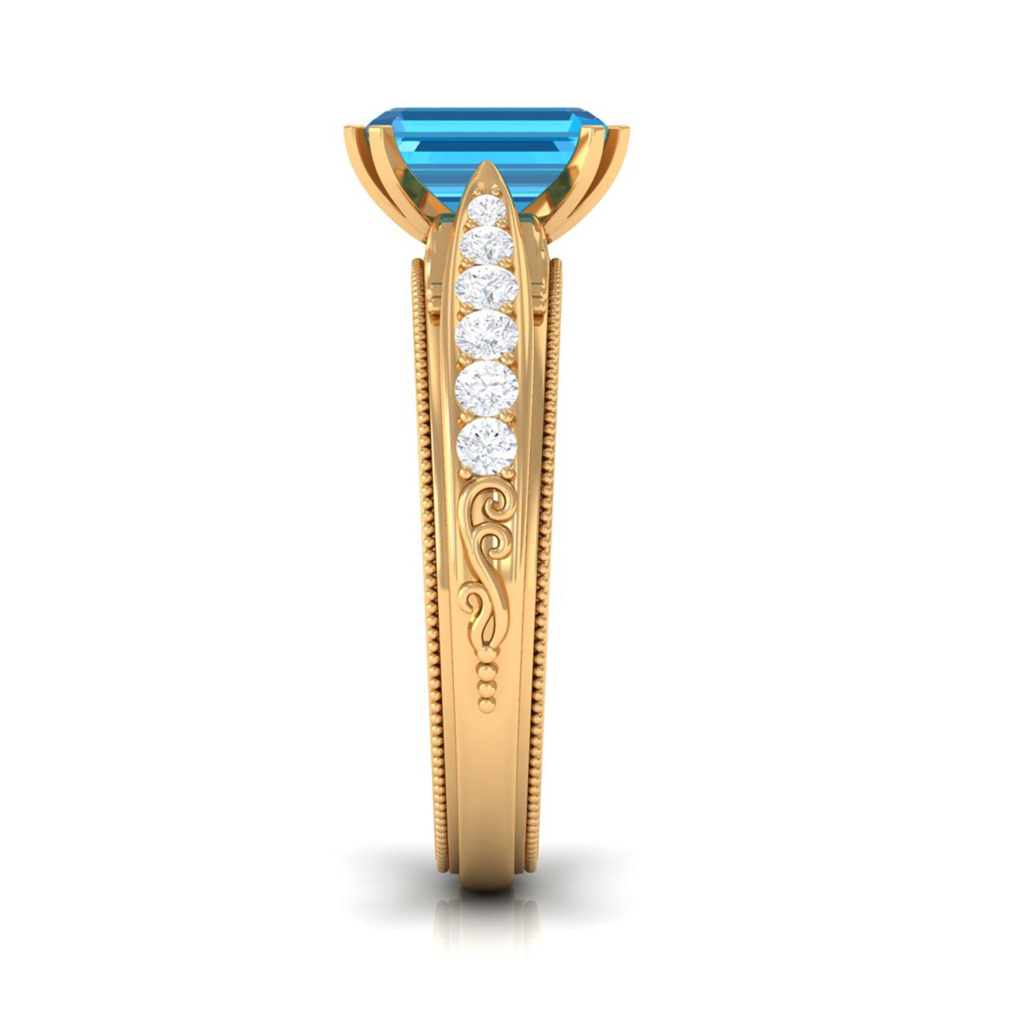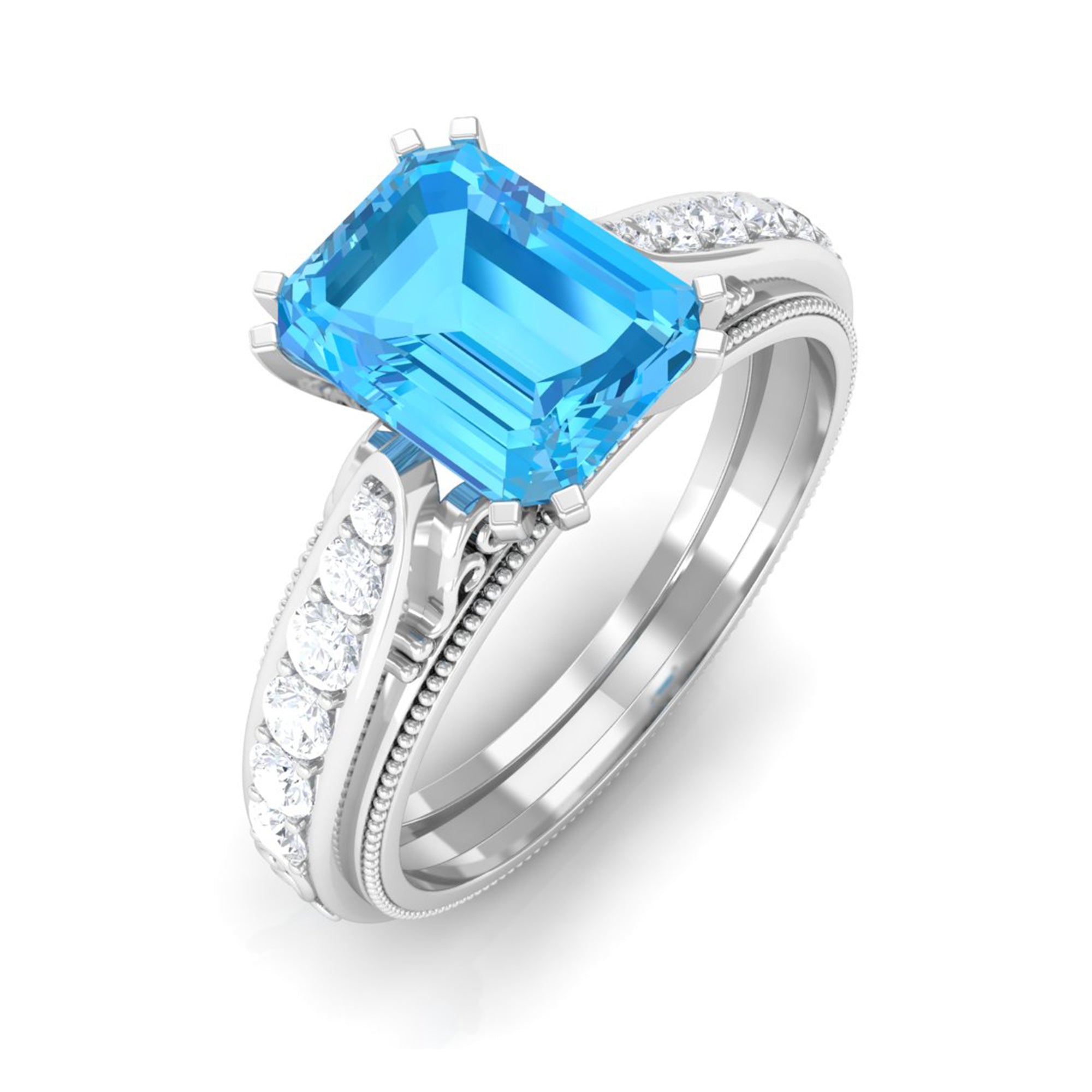 Highly prized as one of the most conventional Swiss Blue Topaz Engagement Rings out there, it is characterized by a Single Centerpiece of Swiss Blue Topaz of any shape. Technically, the Swiss Blue Topaz here appears much more flashy than any other ring style (with a stone size of 6 MM or more). It could range from an understated Round Cut Swiss Blue Topaz Ring to fancier ones such as those fashioned in Marquise, Princess, and Pear Cut. Or if you fancy a little old-school touch, an Asscher or Emerald Cut Swiss Blue Topaz Ring might be the one.