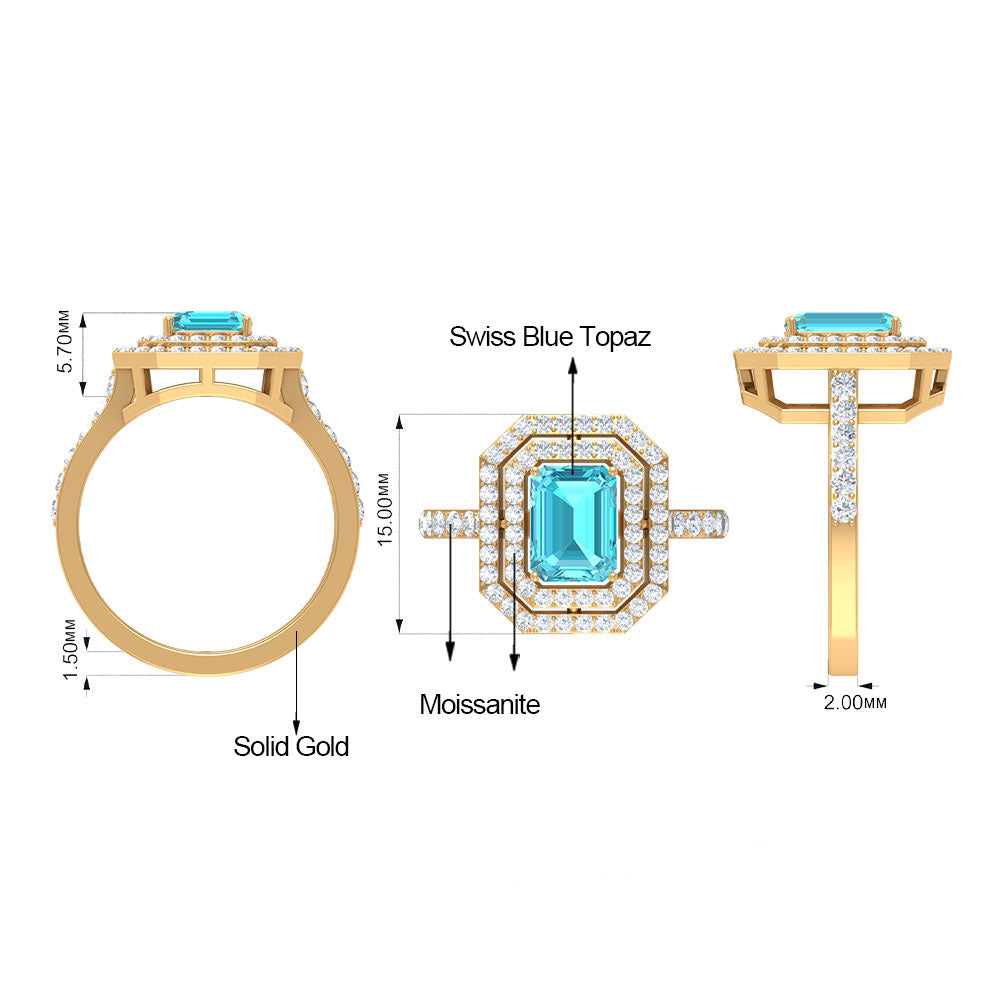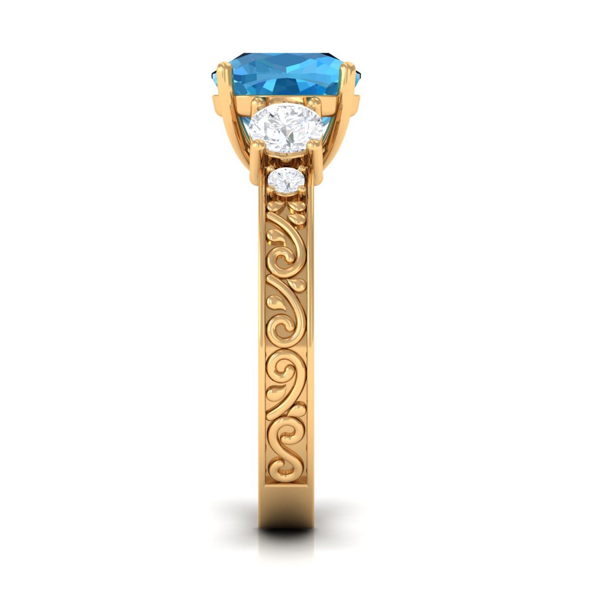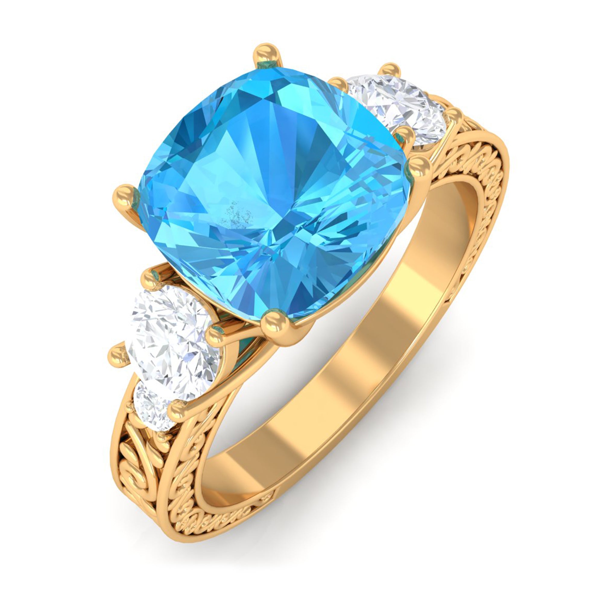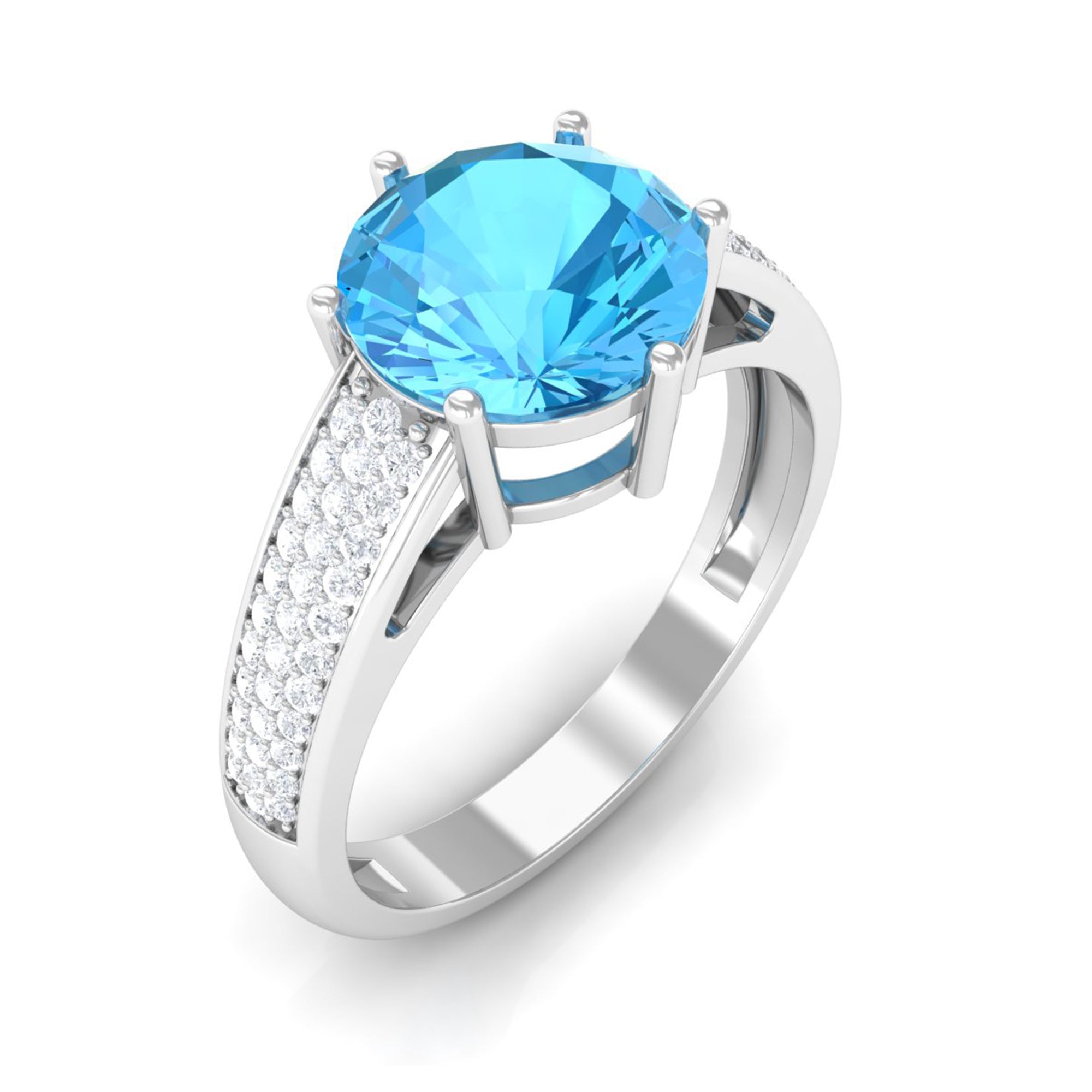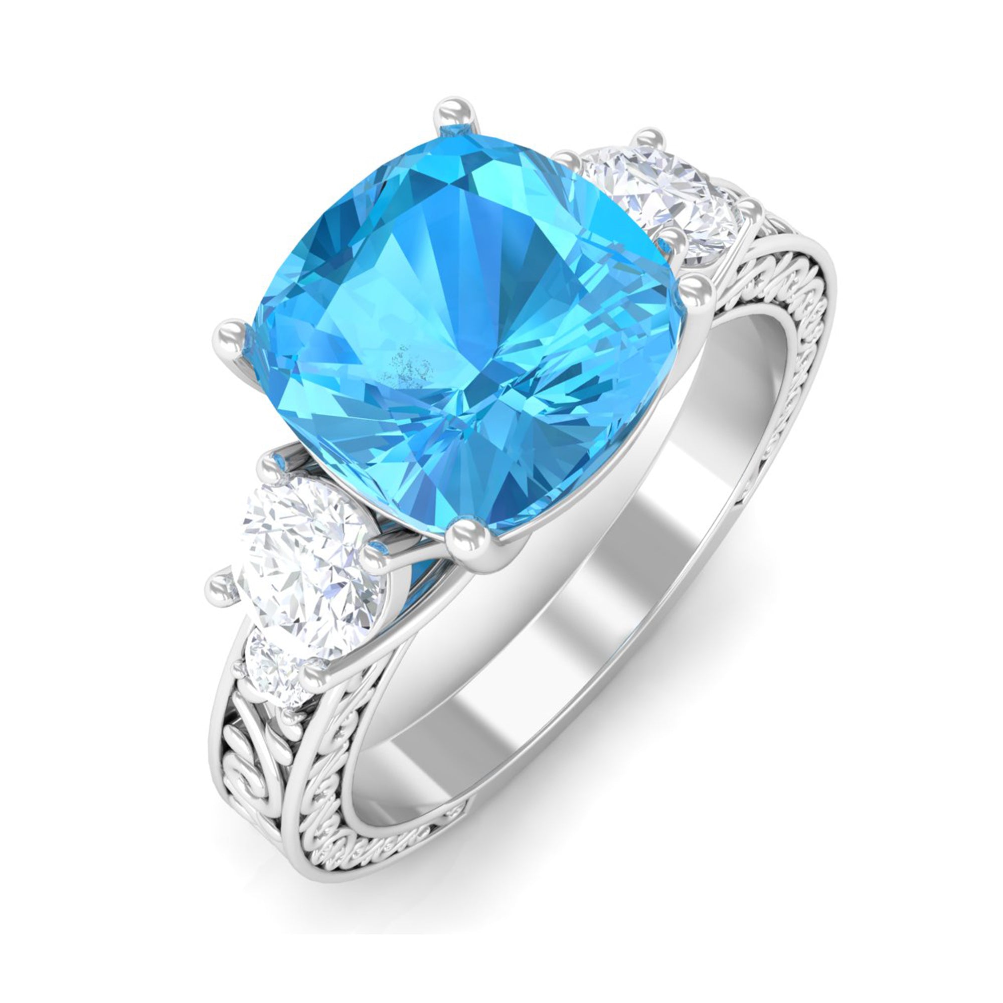 Treasured as one of the most flashy and flamboyant ring styles out there, a Swiss Blue Topaz Cocktail Ring is adorned by an enormous center stone of Swiss Blue Topaz. It is further beautified by eye-striking patterns of side-stones of Diamond/Moissanite under floral, antique, or any other statement-making design.