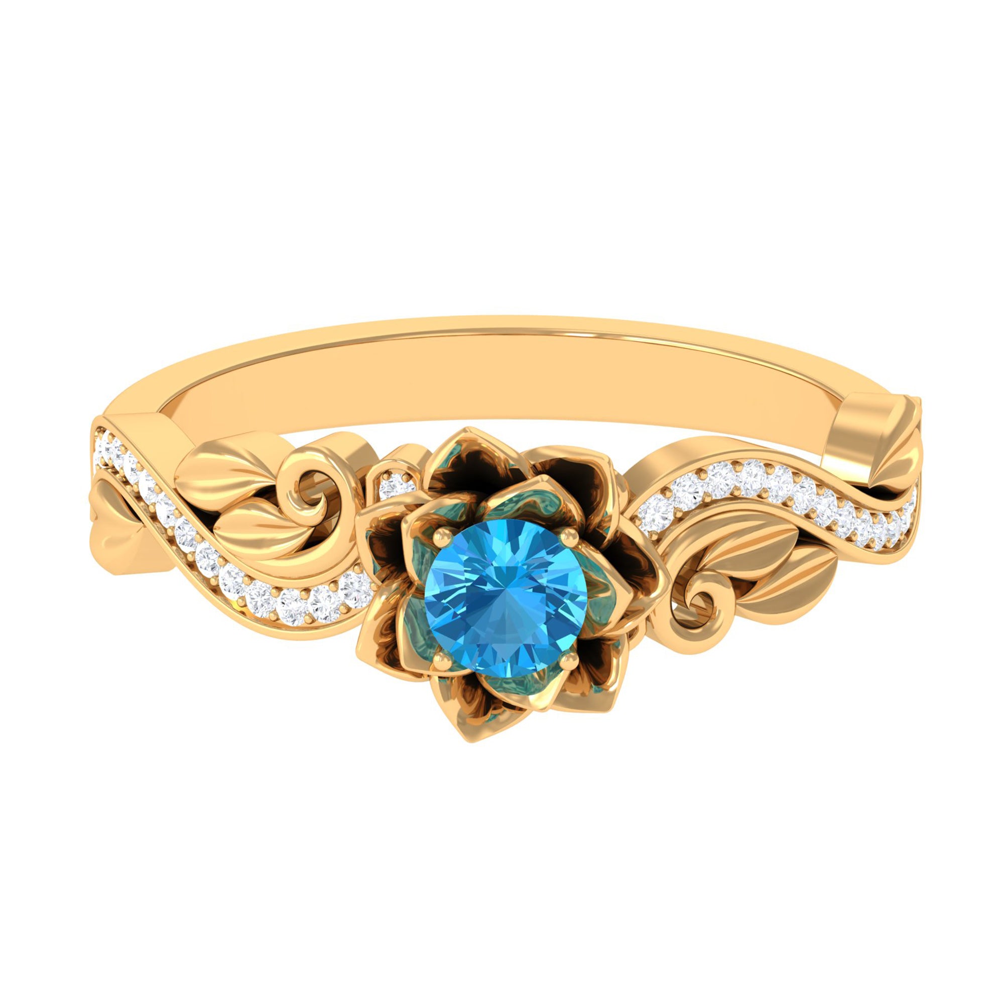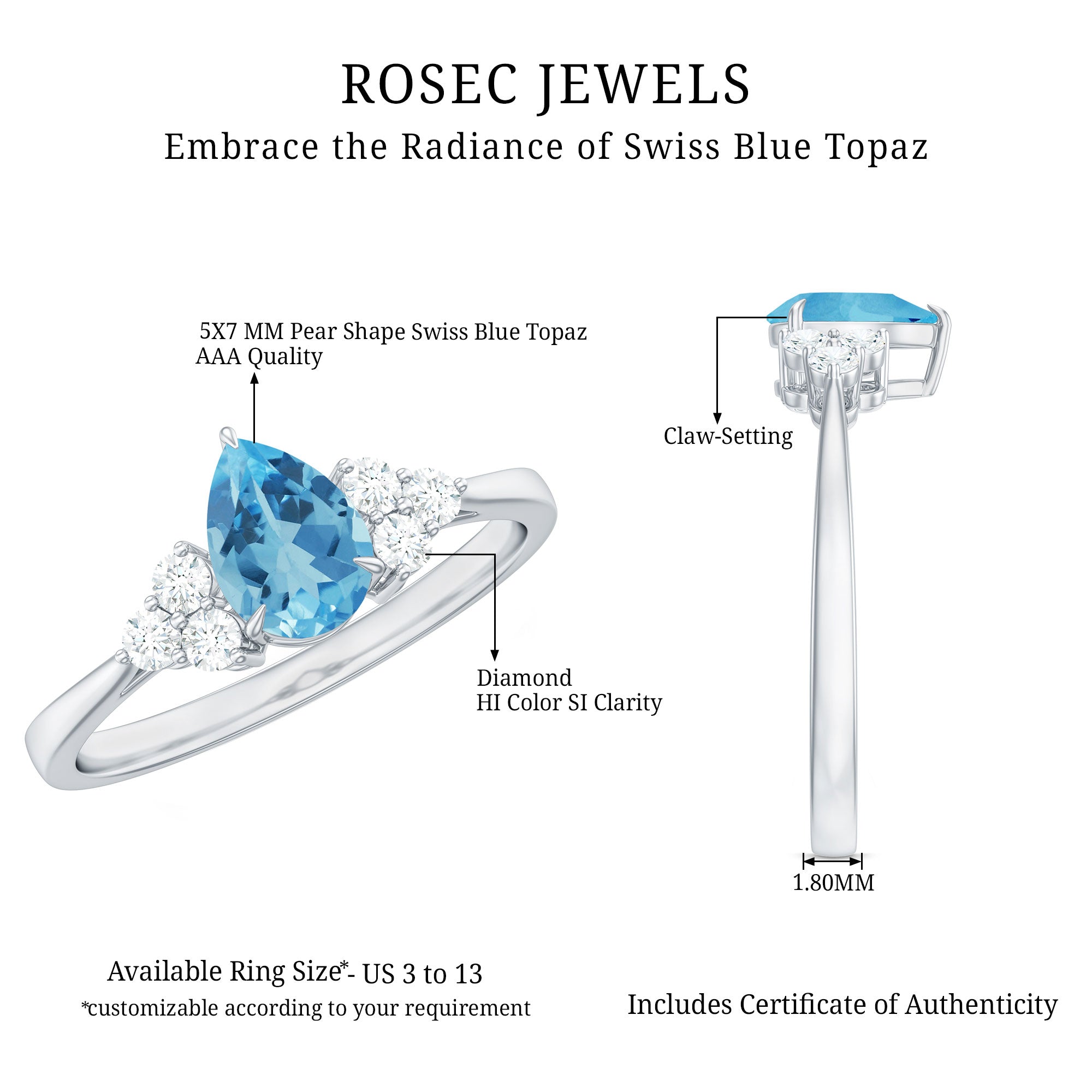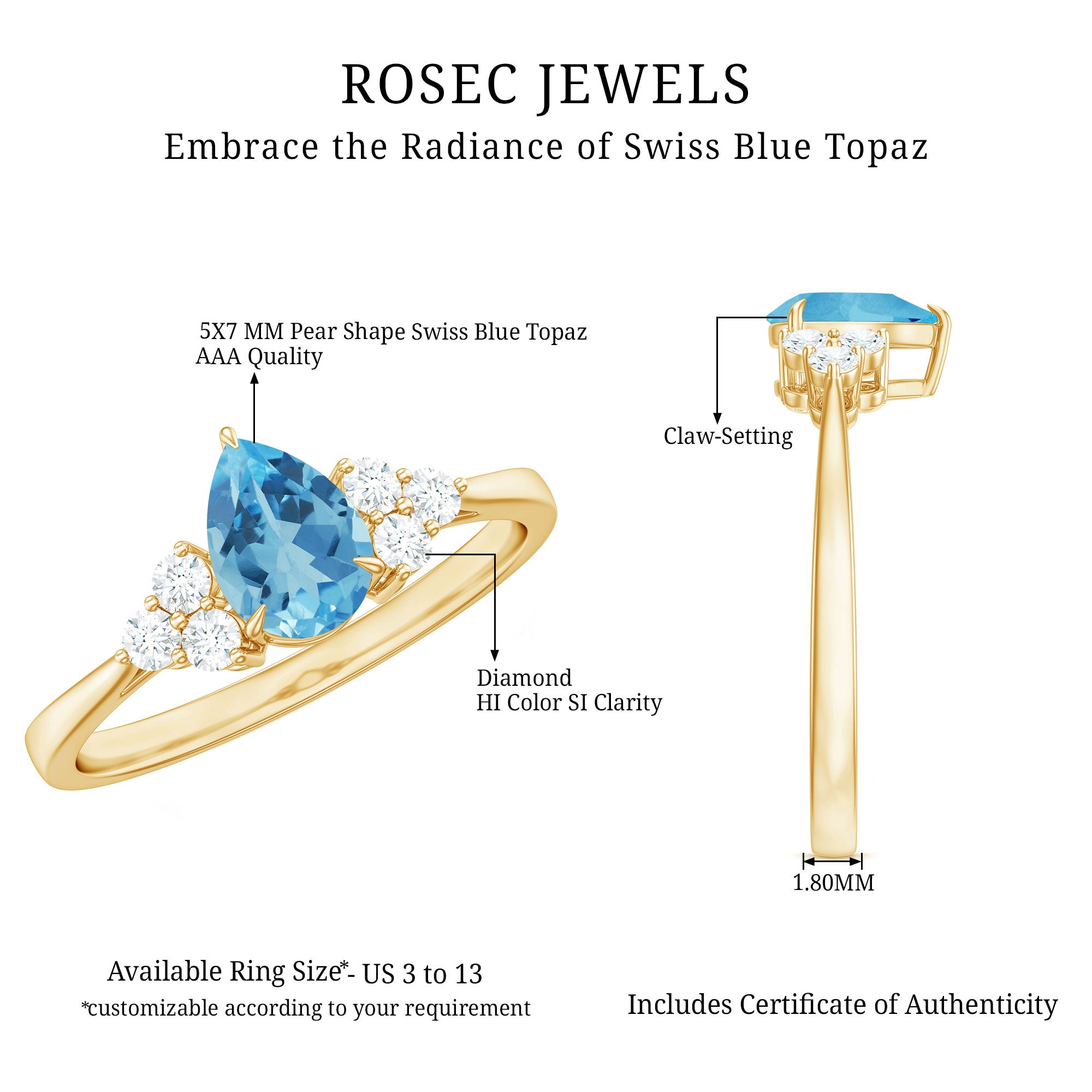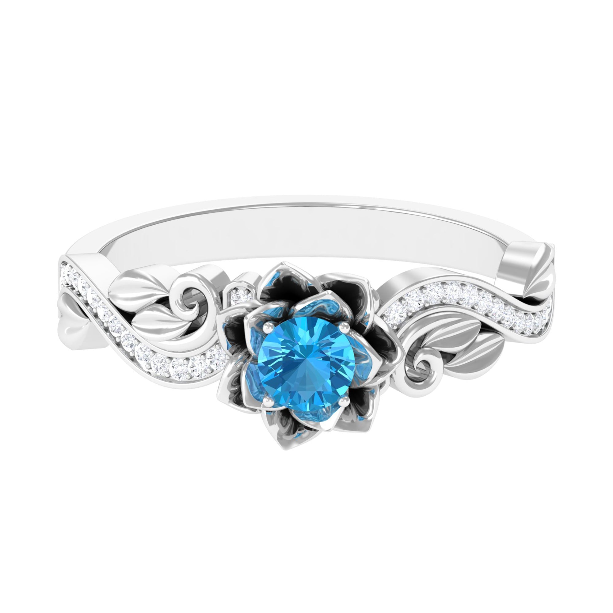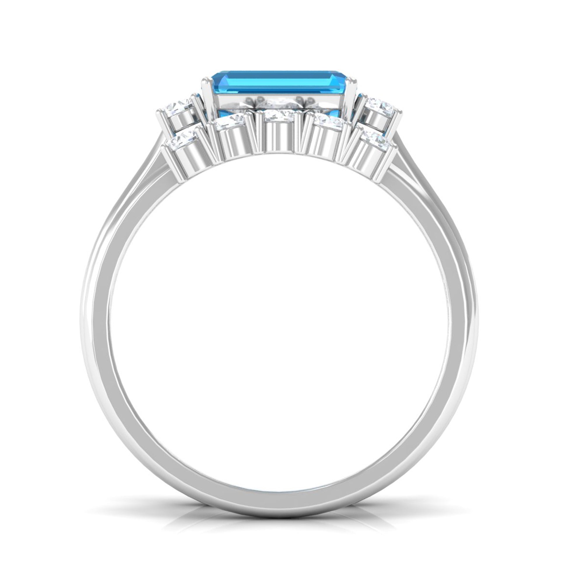 Treasured as one of the most flashy and flamboyant ring styles out there, a Swiss Blue Topaz Cocktail Ring is adorned by an enormous center stone of Swiss Blue Topaz. It is further beautified by eye-striking patterns of side-stones of Diamond/Moissanite under floral, antique, or any other statement-making design.