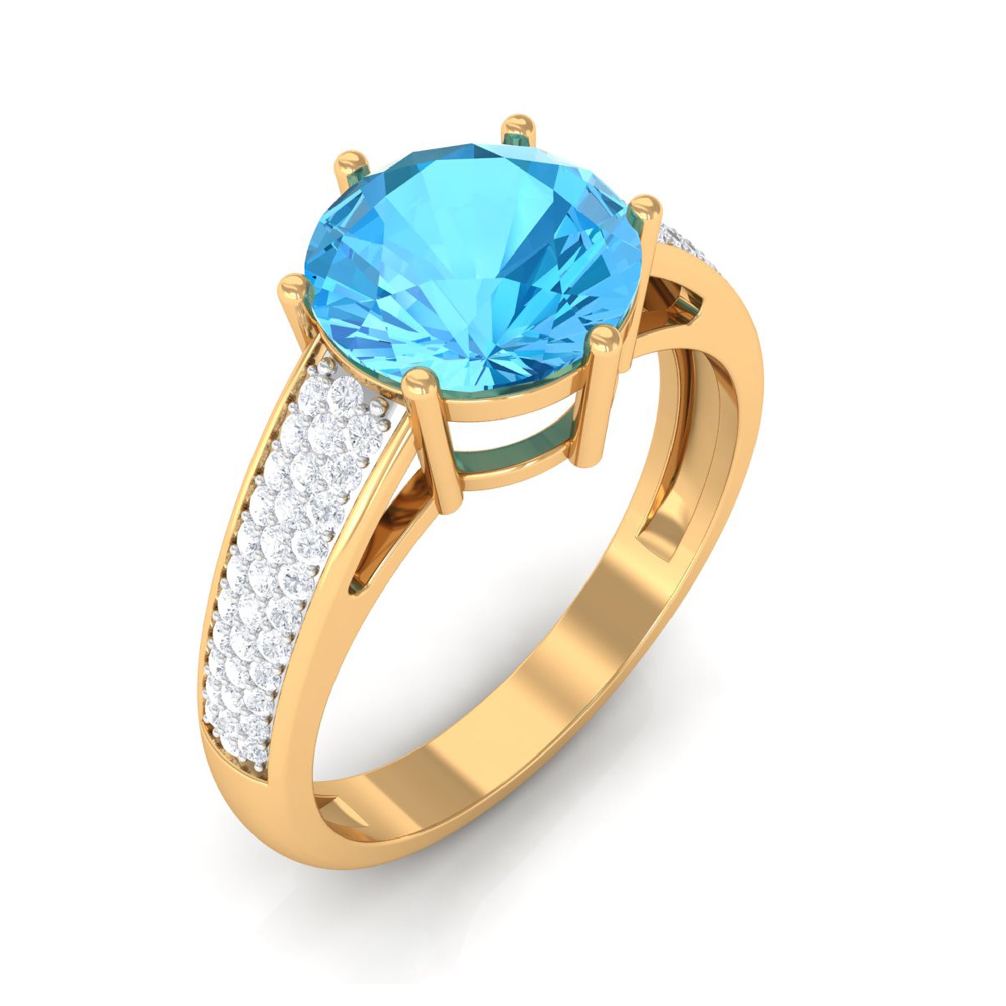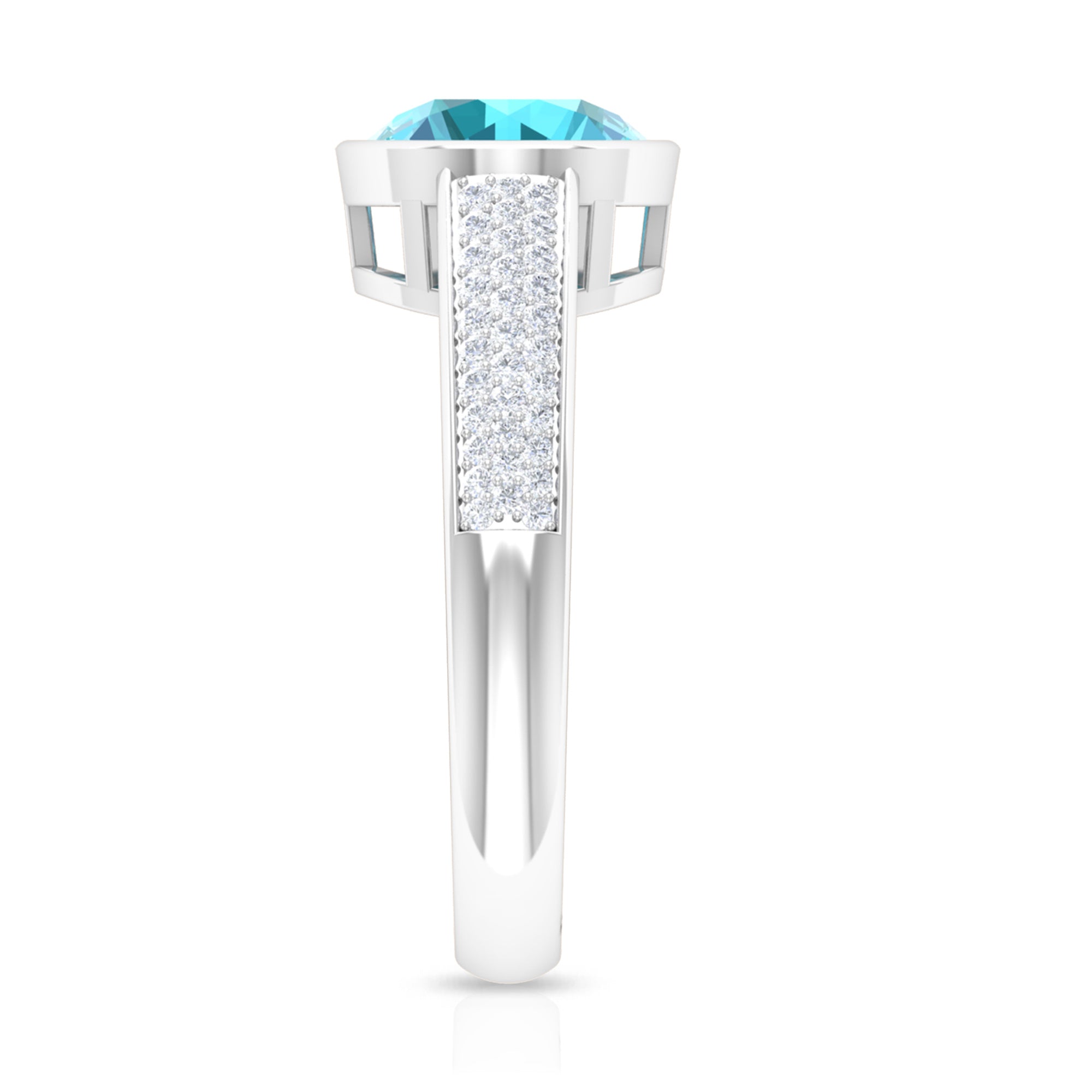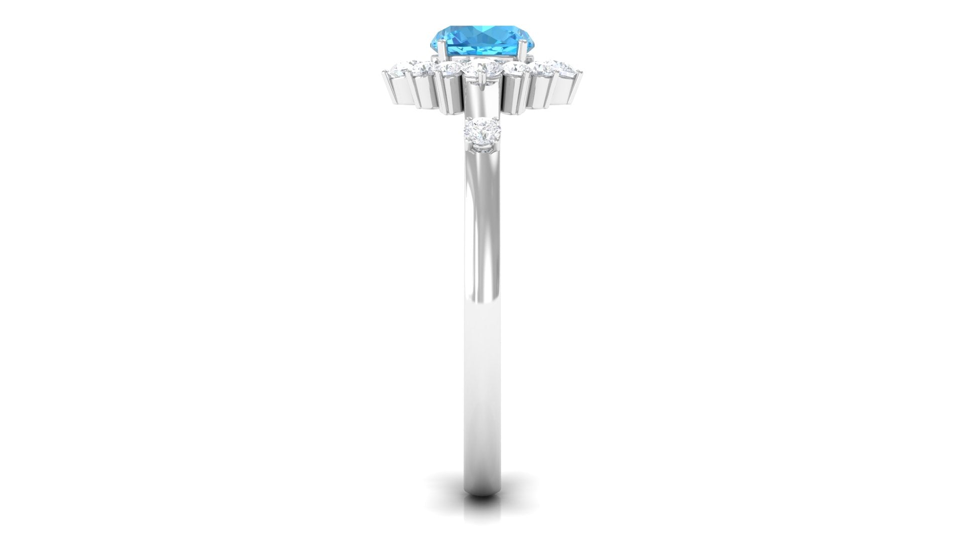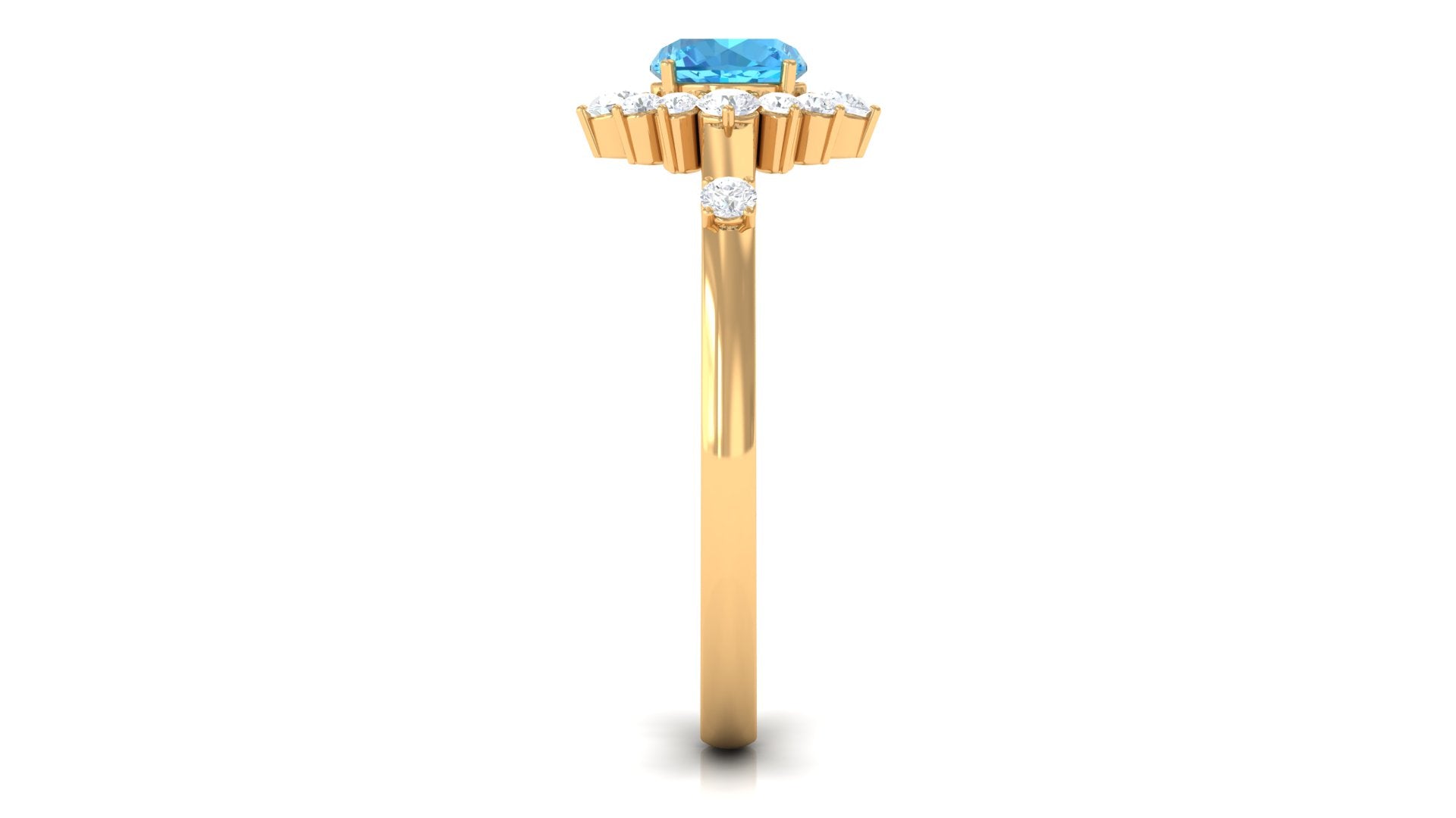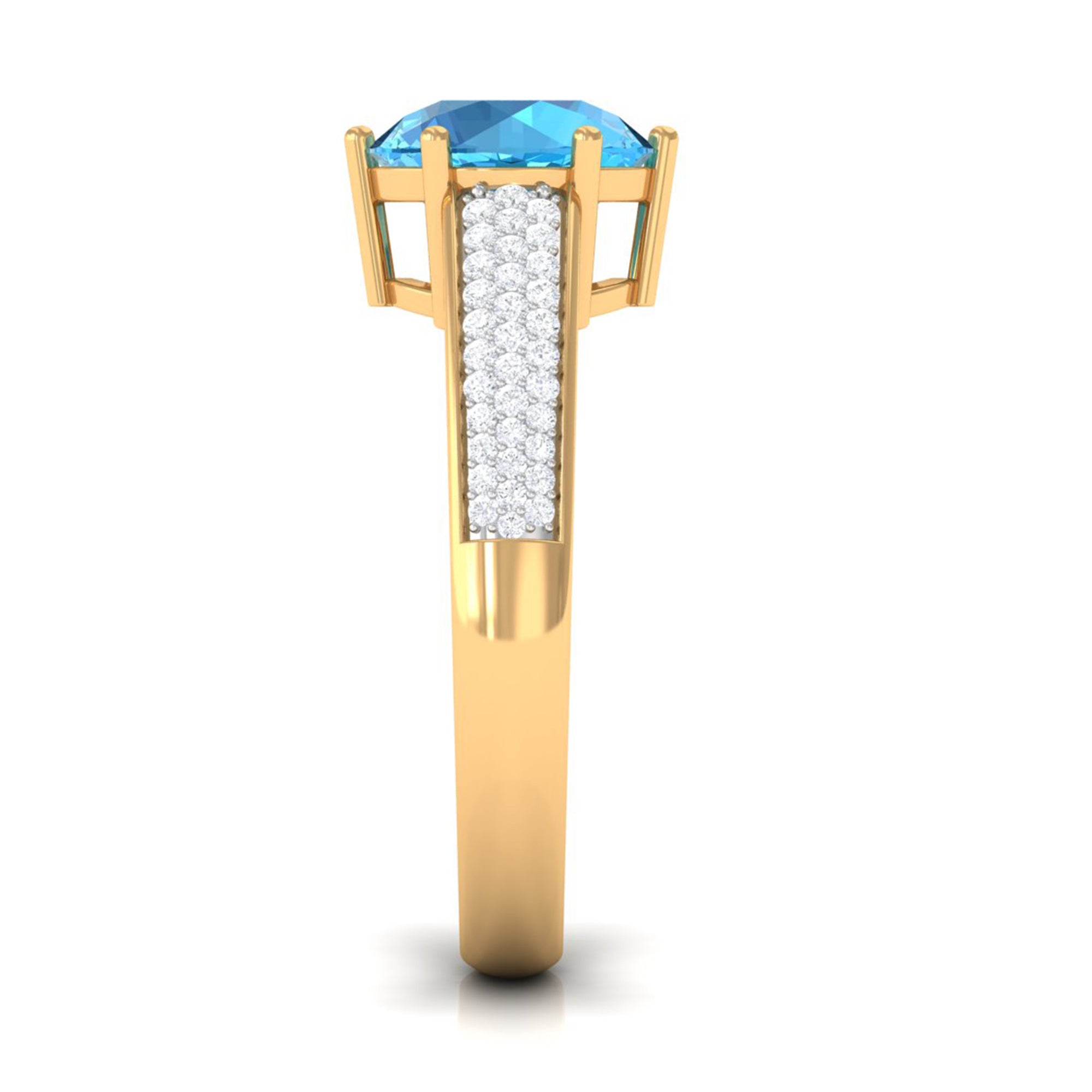 The center-stone of Swiss Blue Topaz here is sparkled up with the encircling of Diamond/Moissanite (that we fondly term ‘Halo’). That makes the Swiss Blue Topaz appear even brighter while highlighting its beauty at its best. Surprisingly, it also gives off the illusion of a bigger Topaz. So, if a Swiss Blue Topaz and Diamond Ring is on your list, this style might turn out to be your best bet.