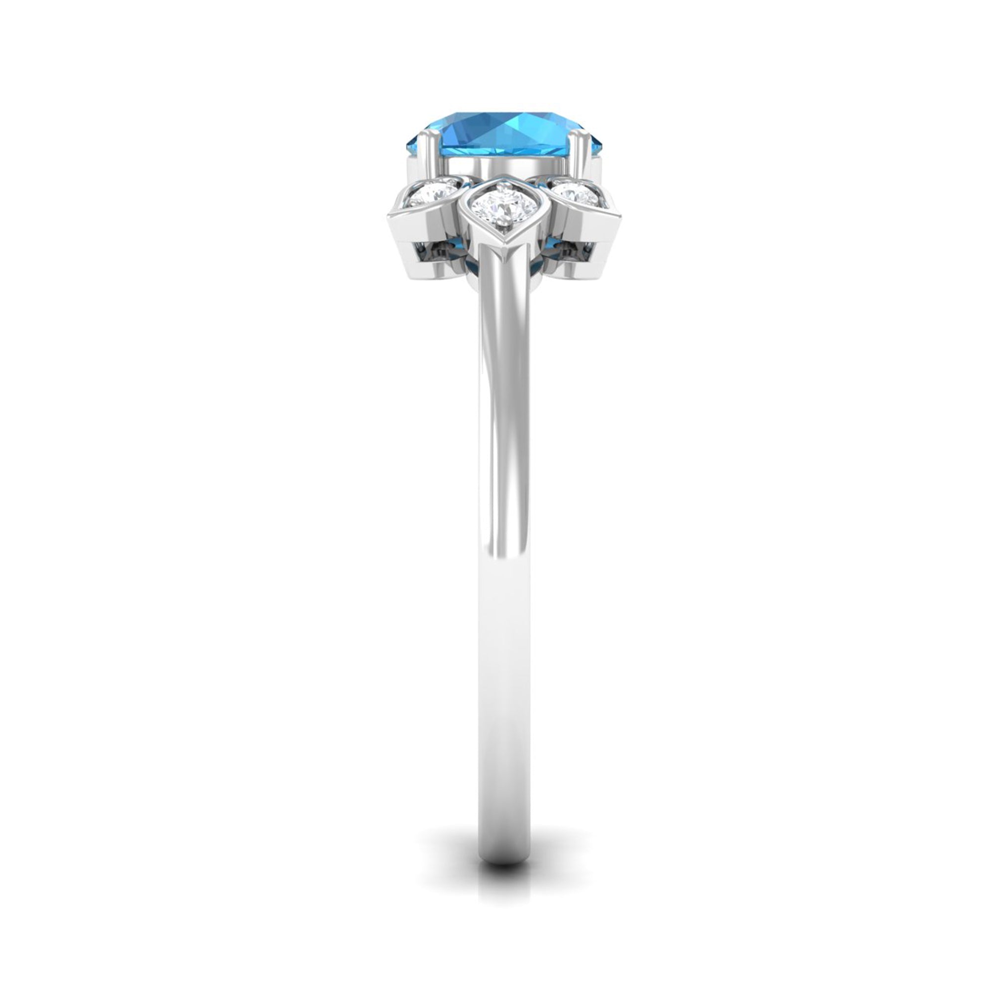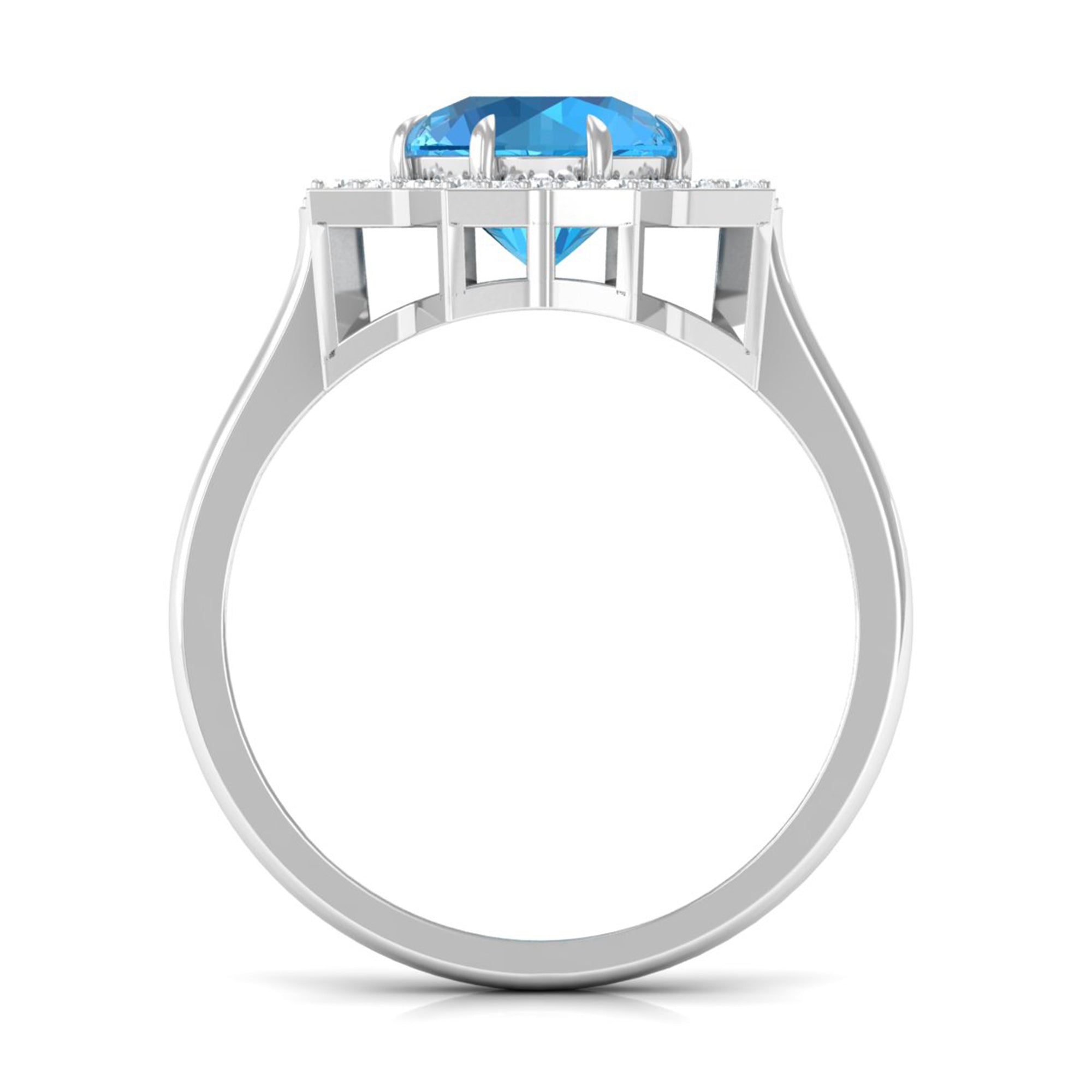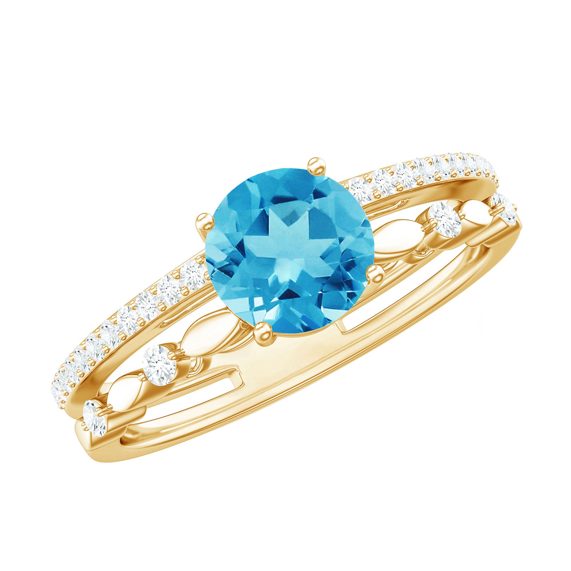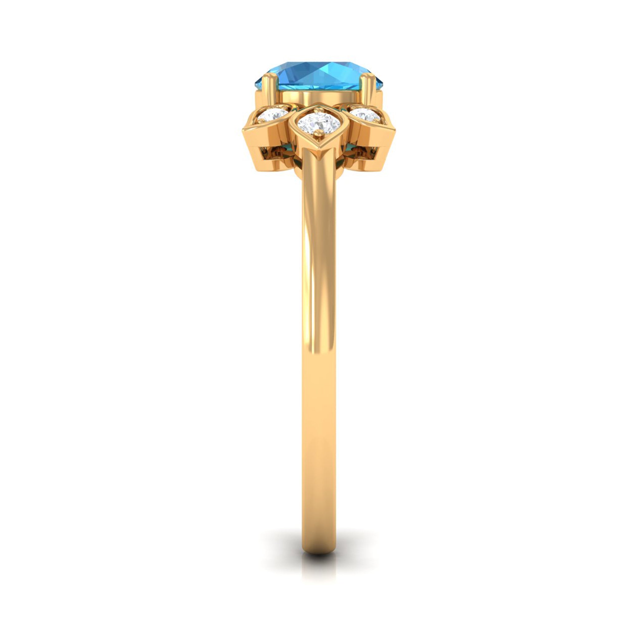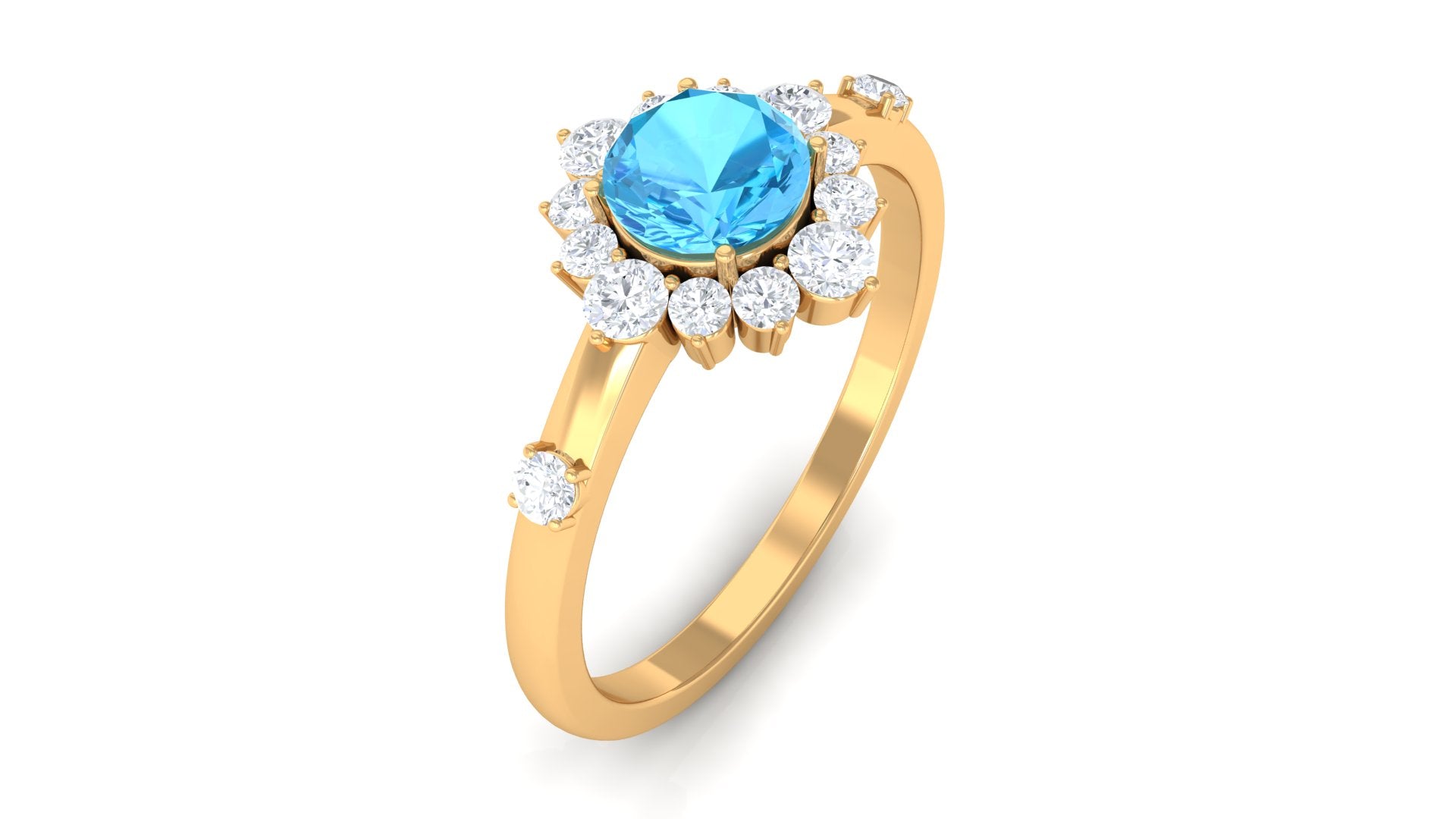 The center-stone of Swiss Blue Topaz here is sparkled up with the encircling of Diamond/Moissanite (that we fondly term ‘Halo’). That makes the Swiss Blue Topaz appear even brighter while highlighting its beauty at its best. Surprisingly, it also gives off the illusion of a bigger Topaz. So, if a Swiss Blue Topaz and Diamond Ring is on your list, this style might turn out to be your best bet.