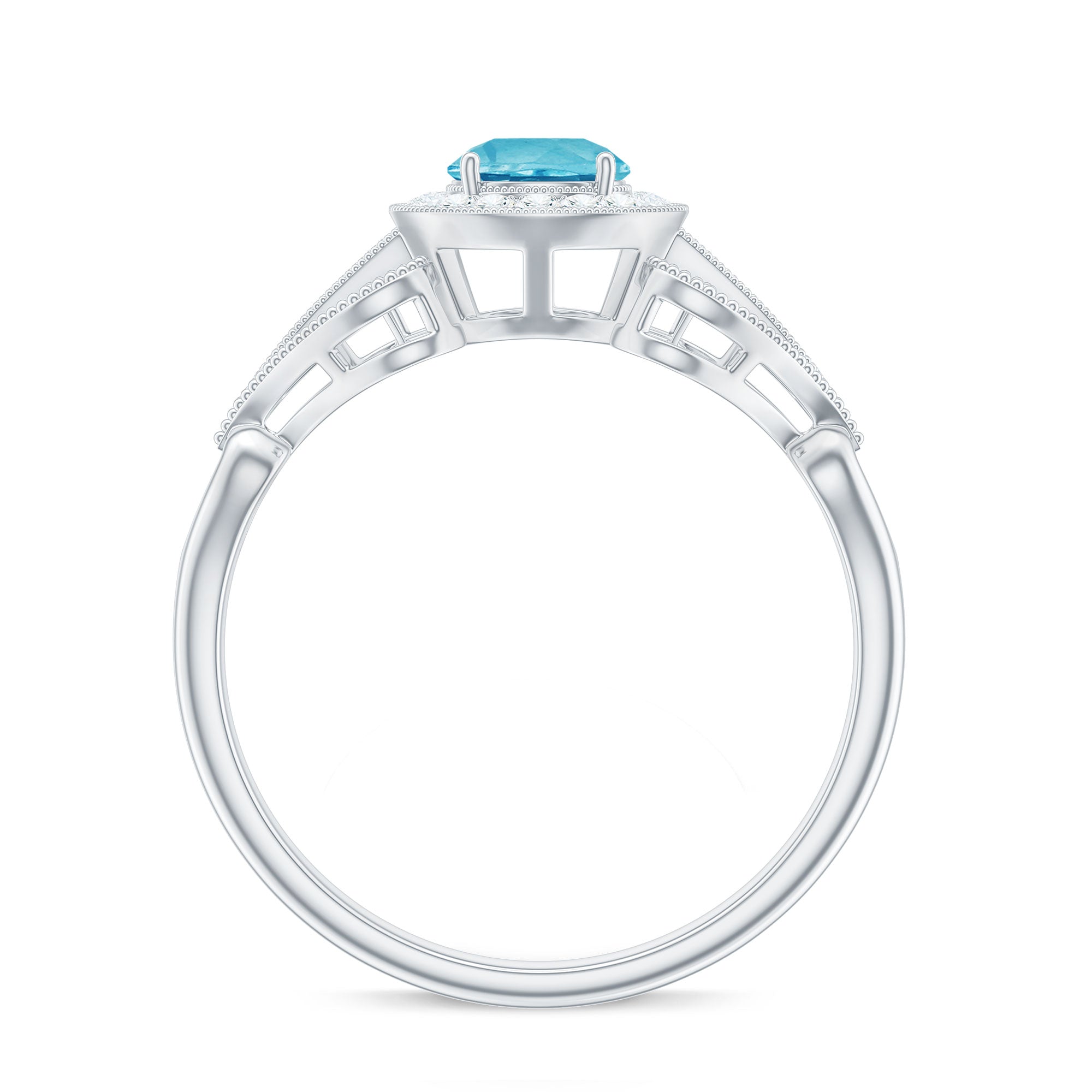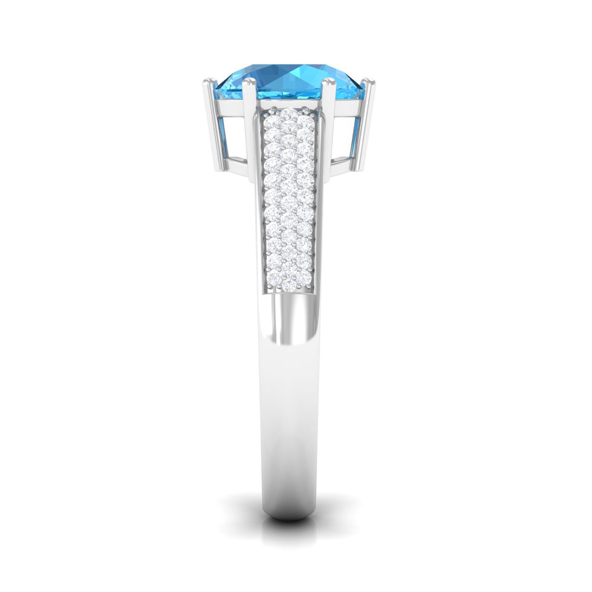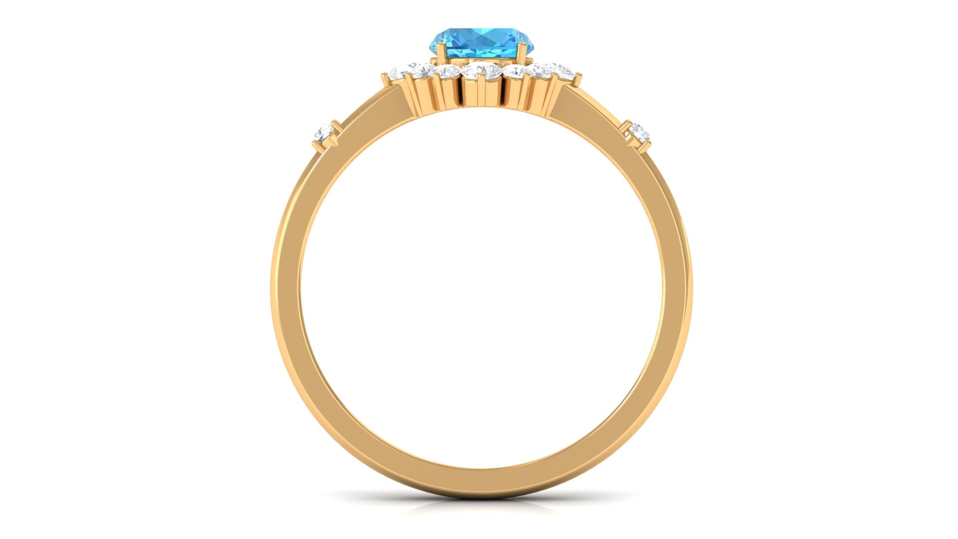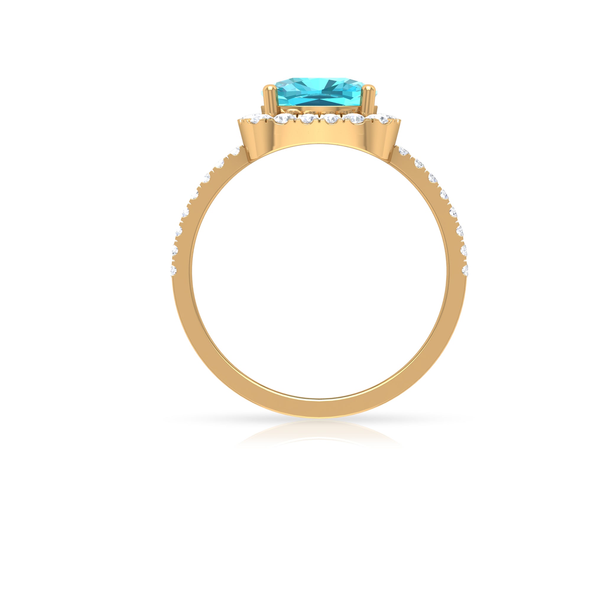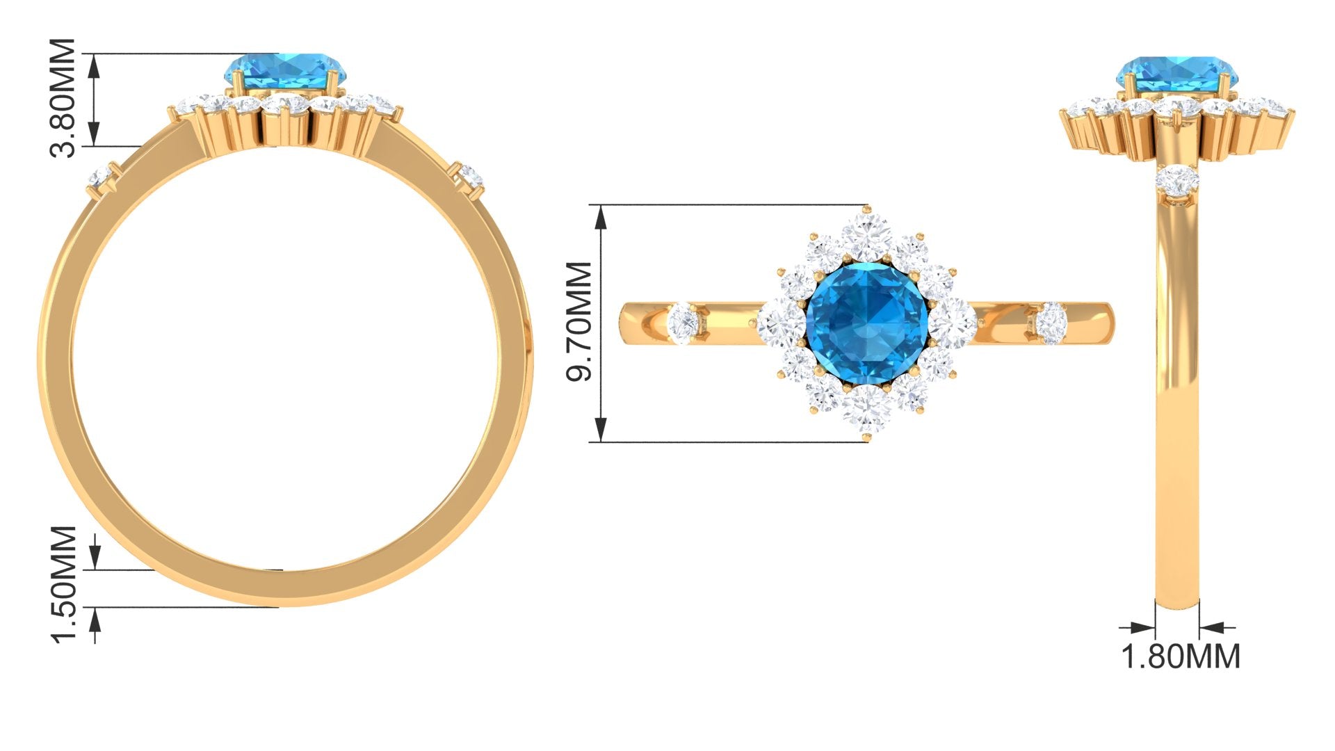 The center-stone of Swiss Blue Topaz here is sparkled up with the encircling of Diamond/Moissanite (that we fondly term ‘Halo’). That makes the Swiss Blue Topaz appear even brighter while highlighting its beauty at its best. Surprisingly, it also gives off the illusion of a bigger Topaz. So, if a Swiss Blue Topaz and Diamond Ring is on your list, this style might turn out to be your best bet.