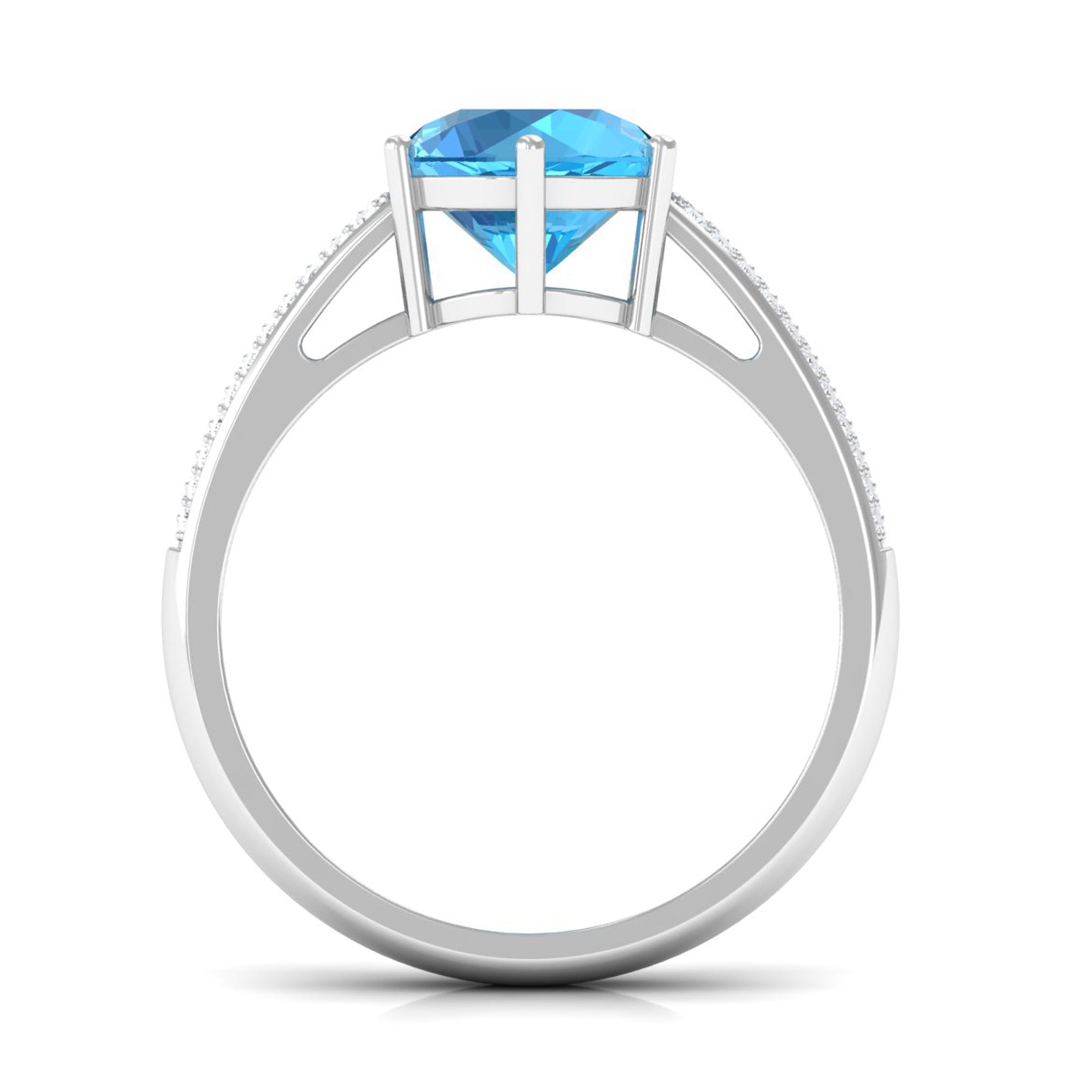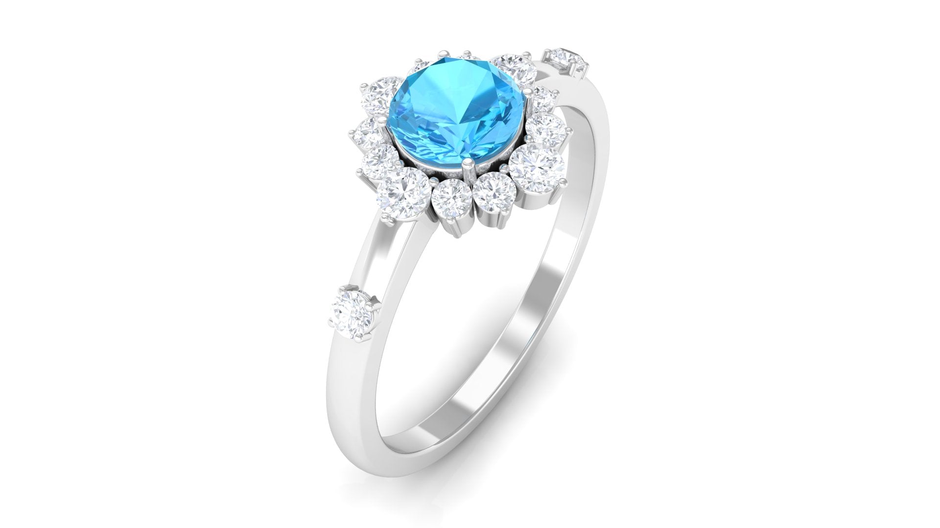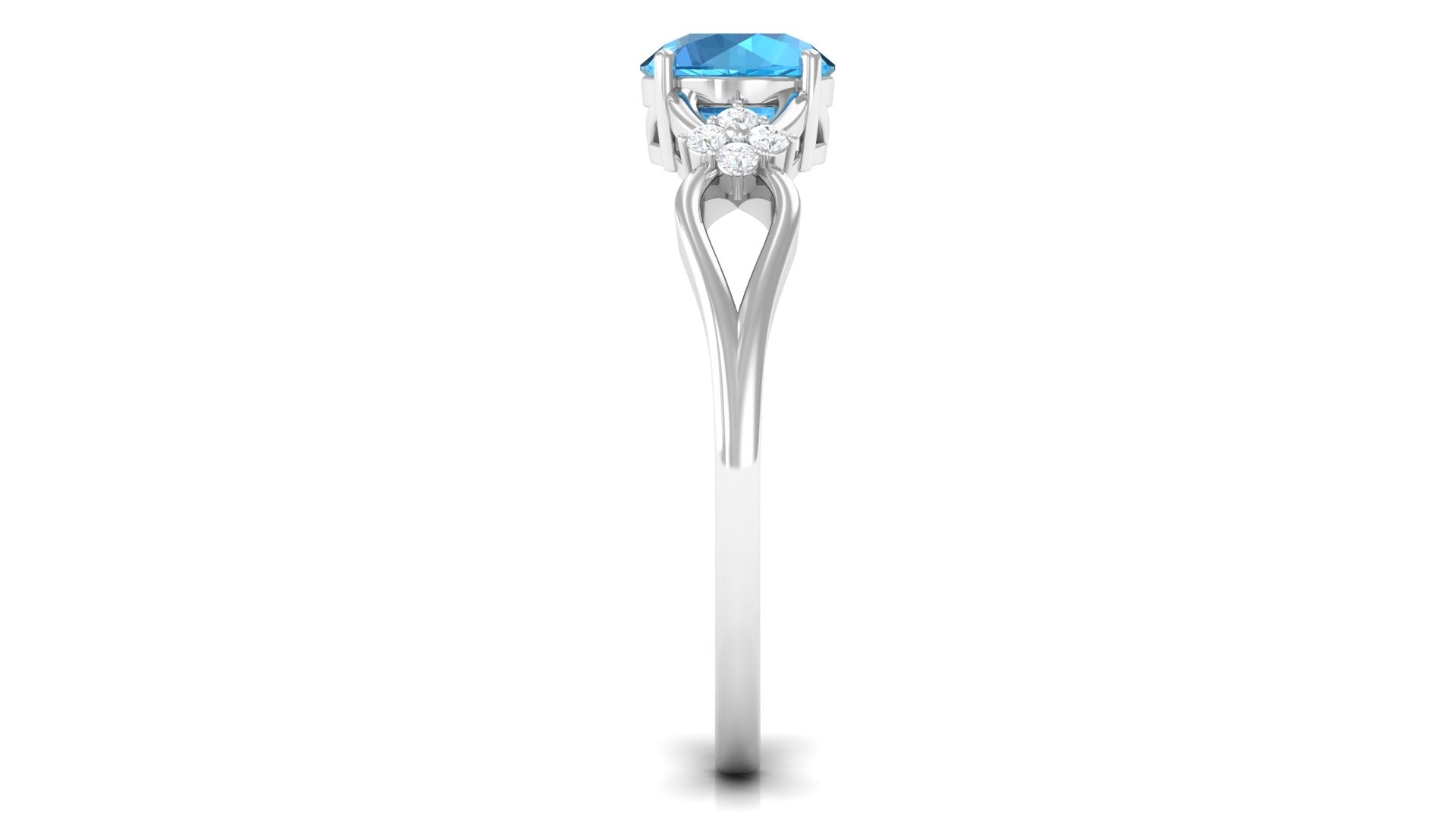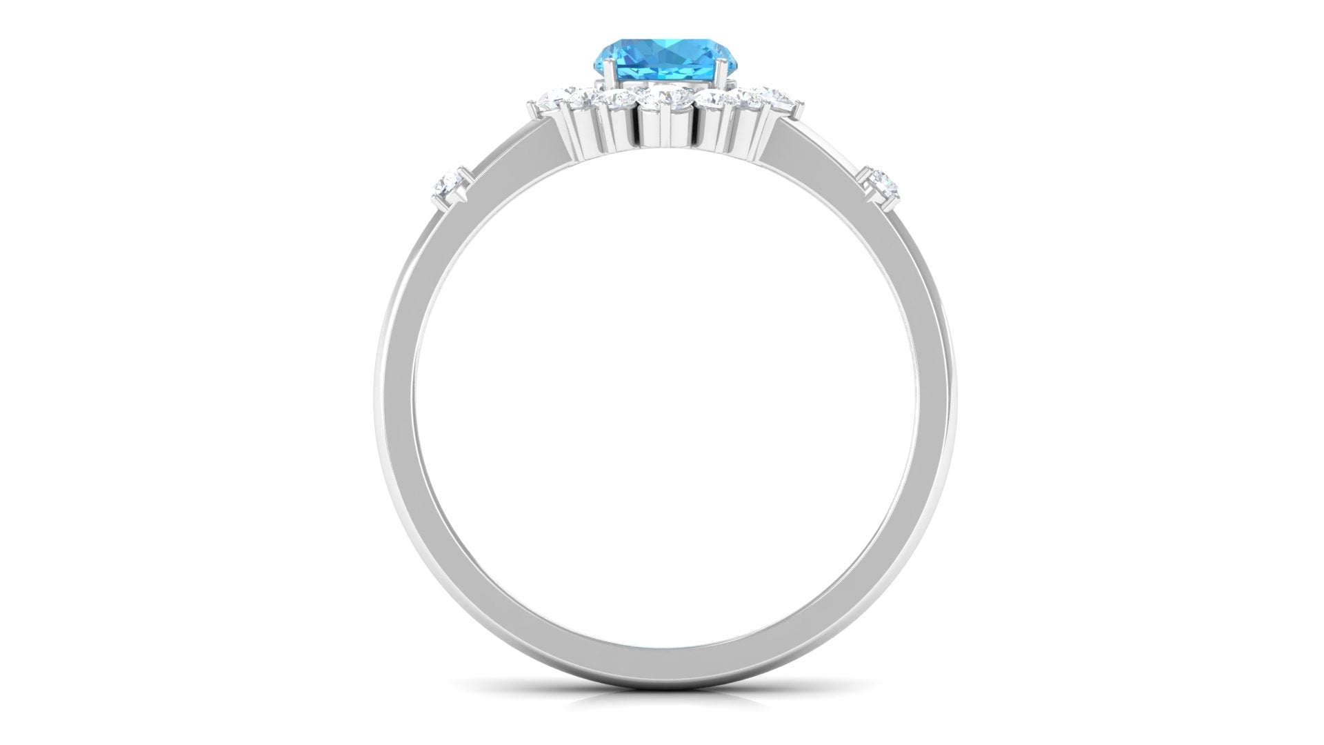 The center-stone of Swiss Blue Topaz here is sparkled up with the encircling of Diamond/Moissanite (that we fondly term ‘Halo’). That makes the Swiss Blue Topaz appear even brighter while highlighting its beauty at its best. Surprisingly, it also gives off the illusion of a bigger Topaz. So, if a Swiss Blue Topaz and Diamond Ring is on your list, this style might turn out to be your best bet.