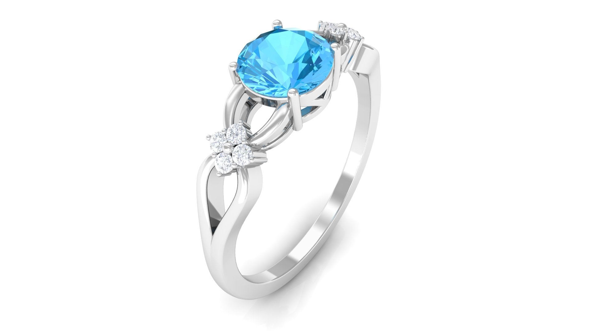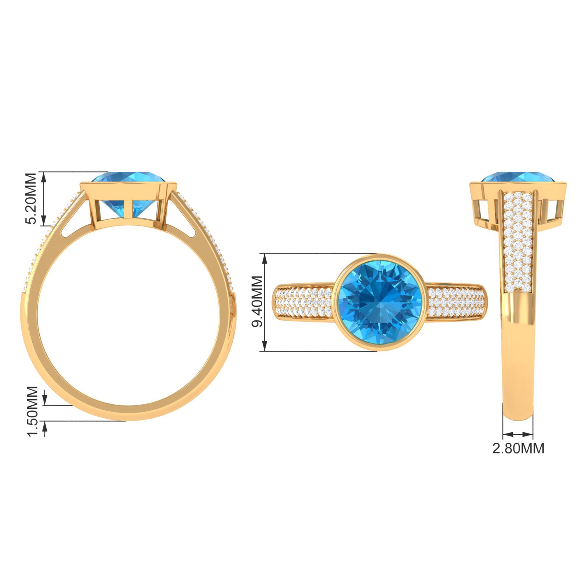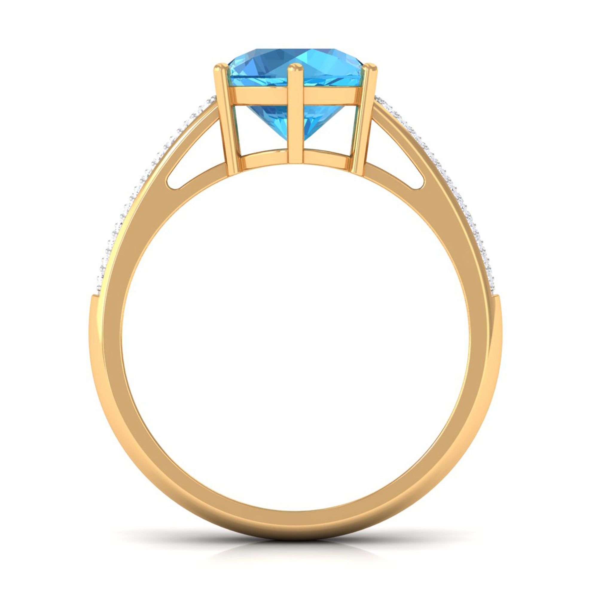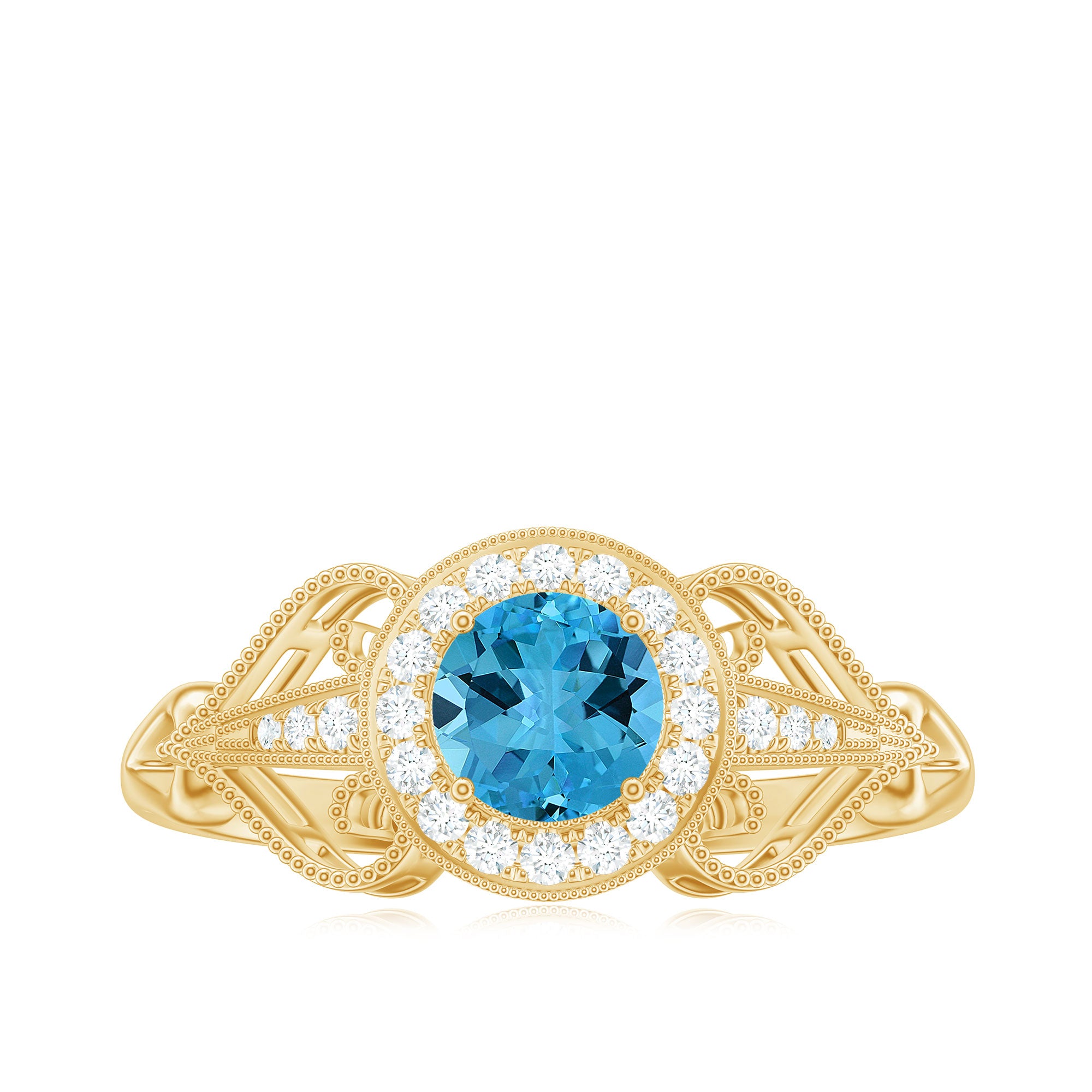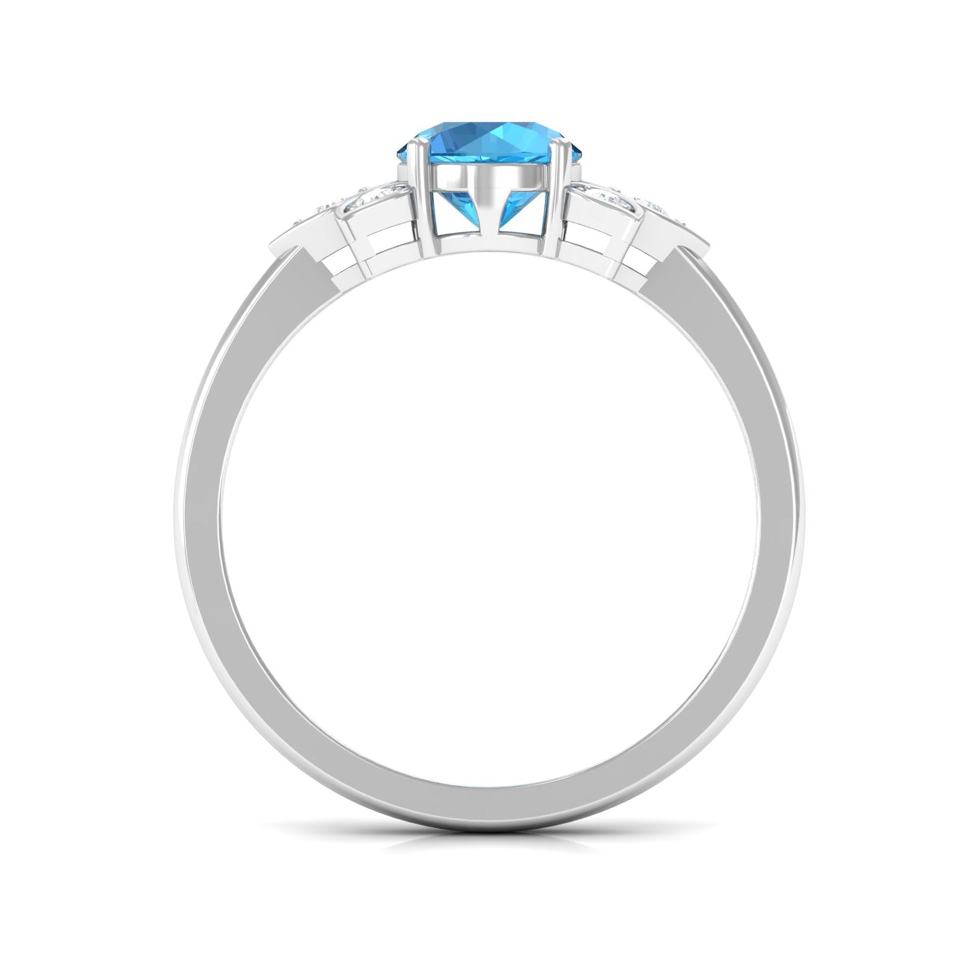The center-stone of Swiss Blue Topaz here is sparkled up with the encircling of Diamond/Moissanite (that we fondly term ‘Halo’). That makes the Swiss Blue Topaz appear even brighter while highlighting its beauty at its best. Surprisingly, it also gives off the illusion of a bigger Topaz. So, if a Swiss Blue Topaz and Diamond Ring is on your list, this style might turn out to be your best bet.