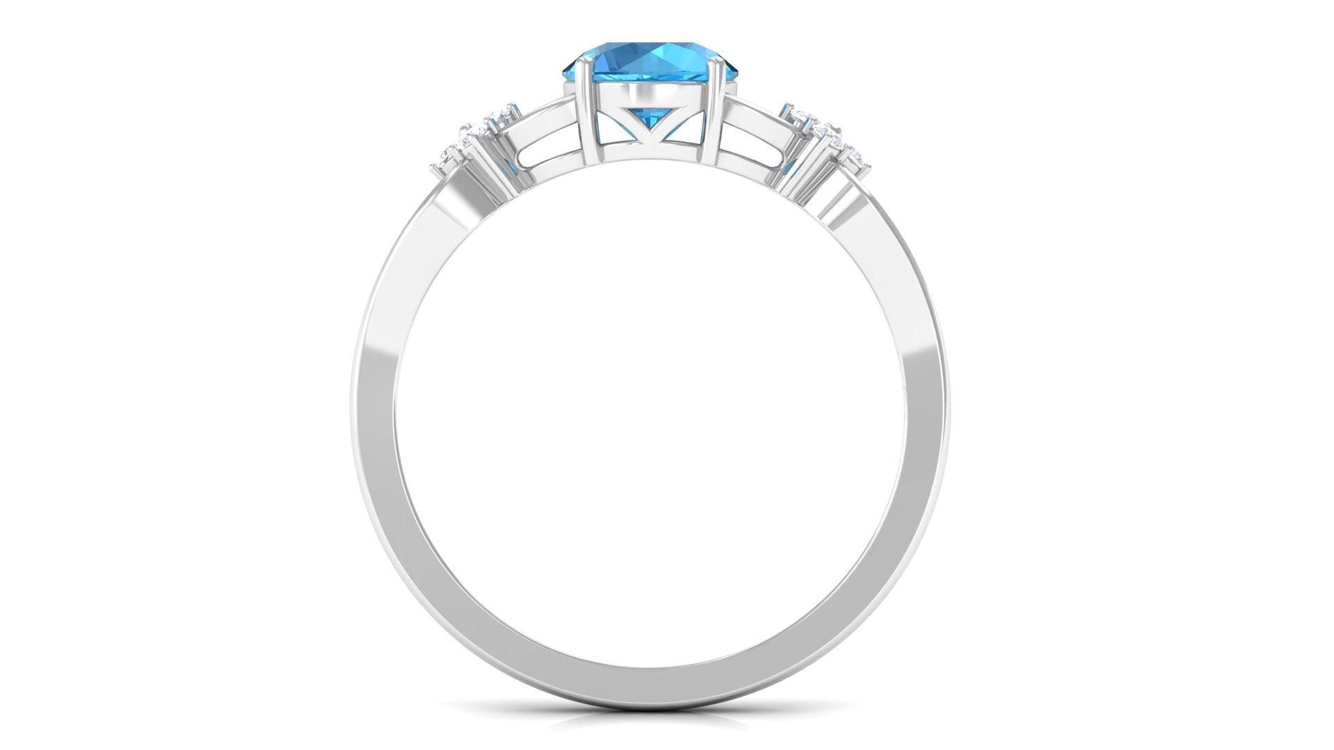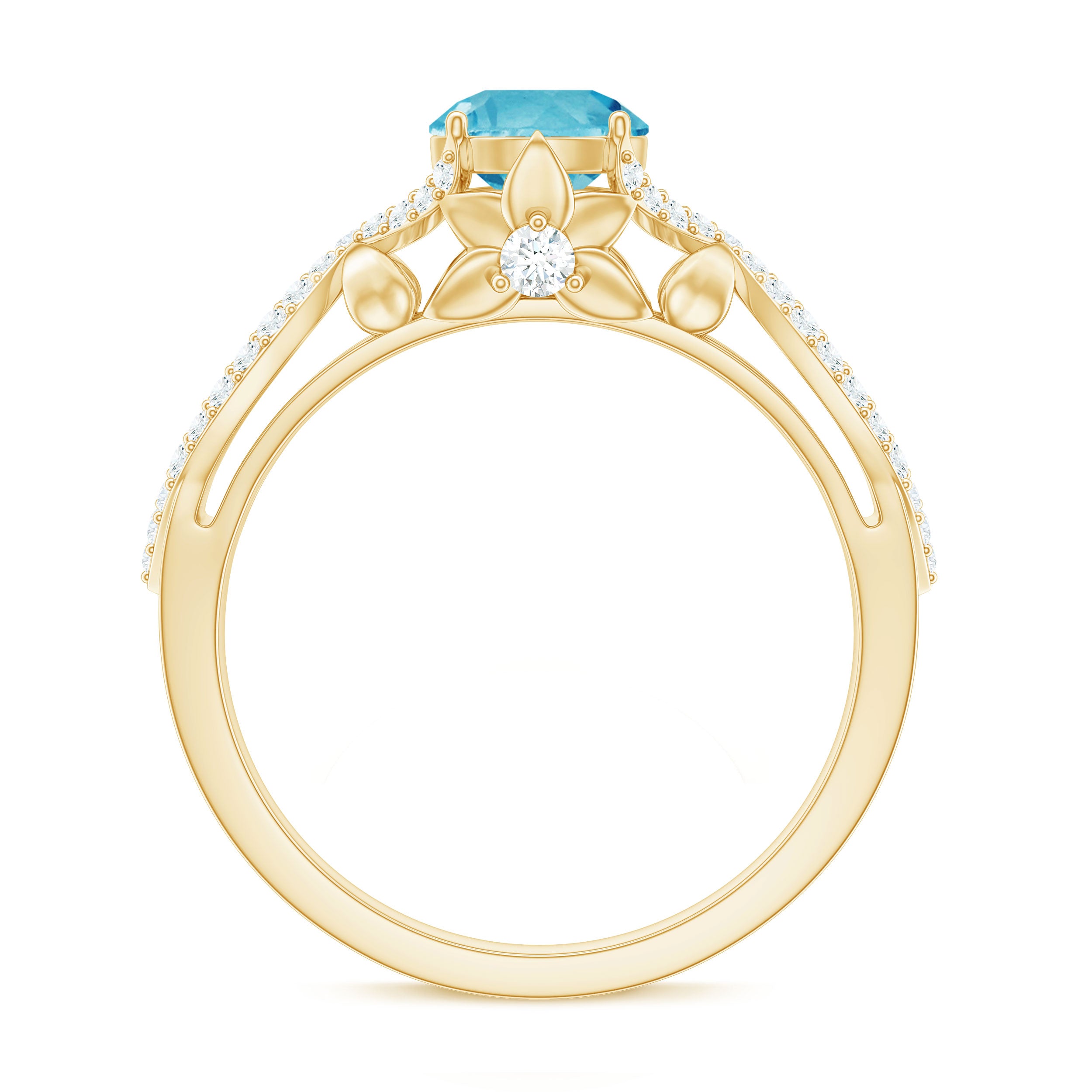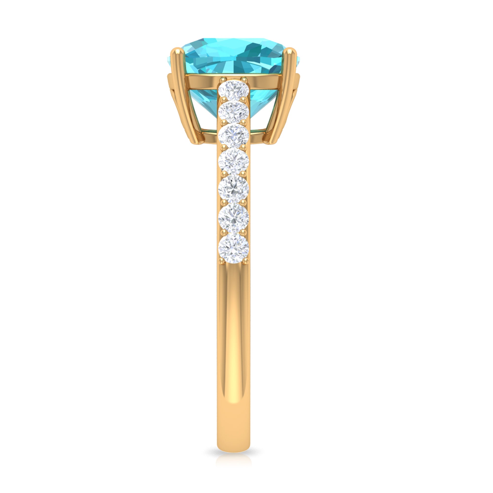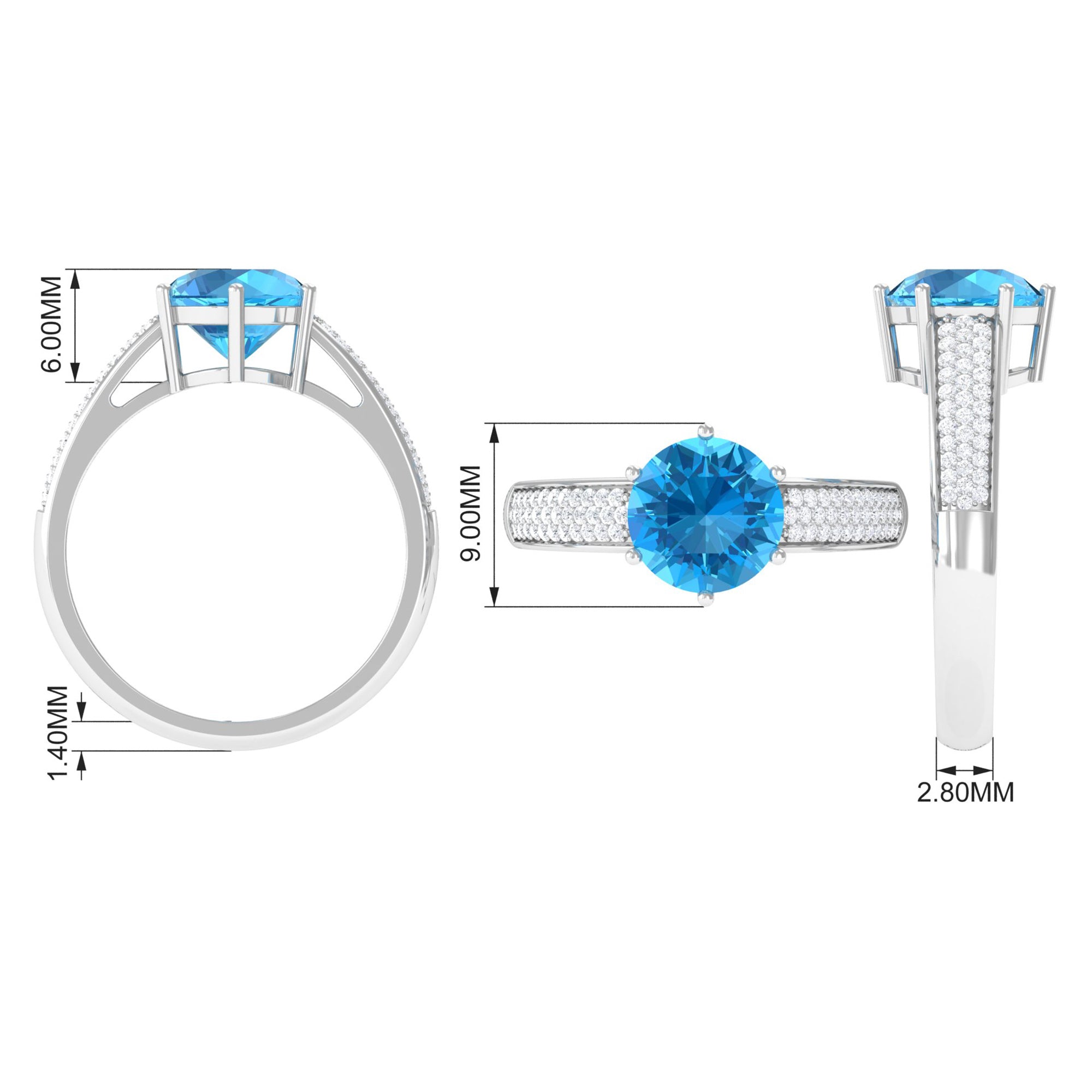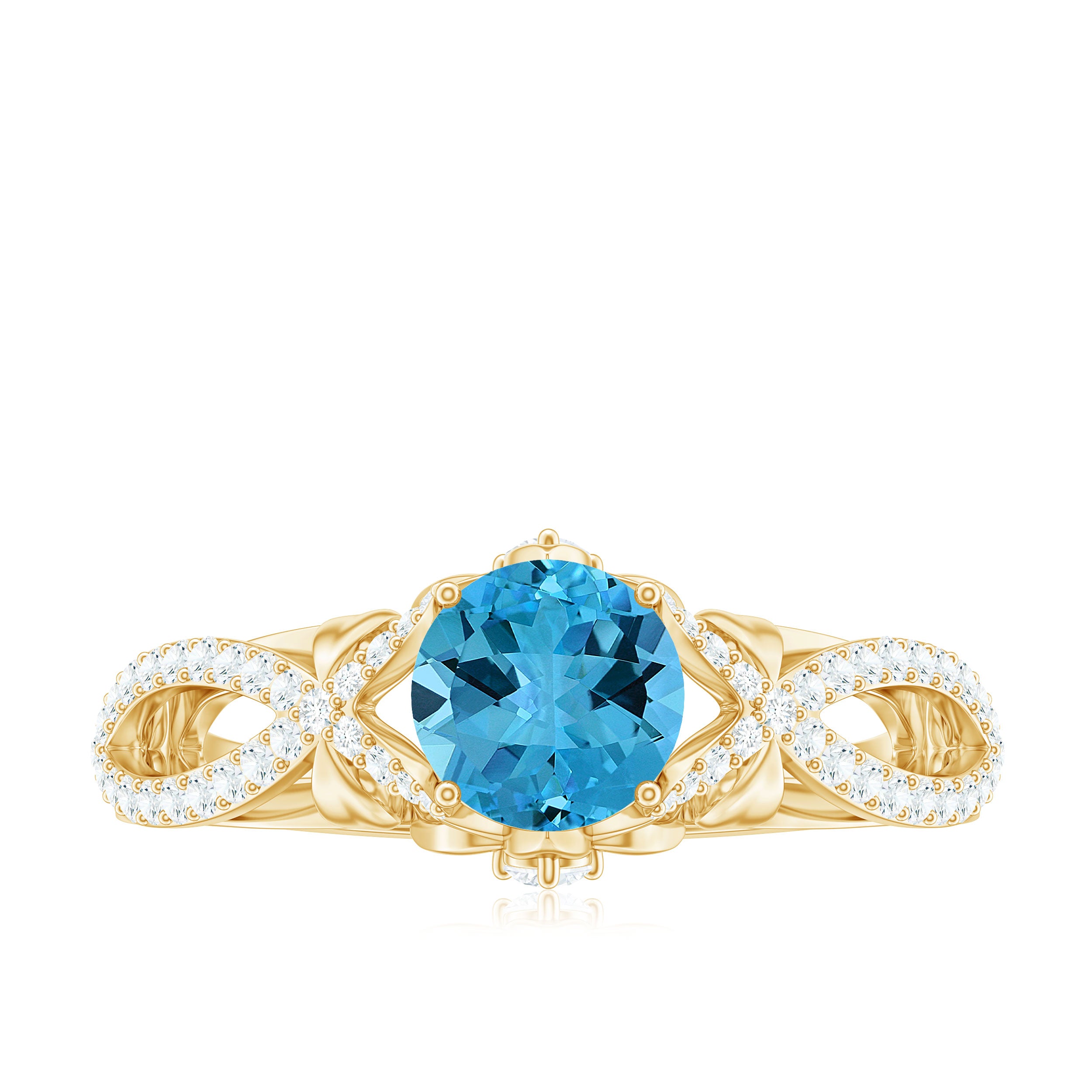 The center-stone of Swiss Blue Topaz here is sparkled up with the encircling of Diamond/Moissanite (that we fondly term ‘Halo’). That makes the Swiss Blue Topaz appear even brighter while highlighting its beauty at its best. Surprisingly, it also gives off the illusion of a bigger Topaz. So, if a Swiss Blue Topaz and Diamond Ring is on your list, this style might turn out to be your best bet.