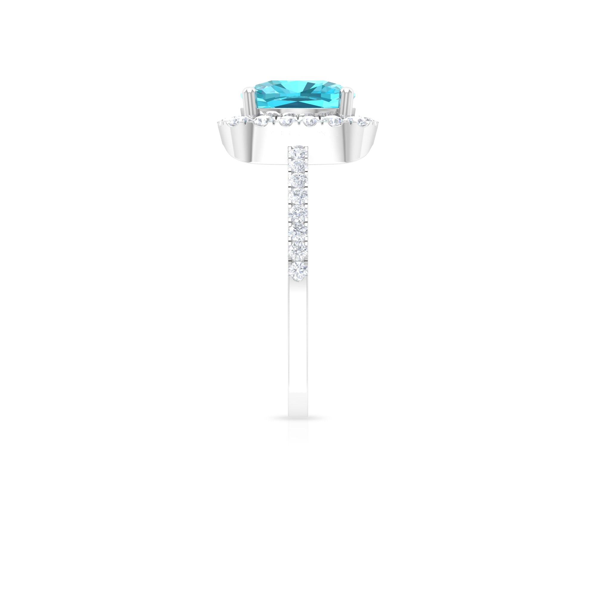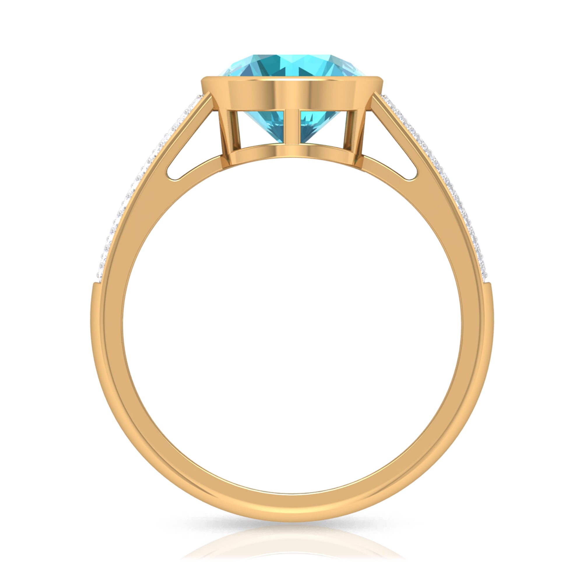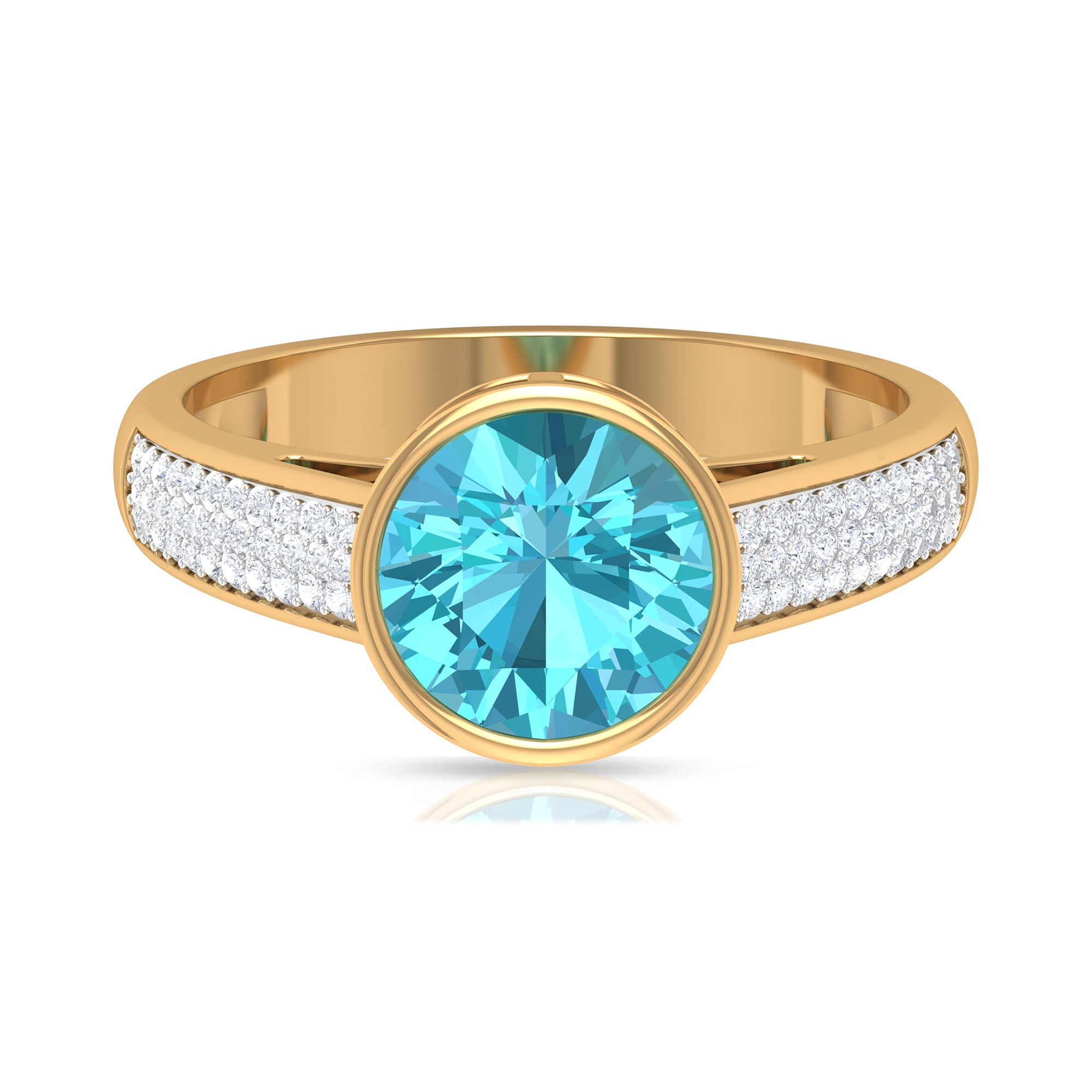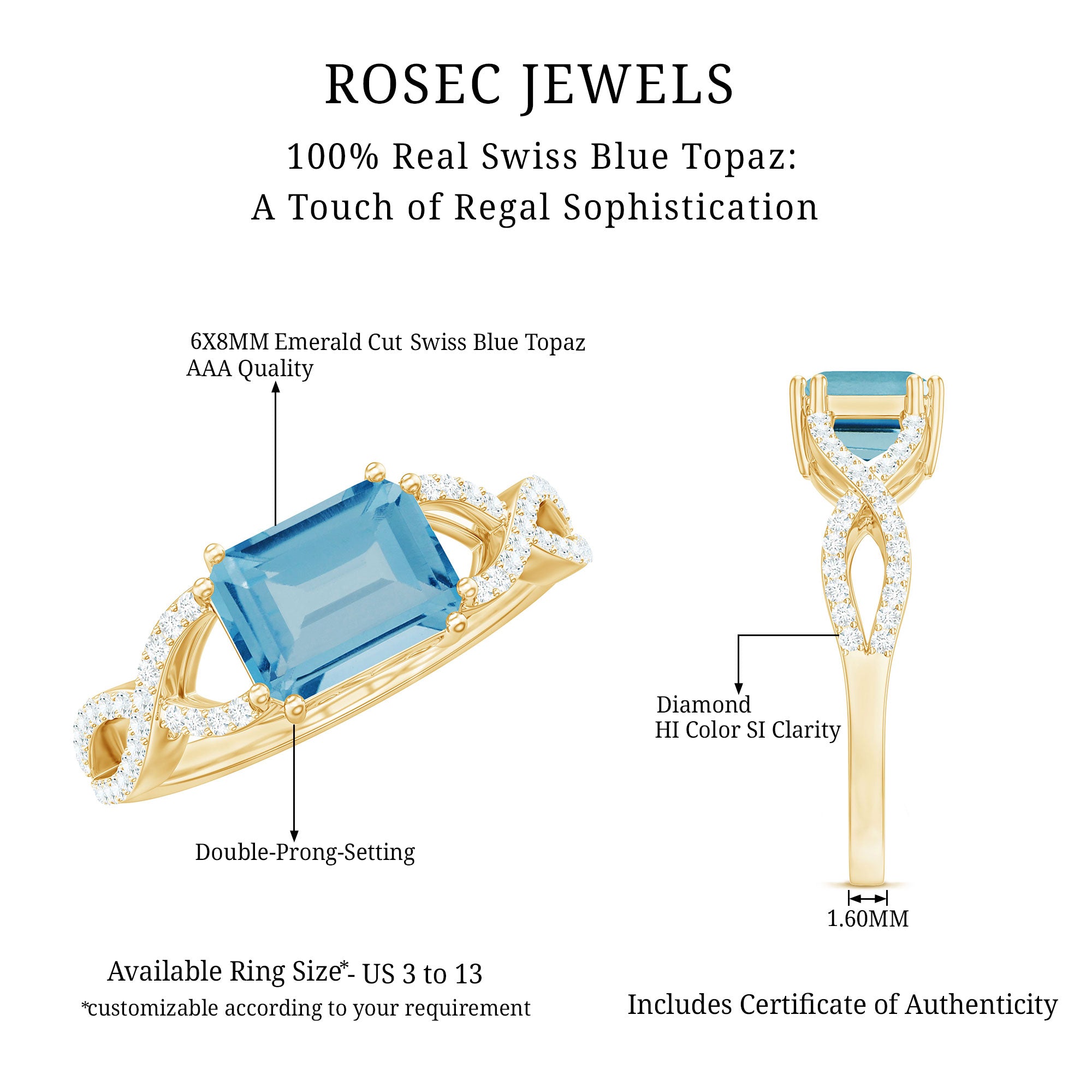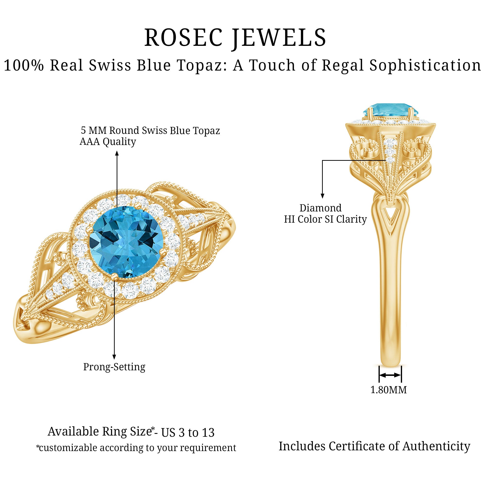 The center-stone of Swiss Blue Topaz here is sparkled up with the encircling of Diamond/Moissanite (that we fondly term ‘Halo’). That makes the Swiss Blue Topaz appear even brighter while highlighting its beauty at its best. Surprisingly, it also gives off the illusion of a bigger Topaz. So, if a Swiss Blue Topaz and Diamond Ring is on your list, this style might turn out to be your best bet.
