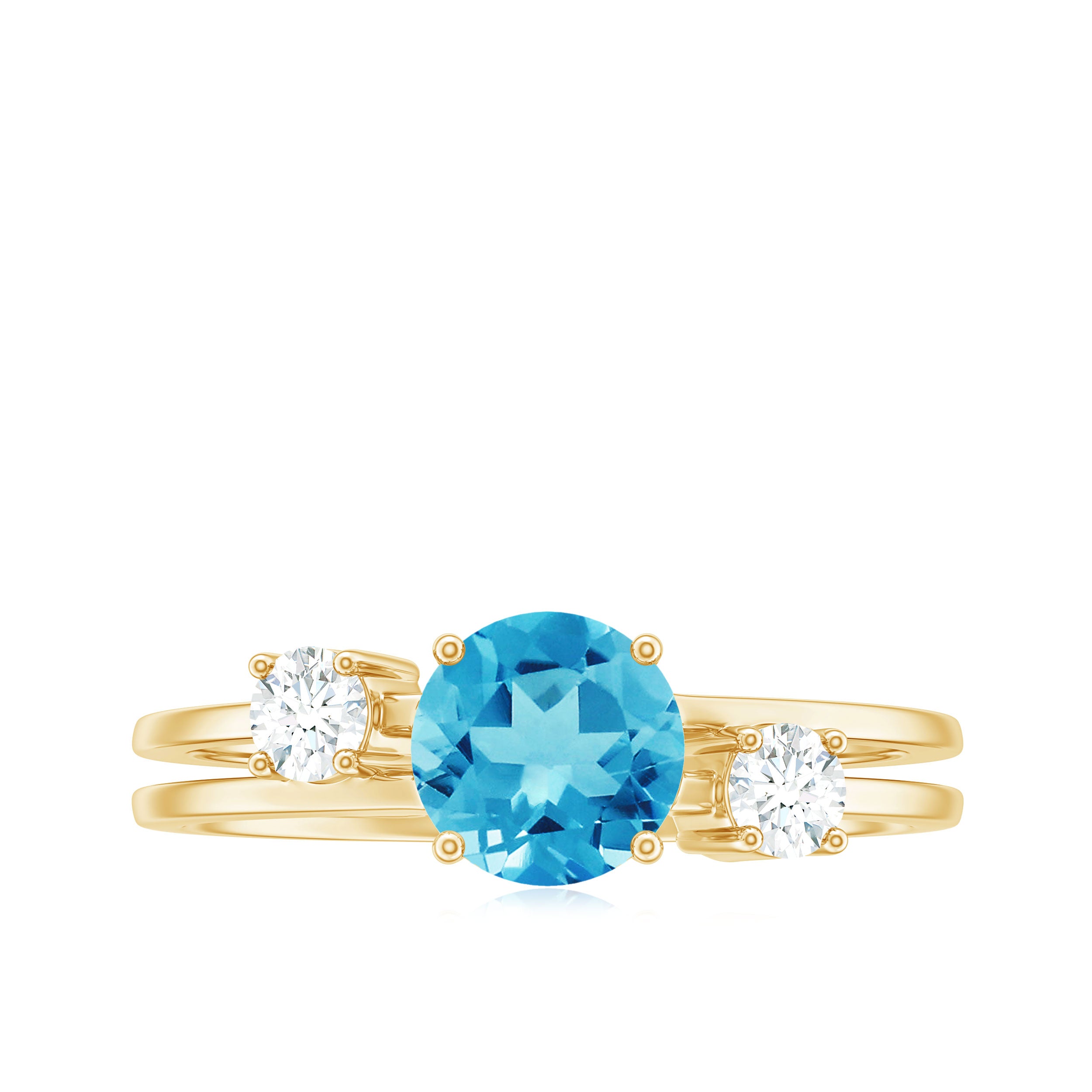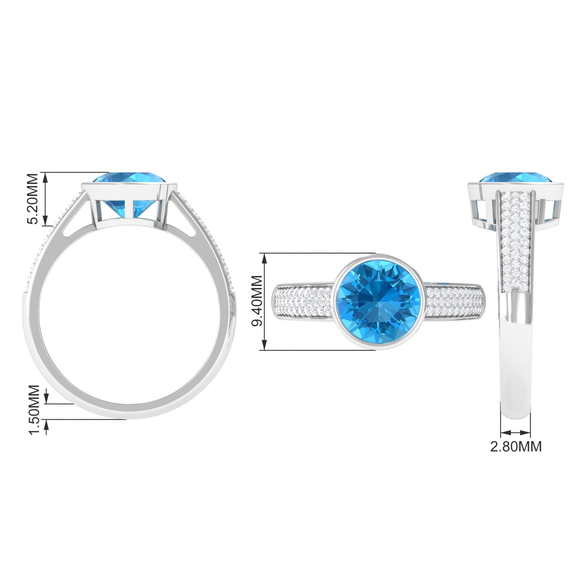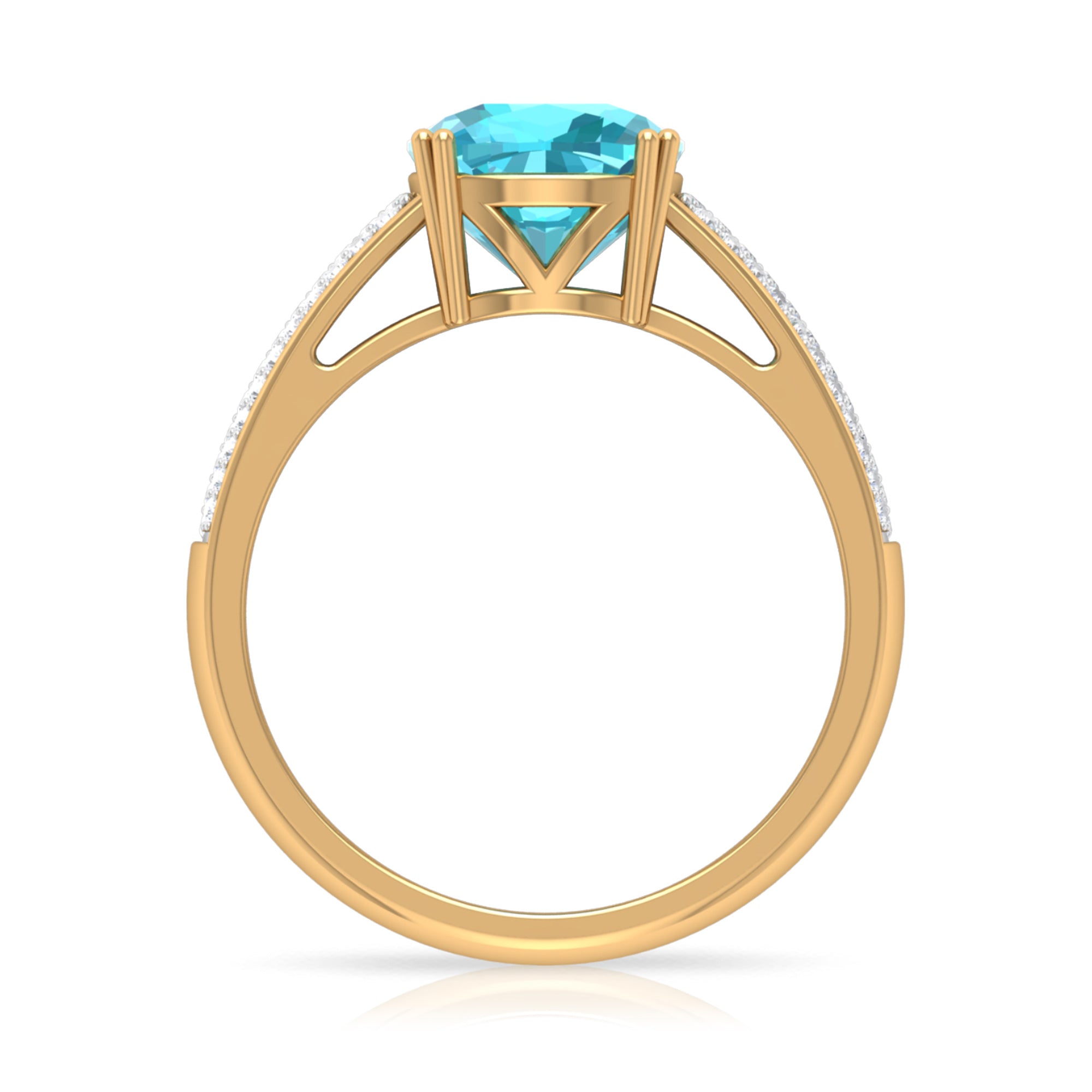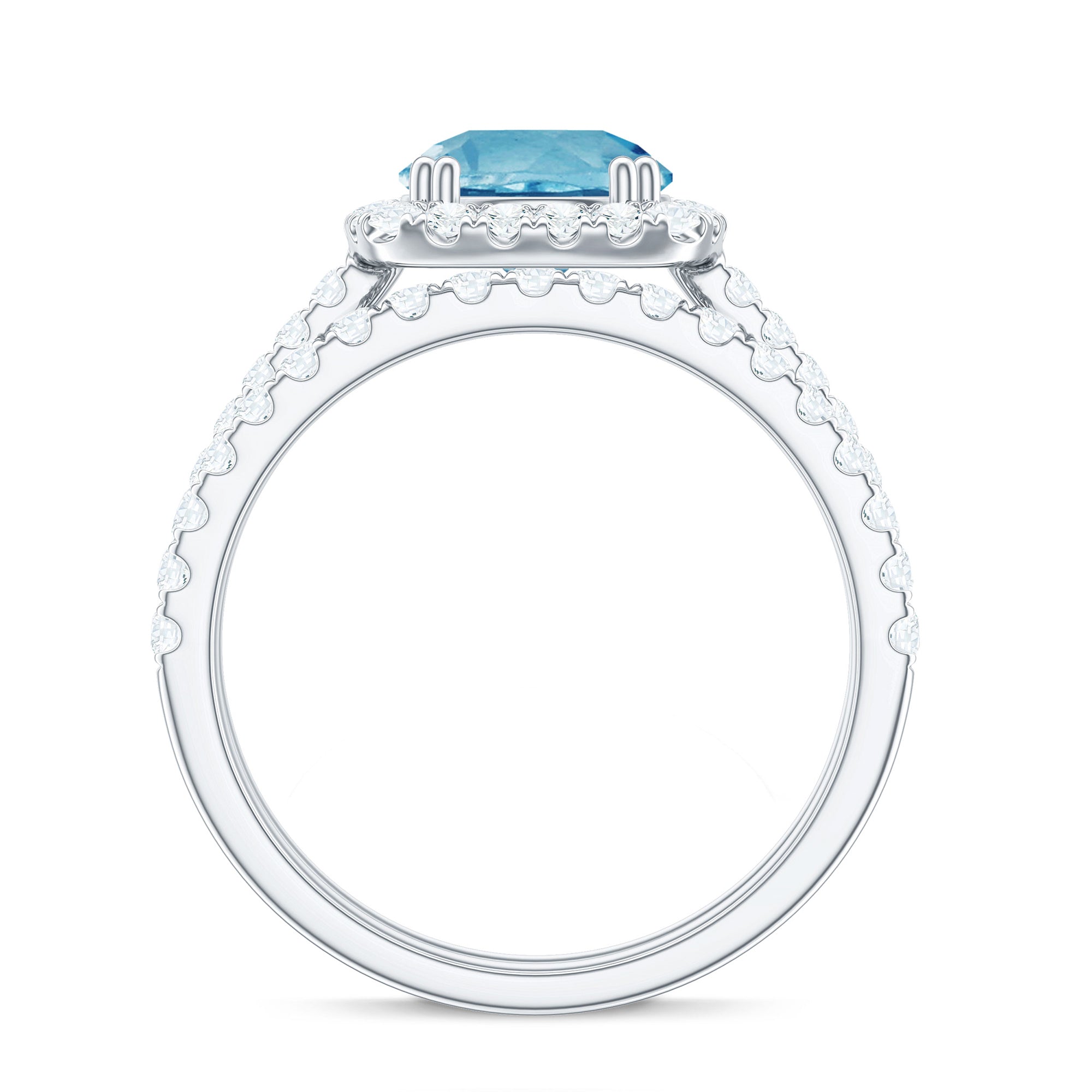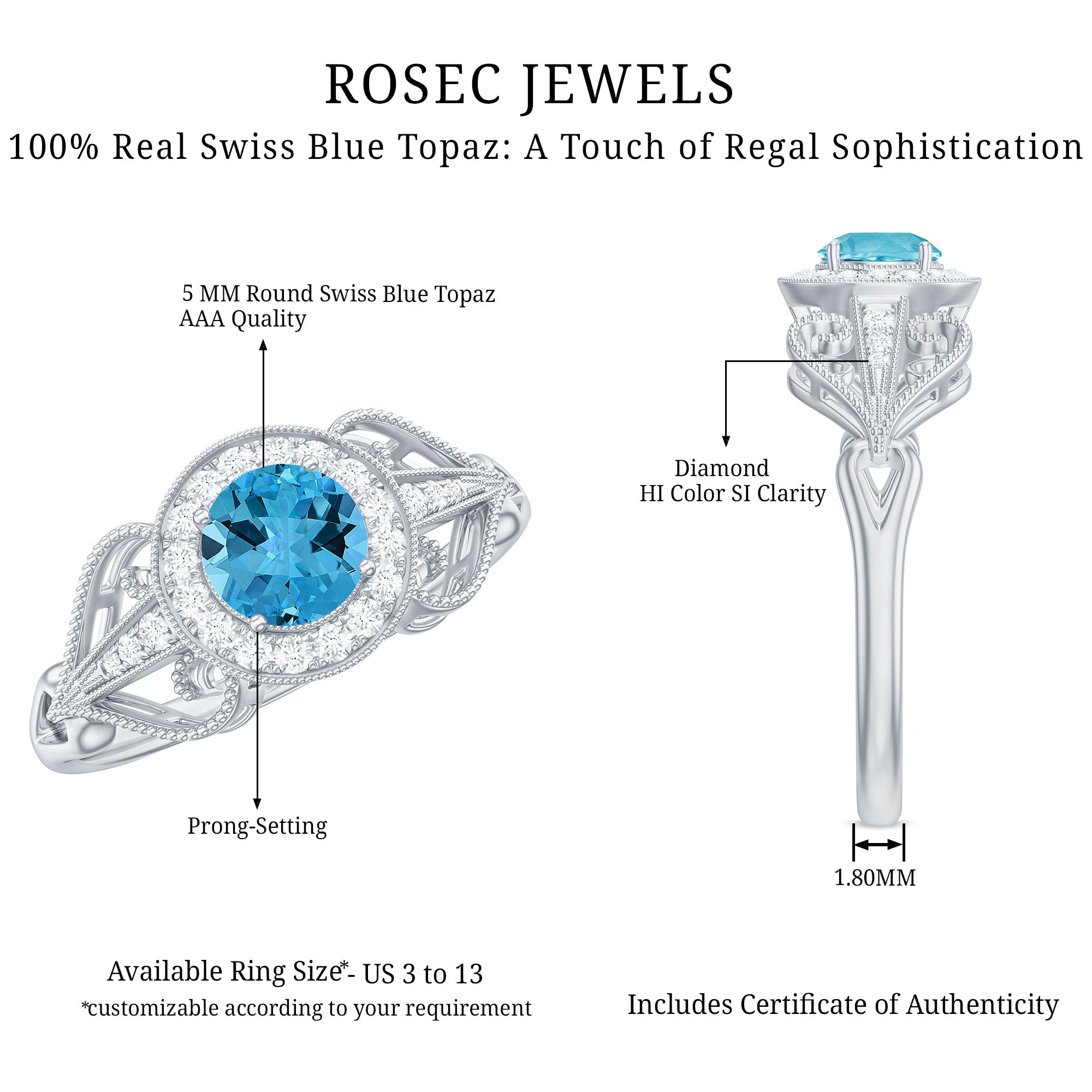 The center-stone of Swiss Blue Topaz here is sparkled up with the encircling of Diamond/Moissanite (that we fondly term ‘Halo’). That makes the Swiss Blue Topaz appear even brighter while highlighting its beauty at its best. Surprisingly, it also gives off the illusion of a bigger Topaz. So, if a Swiss Blue Topaz and Diamond Ring is on your list, this style might turn out to be your best bet.