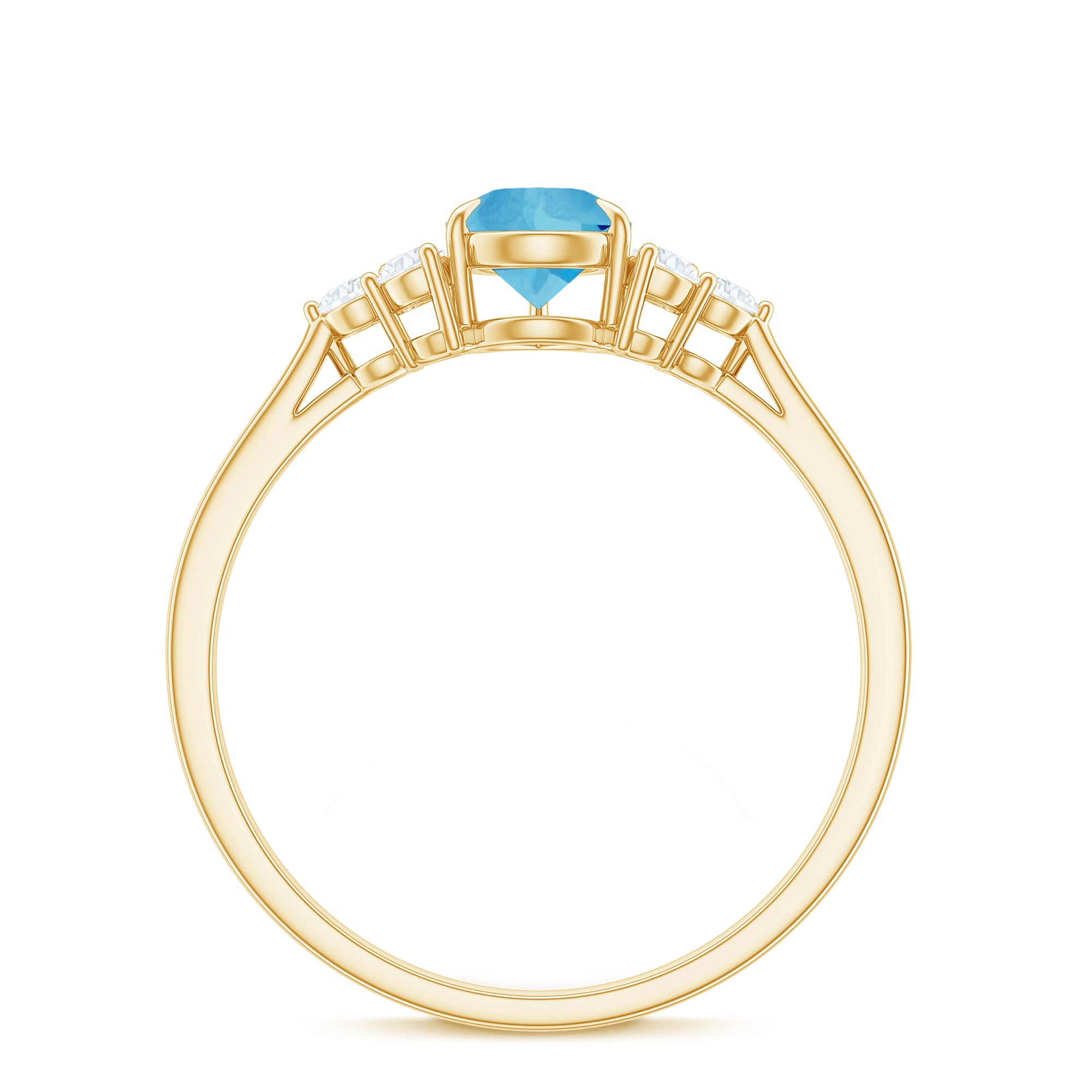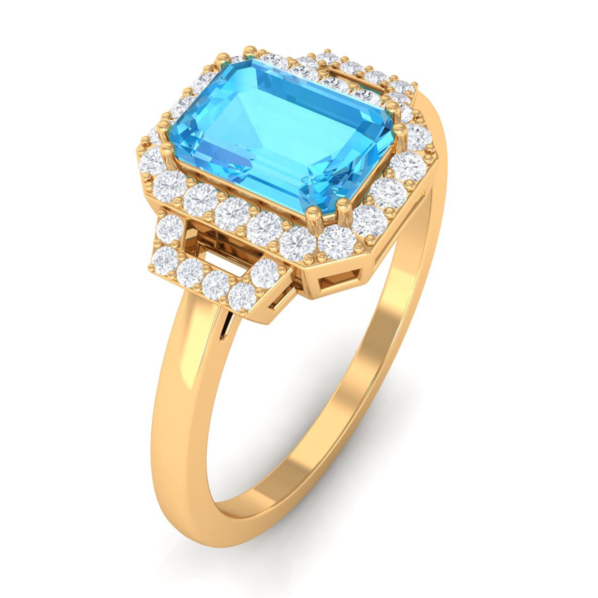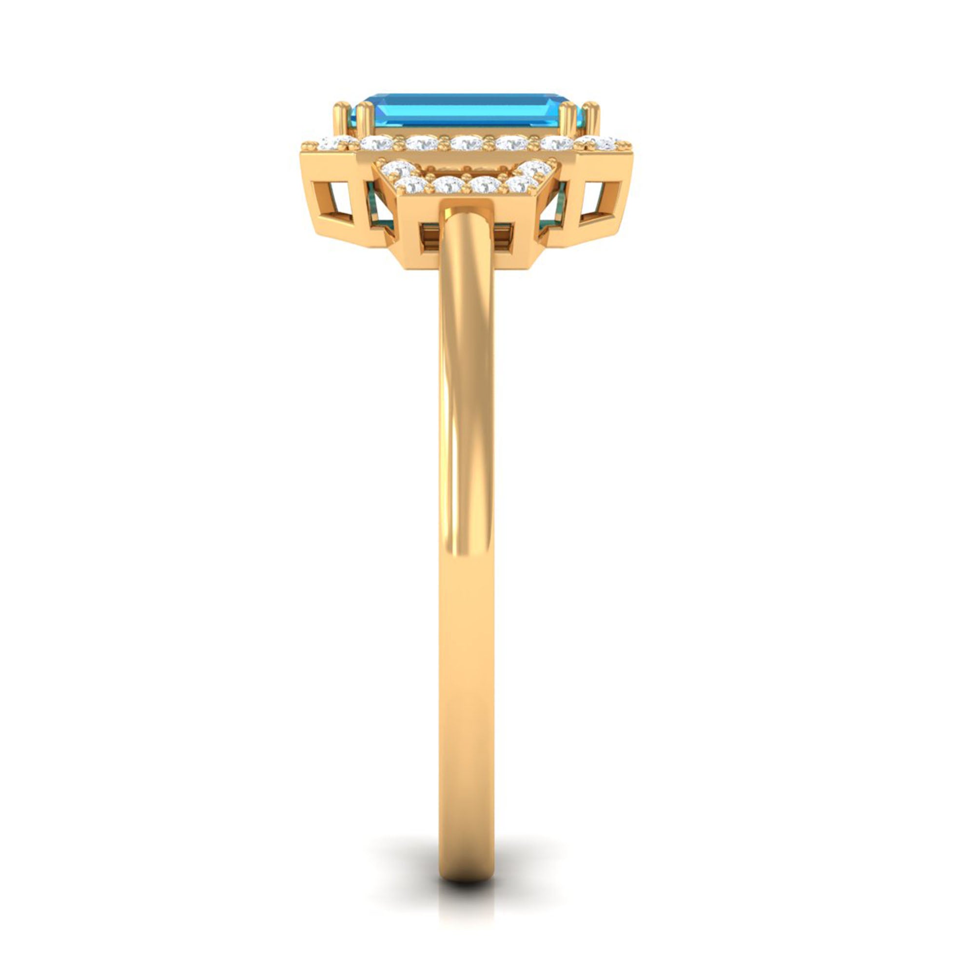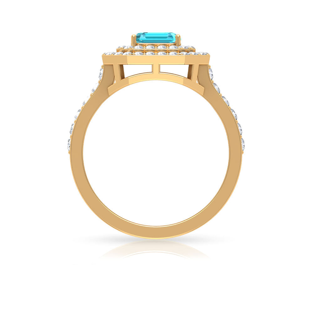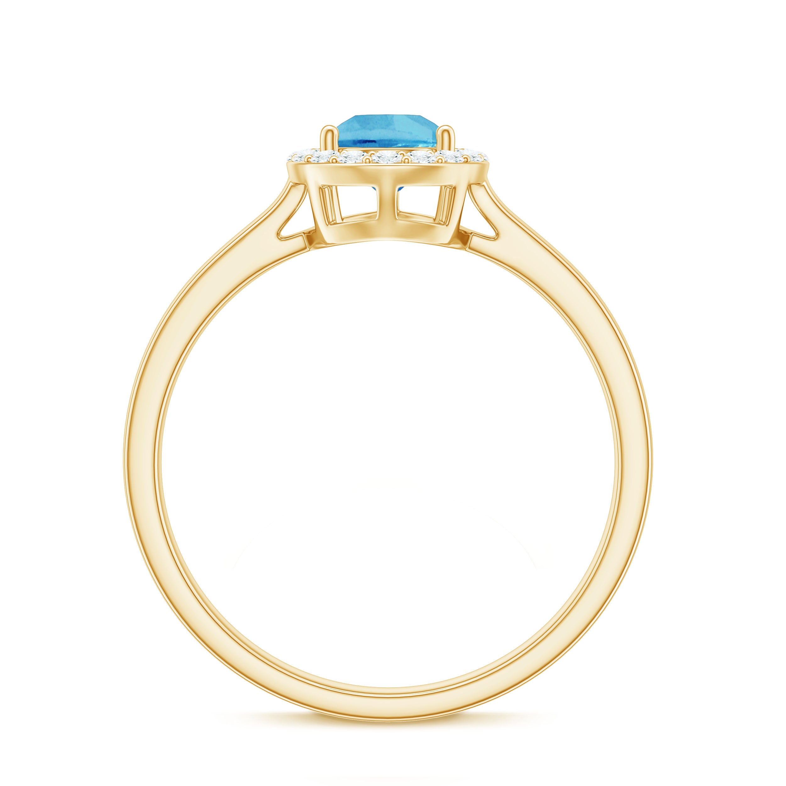 The center-stone of Swiss Blue Topaz here is sparkled up with the encircling of Diamond/Moissanite (that we fondly term ‘Halo’). That makes the Swiss Blue Topaz appear even brighter while highlighting its beauty at its best. Surprisingly, it also gives off the illusion of a bigger Topaz. So, if a Swiss Blue Topaz and Diamond Ring is on your list, this style might turn out to be your best bet.