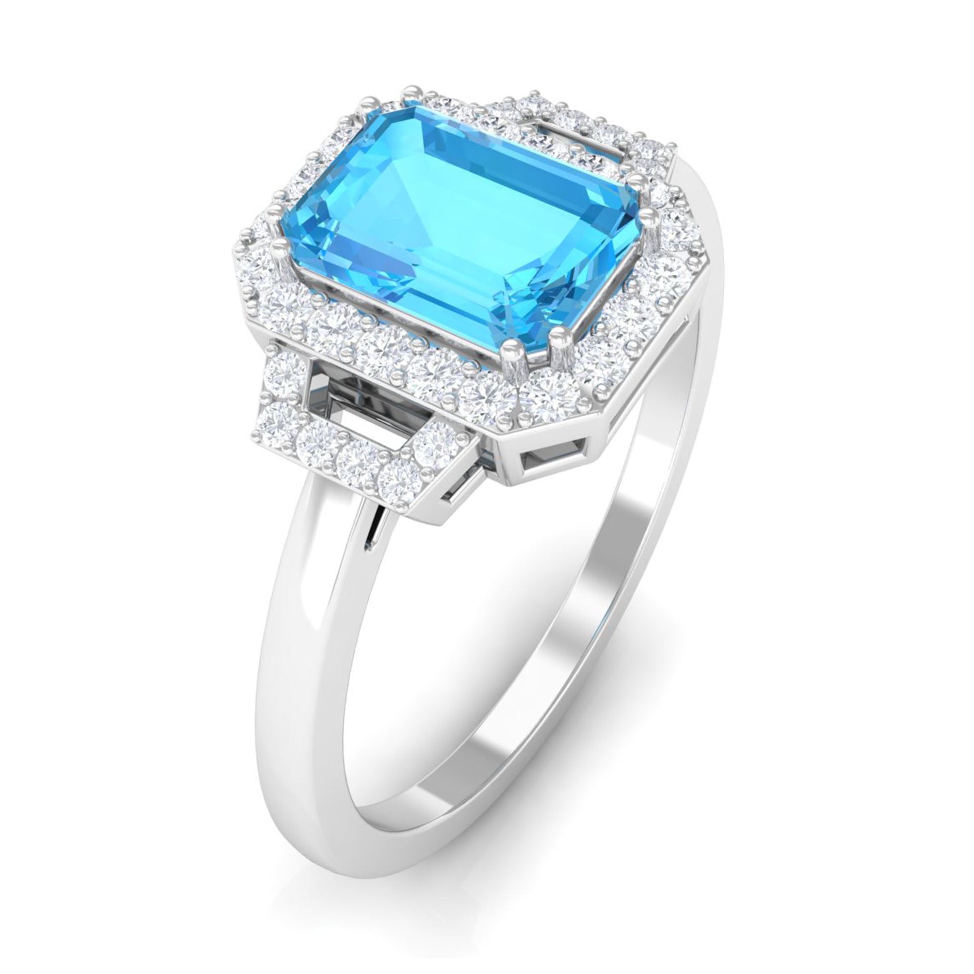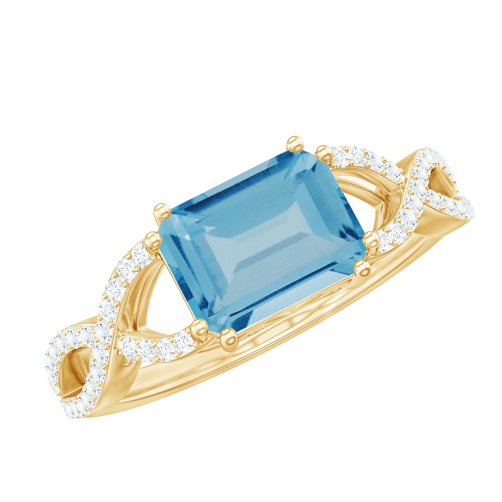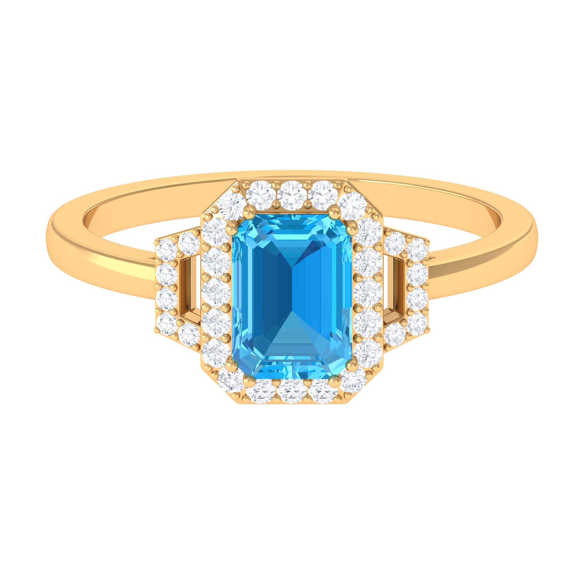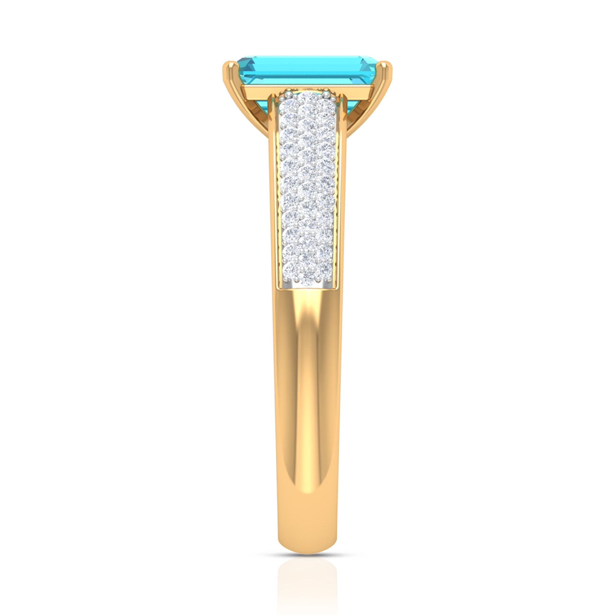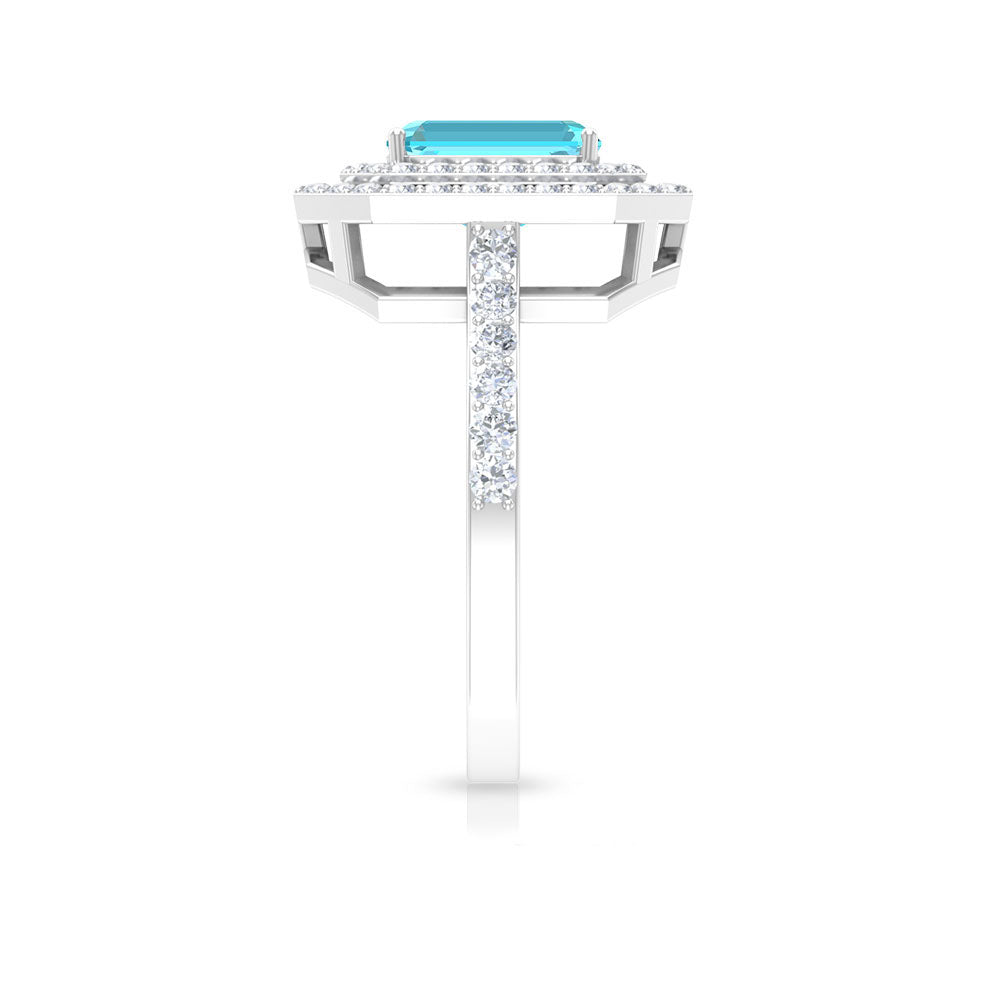 The center-stone of Swiss Blue Topaz here is sparkled up with the encircling of Diamond/Moissanite (that we fondly term ‘Halo’). That makes the Swiss Blue Topaz appear even brighter while highlighting its beauty at its best. Surprisingly, it also gives off the illusion of a bigger Topaz. So, if a Swiss Blue Topaz and Diamond Ring is on your list, this style might turn out to be your best bet.