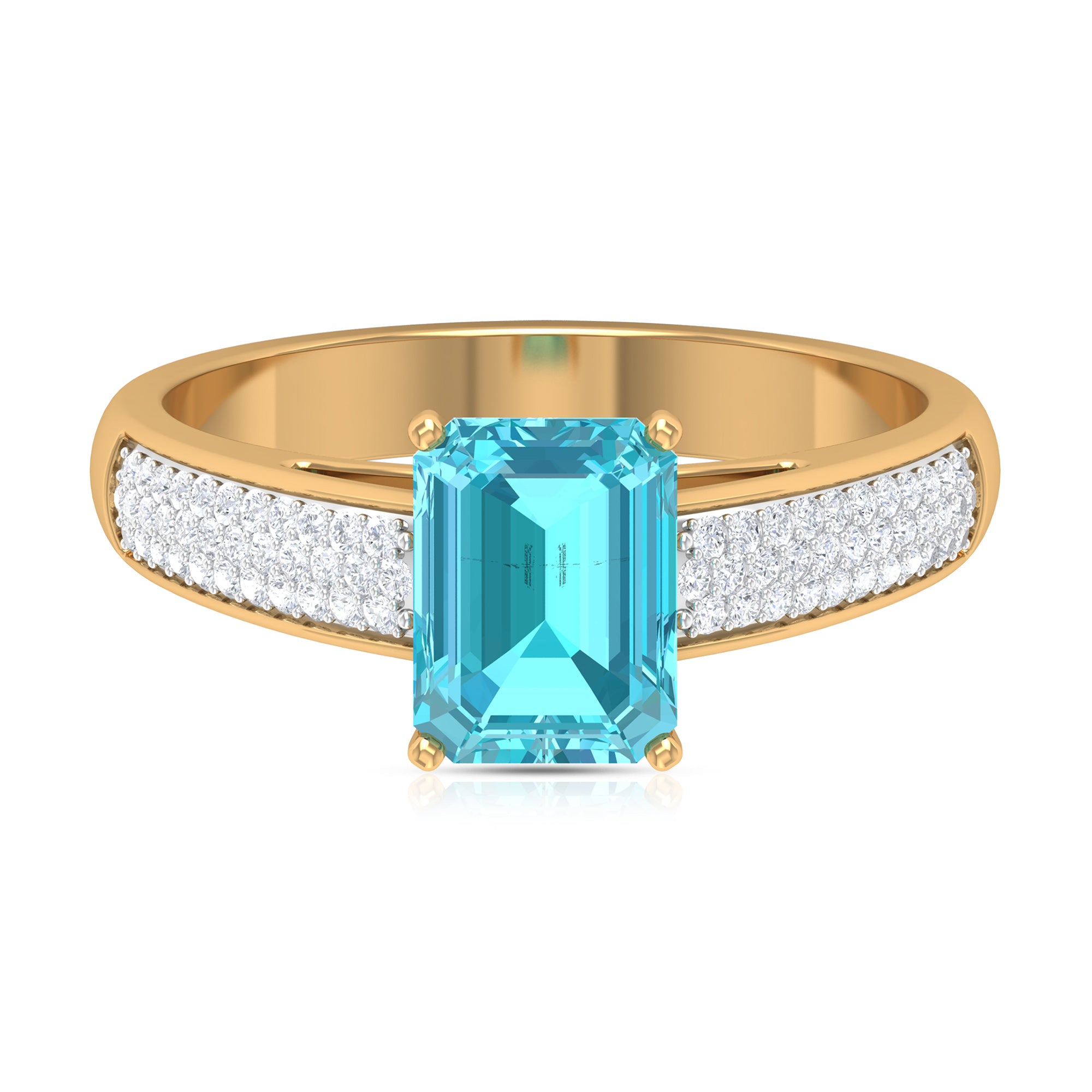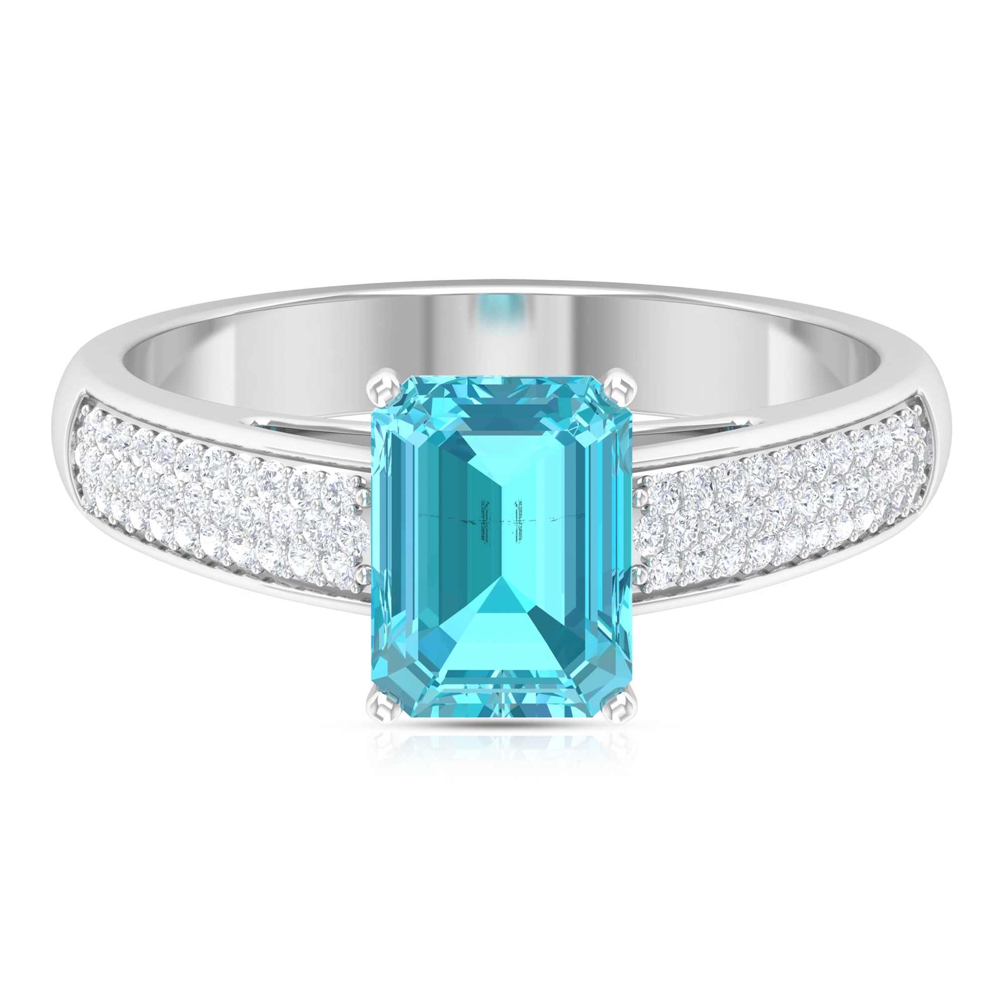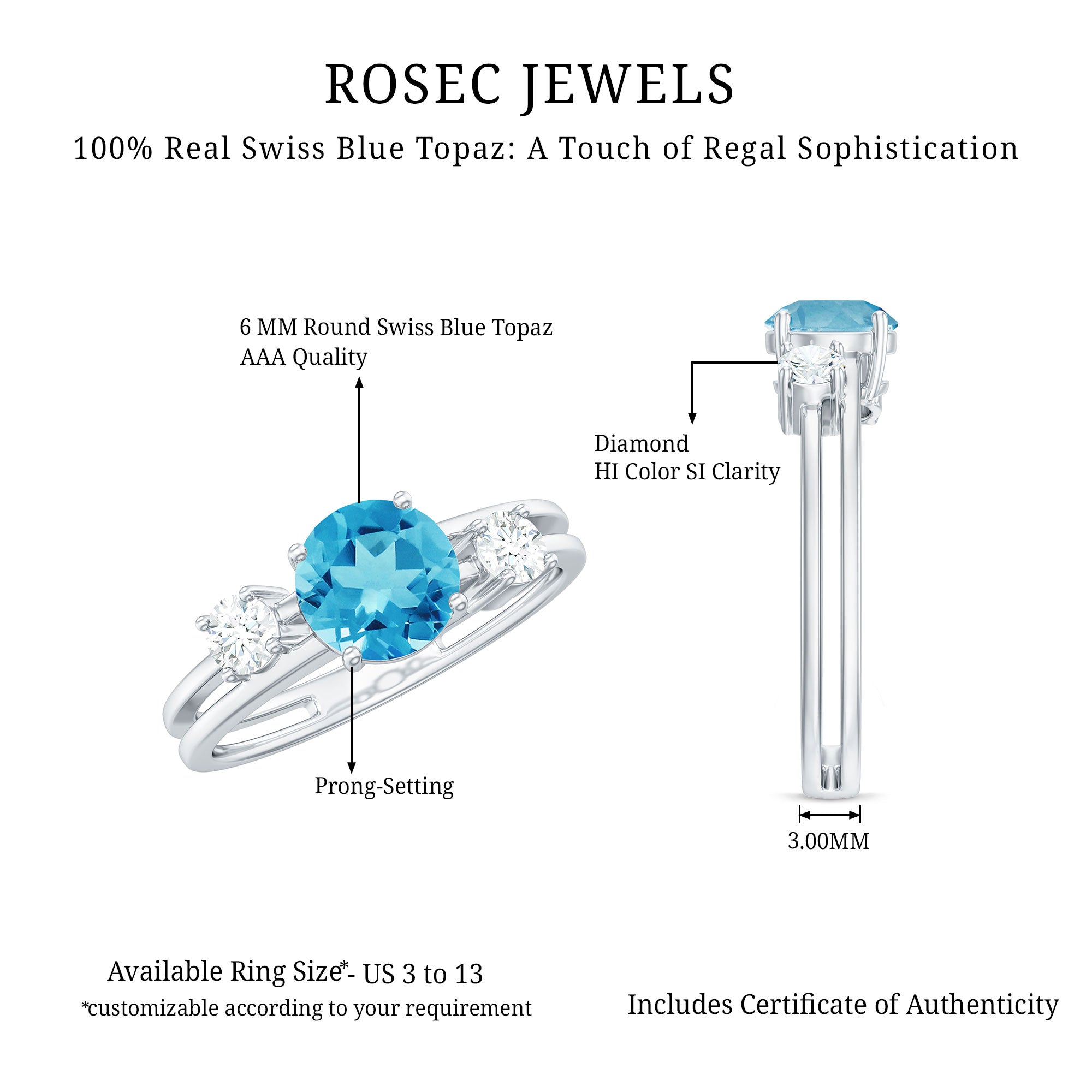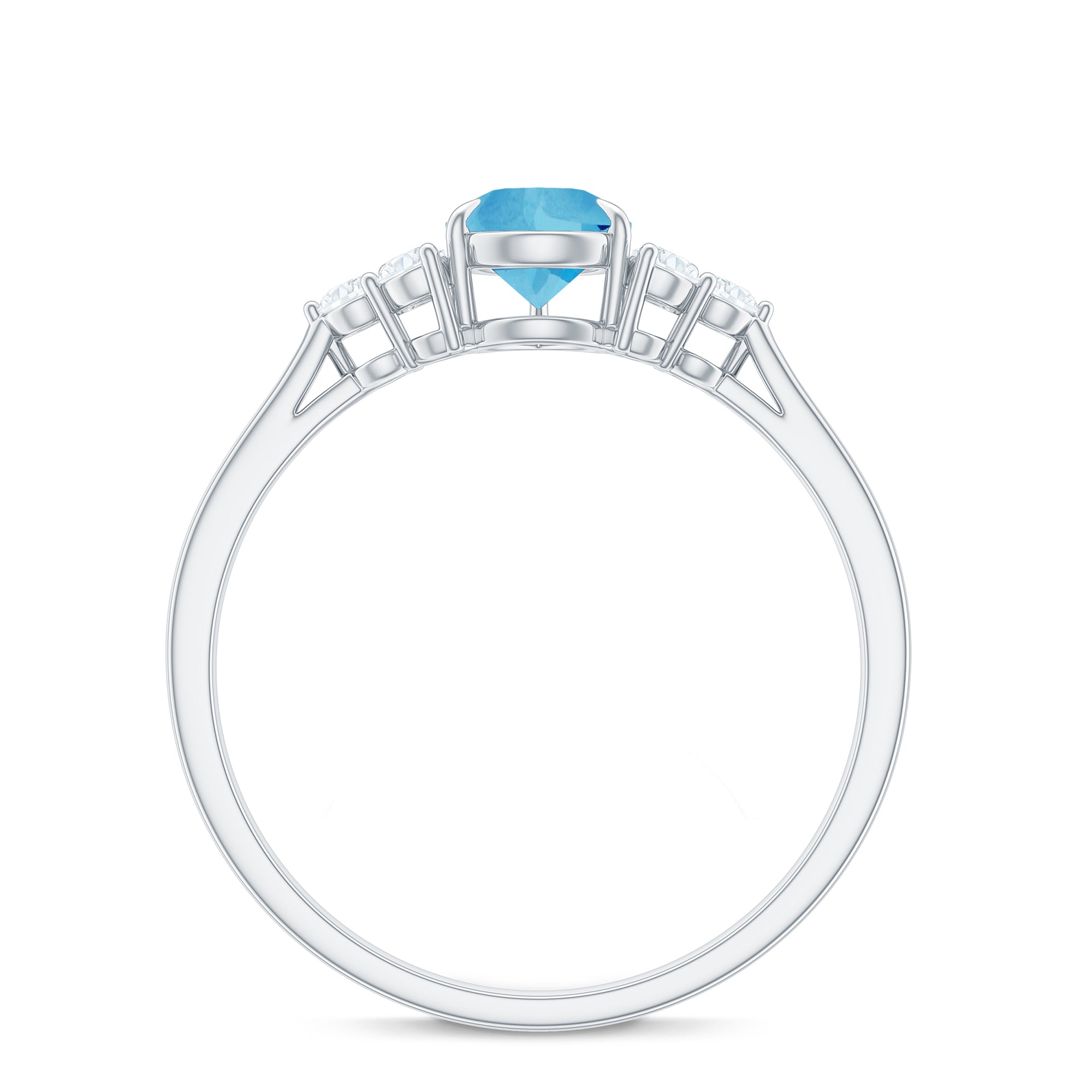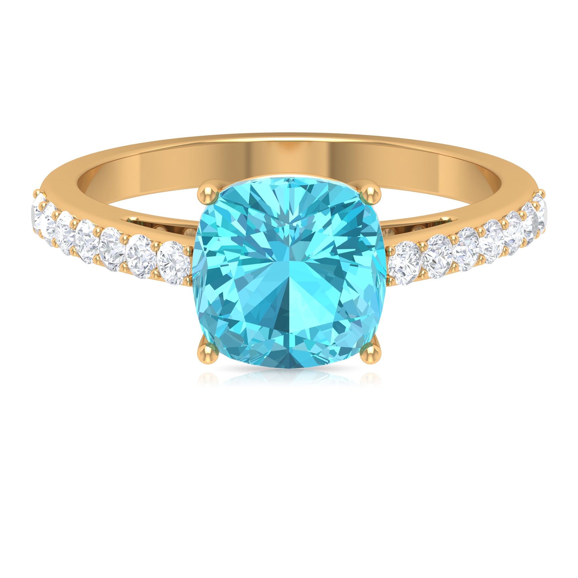 The center-stone of Swiss Blue Topaz here is sparkled up with the encircling of Diamond/Moissanite (that we fondly term ‘Halo’). That makes the Swiss Blue Topaz appear even brighter while highlighting its beauty at its best. Surprisingly, it also gives off the illusion of a bigger Topaz. So, if a Swiss Blue Topaz and Diamond Ring is on your list, this style might turn out to be your best bet.