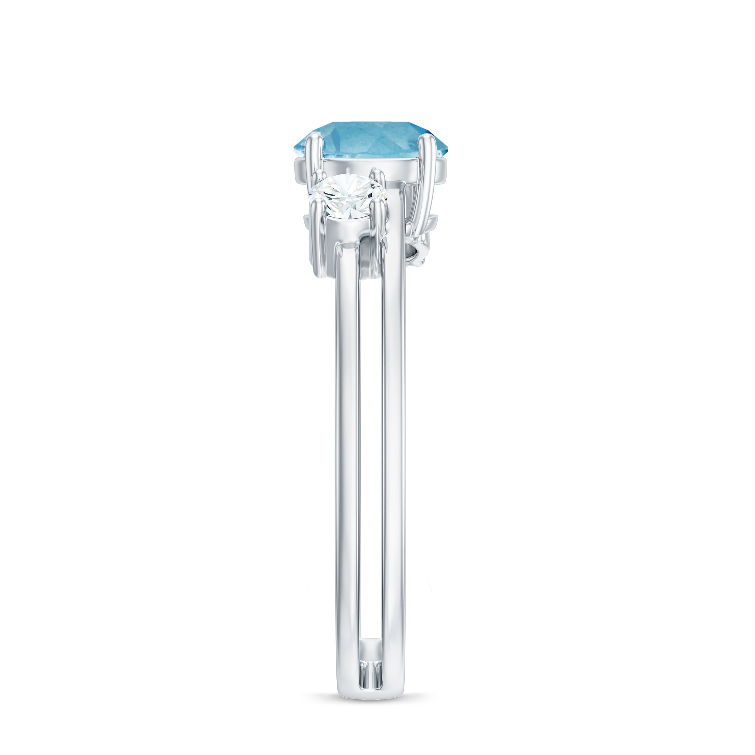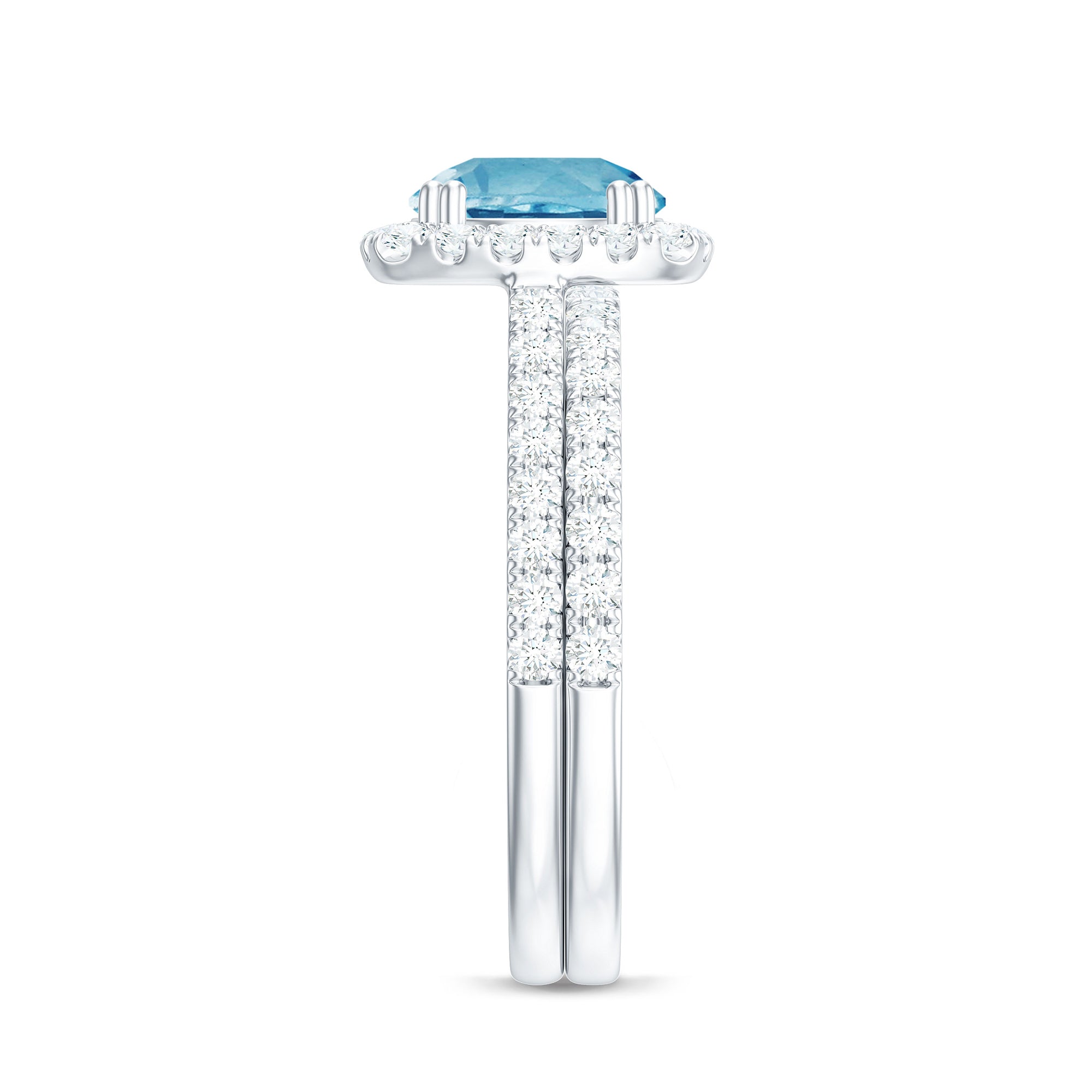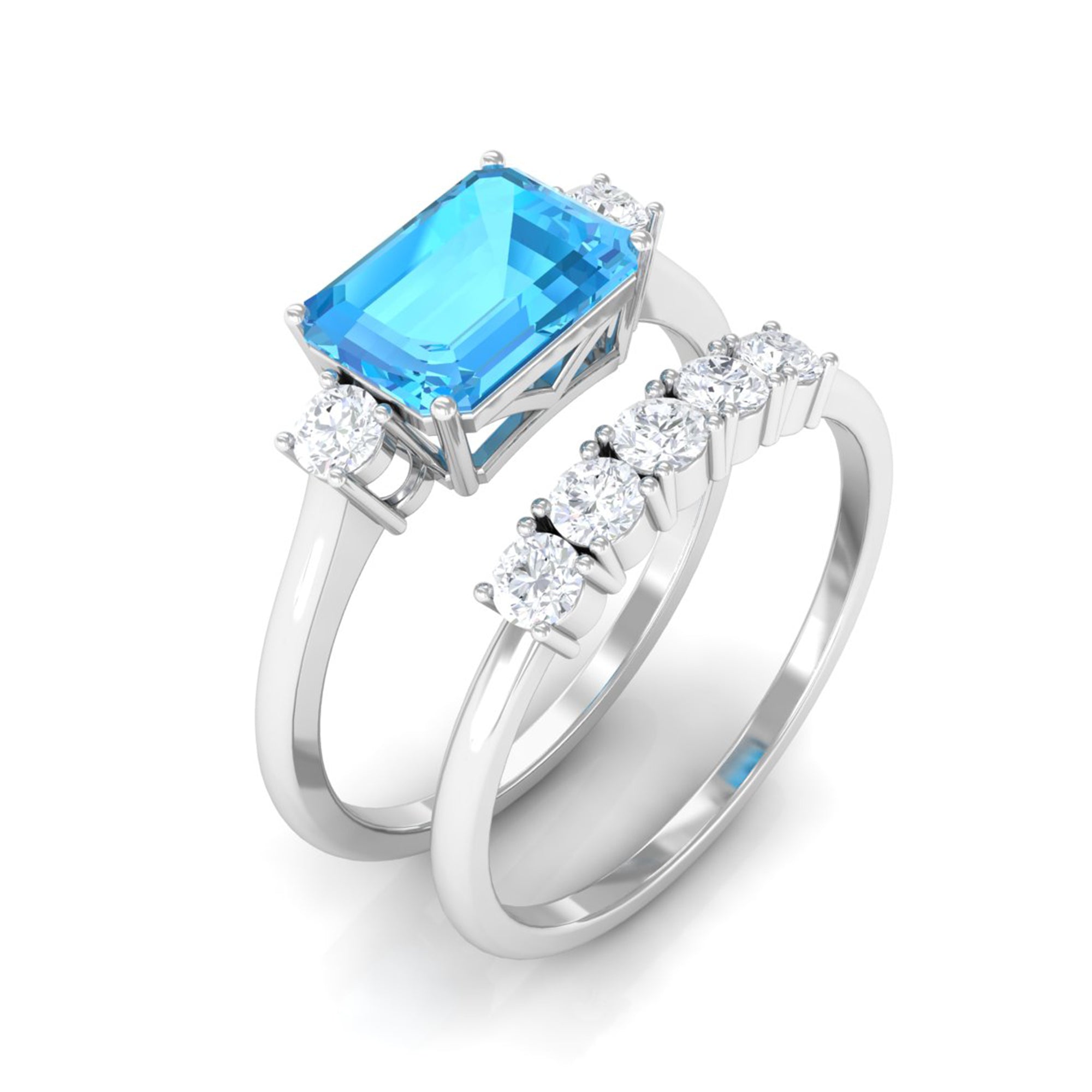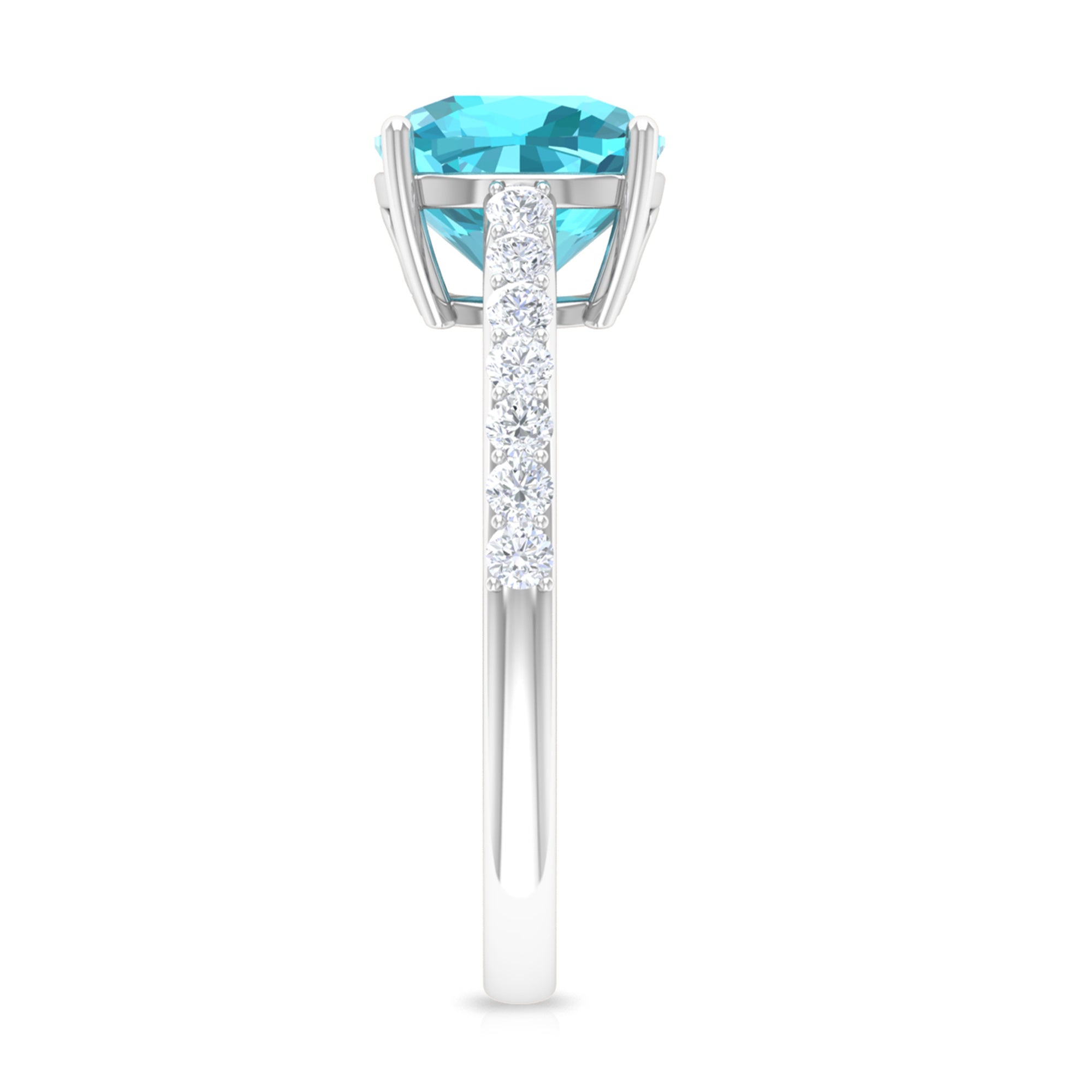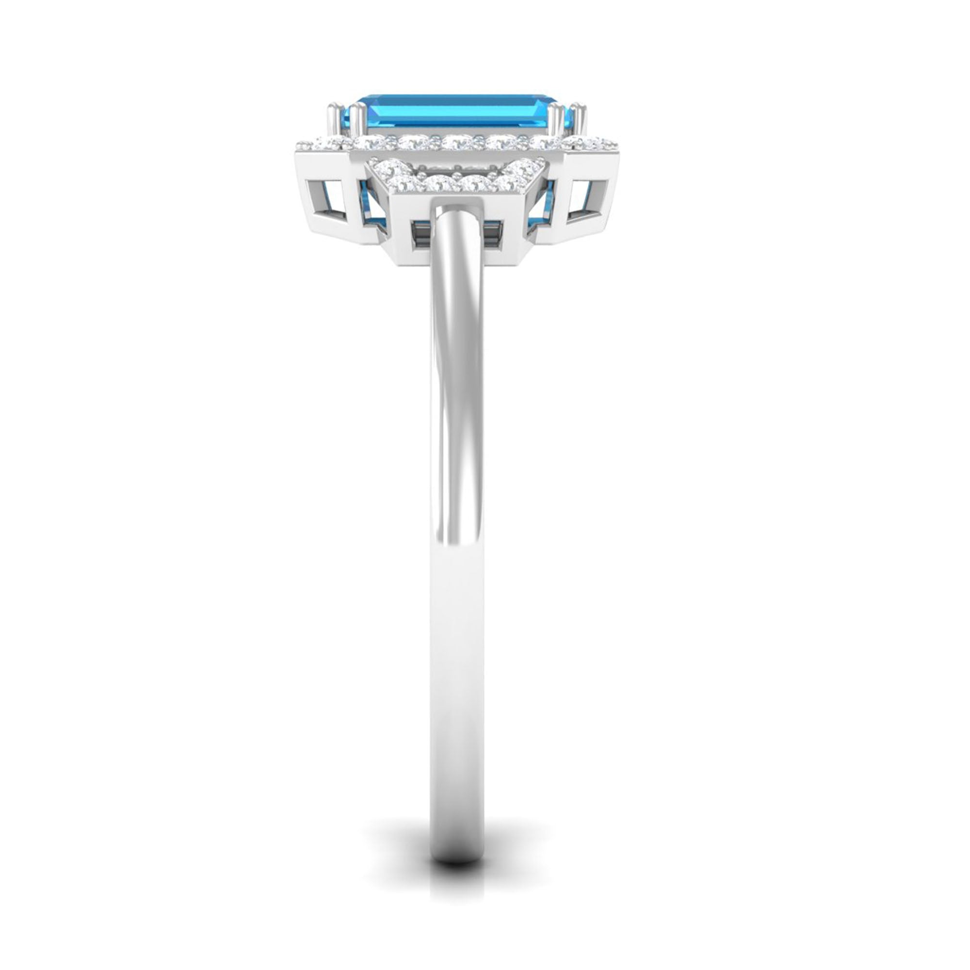 The center-stone of Swiss Blue Topaz here is sparkled up with the encircling of Diamond/Moissanite (that we fondly term ‘Halo’). That makes the Swiss Blue Topaz appear even brighter while highlighting its beauty at its best. Surprisingly, it also gives off the illusion of a bigger Topaz. So, if a Swiss Blue Topaz and Diamond Ring is on your list, this style might turn out to be your best bet.