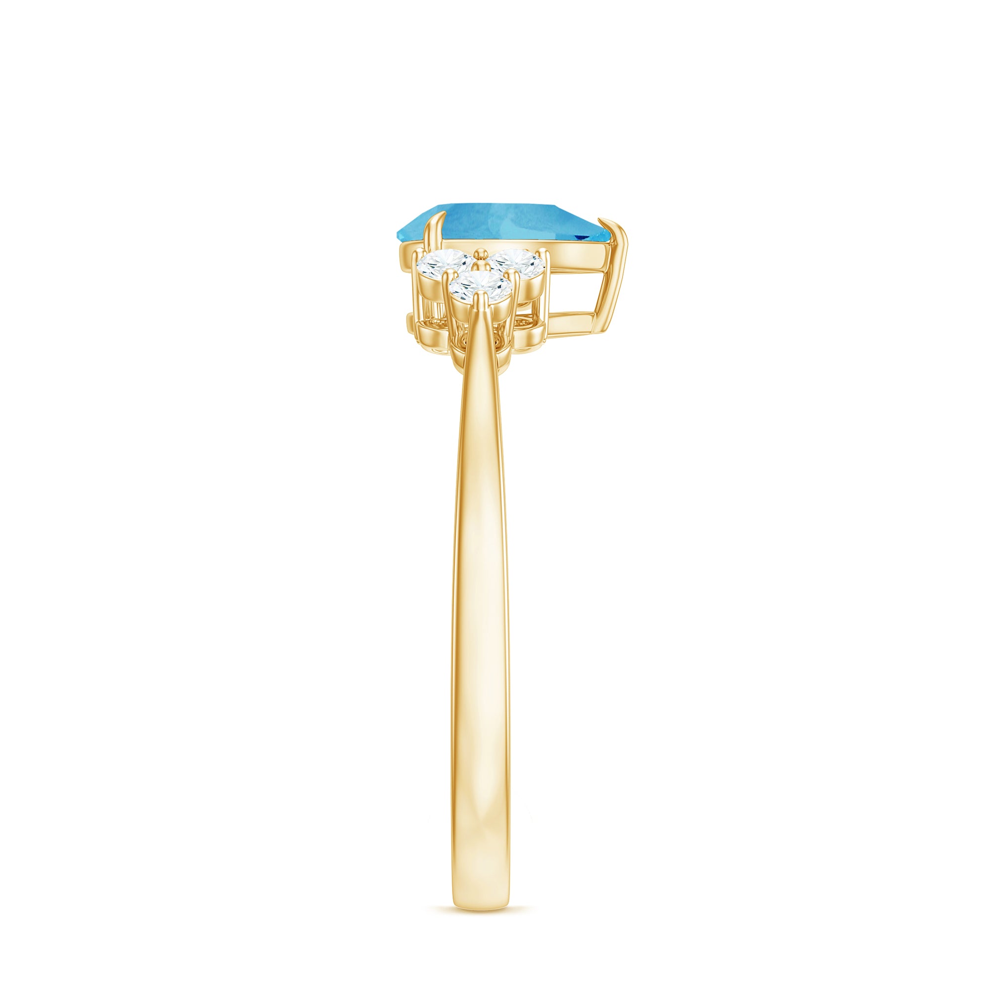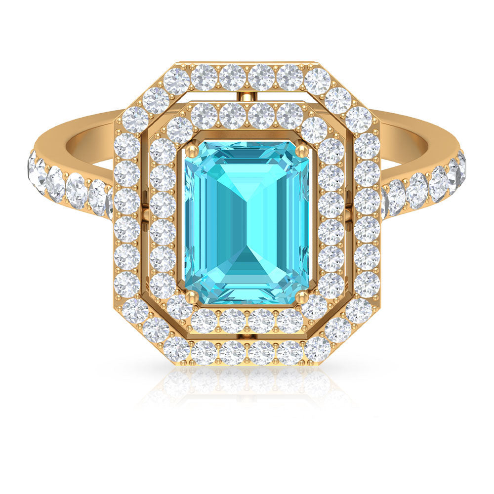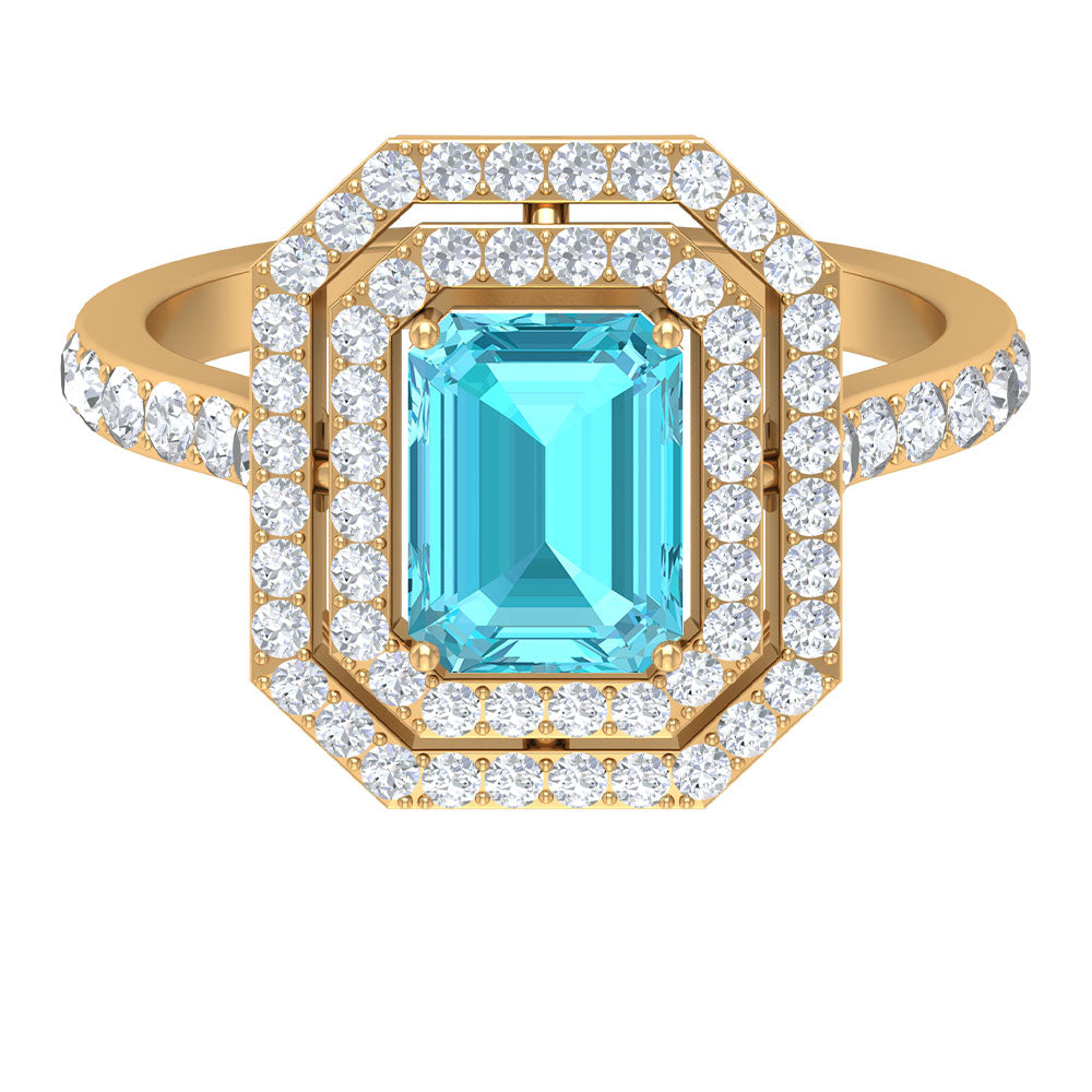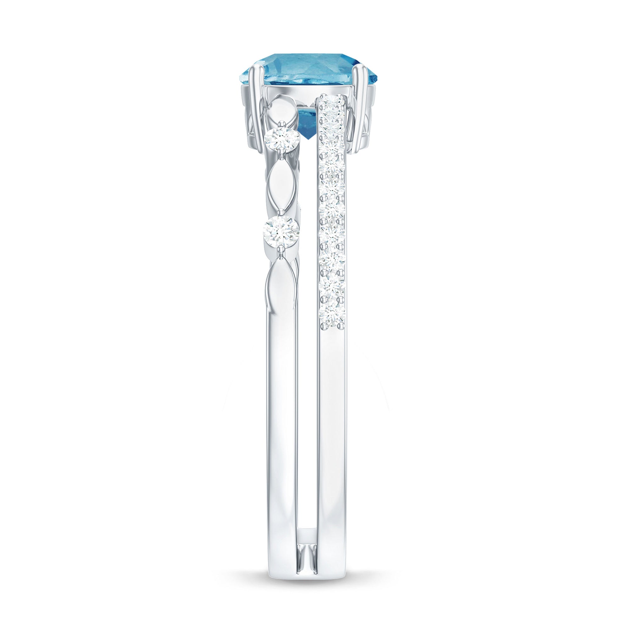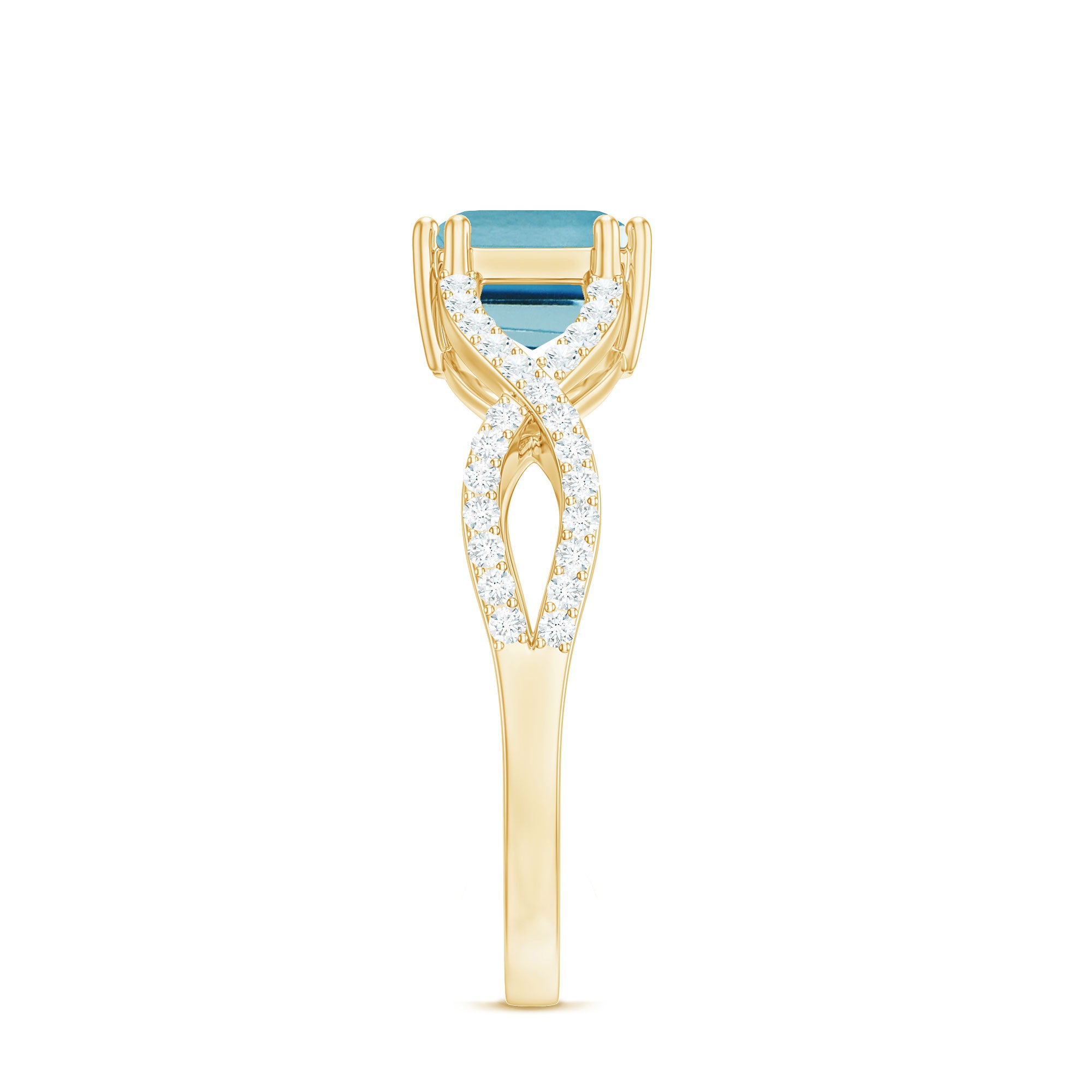 The center-stone of Swiss Blue Topaz here is sparkled up with the encircling of Diamond/Moissanite (that we fondly term ‘Halo’). That makes the Swiss Blue Topaz appear even brighter while highlighting its beauty at its best. Surprisingly, it also gives off the illusion of a bigger Topaz. So, if a Swiss Blue Topaz and Diamond Ring is on your list, this style might turn out to be your best bet.