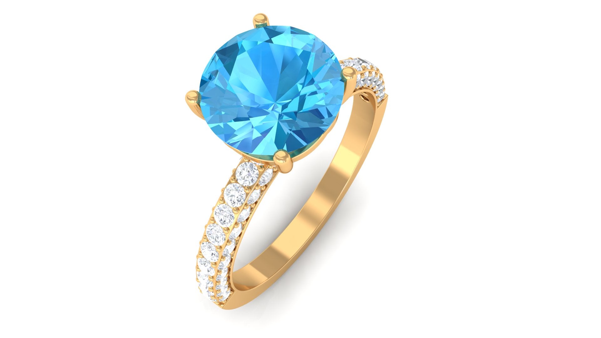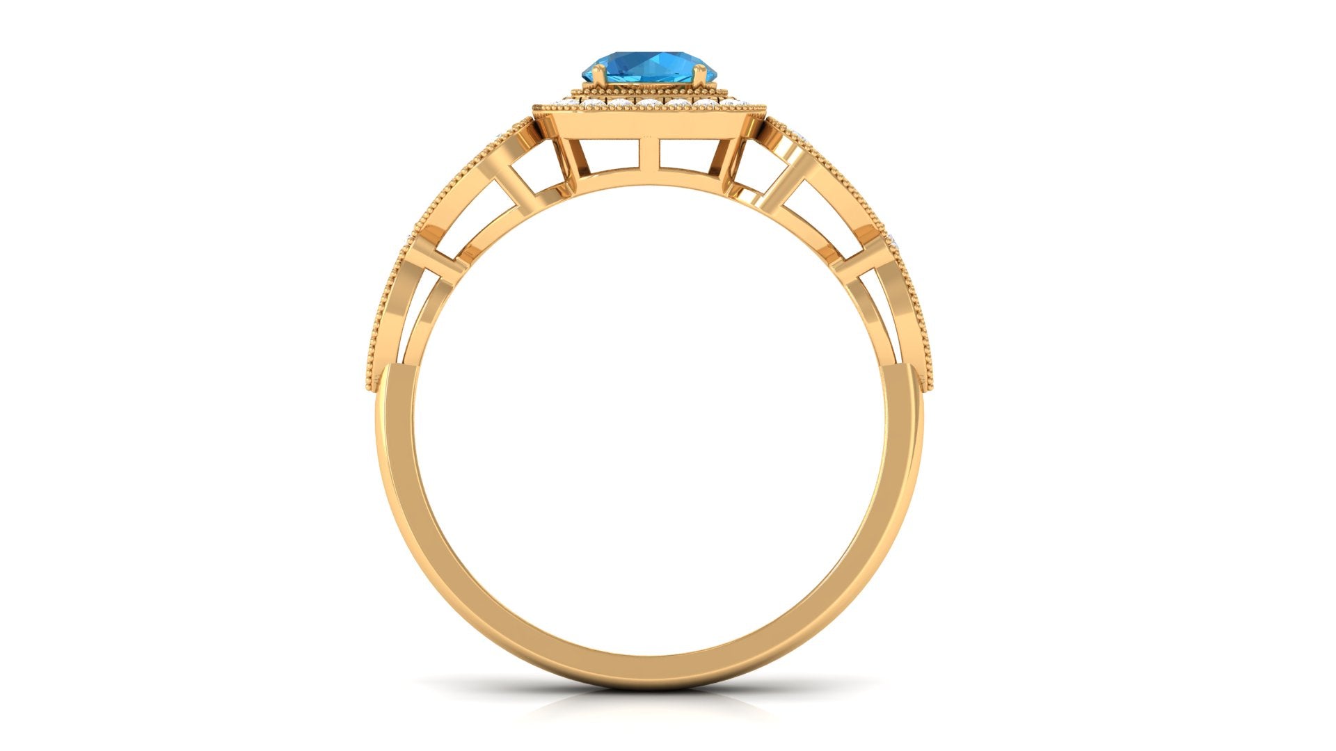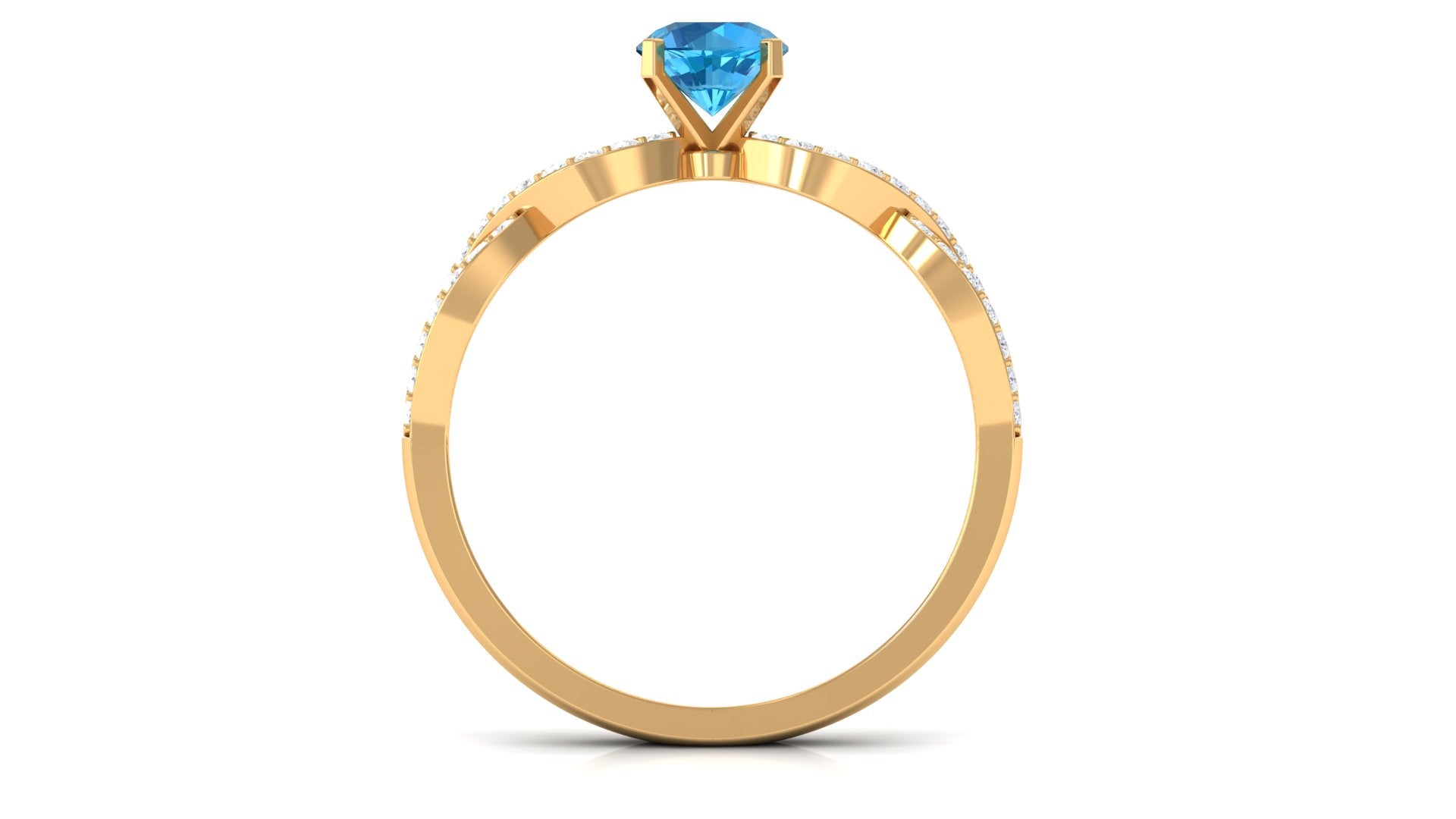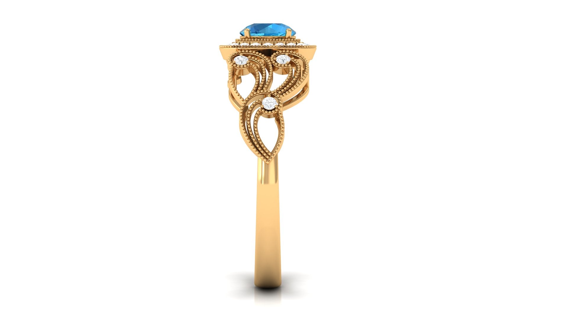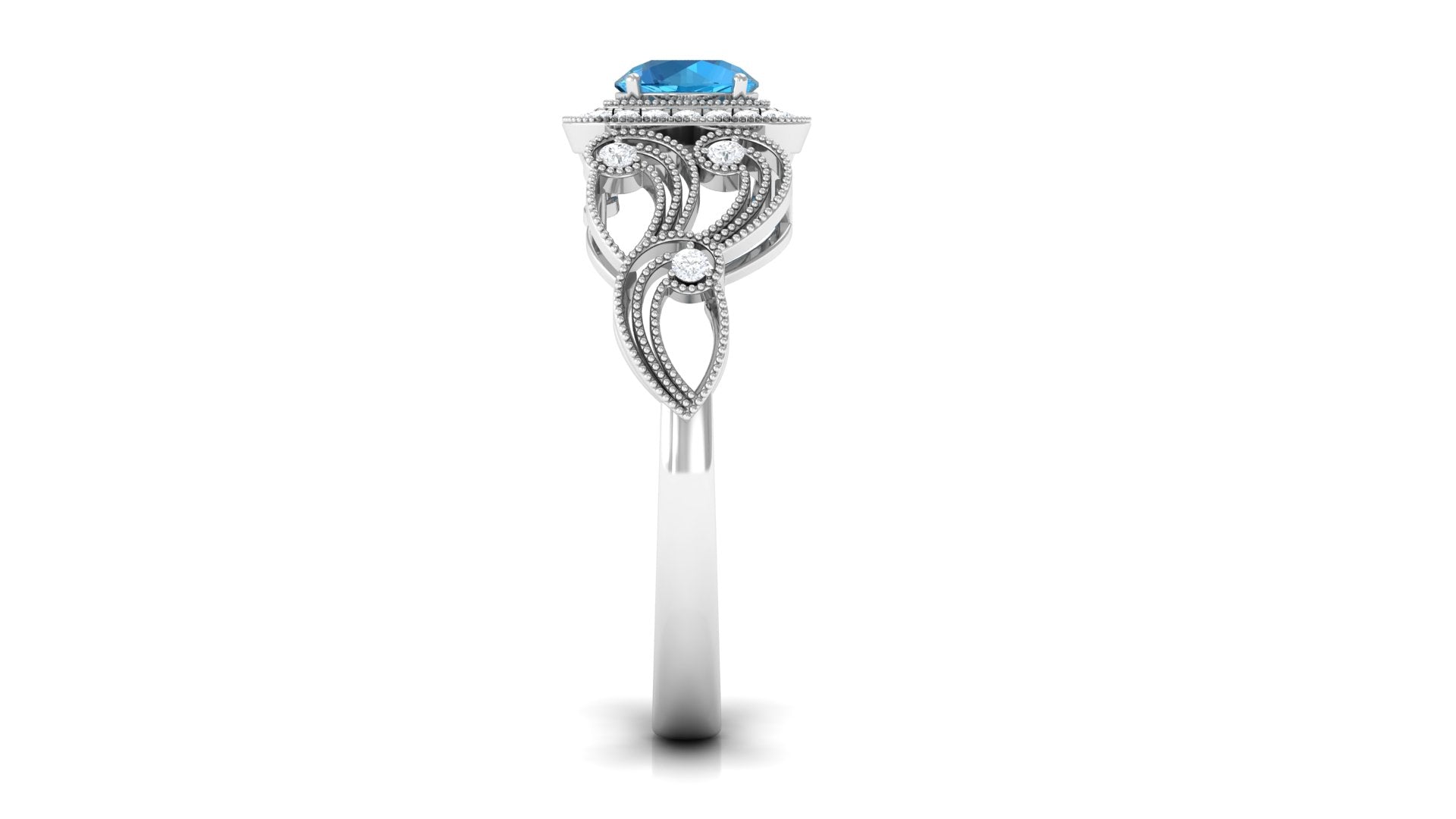 The center-stone of Swiss Blue Topaz here is sparkled up with the encircling of Diamond/Moissanite (that we fondly term ‘Halo’). That makes the Swiss Blue Topaz appear even brighter while highlighting its beauty at its best. Surprisingly, it also gives off the illusion of a bigger Topaz. So, if a Swiss Blue Topaz and Diamond Ring is on your list, this style might turn out to be your best bet.