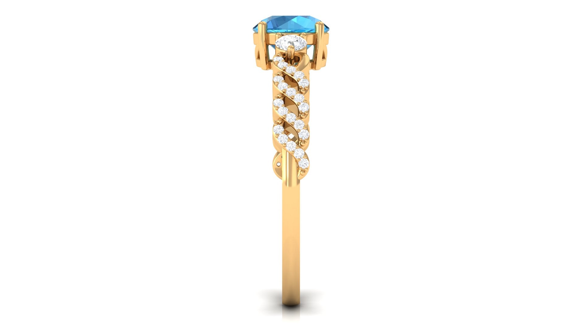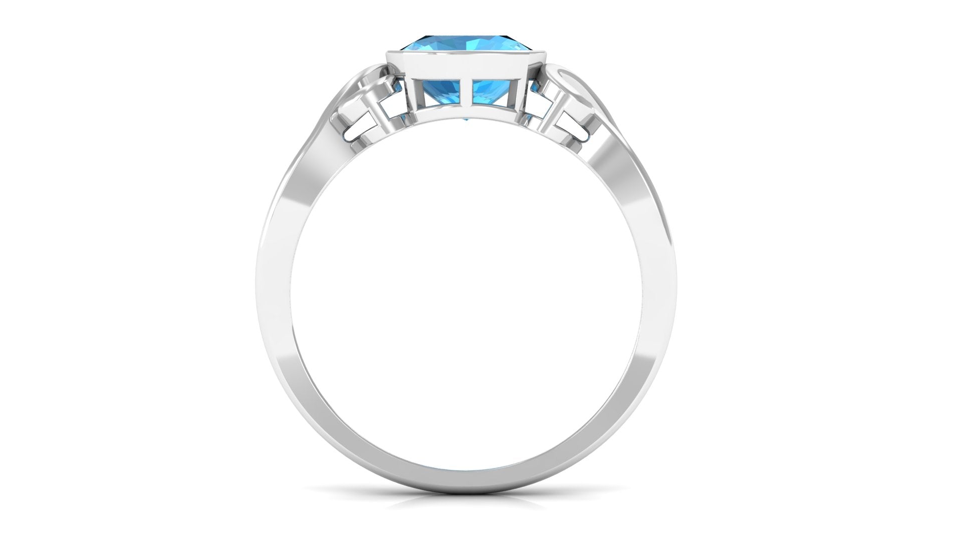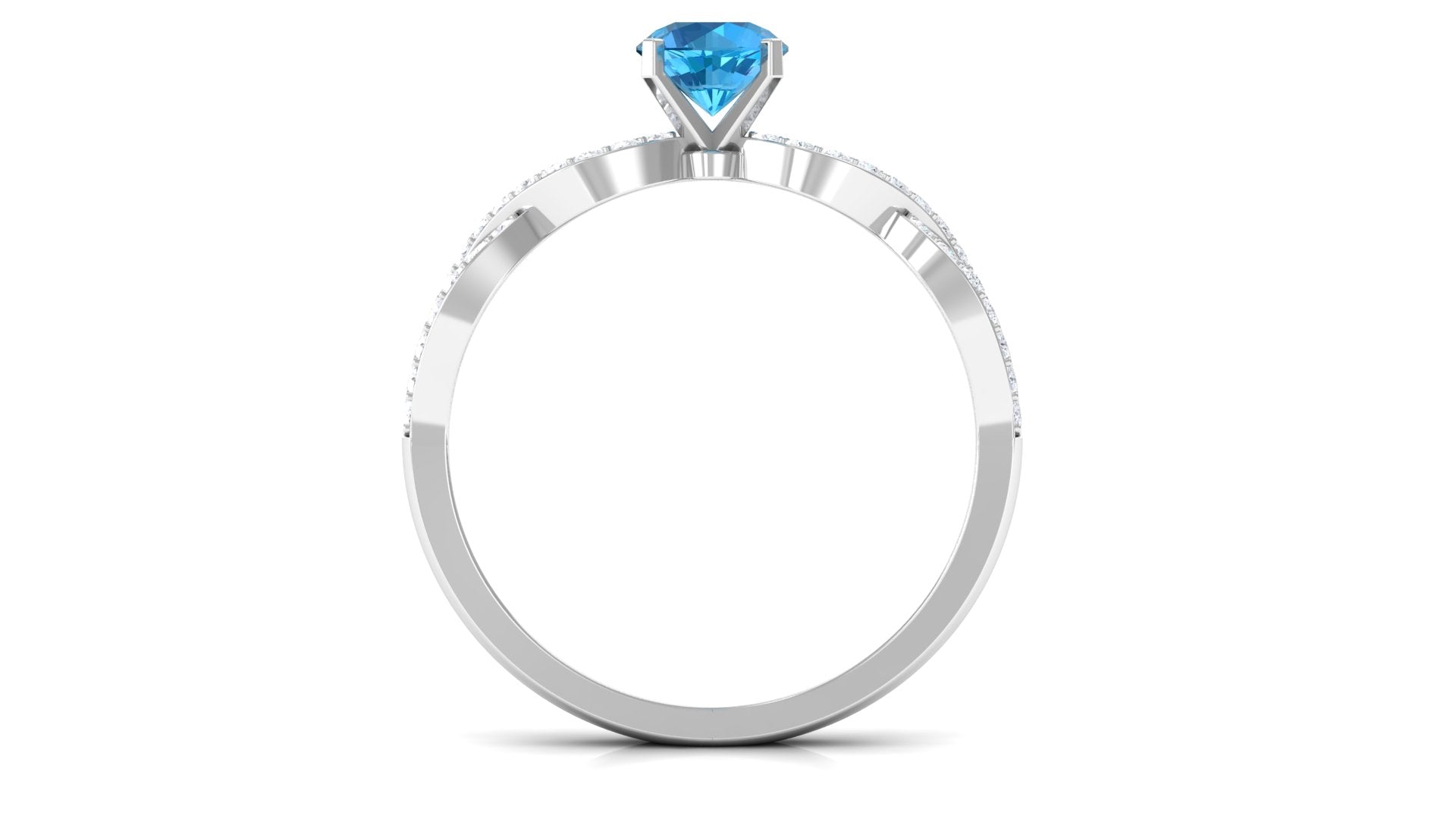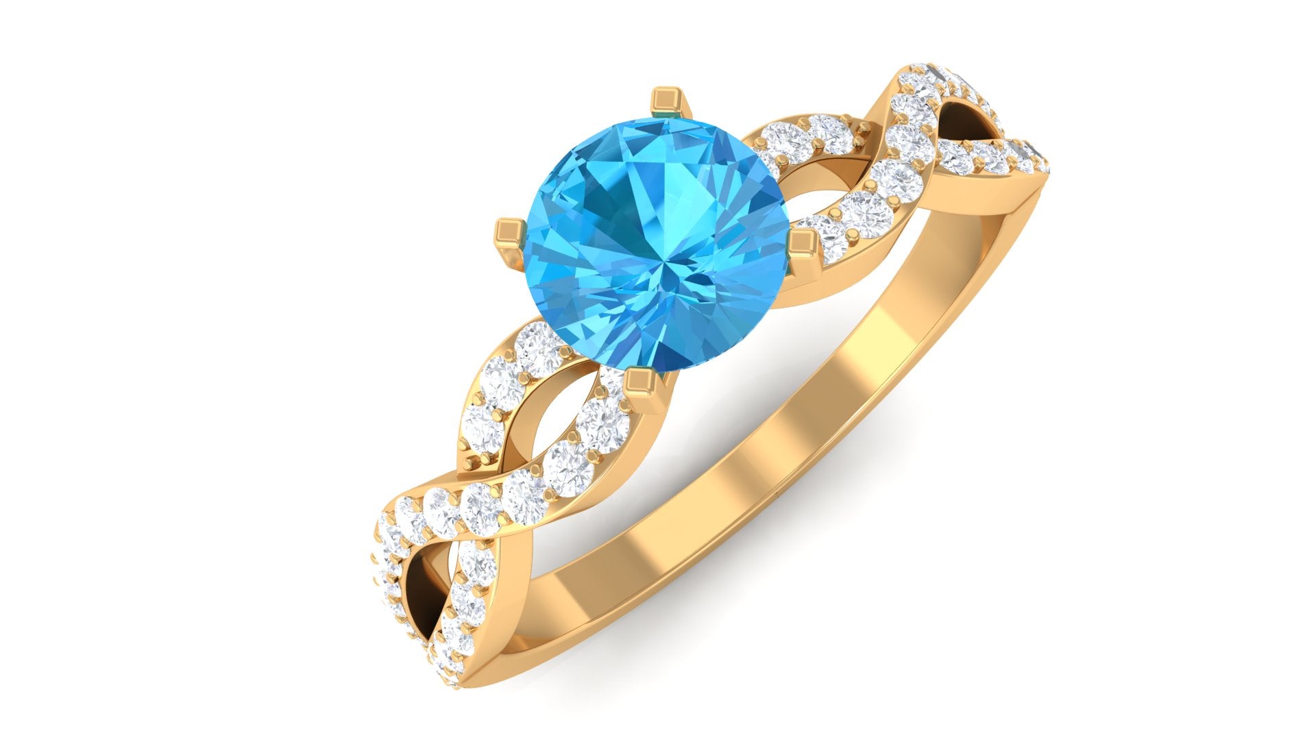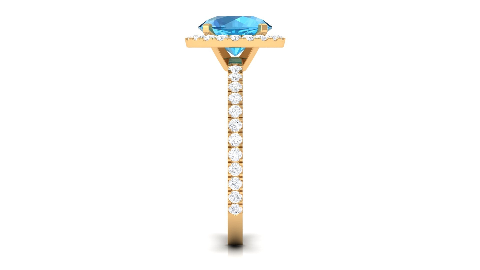 The center-stone of Swiss Blue Topaz here is sparkled up with the encircling of Diamond/Moissanite (that we fondly term ‘Halo’). That makes the Swiss Blue Topaz appear even brighter while highlighting its beauty at its best. Surprisingly, it also gives off the illusion of a bigger Topaz. So, if a Swiss Blue Topaz and Diamond Ring is on your list, this style might turn out to be your best bet.