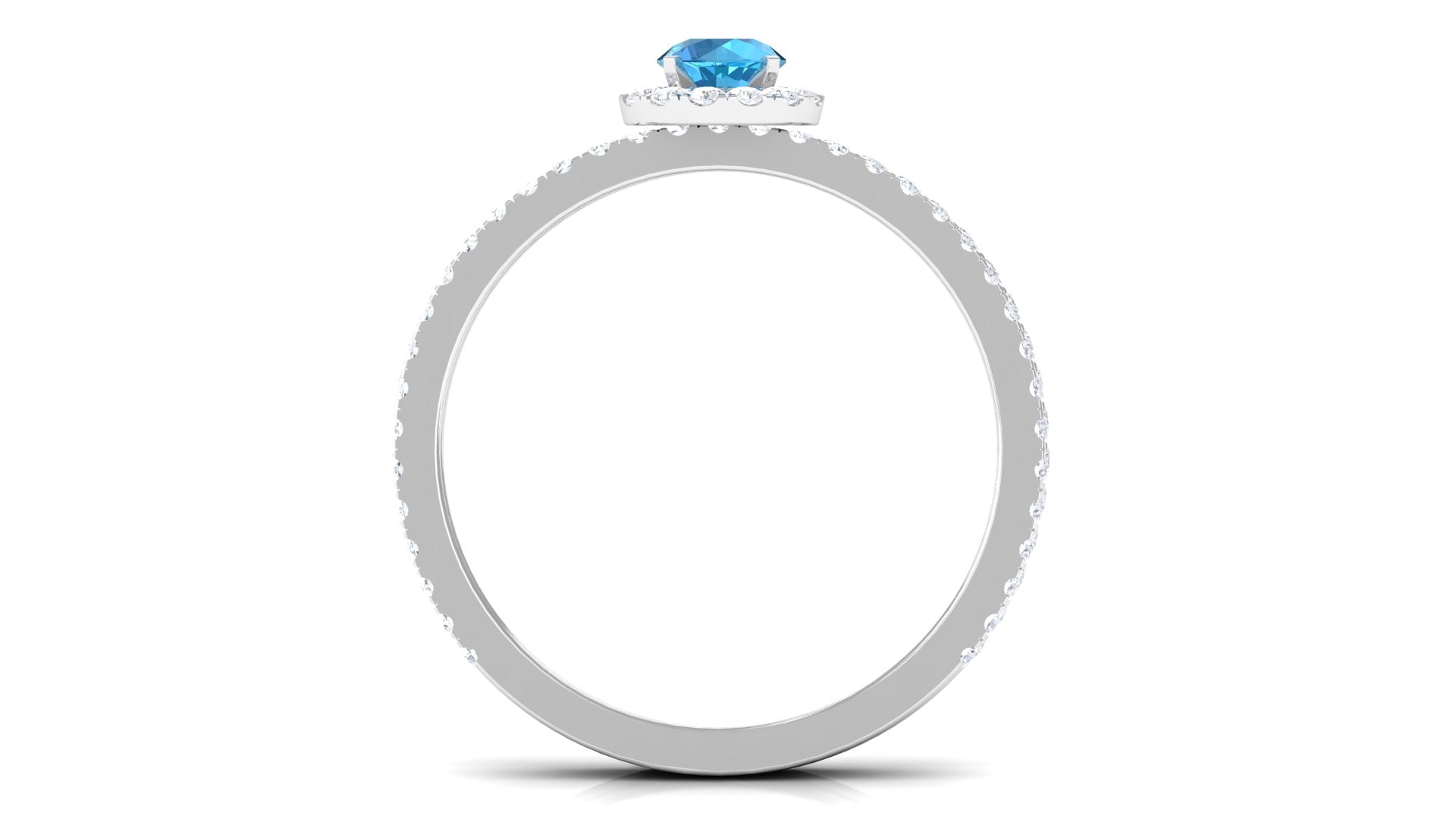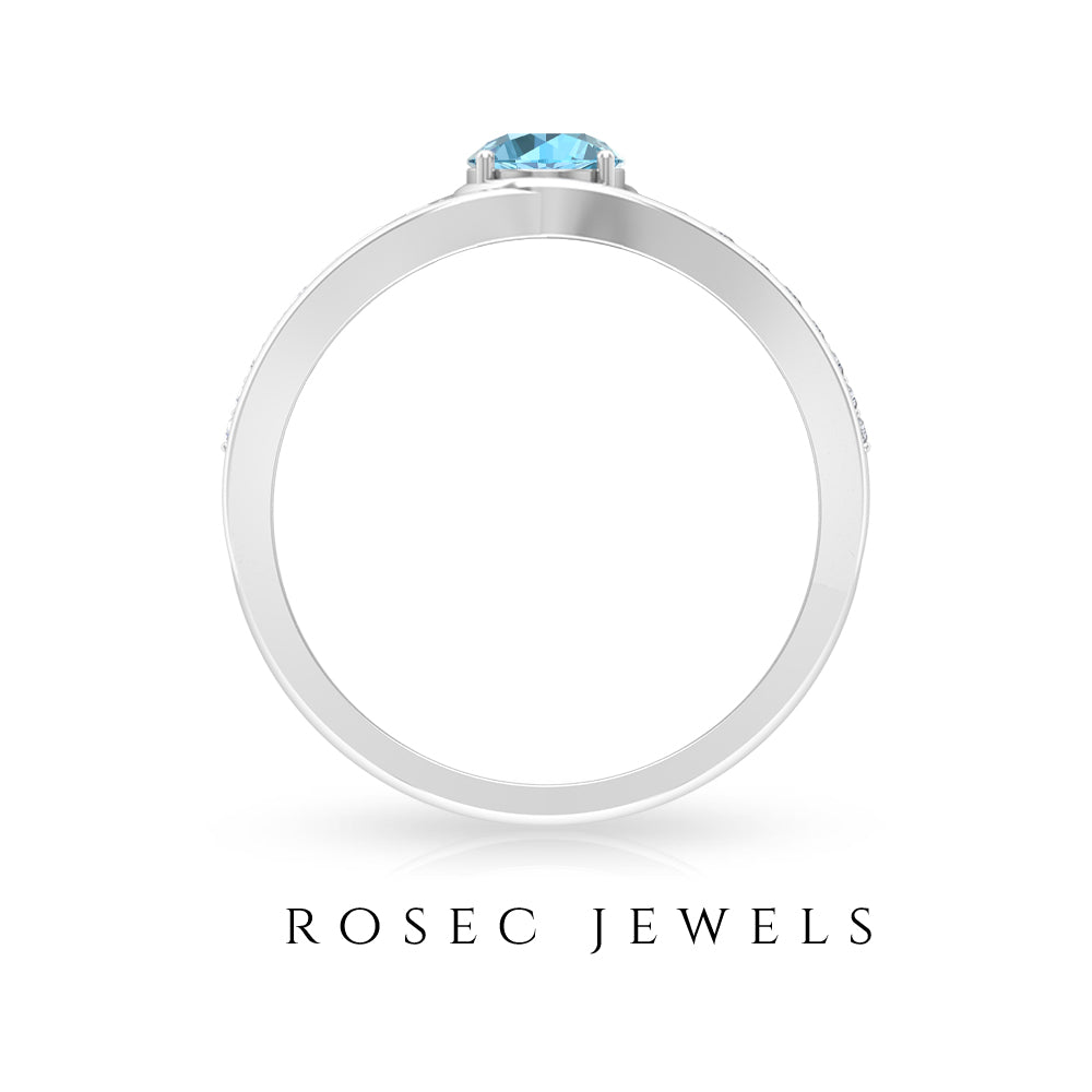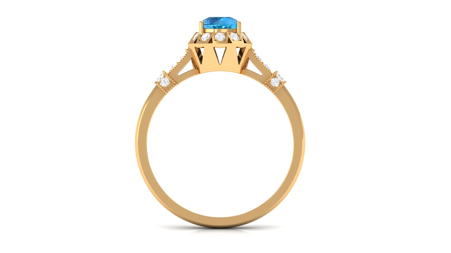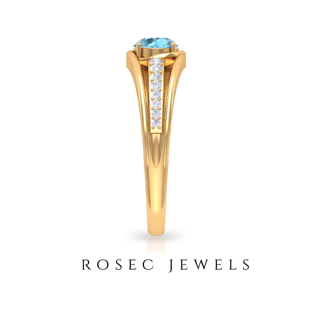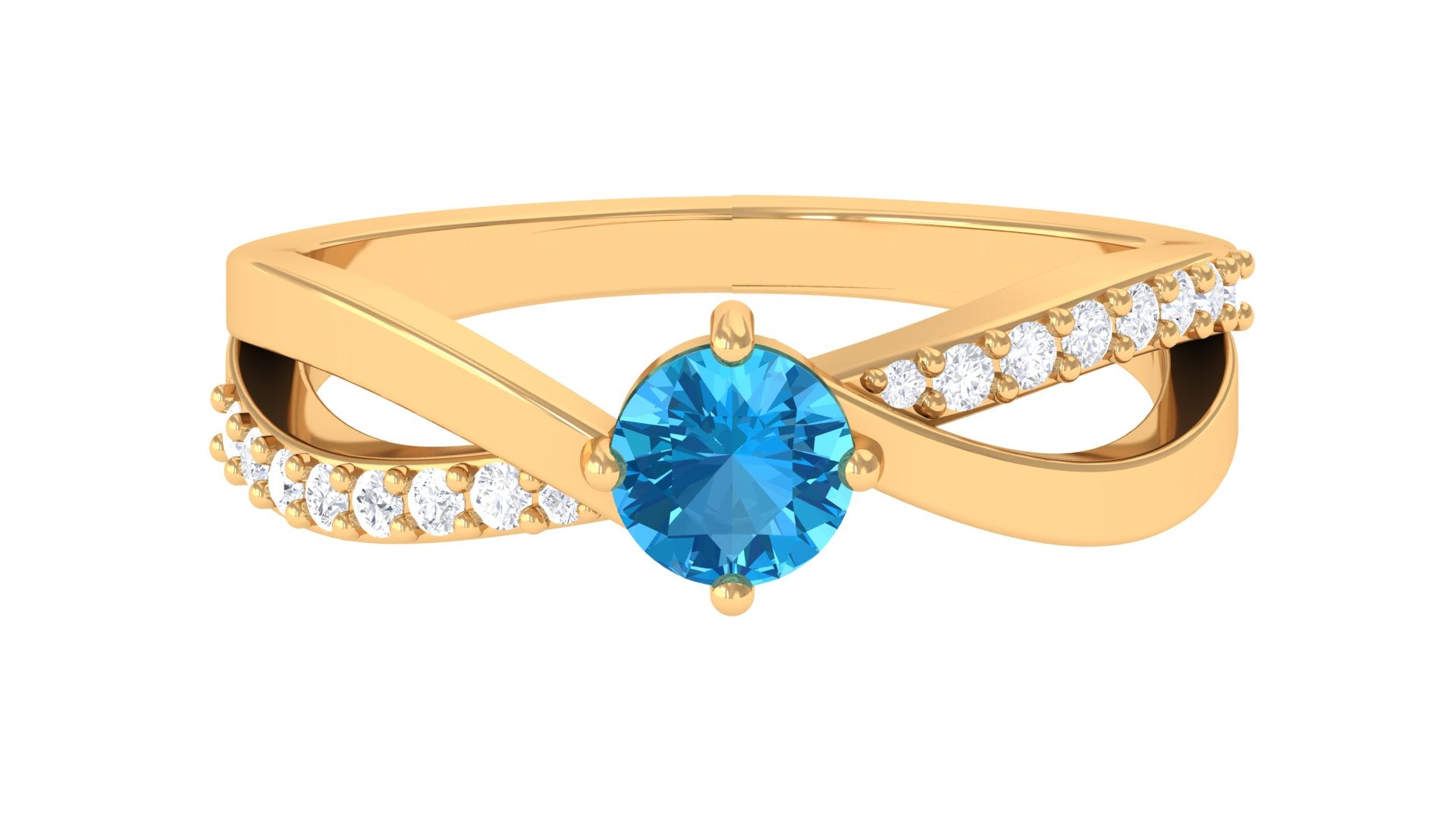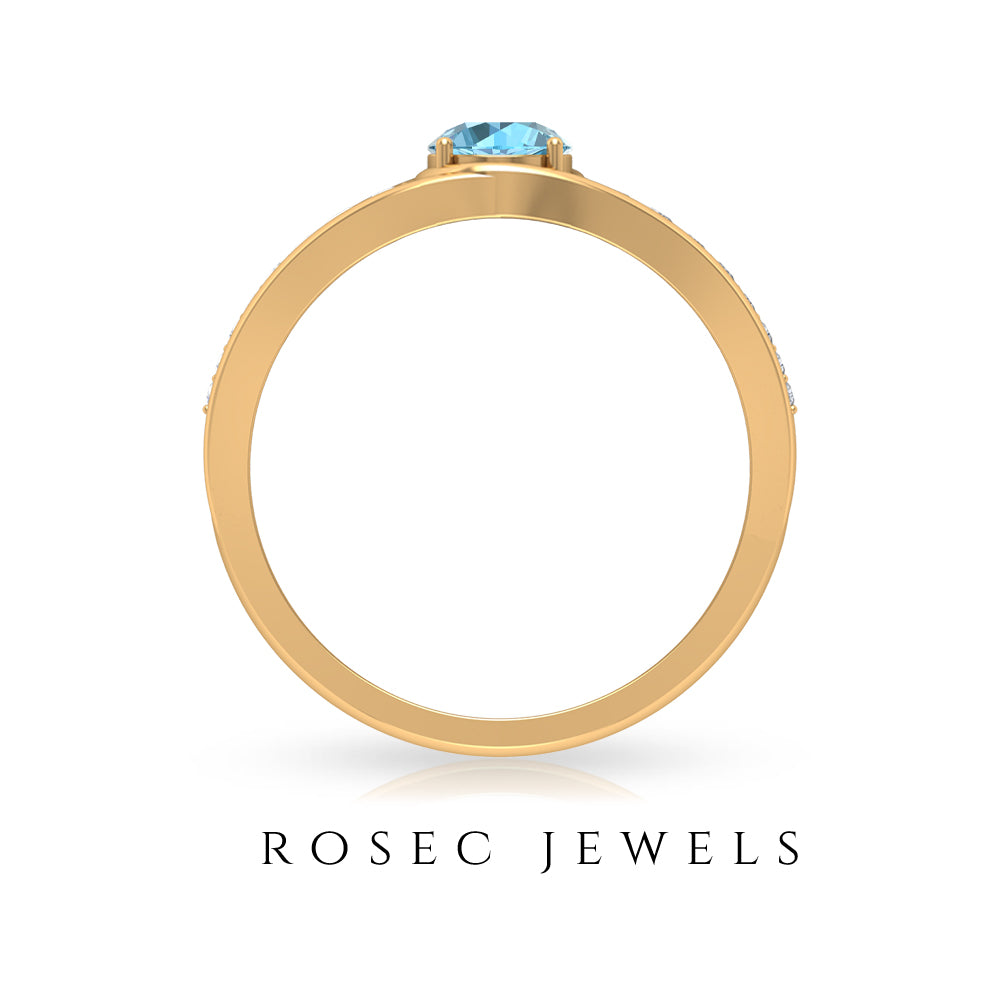 The center-stone of Swiss Blue Topaz here is sparkled up with the encircling of Diamond/Moissanite (that we fondly term ‘Halo’). That makes the Swiss Blue Topaz appear even brighter while highlighting its beauty at its best. Surprisingly, it also gives off the illusion of a bigger Topaz. So, if a Swiss Blue Topaz and Diamond Ring is on your list, this style might turn out to be your best bet.