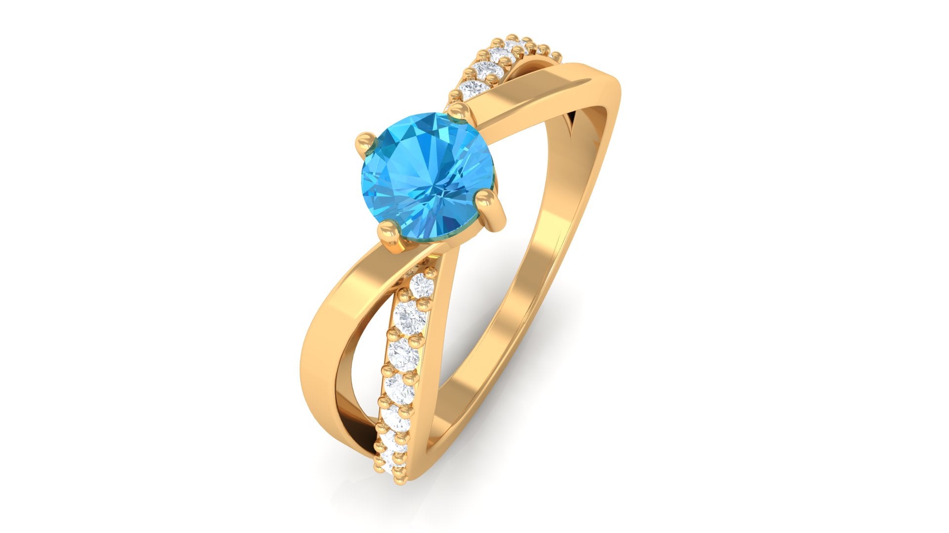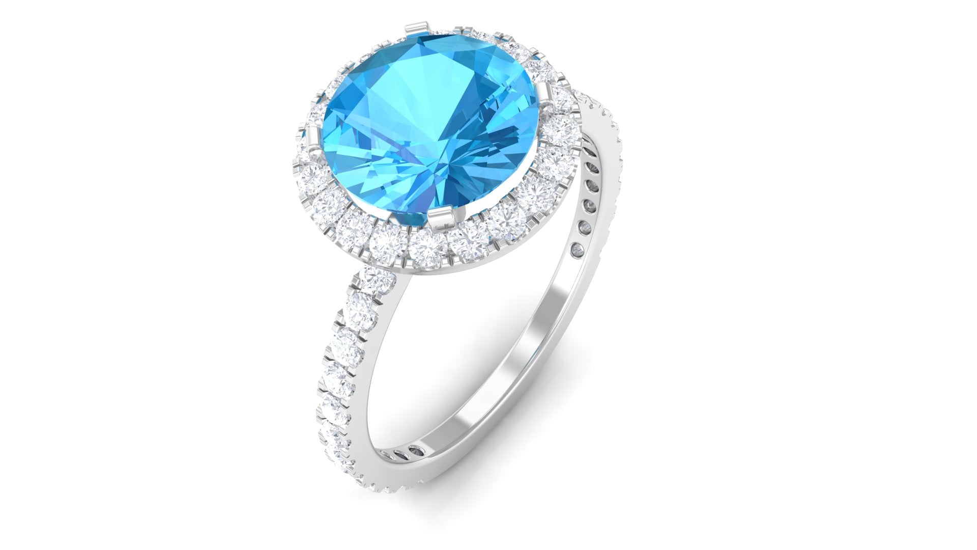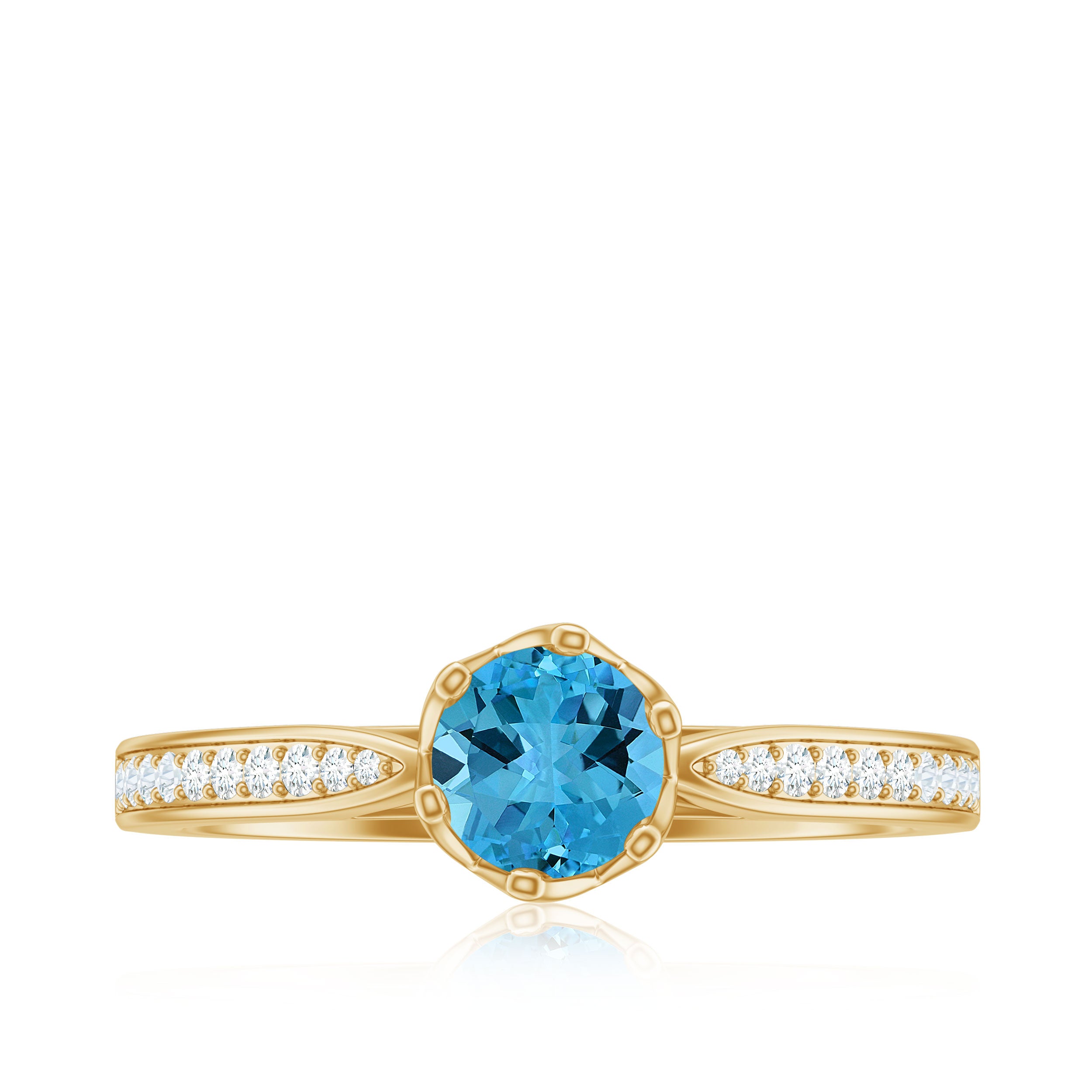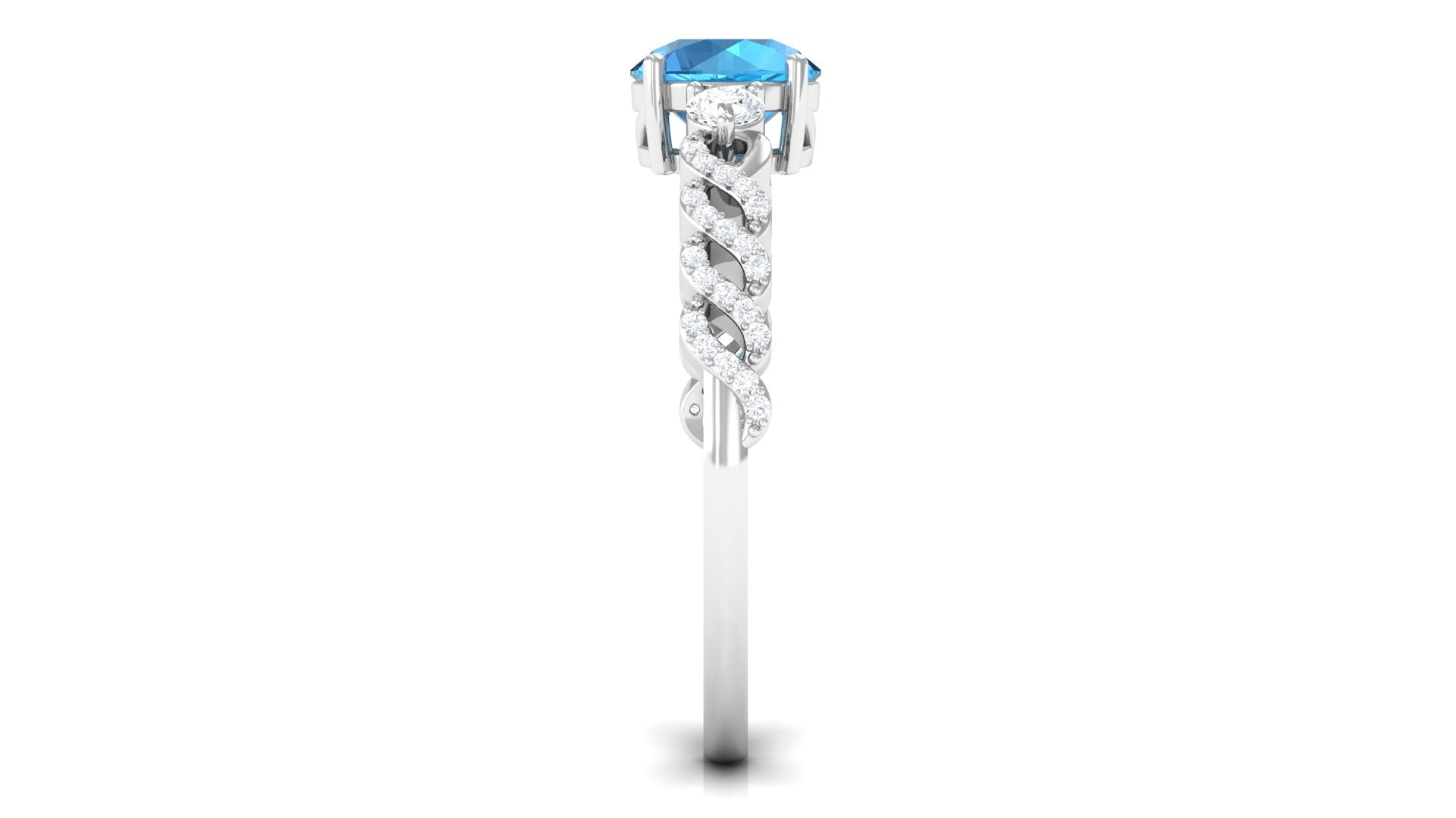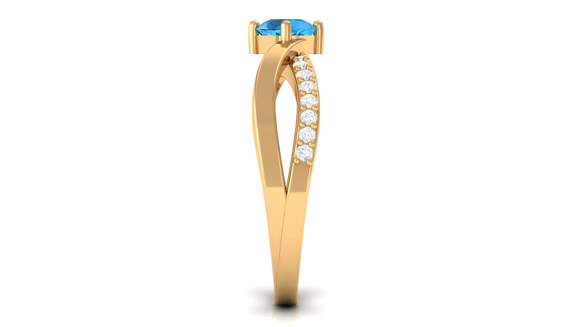 The center-stone of Swiss Blue Topaz here is sparkled up with the encircling of Diamond/Moissanite (that we fondly term ‘Halo’). That makes the Swiss Blue Topaz appear even brighter while highlighting its beauty at its best. Surprisingly, it also gives off the illusion of a bigger Topaz. So, if a Swiss Blue Topaz and Diamond Ring is on your list, this style might turn out to be your best bet.