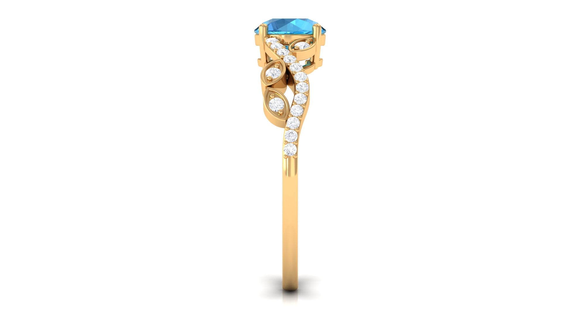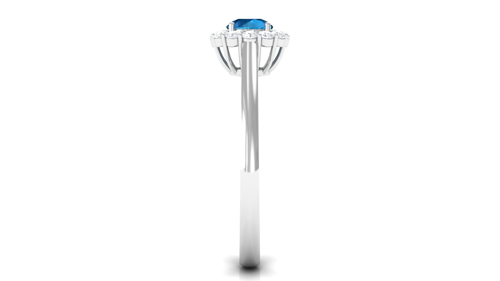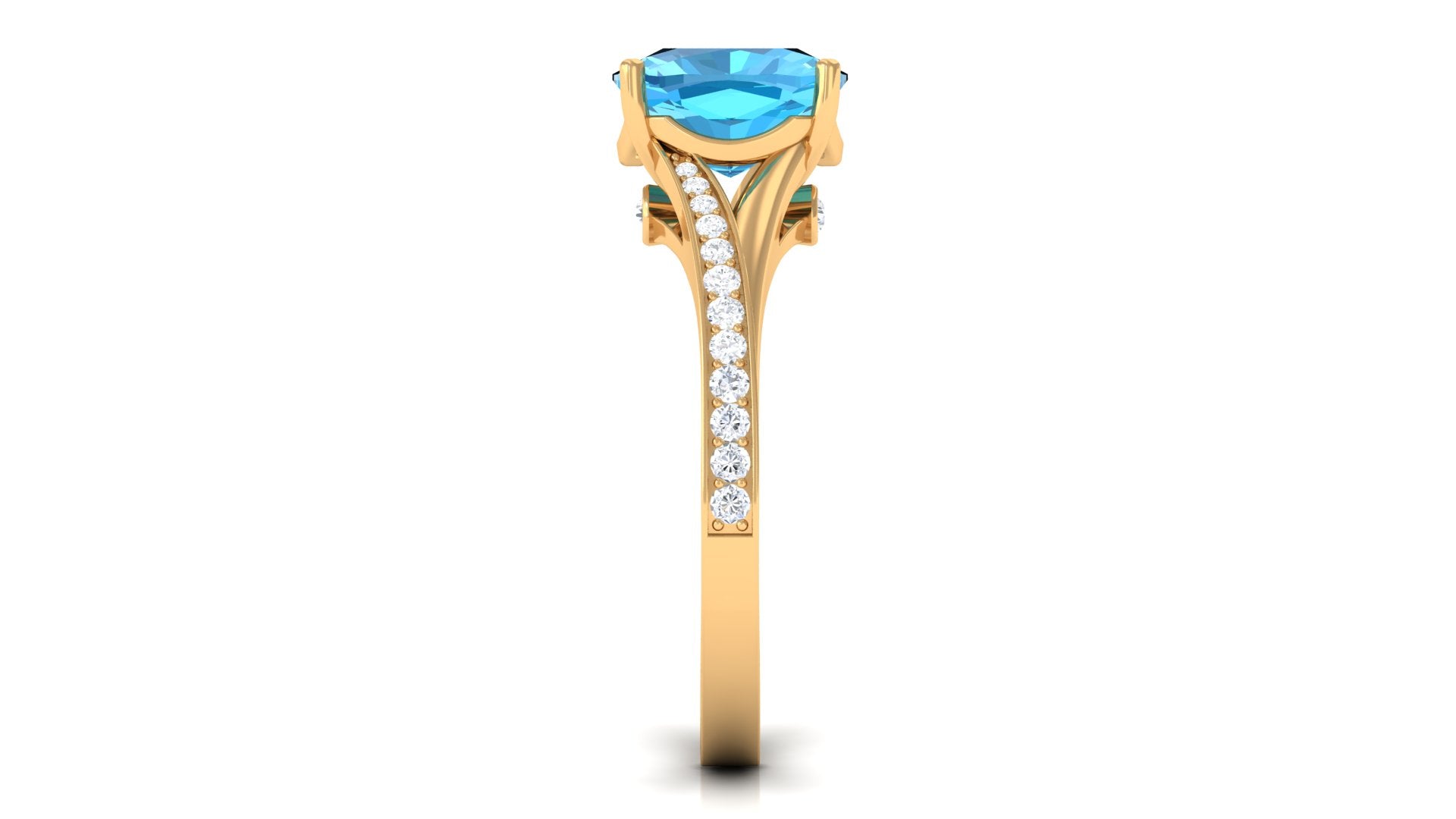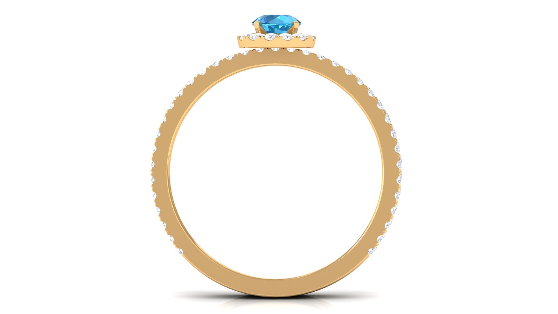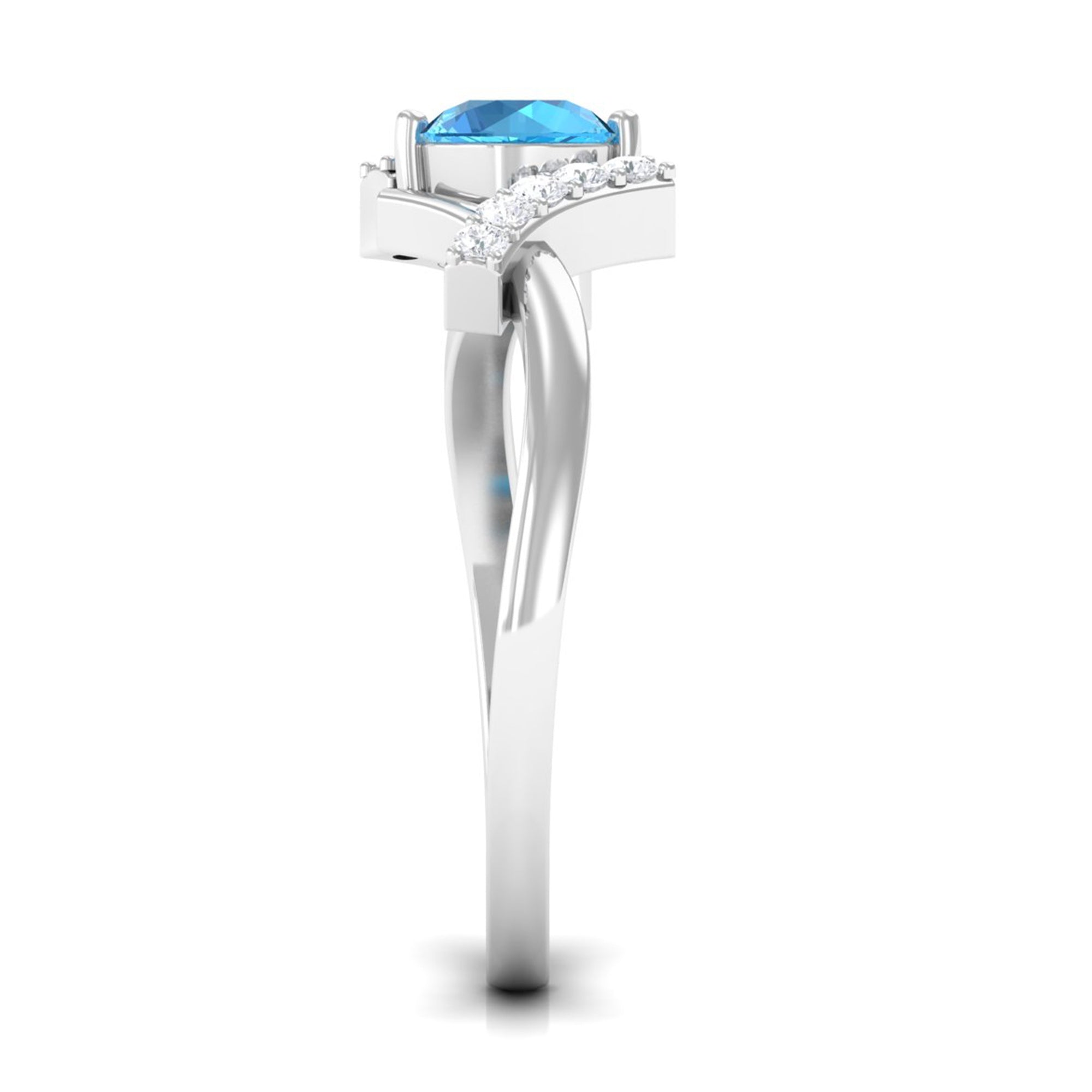 The center-stone of Swiss Blue Topaz here is sparkled up with the encircling of Diamond/Moissanite (that we fondly term ‘Halo’). That makes the Swiss Blue Topaz appear even brighter while highlighting its beauty at its best. Surprisingly, it also gives off the illusion of a bigger Topaz. So, if a Swiss Blue Topaz and Diamond Ring is on your list, this style might turn out to be your best bet.