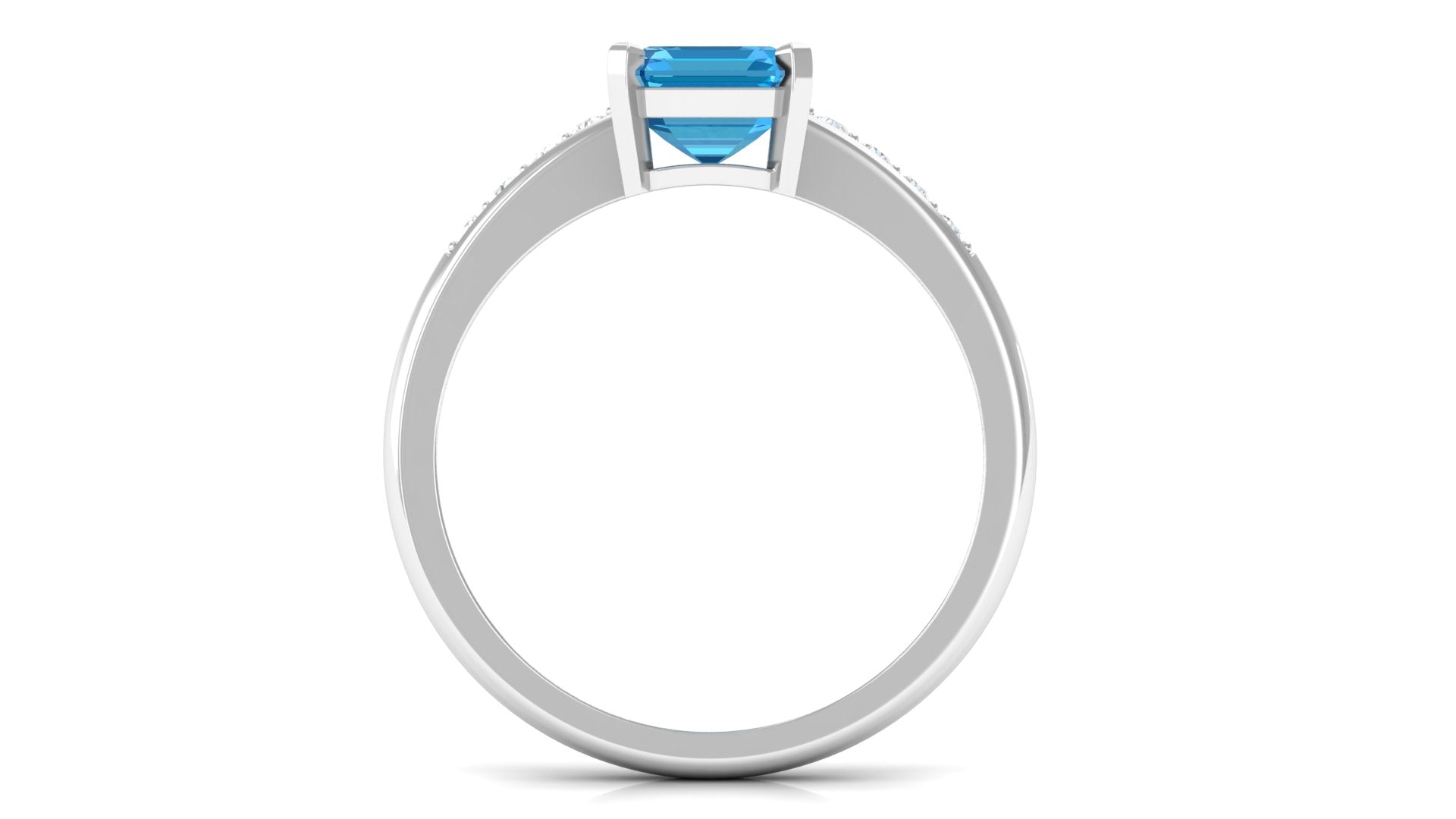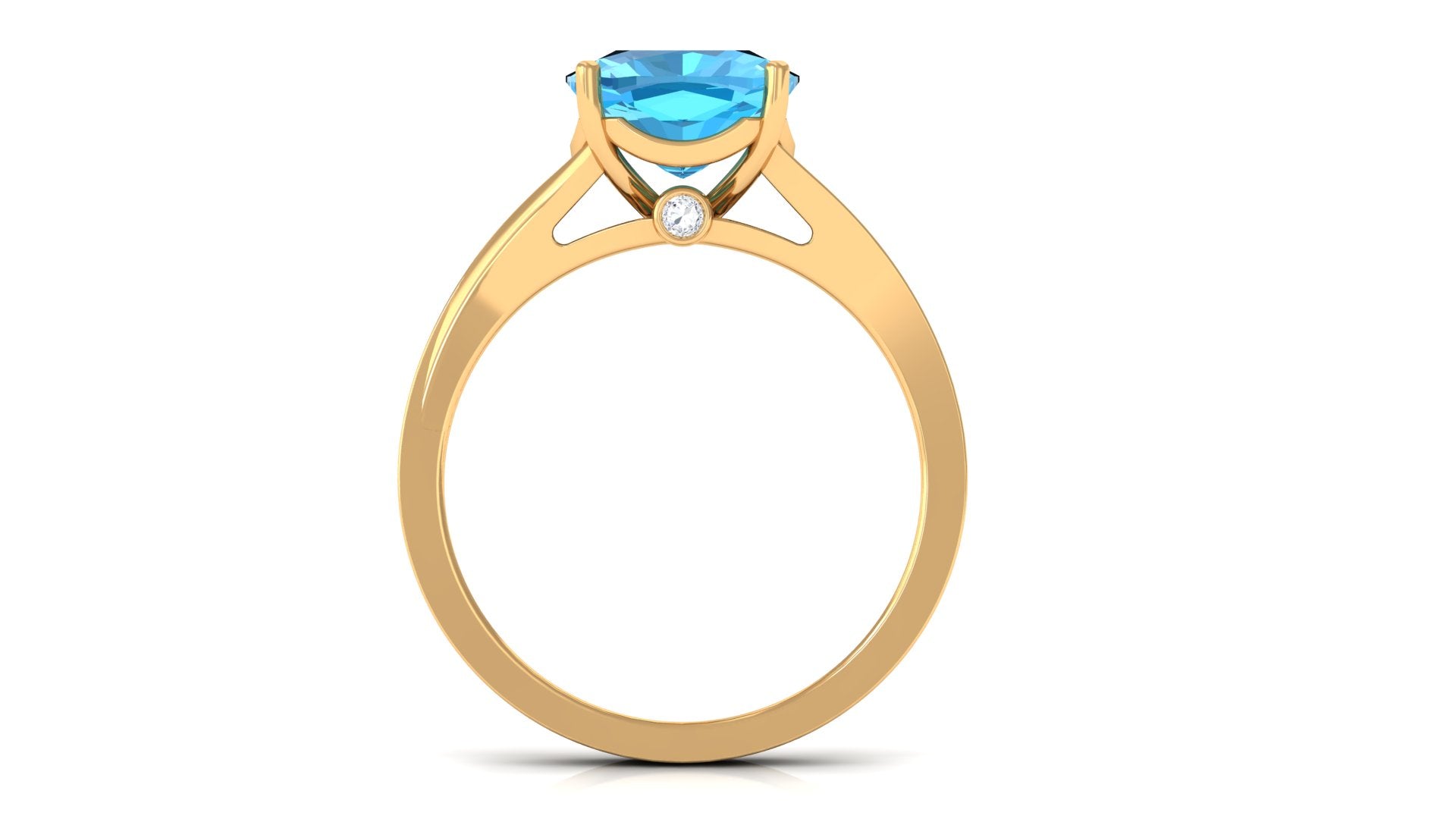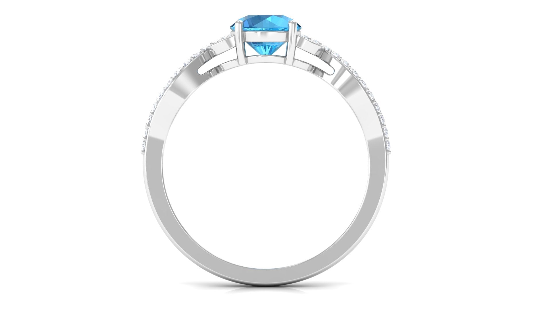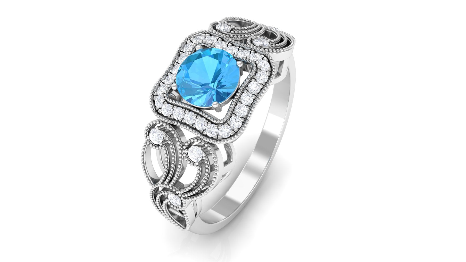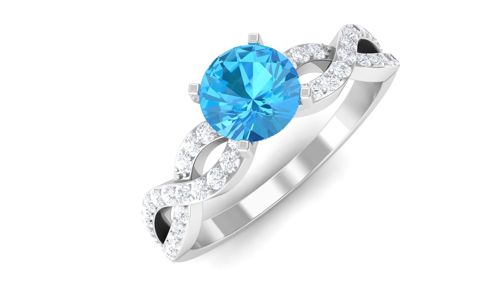 The center-stone of Swiss Blue Topaz here is sparkled up with the encircling of Diamond/Moissanite (that we fondly term ‘Halo’). That makes the Swiss Blue Topaz appear even brighter while highlighting its beauty at its best. Surprisingly, it also gives off the illusion of a bigger Topaz. So, if a Swiss Blue Topaz and Diamond Ring is on your list, this style might turn out to be your best bet.