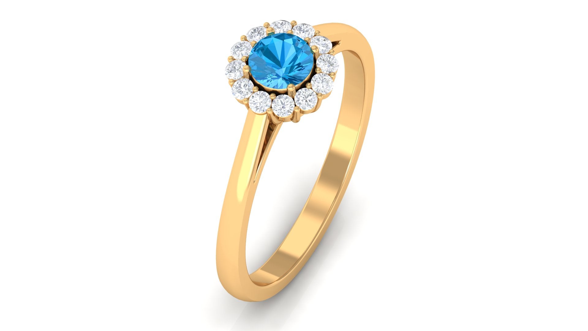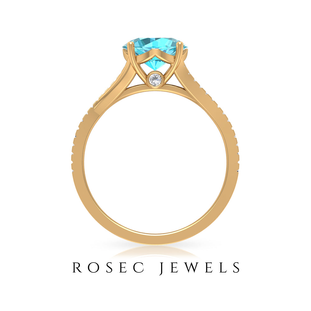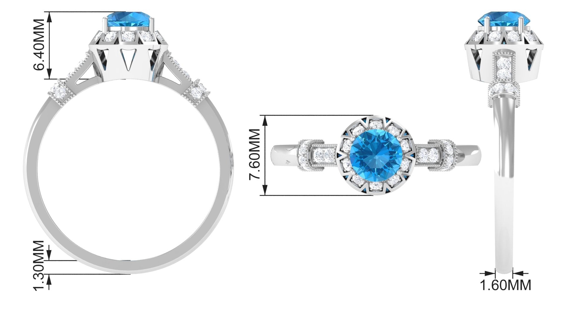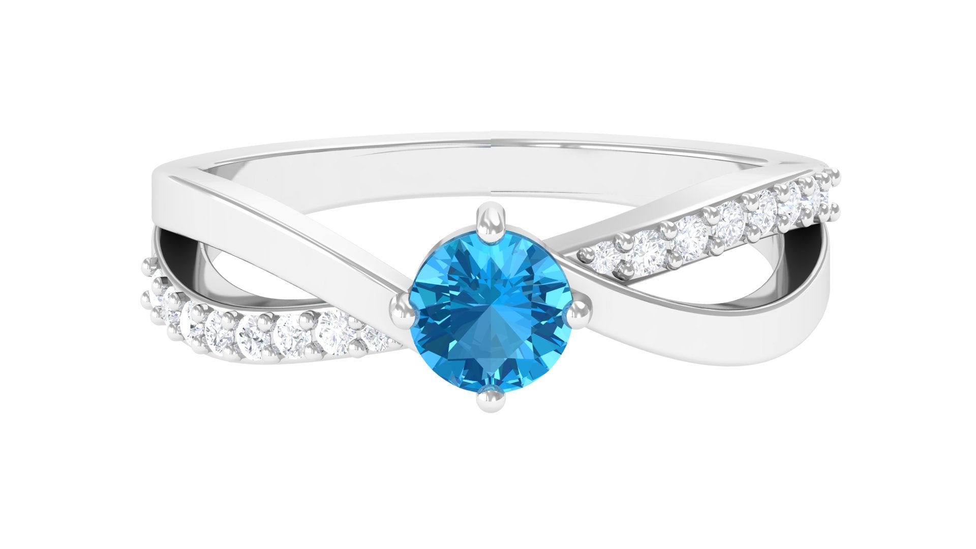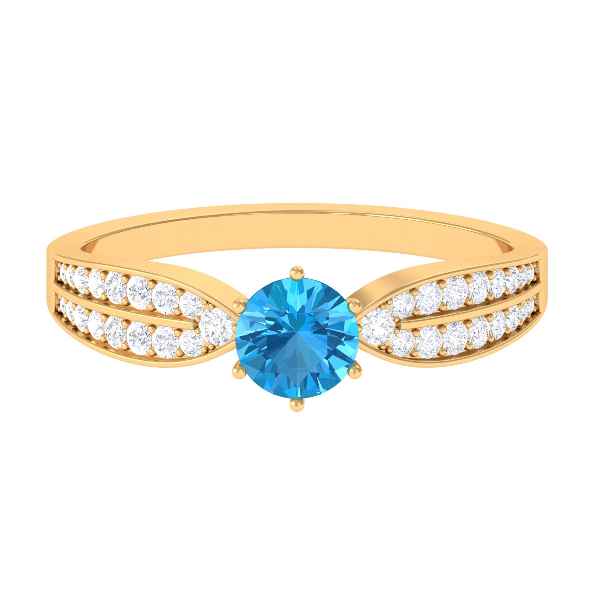 The center-stone of Swiss Blue Topaz here is sparkled up with the encircling of Diamond/Moissanite (that we fondly term ‘Halo’). That makes the Swiss Blue Topaz appear even brighter while highlighting its beauty at its best. Surprisingly, it also gives off the illusion of a bigger Topaz. So, if a Swiss Blue Topaz and Diamond Ring is on your list, this style might turn out to be your best bet.