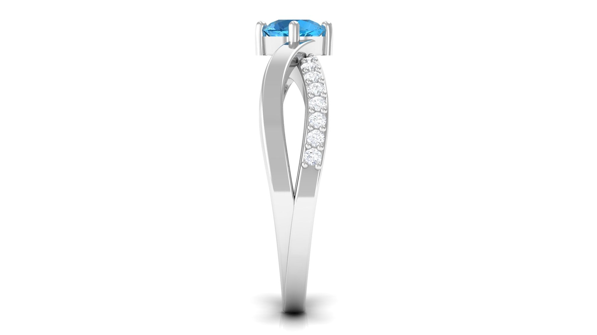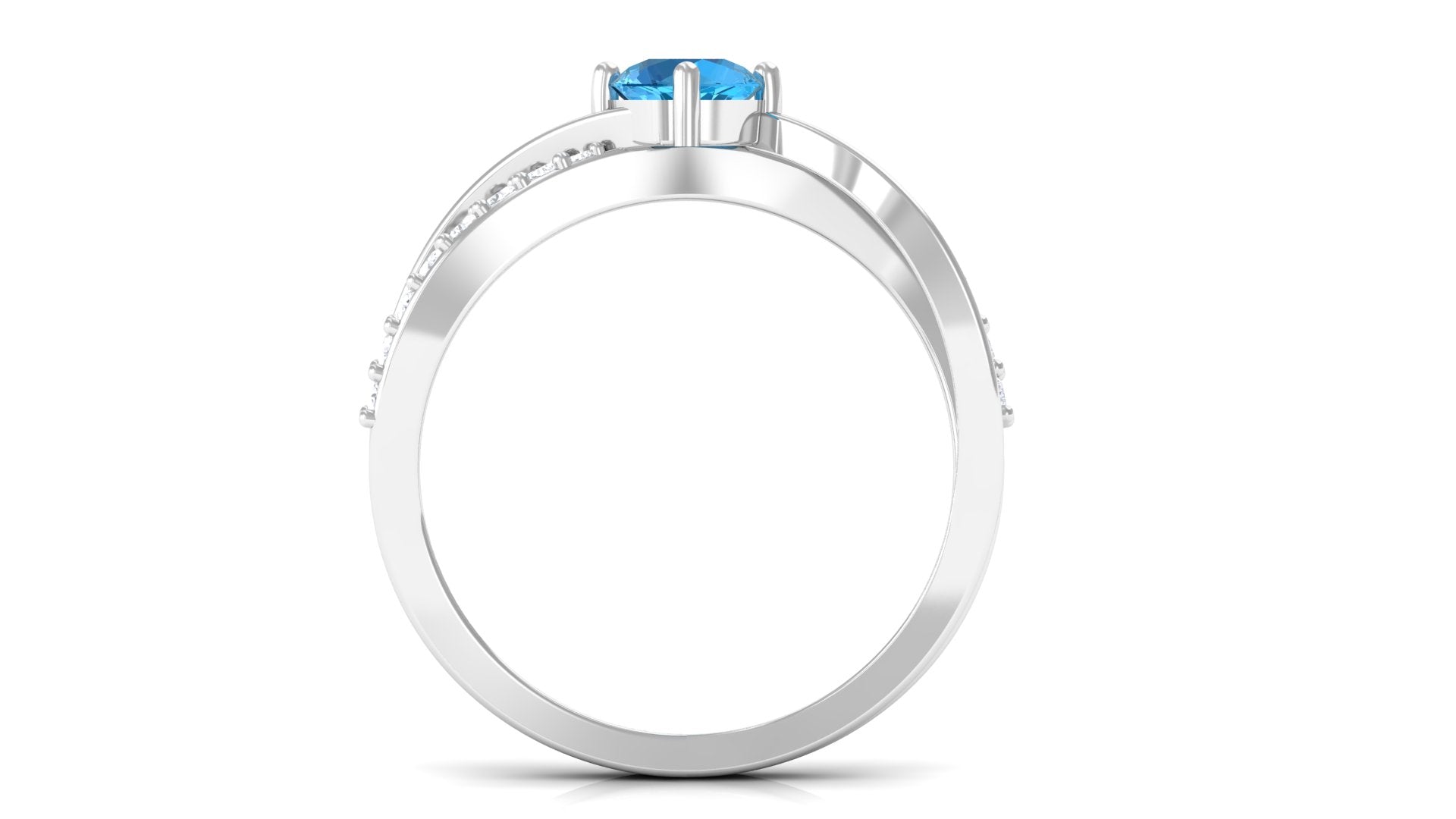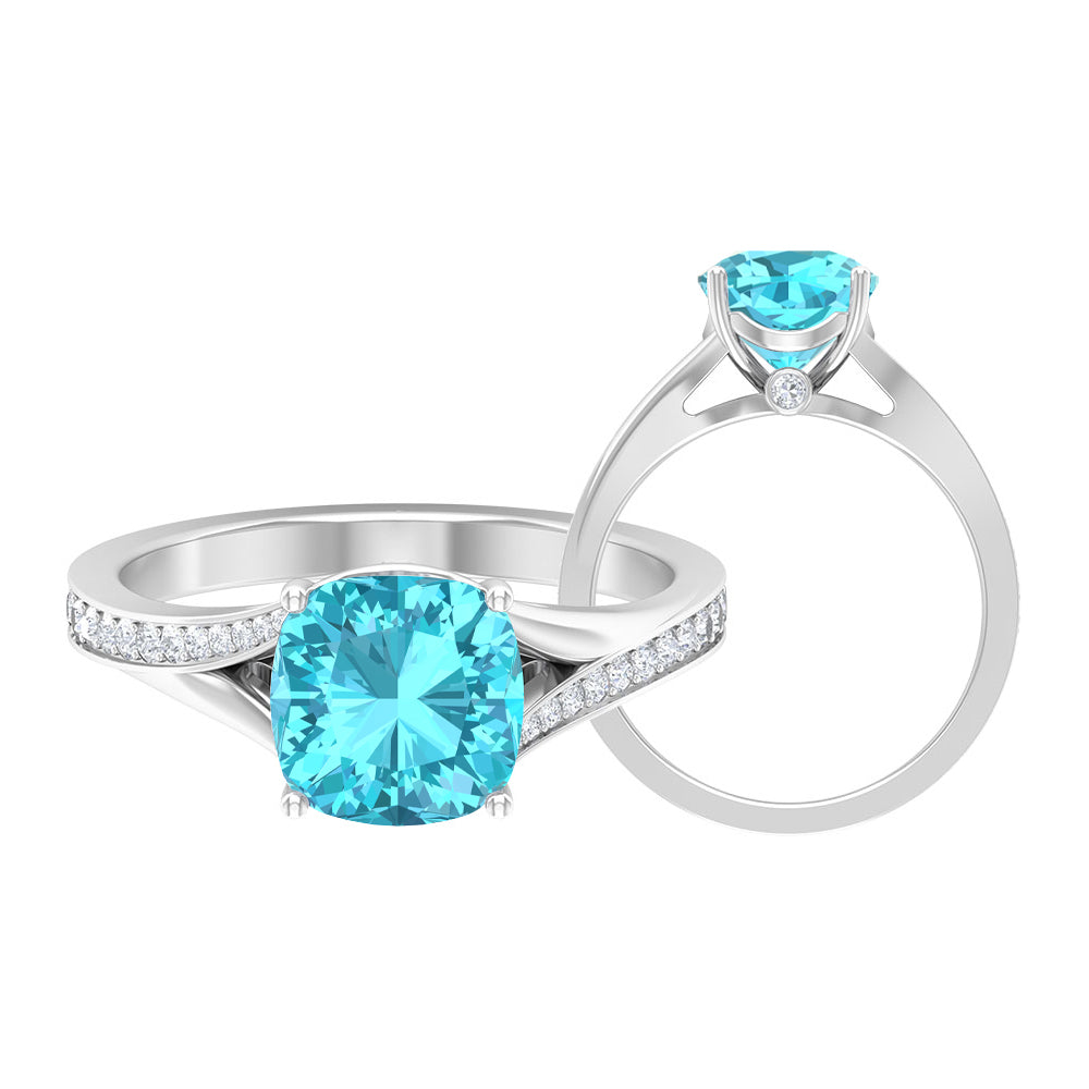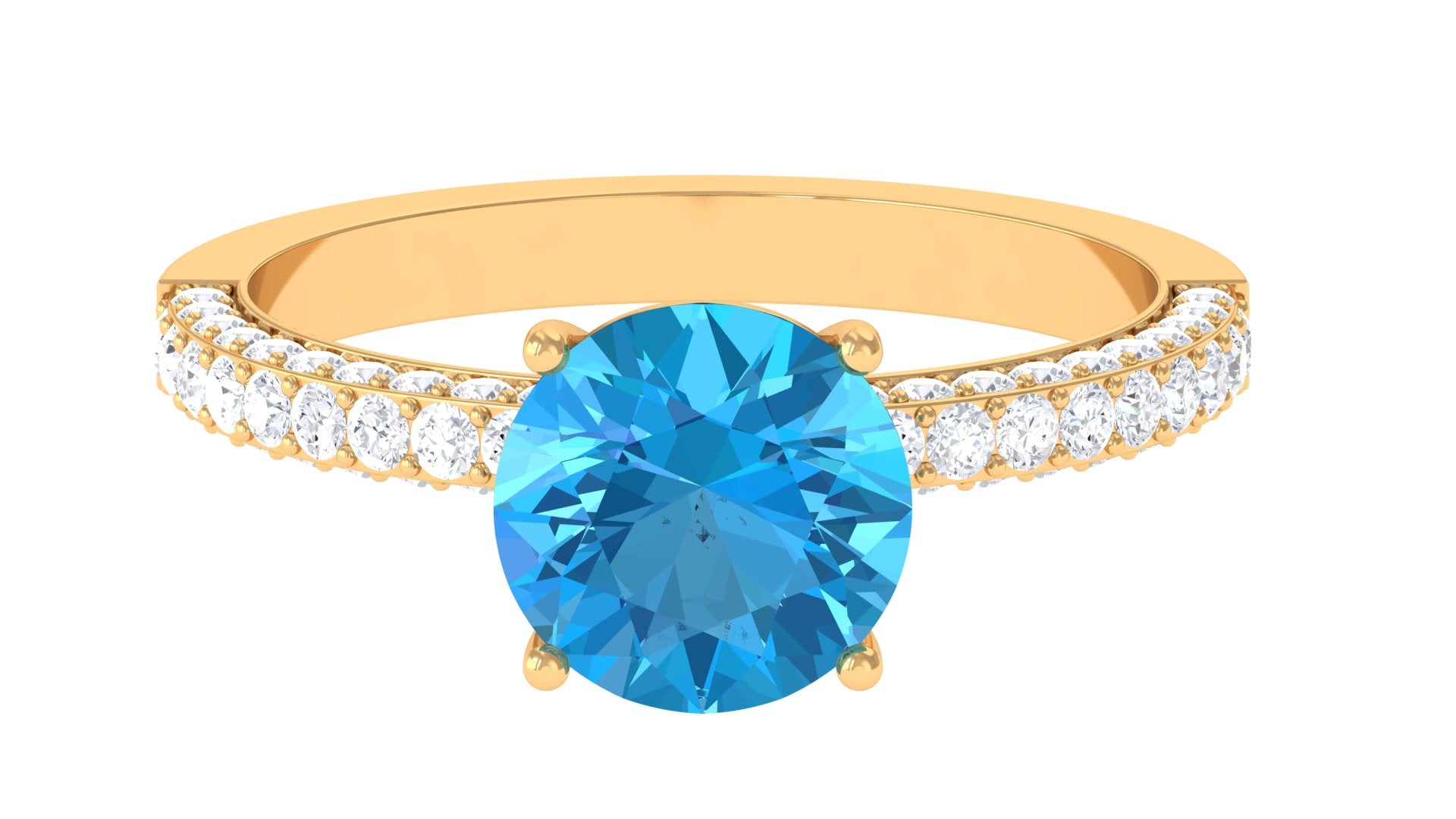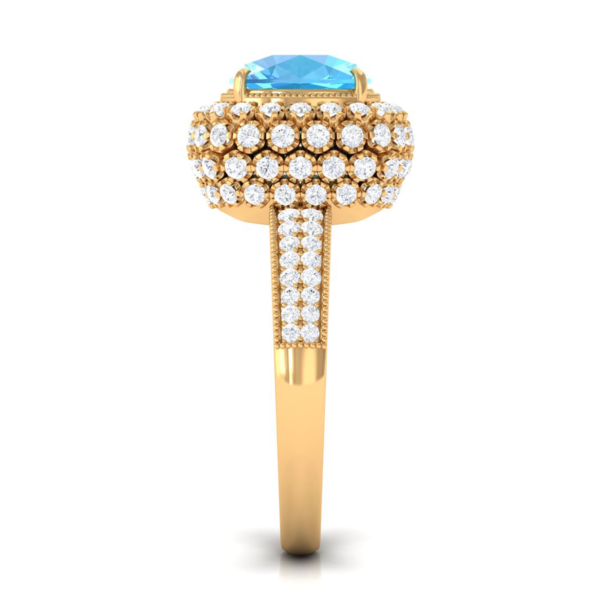 The center-stone of Swiss Blue Topaz here is sparkled up with the encircling of Diamond/Moissanite (that we fondly term ‘Halo’). That makes the Swiss Blue Topaz appear even brighter while highlighting its beauty at its best. Surprisingly, it also gives off the illusion of a bigger Topaz. So, if a Swiss Blue Topaz and Diamond Ring is on your list, this style might turn out to be your best bet.