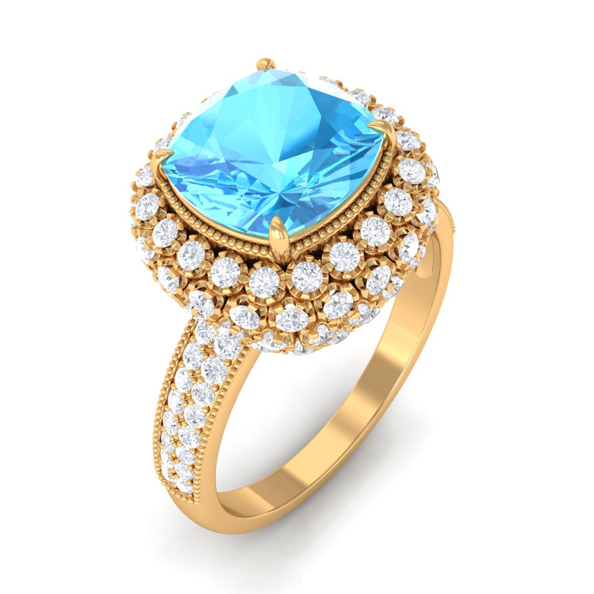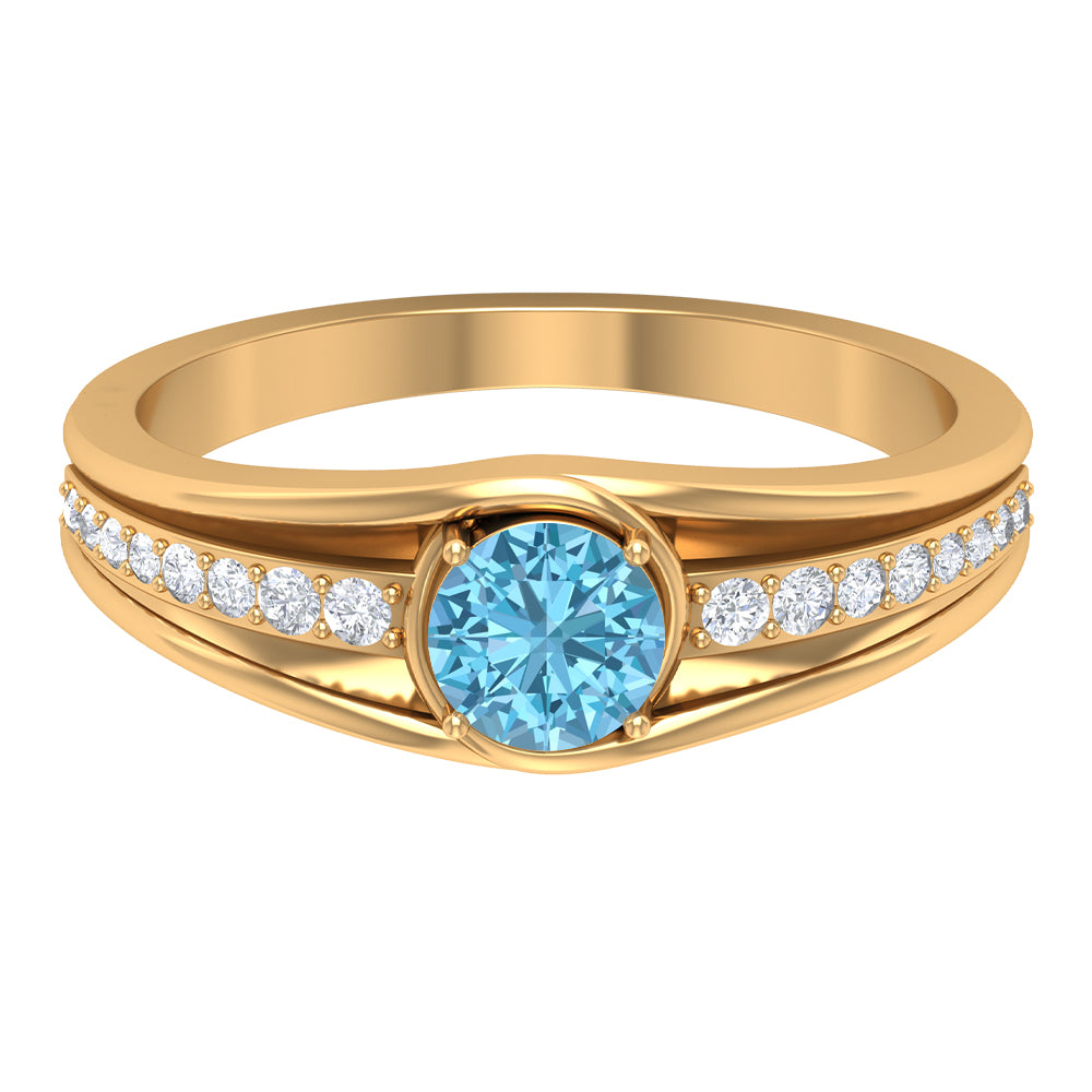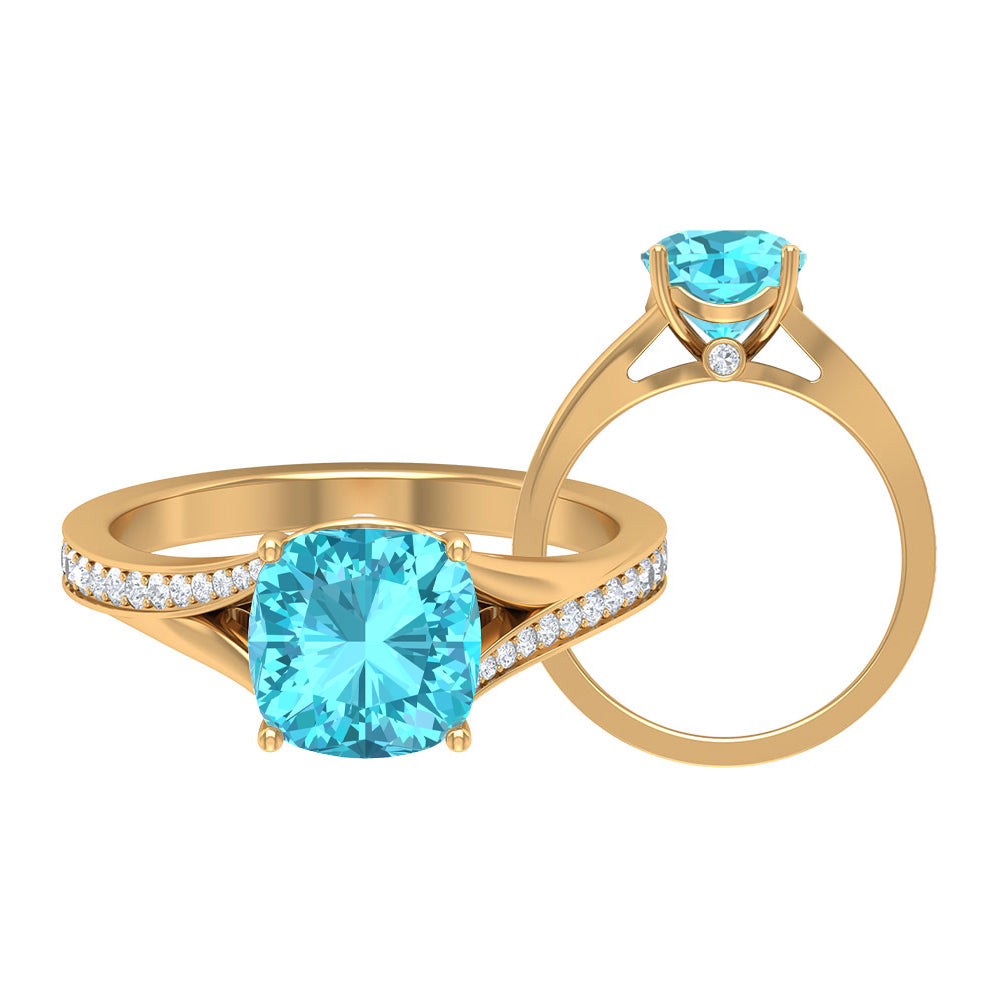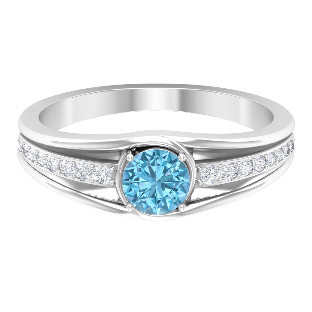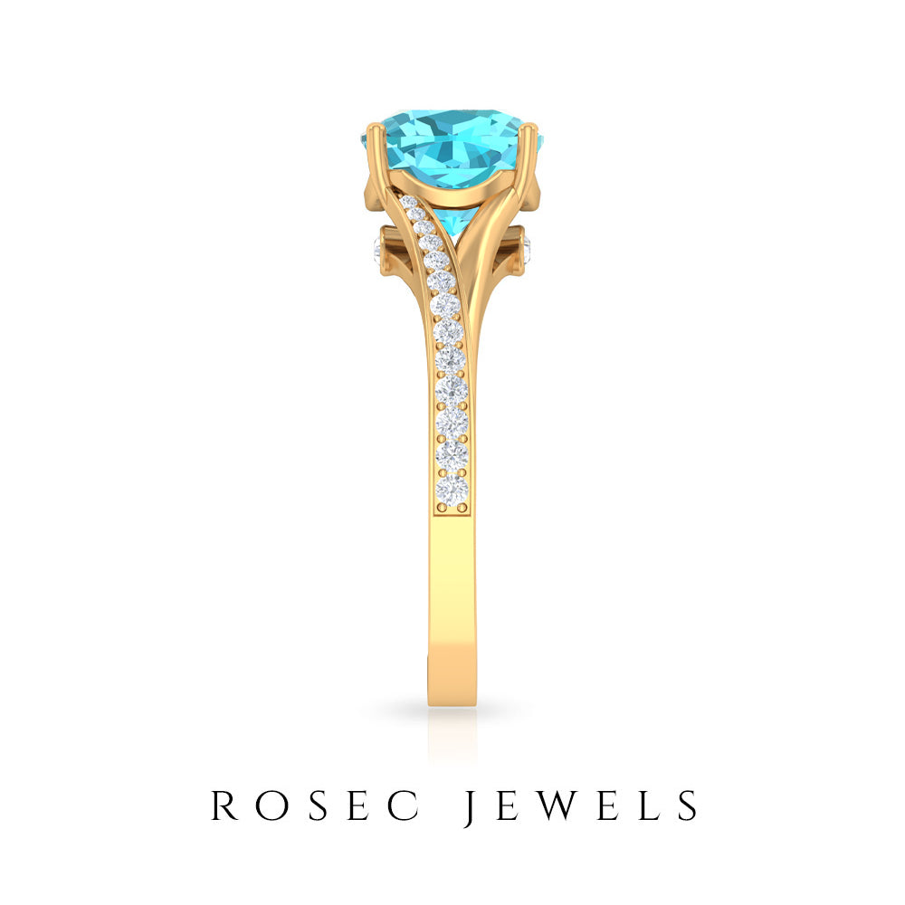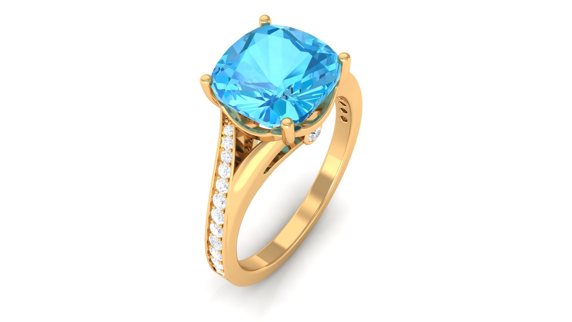 The center-stone of Swiss Blue Topaz here is sparkled up with the encircling of Diamond/Moissanite (that we fondly term ‘Halo’). That makes the Swiss Blue Topaz appear even brighter while highlighting its beauty at its best. Surprisingly, it also gives off the illusion of a bigger Topaz. So, if a Swiss Blue Topaz and Diamond Ring is on your list, this style might turn out to be your best bet.