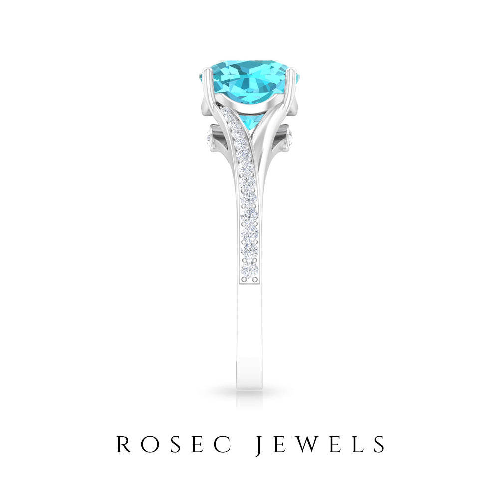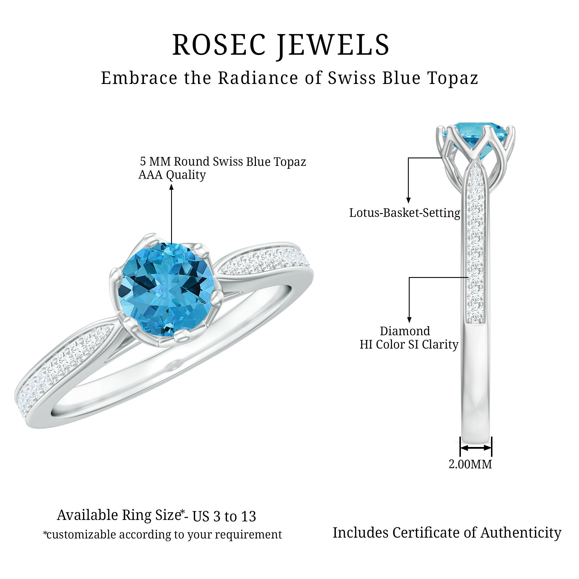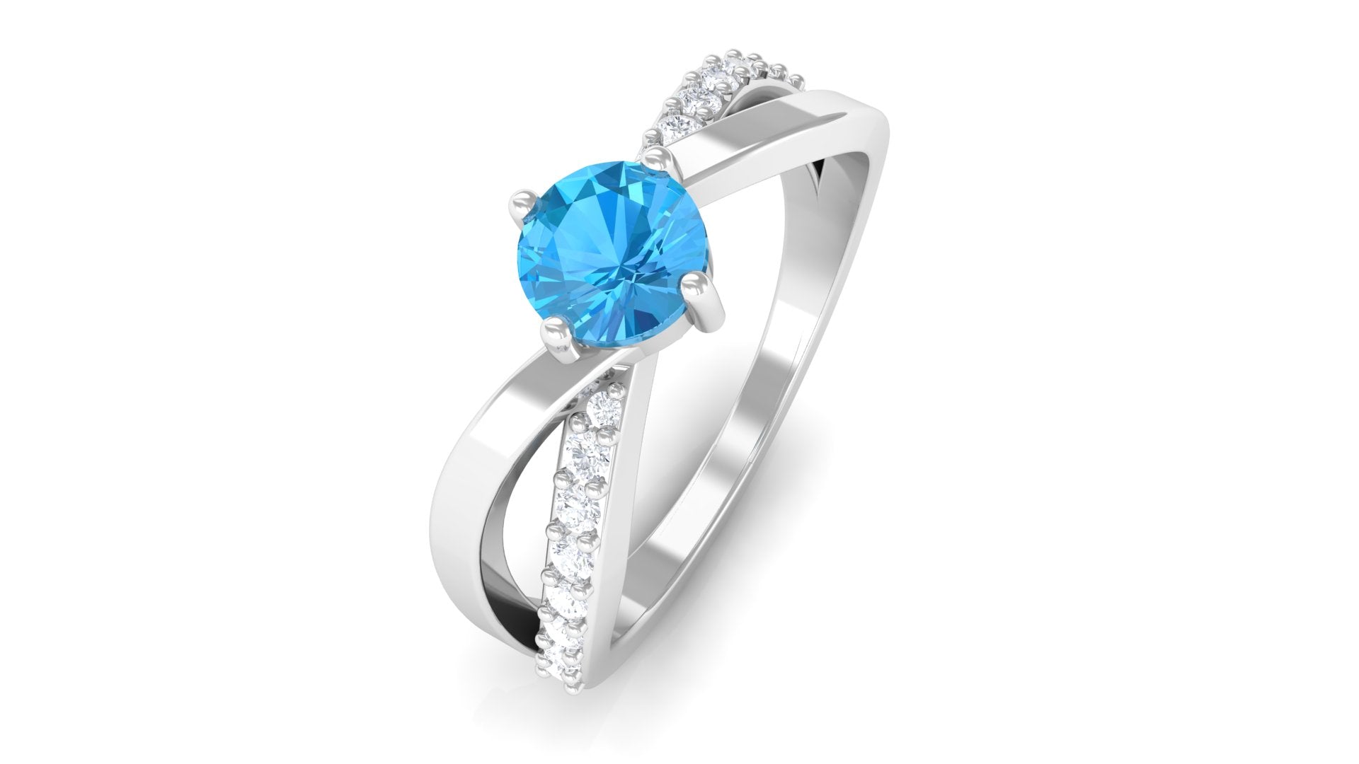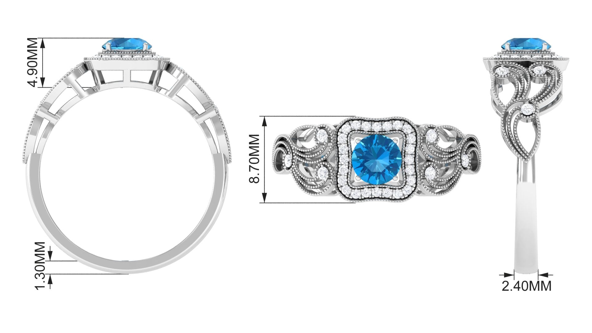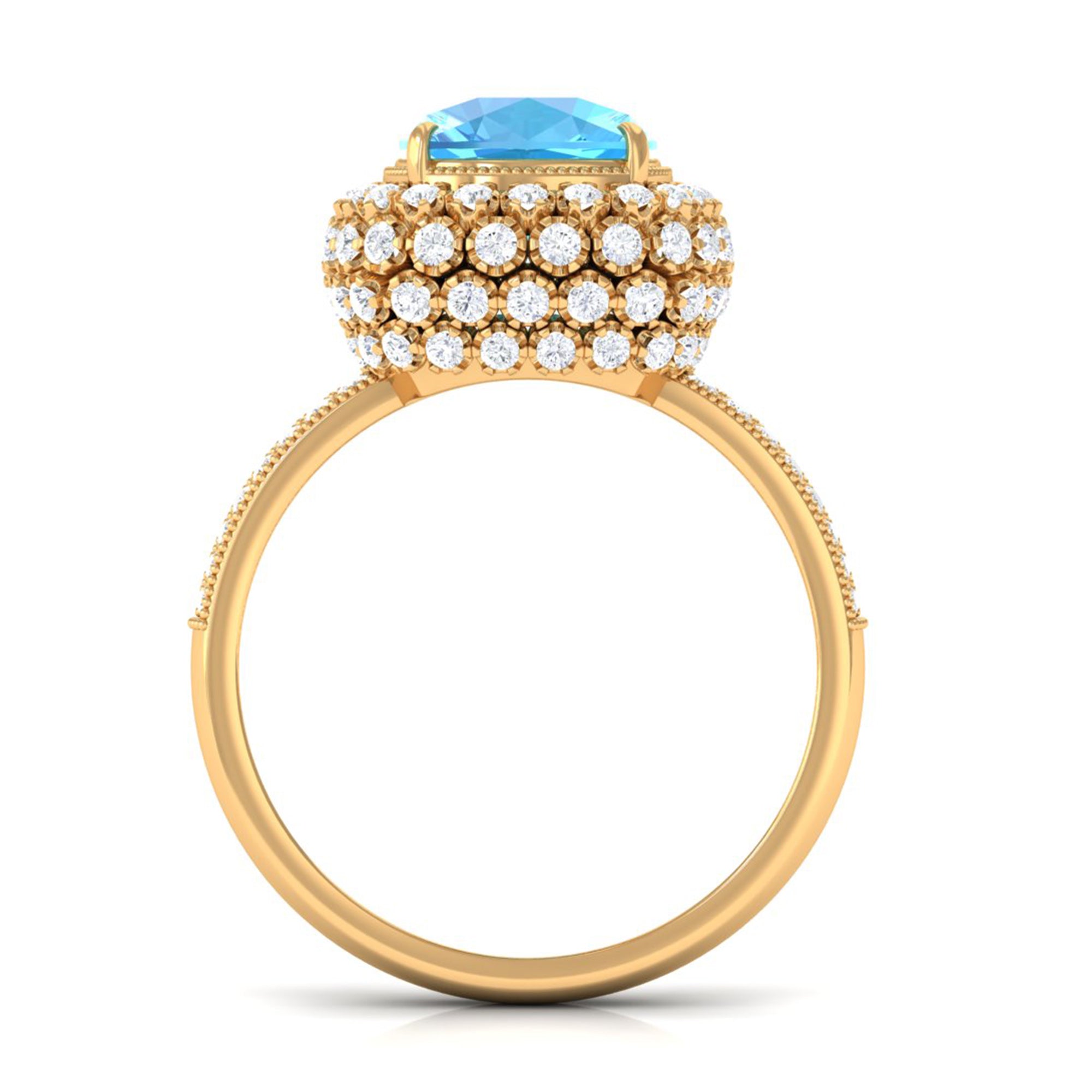 The center-stone of Swiss Blue Topaz here is sparkled up with the encircling of Diamond/Moissanite (that we fondly term ‘Halo’). That makes the Swiss Blue Topaz appear even brighter while highlighting its beauty at its best. Surprisingly, it also gives off the illusion of a bigger Topaz. So, if a Swiss Blue Topaz and Diamond Ring is on your list, this style might turn out to be your best bet.