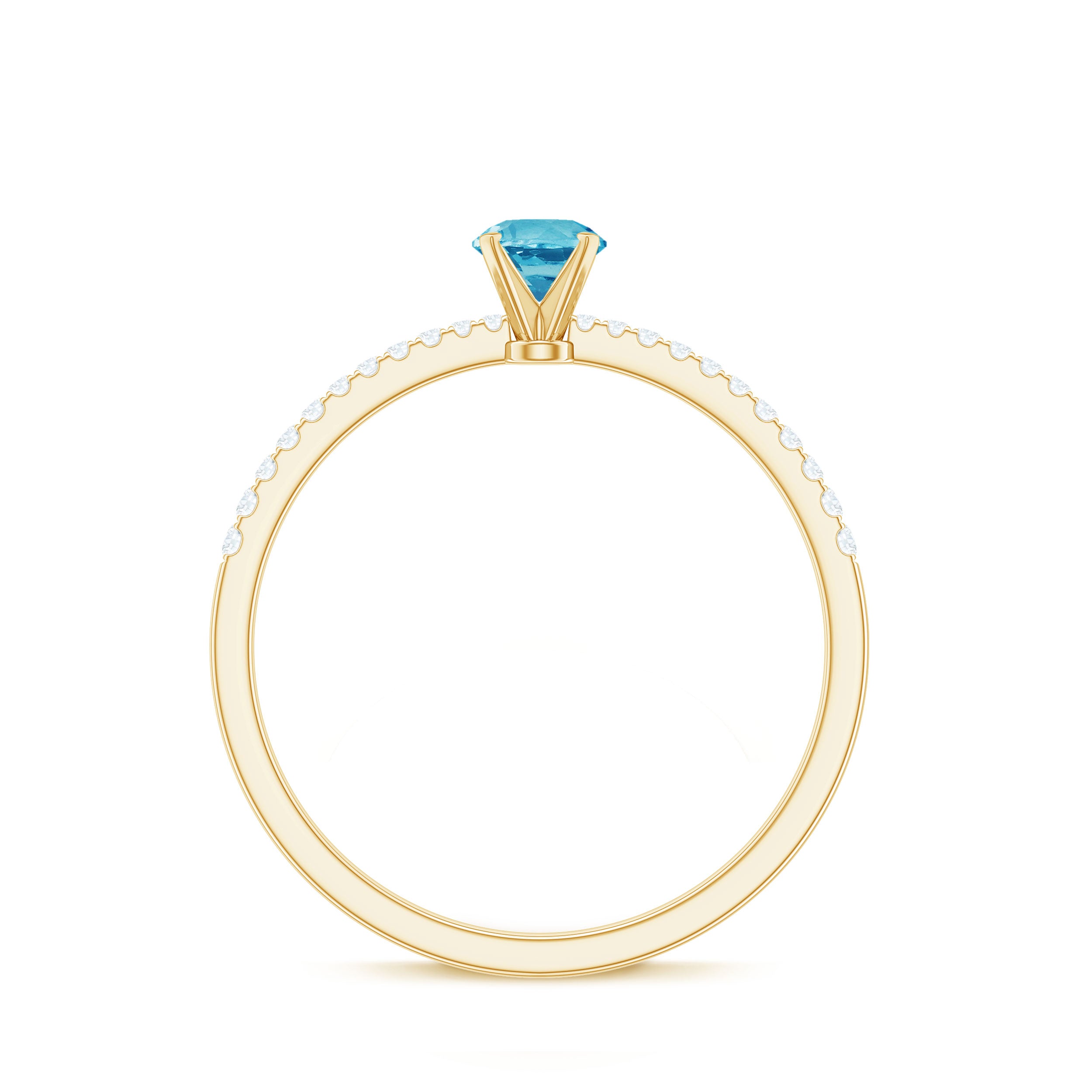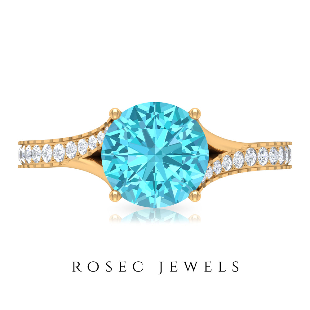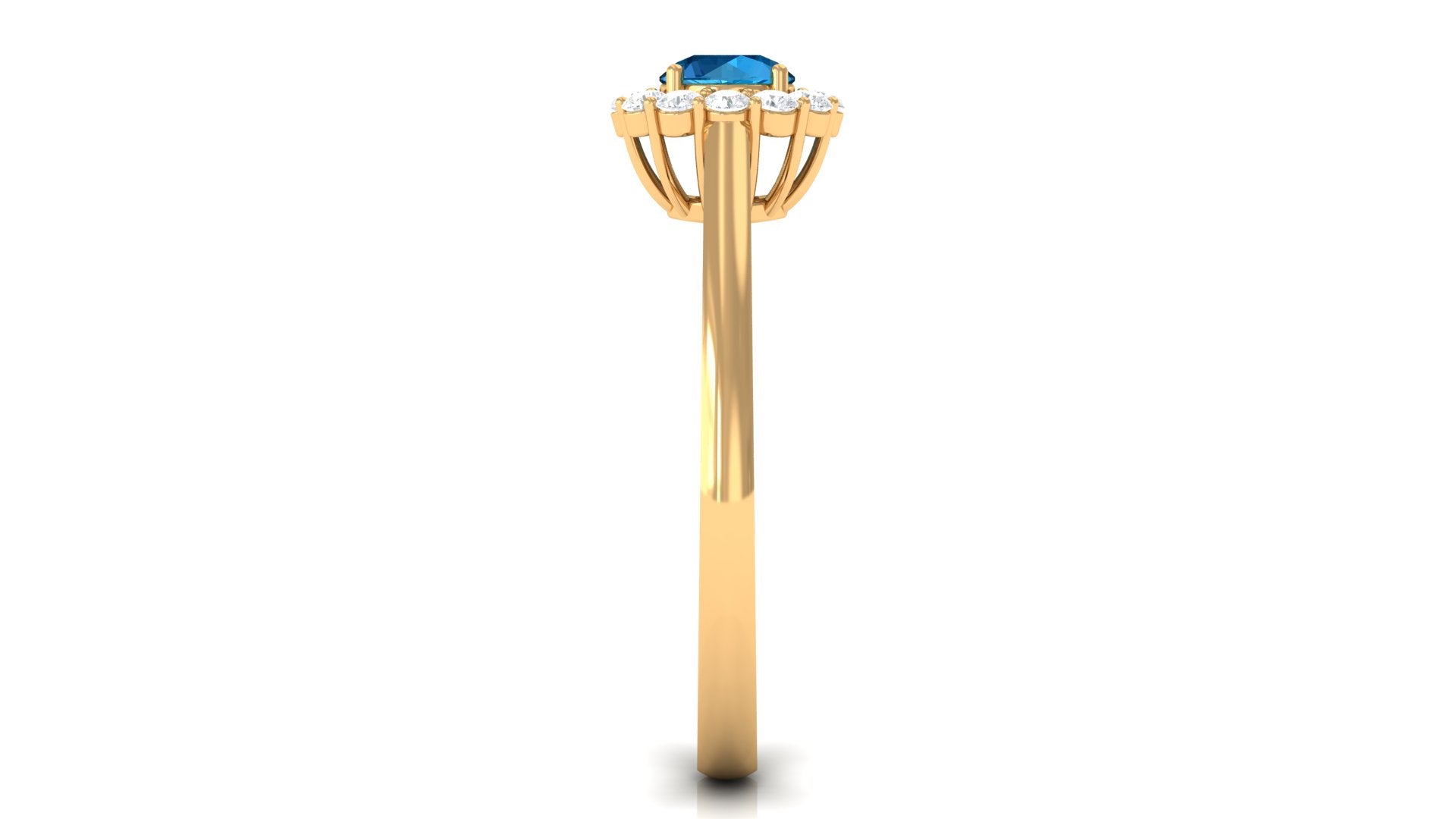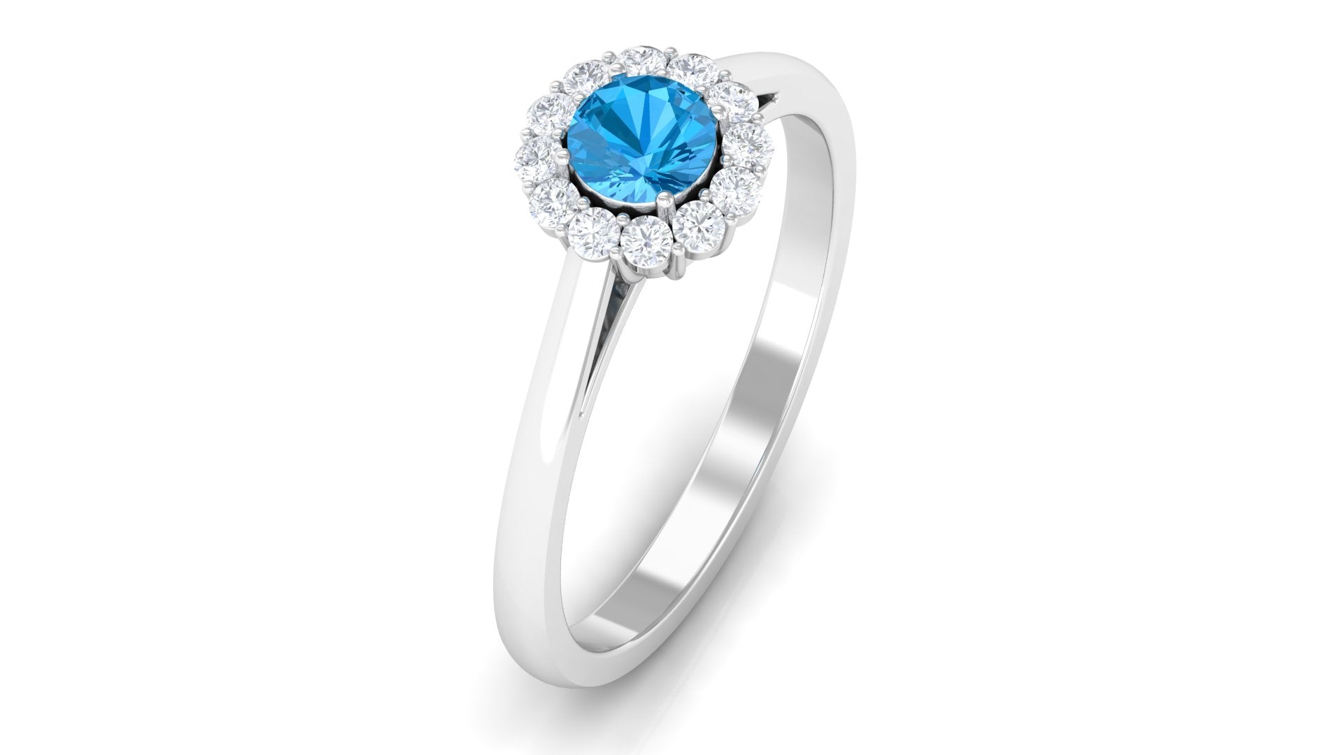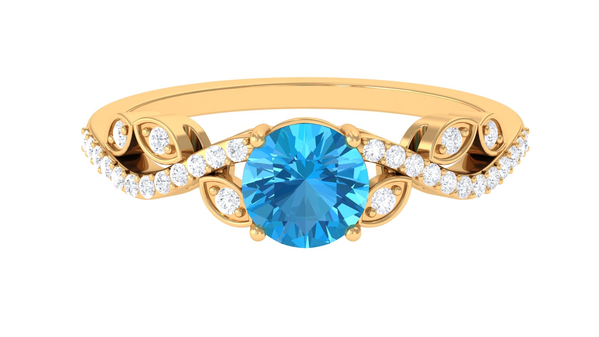 The center-stone of Swiss Blue Topaz here is sparkled up with the encircling of Diamond/Moissanite (that we fondly term ‘Halo’). That makes the Swiss Blue Topaz appear even brighter while highlighting its beauty at its best. Surprisingly, it also gives off the illusion of a bigger Topaz. So, if a Swiss Blue Topaz and Diamond Ring is on your list, this style might turn out to be your best bet.
