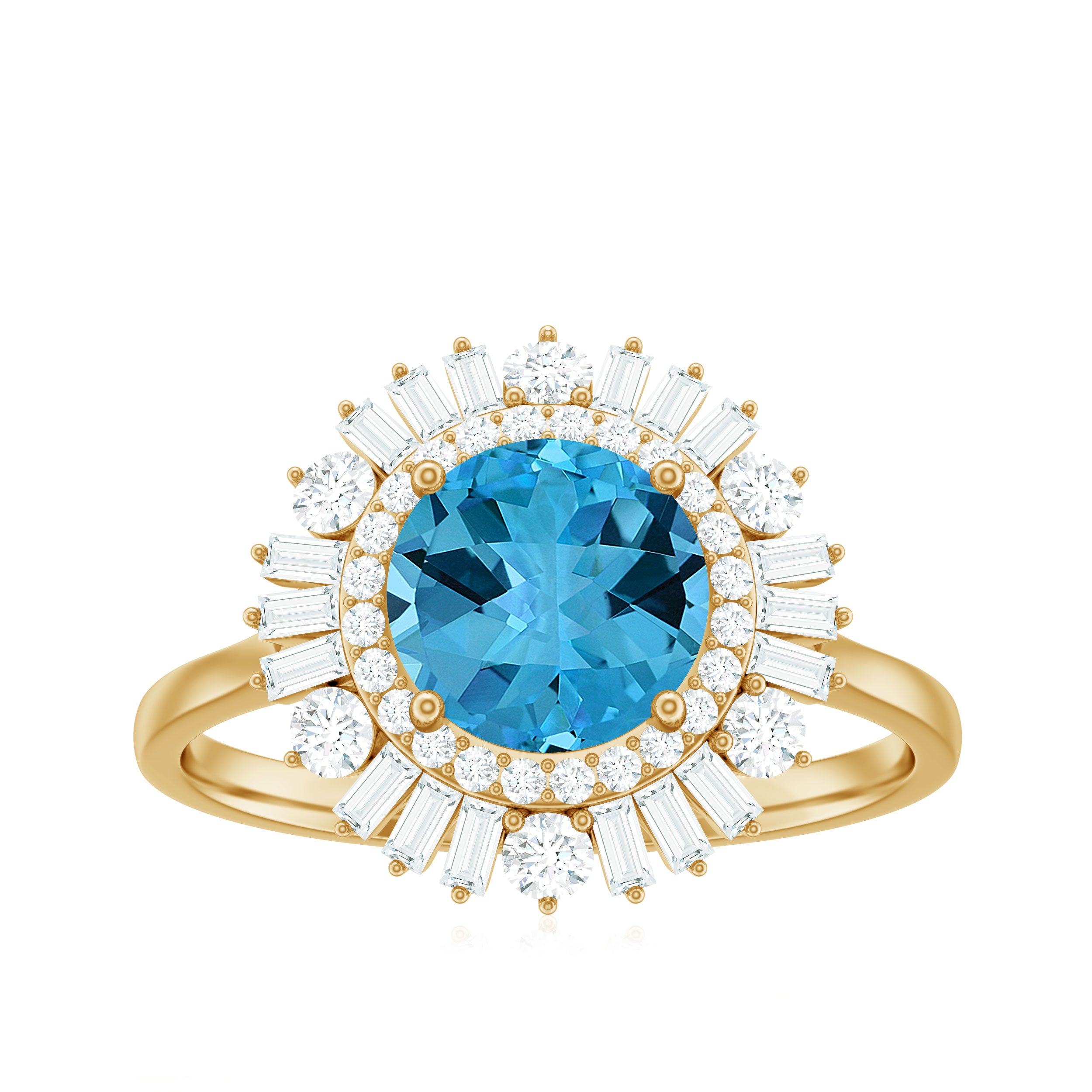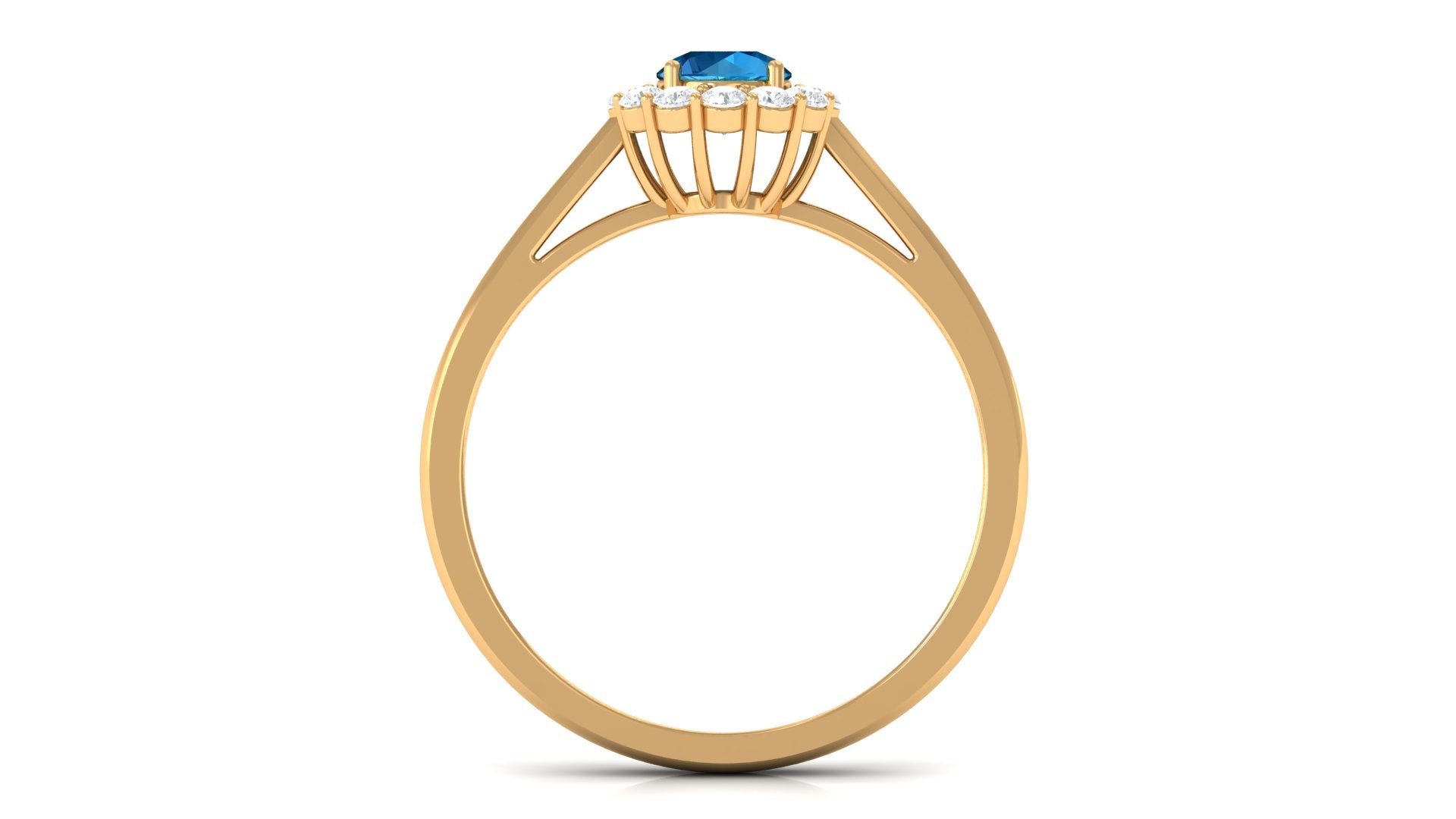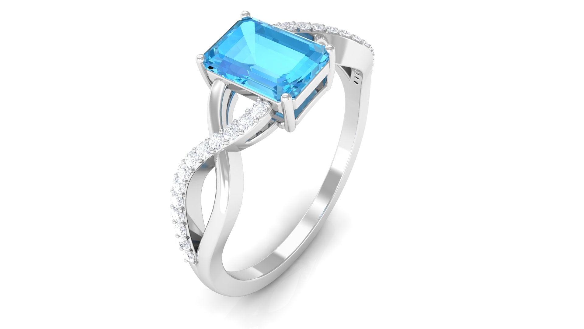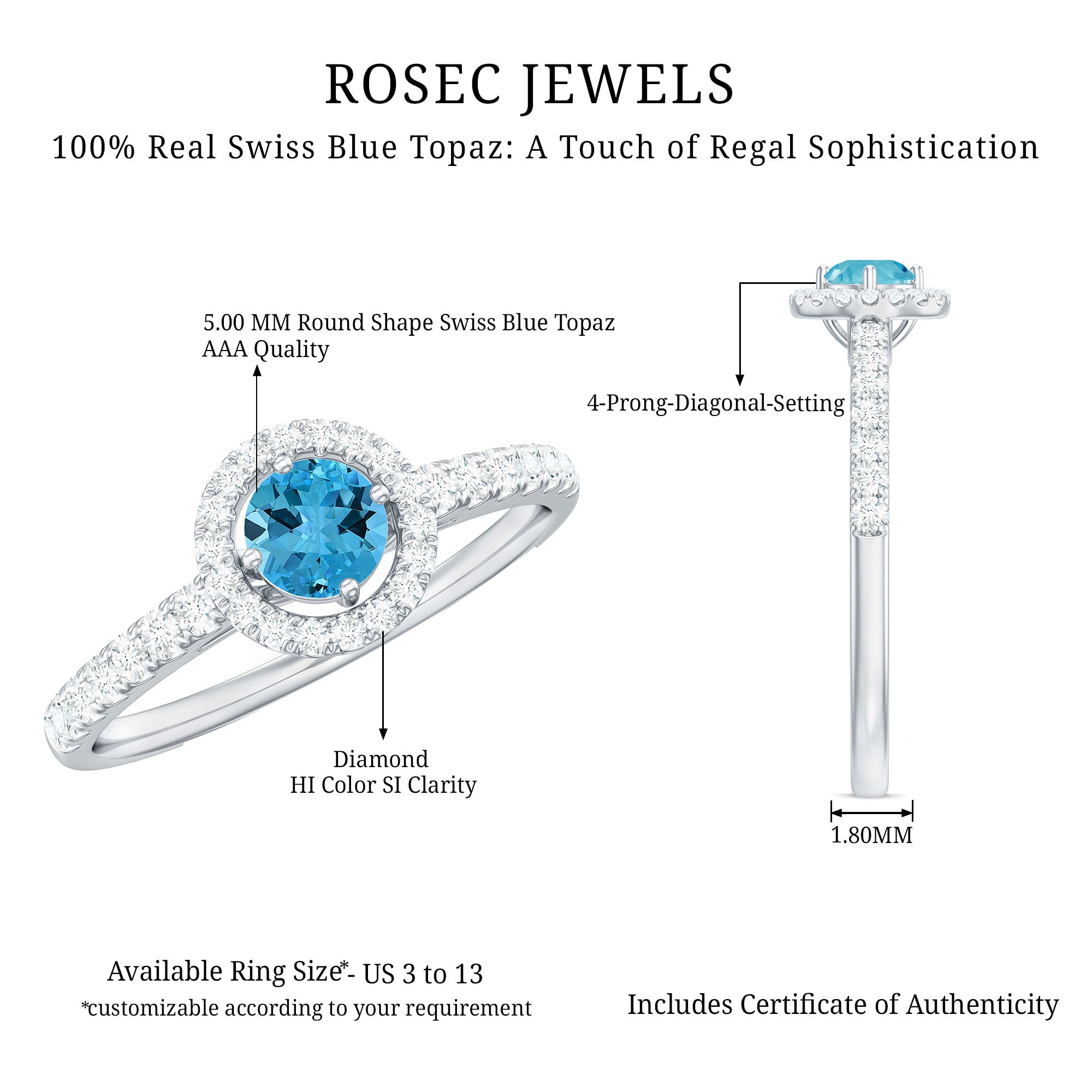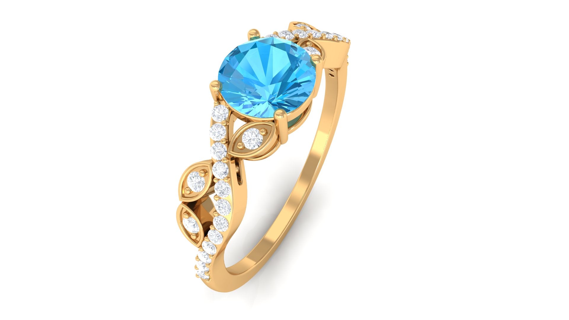 The center-stone of Swiss Blue Topaz here is sparkled up with the encircling of Diamond/Moissanite (that we fondly term ‘Halo’). That makes the Swiss Blue Topaz appear even brighter while highlighting its beauty at its best. Surprisingly, it also gives off the illusion of a bigger Topaz. So, if a Swiss Blue Topaz and Diamond Ring is on your list, this style might turn out to be your best bet.